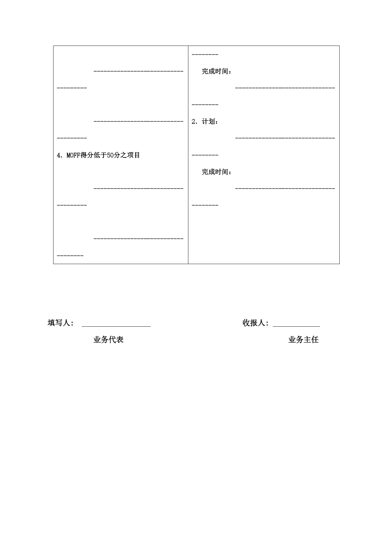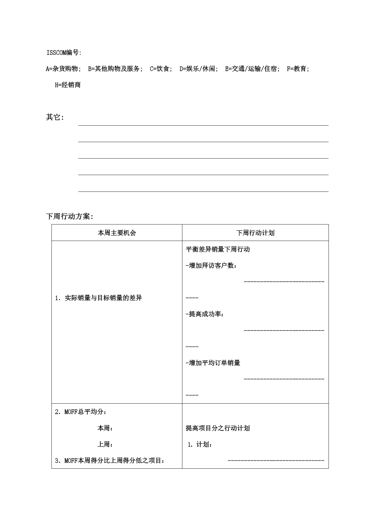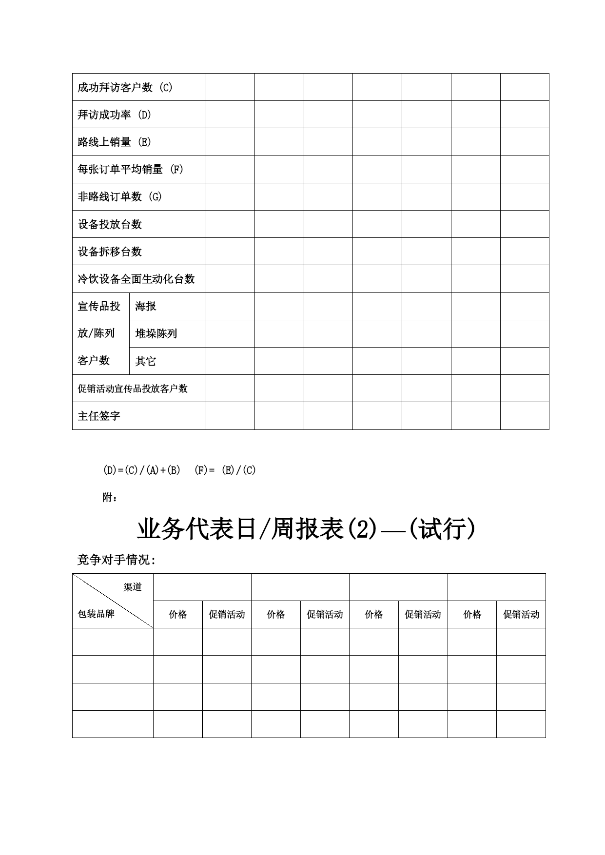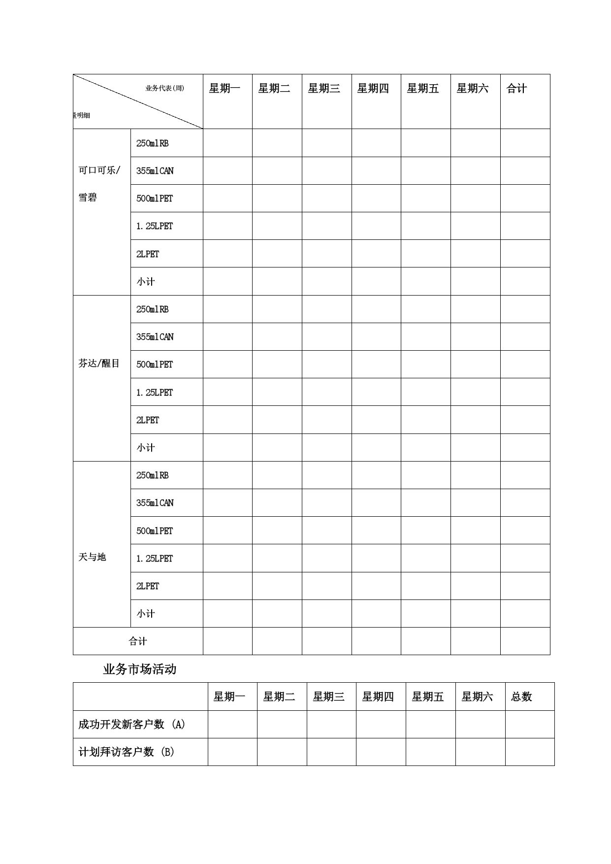 可口可乐销售代表金字塔培训教程附表:业务代表日/周报表(1)—(试行)业务代表:路线编号(包括属区):此报告日期月日至日销量:业务代表(周)星期一星期二星期三星期四星期五星期六合计销量完成销量目标销量差异完成当日%完成本周%LAMP资料离开公司时间回到公司时间行政时间路线时间业务代表(周)销量明细星期一星期二星期三星期四星期五星期六合计可口可乐/雪碧250mlRB355mlCAN500mlPET1.25LPET2LPET小计芬达/醒目250mlRB355mlCAN500mlPET1.25LPET2LPET小计天与地250mlRB355mlCAN500mlPET1.25LPET2LPET小计合计业务市场活动星期一星期二星期三星期四星期五星期六总数成功开发新客户数(A)计划拜访客户数(B)成功拜访客户数(C)拜访成功率(D)路线上销量(E)每张订单平均销量(F)非路线订单数(G)设备投放台数设备拆移台数冷饮设备全面生动化台数宣传品投放/陈列客户数海报堆垛陈列其它促销活动宣传品投放客户数主任签字(D)=(C)/(A)+(B)(F)=(E)/(C)附:业务代表日/周报表(2)—(试行)竞争对手情况:渠道包装品牌价格促销活动价格促销活动价格促销活动价格促销活动ISSCOM编号:A=杂货购物;B=其他购物及服务;C=饮食;D=娱乐/休闲;E=交通/运输/住宿;F=教育;H=经销商其它:下周行动方案:本周主要机会下周行动计划1.实际销量与目标销量的差异平衡差异销量下周行动-增加拜访客户数:------------------------------提高成功率:------------------------------增加平均订单销量-----------------------------2.MOFF总平均分:本周:上周:3.MOFF本周得分比上周得分低之项目:------------------------------------------------------------------------4.MOFF得分低于50分之项目-----------------------------------------------------------------------提高项目分之行动计划计划:--------------------------------------完成时间:--------------------------------------2.计划:--------------------------------------完成时间:--------------------------------------填写人:收报人:业务代表业务主任