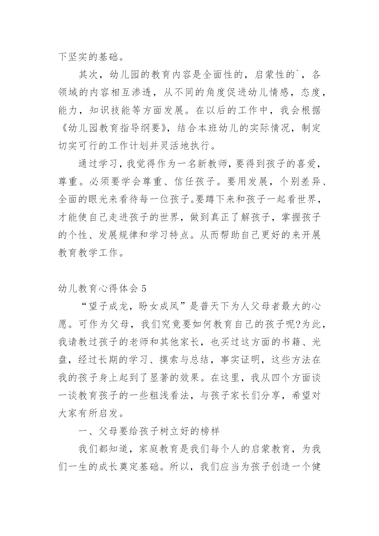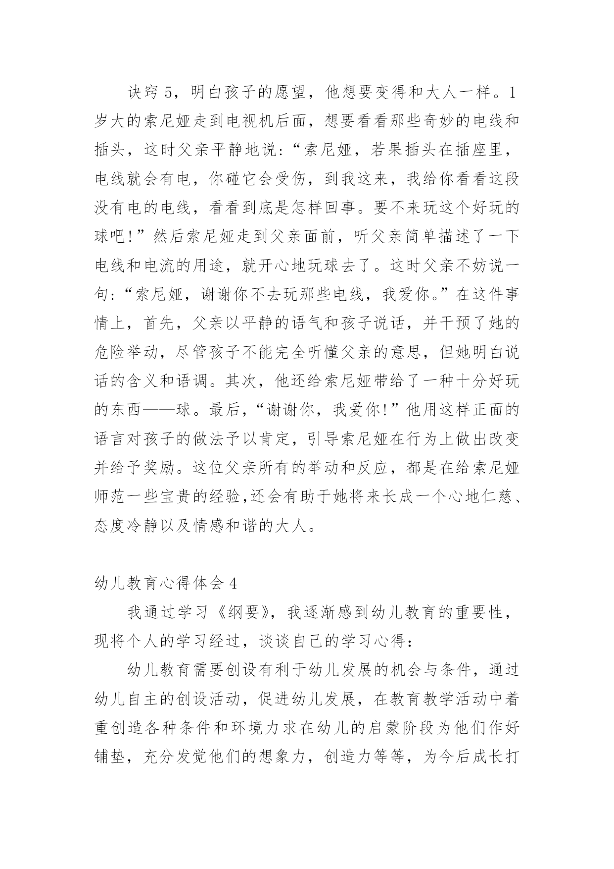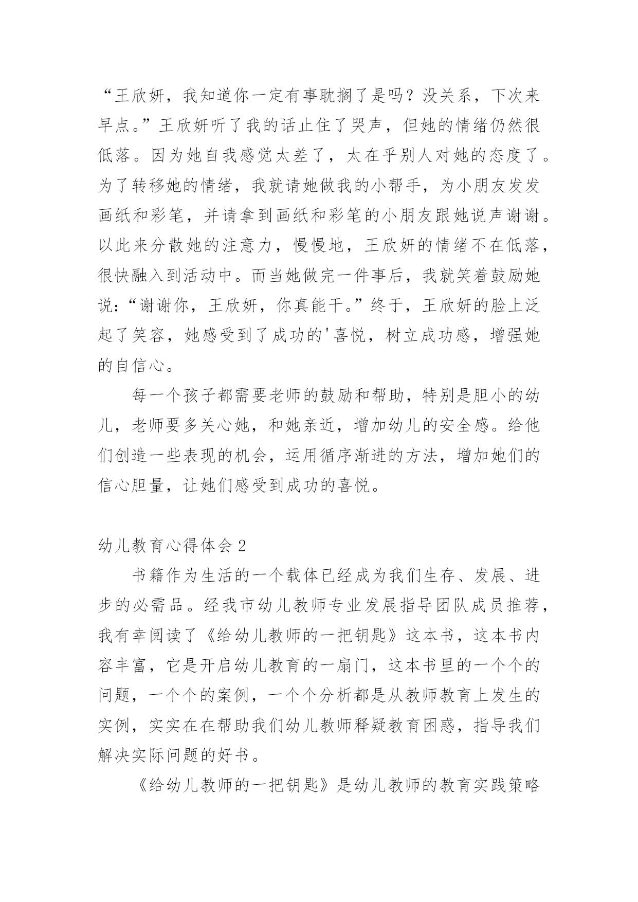 幼儿教育心得体会幼儿教育心得体会【推荐】当我们经过反思,对生活有了新的看法时,有这样的时机,要好好记录下来,这样可以帮助我们总结以往思想、工作和学习。那么心得体会怎么写才能感染读者呢?下面是小编整理的幼儿教育心得体会,欢迎阅读与收藏。幼儿教育心得体会1每个班的孩子性格都不一样,有些幼儿活泼开朗,有些幼儿任性霸道,有些幼儿性子慢,有些幼儿性子急等等。班上总有一些胆小的孩子,他们性格内向、懦弱、敏感,往往缺乏自信心。我班的王欣妍就是这样的孩子。她性格内向、敏感、喜欢哭。别的孩子都能高高兴兴上幼儿园了,而已是大班的她还时时哭着鼻子来幼儿园。每天放学她妈妈都要第一个来接她,就慢不到五分钟,她都会嚎嚎大哭。为了改变她懦弱、胆小的性格,每天都会找她说说话,在放学时与她妈妈和聊天谈心,增加她的安全感。在活动中给创造一些表现的机会,经常表扬、鼓励她,增加孩子的信心。有一次,她来园迟到了,小朋友们正在进行美术活动,蔡煜宴责怪她说:“王欣妍,你那么晚来,我们都上课了。”王欣妍马上伤心地哭泣起来,她连一句责怪的话都承受不了,生怕做错每一件事情。我轻轻地走到她的面前,安慰她说:“王欣妍,我知道你一定有事耽搁了是吗?没关系,下次来早点。”王欣妍听了我的话止住了哭声,但她的情绪仍然很低落。因为她自我感觉太差了,太在乎别人对她的态度了。为了转移她的情绪,我就请她做我的小帮手,为小朋友发发画纸和彩笔,并请拿到画纸和彩笔的小朋友跟她说声谢谢。以此来分散她的注意力,慢慢地,王欣妍的情绪不在低落,很快融入到活动中。而当她做完一件事后,我就笑着鼓励她说:“谢谢你,王欣妍,你真能干。”终于,王欣妍的脸上泛起了笑容,她感受到了成功的'喜悦,树立成功感,增强她的自信心。每一个孩子都需要老师的鼓励和帮助,特别是胆小的幼儿,老师要多关心她,和她亲近,增加幼儿的安全感。给他们创造一些表现的机会,运用循序渐进的方法,增加她们的信心胆量,让她们感受到成功的喜悦。幼儿教育心得体会2书籍作为生活的一个载体已经成为我们生存、发展、进步的必需品。经我市幼儿教师专业发展指导团队成员推荐,我有幸阅读了《给幼儿教师的一把钥匙》这本书,这本书内容丰富,它是开启幼儿教育的一扇门,这本书里的一个个的问题,一个个的案例,一个个分析都是从教师教育上发生的实例,实实在在帮助我们幼儿教师释疑教育困惑,指导我们解决实际问题的好书。《给幼儿教师的一把钥匙》是幼儿教师的教育实践策略汇集。内容包括《教师与儿童》《教师与家长》《教师与社区》三部分,用52个有代表性的问题,展示了当前幼儿教师需要具备的基本教育技能。每个问题中均设置了五个环节:体验分享、案例、分析和提示、教育策略、资源库。这几个环节能引导我们在自我体验下,逐步参与教育思考和研究;其中每一个主题的内容和形式都值得我们学习和研究;从具体的、容易理解的案例、分析、教育策略、新信息等的阅读过程中,渐渐领悟新的教育观点、学习新的教育技能。从而使我们懂得如何利用周围的自然和文化资源改善幼儿受教育环境、促进家长和社区参与早期教育的新策略。帮助我们在实际操作中理解教育理论与日常生活、教学活动的相关性,在新教育观念与行为之间架起一座沟通的桥梁。这本书中举了大量的案例,这些案例我们在日常教学工作中也是经常会碰到的,看着就很能引起共鸣。在每一篇案例下都有相应的教育策略,可以帮助我们遇到相应的事情来解决问题,如当我们遇到这些状况的时候是怎么在想的,怎么在做的,而书中的作者又向我们传达了哪些教育理念和策略,看着看着总能给人一种恍然大悟的感觉。比如案例:《感动的微笑》,讲述的是刘教师的一个语言教学活动案例,这样的活动案例再寻常不过了,很多老师也都会碰到,但它却给我印象比较深刻。活动讲述的是刘老师上的一个语言活动《微笑》,活动开始,刘老师以微笑的表情给幼儿一个轻松、自由的交谈氛围和与他们生活经验相适应的话题,促使幼儿交流的愿望,使幼儿表达的积极性得以激发,对孩子们的各不相同表达,刘老师都能用微笑来认可回报,并抓住教育契机,对不爱讲话的张赛月及时的启发,使孩子们都能感到非常的开心,引发了孩子的主动参与交流,让我们感悟到了语言美对孩子的感染和教育价值。书中在案例的描述后有一个“分析和提示”,就是对这个案例的剖析,结合孩子的年龄特点分析孩子之所以产生这一行为的原因。接下来一个内容是“教育策略”,也就是我们老师可以怎么做,采取一些什么样的教育策略帮助孩子改变这一现状,很具体,这个《感动的微笑》的`案例,书中给予的“教育策略”。1、创设让幼儿自由表达,有话就说的语言环境。2、丰富幼儿的生活经验,有意识扩展幼儿语言交流的内容。3、创造个别交流的机会,引导幼儿学会与他人平等对话。4、利用文学作品培养幼儿的语言表达能力。5、鼓励幼儿进行合作交流的活动。6、通过设计、提出问题,引导幼儿有话可说。7、