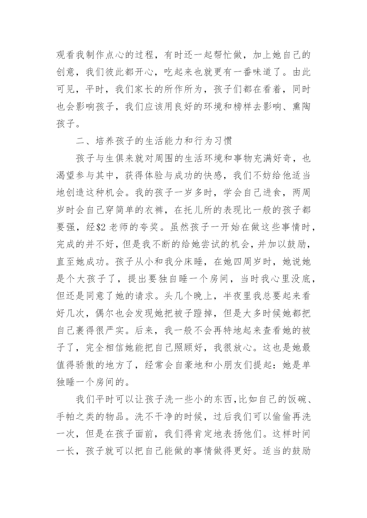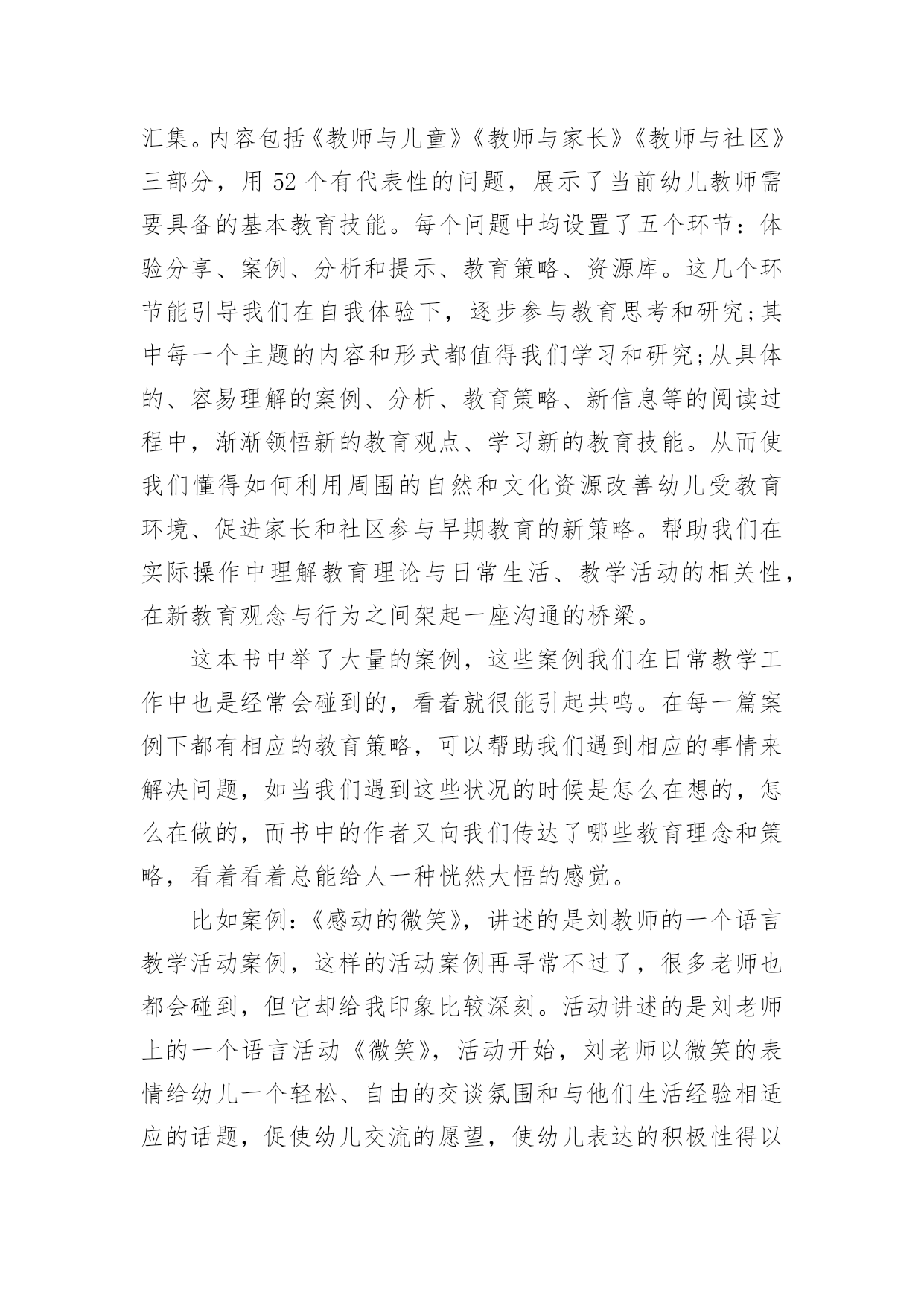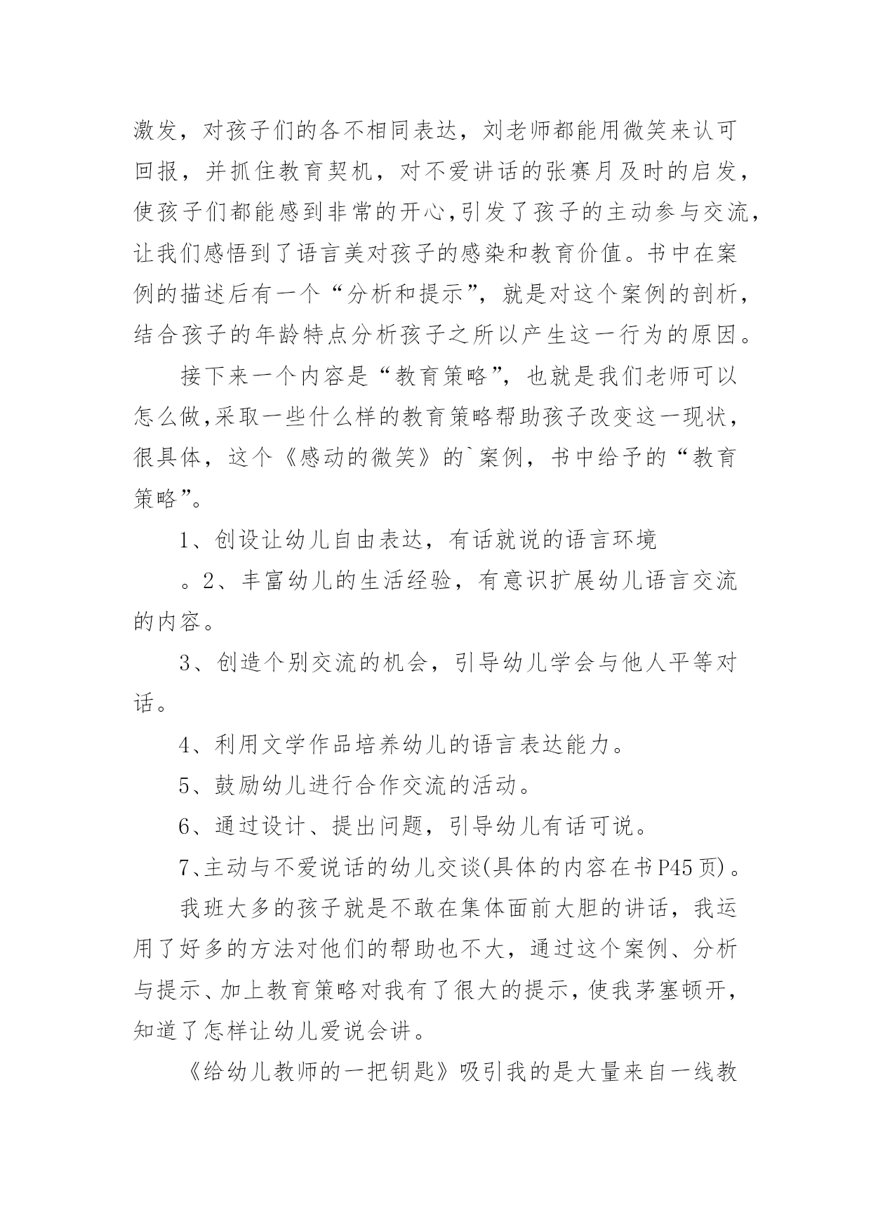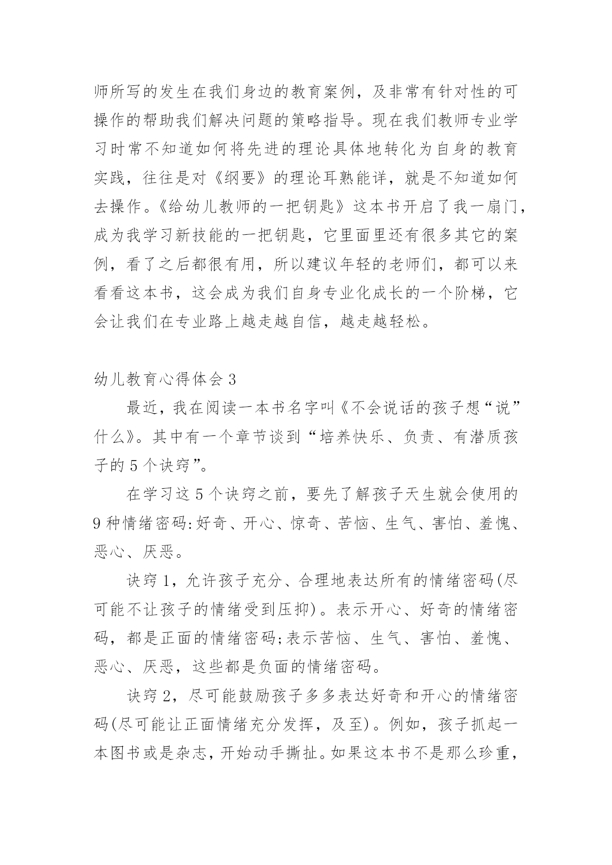 幼儿教育心得体会幼儿教育心得体会【推荐】当我们经过反思,对生活有了新的看法时,有这样的时机,要好好记录下来,这样可以帮助我们总结以往思想、工作和学习。那么心得体会怎么写才能感染读者呢?下面是小编整理的幼儿教育心得体会,欢迎阅读与收藏。幼儿教育心得体会1每个班的孩子性格都不一样,有些幼儿活泼开朗,有些幼儿任性霸道,有些幼儿性子慢,有些幼儿性子急等等。班上总有一些胆小的孩子,他们性格内向、懦弱、敏感,往往缺乏自信心。我班的王欣妍就是这样的孩子。她性格内向、敏感、喜欢哭。别的孩子都能高高兴兴上幼儿园了,而已是大班的她还时时哭着鼻子来幼儿园。每天放学她妈妈都要第一个来接她,就慢不到五分钟,她都会嚎嚎大哭。为了改变她懦弱、胆小的性格,每天都会找她说说话,在放学时与她妈妈和聊天谈心,增加她的安全感。在活动中给创造一些表现的机会,经常表扬、鼓励她,增加孩子的信心。有一次,她来园迟到了,小朋友们正在进行美术活动,蔡煜宴责怪她说:“王欣妍,你那么晚来,我们都上课了。”王欣妍马上伤心地哭泣起来,她连一句责怪的话都承受不了,生怕做错每一件事情。我轻轻地走到她的面前,安慰她说:“王欣妍,我知道你一定有事耽搁了是吗?没关系,下次来早点。”王欣妍听了我的话止住了哭声,但她的情绪仍然很低落。因为她自我感觉太差了,太在乎别人对她的态度了。为了转移她的情绪,我就请她做我的小帮手,为小朋友发发画纸和彩笔,并请拿到画纸和彩笔的小朋友跟她说声谢谢。以此来分散她的注意力,慢慢地,王欣妍的情绪不在低落,很快融入到活动中。而当她做完一件事后,我就笑着鼓励她说:“谢谢你,王欣妍,你真能干。”终于,王欣妍的脸上泛起了笑容,她感受到了成功的'喜悦,树立成功感,增强她的自信心。每一个孩子都需要老师的鼓励和帮助,特别是胆小的幼儿,老师要多关心她,和她亲近,增加幼儿的安全感。给他们创造一些表现的机会,运用循序渐进的方法,增加她们的信心胆量,让她们感受到成功的喜悦。幼儿教育心得体会2书籍作为生活的一个载体已经成为我们生存、发展、进步的必需品。经我市幼儿教师专业发展指导团队成员推荐,我有幸阅读了《给幼儿教师的一把钥匙》这本书,这本书内容丰富,它是开启幼儿教育的一扇门,这本书里的一个个的问题,一个个的案例,一个个分析都是从教师教育上发生的实例,实实在在帮助我们幼儿教师释疑教育困惑,指导我们解决实际问题的好书。《给幼儿教师的一把钥匙》是幼儿教师的教育实践策略汇集。内容包括《教师与儿童》《教师与家长》《教师与社区》三部分,用52个有代表性的问题,展示了当前幼儿教师需要具备的基本教育技能。每个问题中均设置了五个环节:体验分享、案例、分析和提示、教育策略、资源库。这几个环节能引导我们在自我体验下,逐步参与教育思考和研究;其中每一个主题的内容和形式都值得我们学习和研究;从具体的、容易理解的案例、分析、教育策略、新信息等的阅读过程中,渐渐领悟新的教育观点、学习新的教育技能。从而使我们懂得如何利用周围的自然和文化资源改善幼儿受教育环境、促进家长和社区参与早期教育的新策略。帮助我们在实际操作中理解教育理论与日常生活、教学活动的相关性,在新教育观念与行为之间架起一座沟通的桥梁。这本书中举了大量的案例,这些案例我们在日常教学工作中也是经常会碰到的,看着就很能引起共鸣。在每一篇案例下都有相应的教育策略,可以帮助我们遇到相应的事情来解决问题,如当我们遇到这些状况的时候是怎么在想的,怎么在做的,而书中的作者又向我们传达了哪些教育理念和策略,看着看着总能给人一种恍然大悟的感觉。比如案例:《感动的微笑》,讲述的是刘教师的一个语言教学活动案例,这样的活动案例再寻常不过了,很多老师也都会碰到,但它却给我印象比较深刻。活动讲述的是刘老师上的一个语言活动《微笑》,活动开始,刘老师以微笑的表情给幼儿一个轻松、自由的交谈氛围和与他们生活经验相适应的话题,促使幼儿交流的愿望,使幼儿表达的积极性得以激发,对孩子们的各不相同表达,刘老师都能用微笑来认可回报,并抓住教育契机,对不爱讲话的张赛月及时的启发,使孩子们都能感到非常的开心,引发了孩子的主动参与交流,让我们感悟到了语言美对孩子的感染和教育价值。书中在案例的描述后有一个“分析和提示”,就是对这个案例的剖析,结合孩子的年龄特点分析孩子之所以产生这一行为的原因。接下来一个内容是“教育策略”,也就是我们老师可以怎么做,采取一些什么样的教育策略帮助孩子改变这一现状,很具体,这个《感动的微笑》的`案例,书中给予的“教育策略”。1、创设让幼儿自由表达,有话就说的语言环境。2、丰富幼儿的生活经验,有意识扩展幼儿语言交流的内容。3、创造个别交流的机会,引导幼儿学会与他人平等对话。4、利用文学作品培养幼儿的语言表达能力。5、鼓励幼儿进行合作交流的活动。6、通过设计、提出问题,引导幼儿有话可说。7、