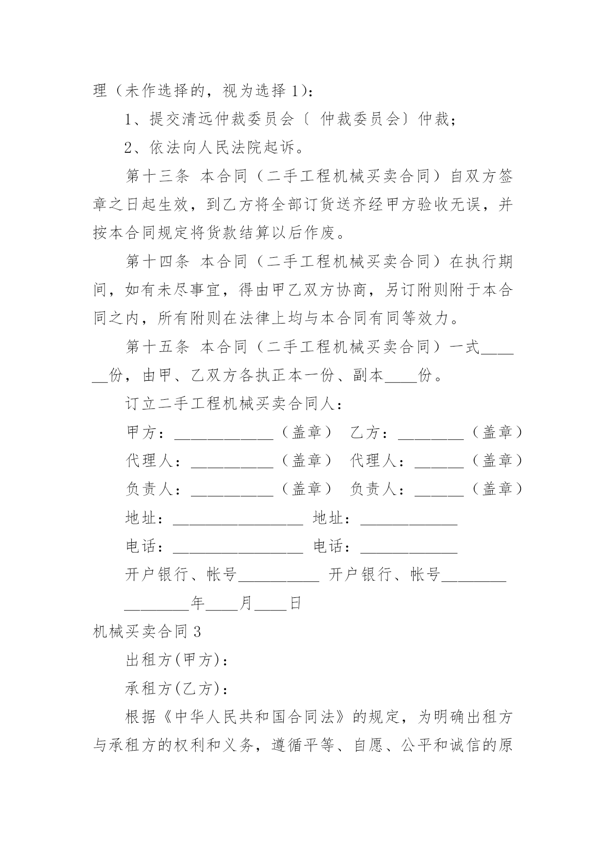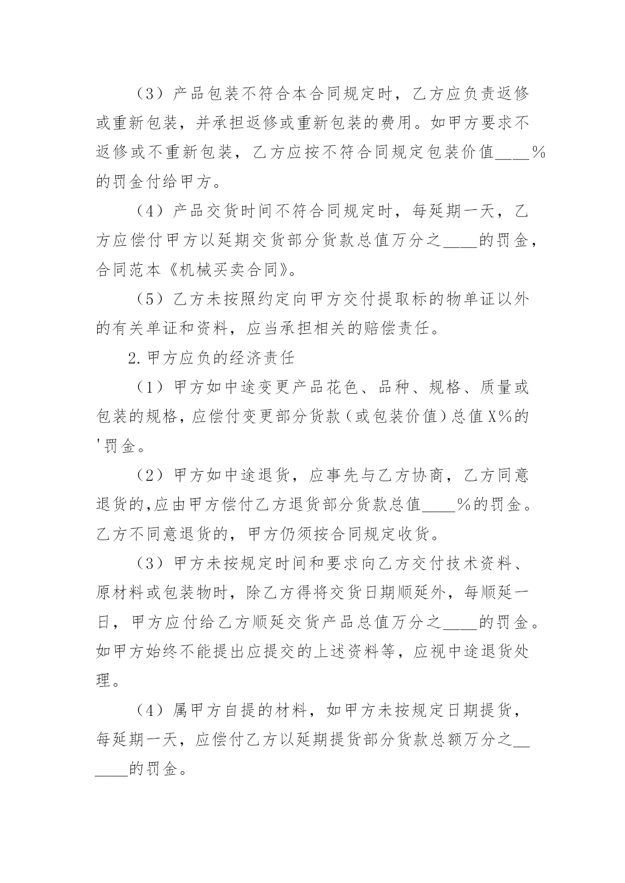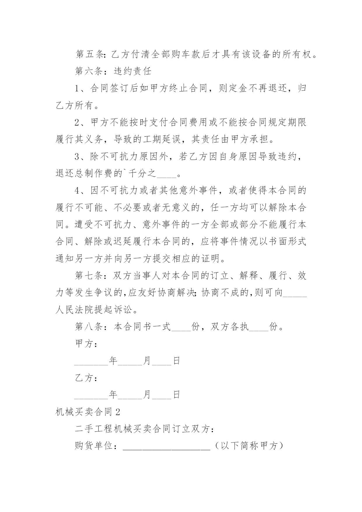 机械买卖合同机械买卖合同(15篇)在当今社会,人们对合同愈发重视,我们用到合同的地方越来越多,合同能够促使双方正确行使权力,严格履行义务。那么合同要怎么拟定?想必这让大家都很苦恼吧,下面是小编精心整理的机械买卖合同,欢迎大家分享。机械买卖合同1甲方:地址:乙方:地址:双方本着友好、平等、互利、自愿、诚实、信用的原则,就甲方委托乙方购买二手机械等事宜,达成如下合同条款:第一条:乙方从甲方处购买________压路机____台,总价_______元整。第二条:甲方收到乙方定金_____元整后甲方负责调试整修费用由乙方承担,剩余货款_______元整付清后方可提车,如违约乙方所交定金不予退回。第三条:此车属二手车,无三包服务,甲方可提供技术咨询。第四条:甲方提供的_______压路机配置为_______发动机,发动机号:_______,出厂编号:_______第五条:乙方付清全部购车款后才具有该设备的所有权。第六条:违约责任1、合同签订后如甲方终止合同,则定金不再退还,归乙方所有。2、甲方不能按时支付合同费用或不能按合同规定期限履行其义务,导致的工期延误,其责任由甲方承担。3、除不可抗力原因外,若乙方因自身原因导致违约,退还总制作费的`千分之____。4、因不可抗力或者其他意外事件,或者使得本合同的履行不可能、不必要或者无意义的,任一方均可以解除本合同。遭受不可抗力、意外事件的一方全部或部分不能履行本合同、解除或迟延履行本合同的,应将事件情况以书面形式通知另一方并向另一方提交相应的证明。第七条:双方当事人对本合同的订立、解释、履行、效力等发生争议的,应友好协商解决;协商不成的,则可向_____人民法院提起诉讼。第八条:本合同书一式____份,双方各执____份。甲方:_______年_____月____日乙方:_______年_____月____日机械买卖合同2二手工程机械买卖合同订立双方:购货单位:_________(以下简称甲方)供货单位:_________(以下简称乙方)第一条其产品名称、规格、质量(技术指标)、单价、总价等。第二条产品包装规格及费用_________第三条验收方法______________第四条货款及费用等付款及结算办法___________第五条交货规定1.交货方式:______2.交货地点:______3.交货日期:______4.运输费:_______第六条经济责任1.乙方应负的经济责任(1)产品花色、品种、规格、质量不符合本合同规定时,甲方同意利用者,按质论价。不能利用的,乙方应负责保修、保退、保换。由于上述原因致延误交货时间,每逾期一日,乙方应按逾期交货部分货款总值的万分之___计算向甲方偿付逾期交货的违约金。(2)乙方未按本合同规定的产品数量交货时,少交的部分,甲方如果需要,应照数补交。甲方如不需要,可以退货。由于退货所造成的损失,由乙方承担。如甲方需要而乙方不能交货,则乙方应付给甲方不能交货部分货款总值的___%的罚金。(3)产品包装不符合本合同规定时,乙方应负责返修或重新包装,并承担返修或重新包装的费用。如甲方要求不返修或不重新包装,乙方应按不符合同规定包装价值__%的罚金付给甲方。(4)产品交货时间不符合同规定时,每延期一天,乙方应偿付甲方以延期交货部分货款总值万分之__的罚金,合同范本《机械买卖合同》。(5)乙方未按照约定向甲方交付提取标的物单证以外的有关单证和资料,应当承担相关的赔偿责任。2.甲方应负的经济责任(1)甲方如中途变更产品花色、品种、规格、质量或包装的规格,应偿付变更部分货款(或包装价值)总值X%的'罚金。(2)甲方如中途退货,应事先与乙方协商,乙方同意退货的,应由甲方偿付乙方退货部分货款总值__%的罚金。乙方不同意退货的,甲方仍须按合同规定收货。(3)甲方未按规定时间和要求向乙方交付技术资料、原材料或包装物时,除乙方得将交货日期顺延外,每顺延一日,甲方应付给乙方顺延交货产品总值万分之__的罚金。如甲方始终不能提出应提交的上述资料等,应视中途退货处理。(4)属甲方自提的材料,如甲方未按规定日期提货,每延期一天,应偿付乙方以延期提货部分货款总额万分之___的罚金。(5)甲方如未按规定日期向乙方付款,每延期一天,应按延期付款总额万分之__计算付给乙方,作为延期罚金。(6)乙方送货或代运的产品,如甲方拒绝接货,甲方应承担因而造成的损失和运输费用及罚金。第七条产品价格如须调整,必须经双方协商。如乙方因价格问题而影响交货,则每延期交货一天,乙方应按延期交货部分总值的万分之__作为罚金付给甲方。第八条甲、乙任何一方如要求全部或部分注销合同,必须提出充分理由,经双方协商提出注销合同一方须向对方偿付注销合同部分总额__%的补偿金。第九条如因生产资料、生产设备、生产工艺或市场发生重大变化