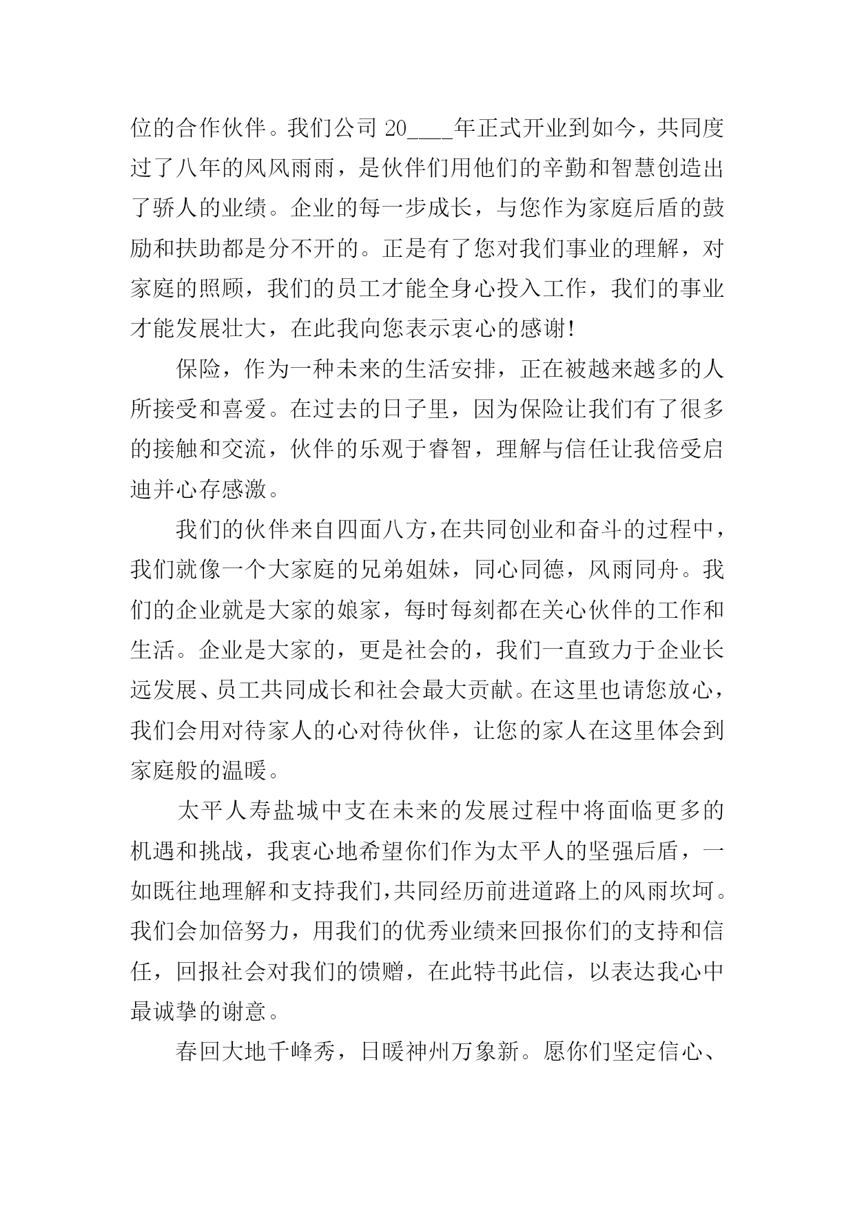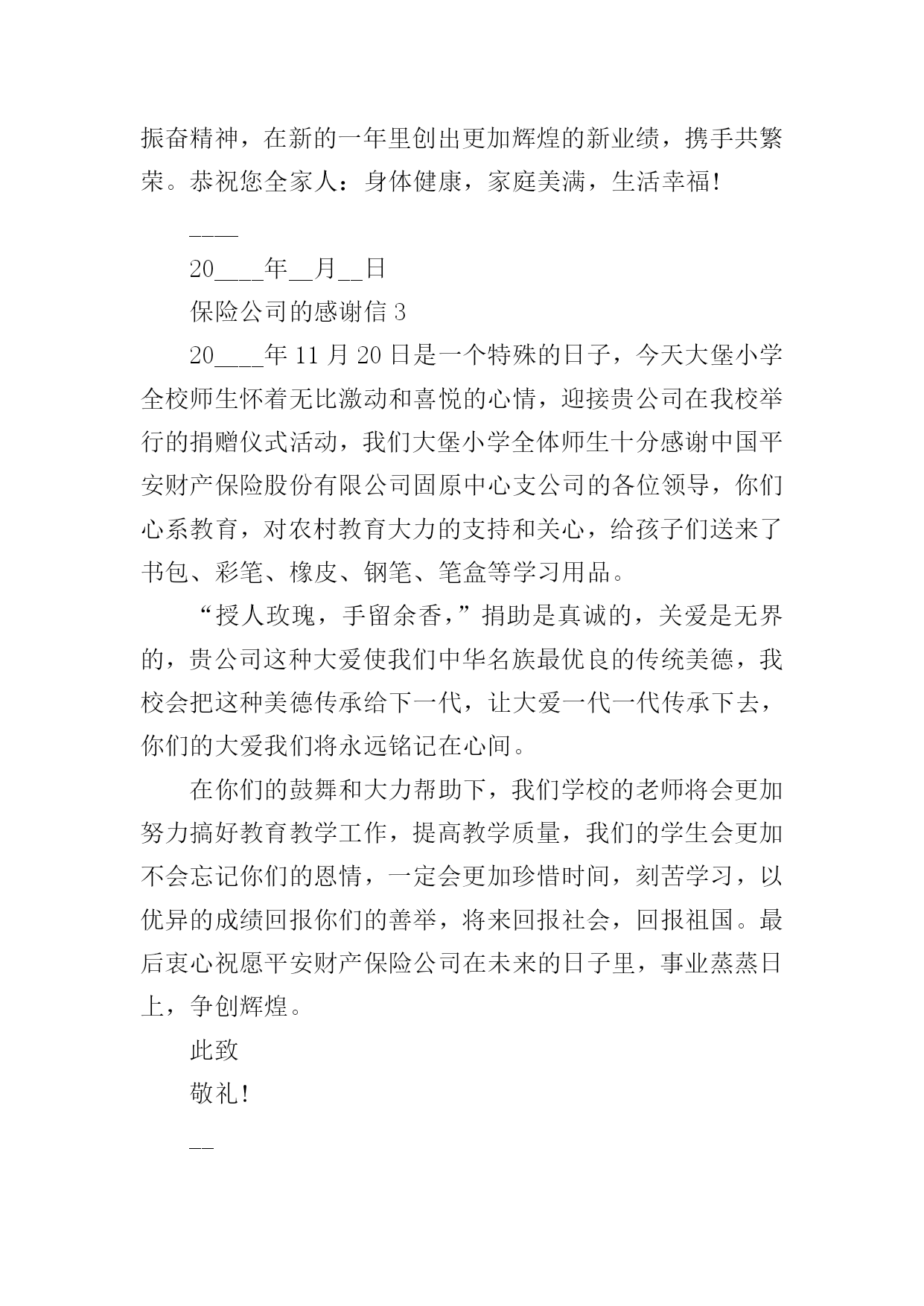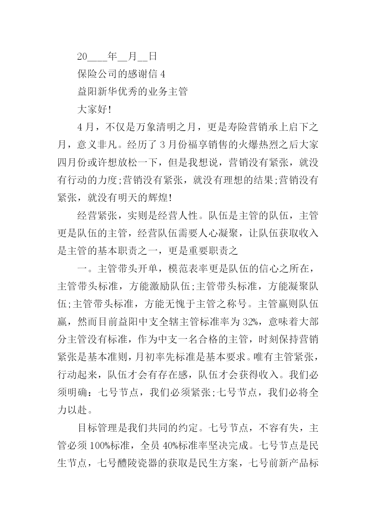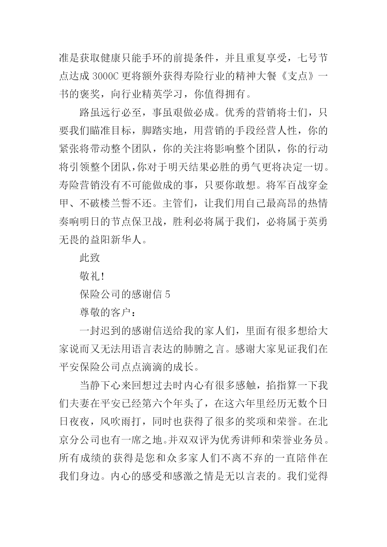 保险公司的感谢信保险公司的感谢信1尊敬的太平洋保险公司全体员工:你们好!在这里,请允许我代表我母亲说几句心里话,去年的这个时间,健健康康的我,由于业务员耐心介绍,细心办理,热情服务,使我顺利成为太平洋保险公司的客户。天有不测风云,人有旦夕祸福。今年5月份,大病降临到我身上,先后在滑县人民医院,新乡中心医院检查住院治疗,仅仅几个月时间,花去了我家所有积蓄,真可谓:辛辛苦苦几十年,一病回到解放前。这也只是控制了疾病发展,并未完全治愈,后期治疗还需要很多很多钱,今年这个时间,太平洋保险公司的领导和业务员,给我送来10000余元理赔款,这真是雪中送炭,我感谢突破性保险公司的领导,感谢太平洋保险公司业务员,也衷心希望所有健健康康的人,都能拥有太平洋保险公司的健康险,这也是对自己负责,对家人负责的表现。再次感谢!____20____年__月__日保险公司的感谢信2尊敬的伙伴家属:你们好!祝你们新春佳节幸福、快乐!您的家人,是我单位的合作伙伴。我们公司20____年正式开业到如今,共同度过了八年的风风雨雨,是伙伴们用他们的辛勤和智慧创造出了骄人的业绩。企业的每一步成长,与您作为家庭后盾的鼓励和扶助都是分不开的。正是有了您对我们事业的理解,对家庭的照顾,我们的员工才能全身心投入工作,我们的事业才能发展壮大,在此我向您表示衷心的感谢!保险,作为一种未来的生活安排,正在被越来越多的人所接受和喜爱。在过去的日子里,因为保险让我们有了很多的接触和交流,伙伴的乐观于睿智,理解与信任让我倍受启迪并心存感激。我们的伙伴来自四面八方,在共同创业和奋斗的过程中,我们就像一个大家庭的兄弟姐妹,同心同德,风雨同舟。我们的企业就是大家的娘家,每时每刻都在关心伙伴的工作和生活。企业是大家的,更是社会的,我们一直致力于企业长远发展、员工共同成长和社会最大贡献。在这里也请您放心,我们会用对待家人的心对待伙伴,让您的家人在这里体会到家庭般的温暖。太平人寿盐城中支在未来的发展过程中将面临更多的机遇和挑战,我衷心地希望你们作为太平人的坚强后盾,一如既往地理解和支持我们,共同经历前进道路上的风雨坎坷。我们会加倍努力,用我们的优秀业绩来回报你们的支持和信任,回报社会对我们的馈赠,在此特书此信,以表达我心中最诚挚的谢意。春回大地千峰秀,日暖神州万象新。愿你们坚定信心、振奋精神,在新的一年里创出更加辉煌的新业绩,携手共繁荣。恭祝您全家人:身体健康,家庭美满,生活幸福!____20____年__月__日保险公司的感谢信320____年11月20日是一个特殊的日子,今天大堡小学全校师生怀着无比激动和喜悦的心情,迎接贵公司在我校举行的捐赠仪式活动,我们大堡小学全体师生十分感谢中国平安财产保险股份有限公司固原中心支公司的各位领导,你们心系教育,对农村教育大力的支持和关心,给孩子们送来了书包、彩笔、橡皮、钢笔、笔盒等学习用品。“授人玫瑰,手留余香,”捐助是真诚的,关爱是无界的,贵公司这种大爱使我们中华名族最优良的传统美德,我校会把这种美德传承给下一代,让大爱一代一代传承下去,你们的大爱我们将永远铭记在心间。在你们的鼓舞和大力帮助下,我们学校的老师将会更加努力搞好教育教学工作,提高教学质量,我们的学生会更加不会忘记你们的恩情,一定会更加珍惜时间,刻苦学习,以优异的成绩回报你们的善举,将来回报社会,回报祖国。最后衷心祝愿平安财产保险公司在未来的日子里,事业蒸蒸日上,争创辉煌。此致敬礼!__20____年__月__日保险公司的感谢信4益阳新华优秀的业务主管大家好!4月,不仅是万象清明之月,更是寿险营销承上启下之月,意义非凡。经历了3月份福享销售的火爆热烈之后大家四月份或许想放松一下,但是我想说,营销没有紧张,就没有行动的力度;营销没有紧张,就没有理想的结果;营销没有紧张,就没有明天的辉煌!经营紧张,实则是经营人性。队伍是主管的队伍,主管更是队伍的主管,经营队伍需要人心凝聚,让队伍获取收入是主管的基本职责之一,更是重要职责之一。主管带头开单,模范表率更是队伍的信心之所在,主管带头标准,方能激励队伍;主管带头标准,方能凝聚队伍;主管带头标准,方能无愧于主管之称号。主管赢则队伍赢,然而目前益阳中支全辖主管标准率为32%,意味着大部分主管没有标准,作为中支一名合格的主管,时刻保持营销紧张是基本准则,月初率先标准是基本要求。唯有主管紧张,行动起来,队伍才会有存在感,队伍才会获得收入。我们必须明确:七号节点,我们必须紧张;七号节点,我们必将全力以赴。目标管理是我们共同的约定。七号节点,不容有失,主管必须100%标准,全员40%标准率坚决完成。七号节点是民生节点,七号醴陵瓷器的获取是民生方案,七号前新产品标准是获取健康只能手环的前提条件,并且重复享受