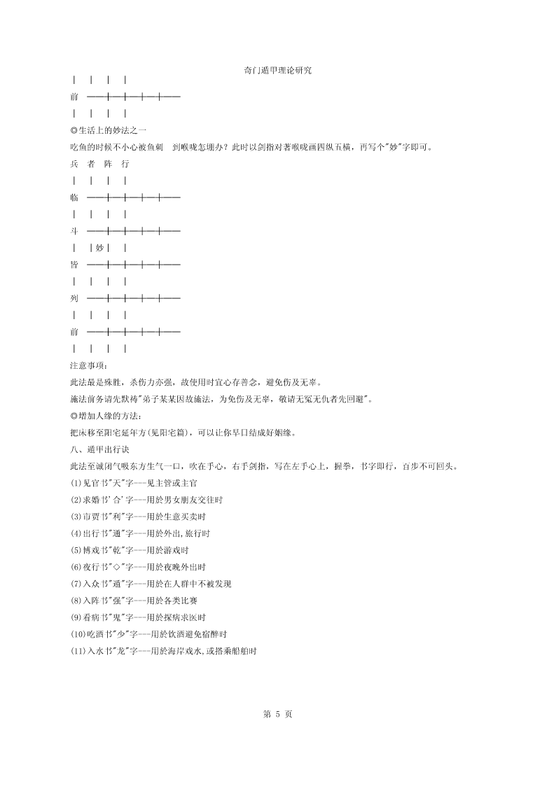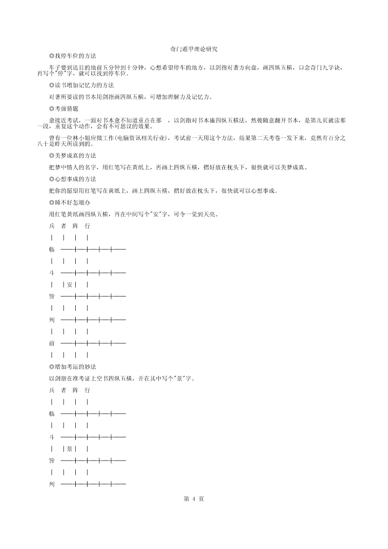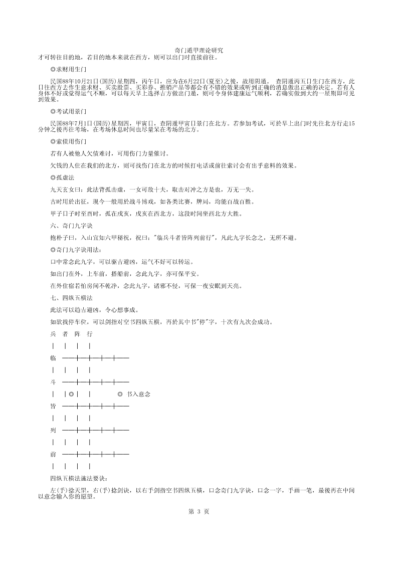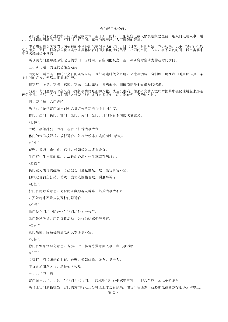 奇门遁甲理论研究《奇门遁甲》创始于轩辕黄帝,由风后演绎成文,后有姜子牙、张良、诸葛亮、刘伯温等著名的政治家、军事家,他们皆善用奇门遁甲治国安邦,并为封建王朝建立了不朽的功勋,成为名垂青史的佳话。《奇门遁甲》是我国古代人民在同大自然作斗争中,经过长期观察,反复验证,概括了天文、地理、术数、民俗、经济、兵法等各方面的知识,是研究和探索自然界的磁场作用在每年、每月、每日、每时对人体生物钟运动线曲影响,以及趋吉避凶的最佳方法。《奇门遁甲》是中华民族的精典著作,也是奇门、六壬、太乙三大秘宝中的第一大秘术,是易经最高层次的预测学,号称帝王之学,又为夺天地造化之学,也是论天体、人和地球运动规律的科学巨著,而地球的磁场就隐藏在奇门遁甲之中,进而使其揭示宇宙间事物发展变化的自然规律也最为深奥,最为精确实用,它的结构独特,其理论应用天干、地支、八卦、九宫、九神、九星、八门等元素,来判断掌握胜负关健的趋势,利用时间、空间,分主客主导时机,奇门遁甲善用自然的力量,增强自己的能量、气势、人缘,永远将自己处在高屋建瓴的方位,洞烛其奸,运筹帷幄。现代社会竞争激烈,人际复杂,我们生存在这个时代,要想脱颖而出,有所作为,除了自己不懈的努力外,本身的运气和行运方位,也是相当重要的,选择不同的方位,可以改变不同的人生方向。环顾我们周遭的环境,拥挤的交通让人觉得危机四伏,出行失事、求职失意、聘用惶惶、投资失误、生意沉浮、考学迷惘、旅游出岔,种种的烦恼常困扰着我们,面对严酷的人生,需要有正确的分析、判断,而《奇门遁甲》正是配合时间、方位,改变人生逆境的学术。《奇门遁甲》的长处,在于剖析事理透彻,运用适中的方法统筹一切,诸如商海谈判,在预设的时空内进行,将有利于争取对方的认同或造成对方屈服于自己的意志之下,进而获得最大的利益和预期目标,只要我们把它意旨灵动的效应,活用到现实人生上,进而开拓并掌握制胜关建的人生运程,那将是自我人生价值的升华,同时更具有对人类社会贡献的深远意义。《奇门遁甲》包含有天文、地理、数学、农学、民俗、经济、军事等各方面的知识,古代用于国事、兵法方面,现时,用于商业发展、市场经营、管理方面的需求甚多,而且收效可喜。何为《奇门遁甲》?奇:是乙、丙、丁三奇,表示日、月、星;门:是休、死、伤、杜、开、惊、生、景,表示乾、坎、艮、震、巽、离、坤、兑等八方各有一门,为之八门;遁甲:是把六甲隐藏于六仪,戊、己、庚、辛、壬、癸之下,合称为《奇门遁甲》,它又分为天地人三盘,地盘:八卦加中五宫为九宫,天盘:八诈直符、腾蛇、太阴、六合、勾陈、朱雀、(白虎、玄武)、九地、九天和九星蓬、芮、冲、辅、禽、心、柱、任、英,人盘:是八门,再用天时二十四节气,以超接置闰之法,演定阴阳九局。奇门遁甲研究一、奇门遁甲起源传说二、从科学的角度来看奇门遁甲三、奇门遁甲的现代功能及运用四、奇门遁甲八门吉凶五、八门应用篇六、奇门九字诀七、四纵五横法八、遁甲出行诀一、奇门遁甲起源传说根据古今图书集成记载,奇门遁甲起源於四千六百多年前,轩辕黄帝大战蚩尤之时;当时我们的祖先黄帝和蚩尤在涿鹿展开一前所未有的场大战,蚩尤身高七尺,铁头铜身刀枪不入,而且会呼风唤雨;在战场上制造迷雾,使得黄帝的部队迷失方向。有一天晚上,三更半夜大家都在睡觉的时候,忽然,轩辕丘上传来惊天动地的声音以及非常强烈的光芒,惊醒了黄帝及众人。於是大家匆匆忙忙的起床,跑过去一看,原来是有一支彩云自天空中缓缓下降;从彩云之中走出一位全身大放光明的仙女,仙女手上捧这一个长九寸阔八寸的玉匣,黄帝接过来打开一看,里面有一本天篆文册龙甲神章;黄帝根据书里面的记载制造指南车终於打败了蚩尤。龙甲神章除了记载兵器的打造方法之外,还记载了很多行军打仗遣兵调将的兵法。於是黄帝要他的宰相风后把龙甲神章演译成兵法十三章,孤虚法十二章,奇门遁甲一千零八十局。後来经过周朝姜太公,汉代黄石老人,再传给张良,张良把它精简之後变成现在我们看到的奇门遁甲。在我们小的时候,学校教我们说,我们的祖先黄帝发明了指南车;可是你们知道吗,福特汽车在研发过程中,动用了一百多个工程师无法解决的问题,後来在记载中国古科学的书上,找到指南车的制造方法,才找到答案,用变速齿轮解决汽车转弯时的平衡问题。你知道变速齿轮是什么吗?你相信四千六百多年前的老祖宗有这种智慧吗?根据前言的叙述彩云下降的时候会有轰声雷动,神光缭绕,天鼓大震。所以我们相信彩云是来自外太空或地球前古文明的飞行器,降临地球,把这神奇的学问传授给轩辕黄帝,然後经过先贤的演化成奇门遁甲流传至今。二、从科学的角度来看奇门遁甲奇门遁甲理论研究奇门遁甲的演译过程中,用八卦记载方位,用十天干隐其一,配九宫记载天象及地象之