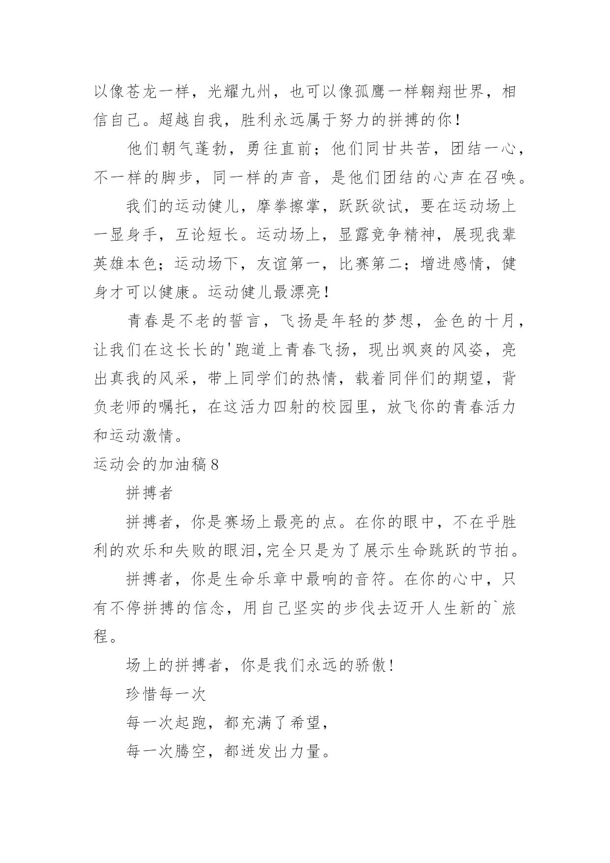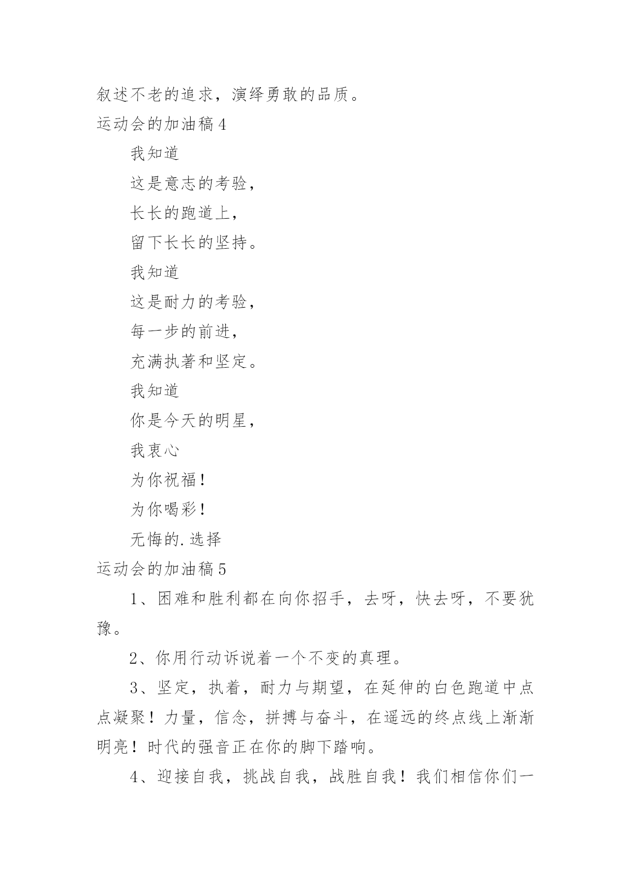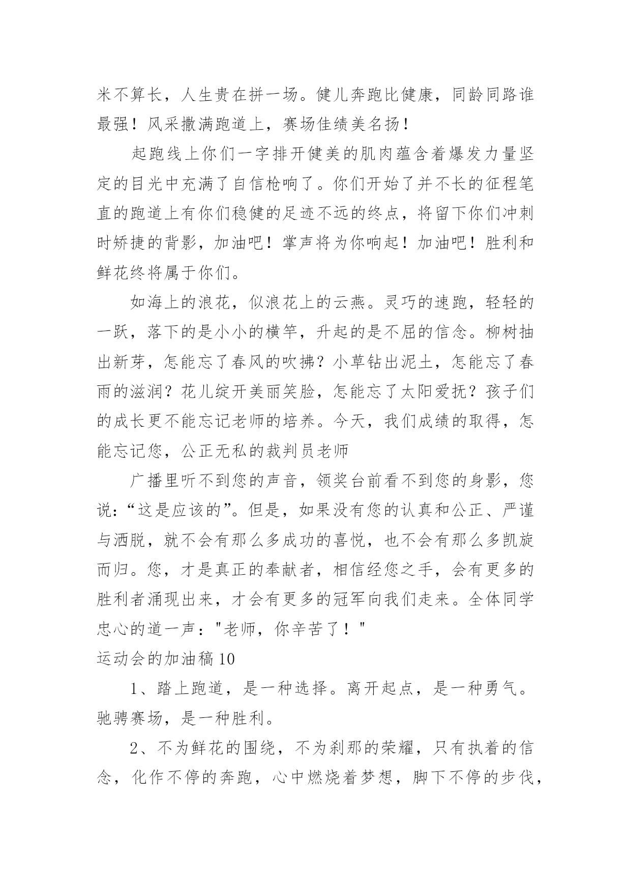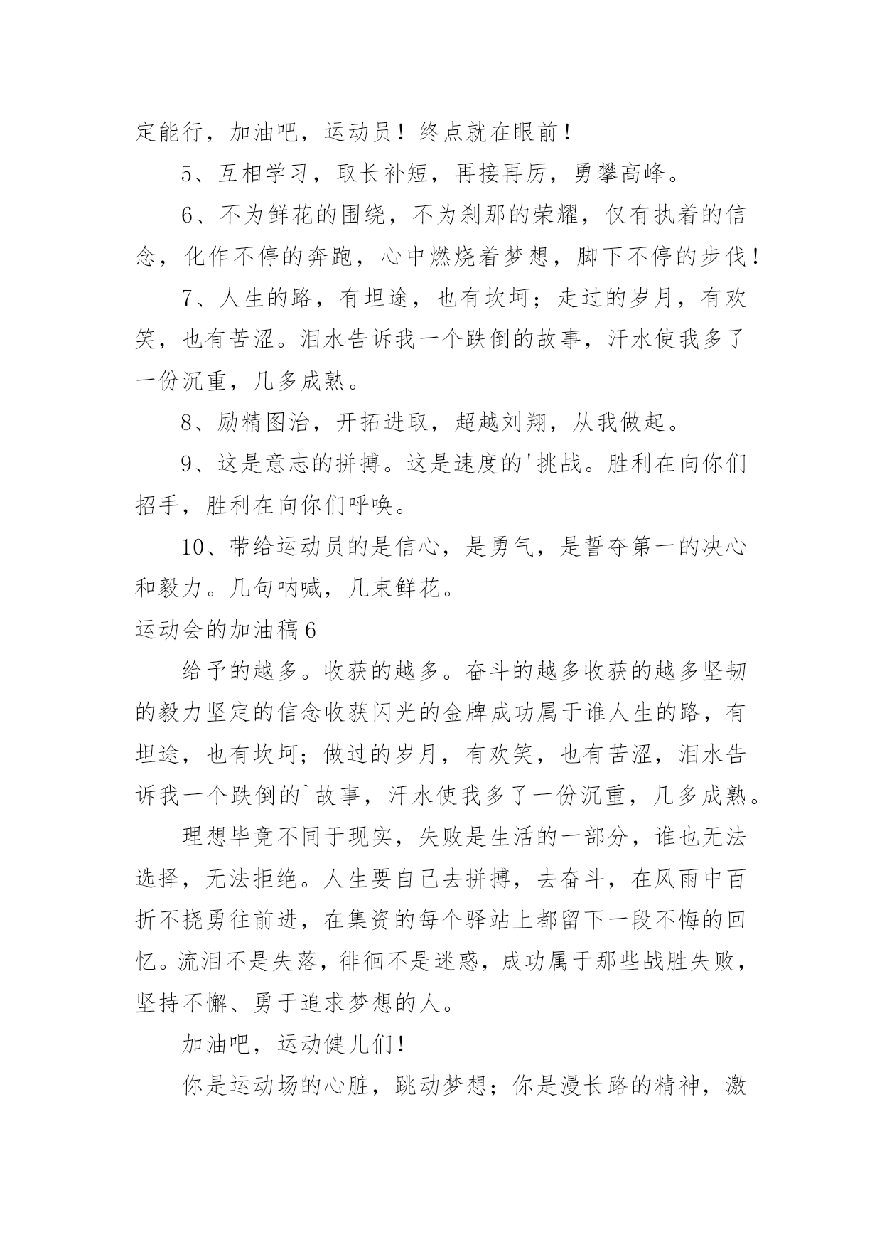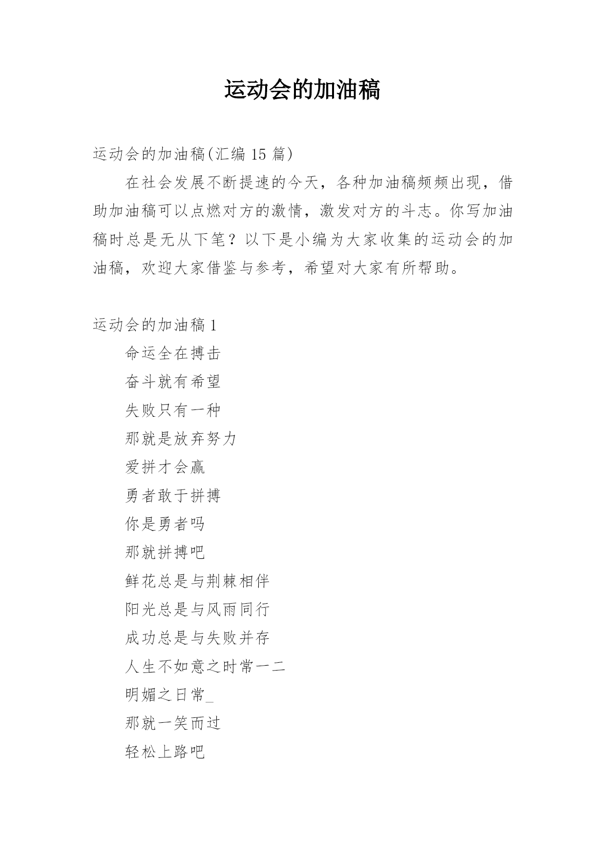 运动会的加油稿运动会的加油稿(汇编15篇)在社会发展不断提速的今天,各种加油稿频频出现,借助加油稿可以点燃对方的激情,激发对方的斗志。你写加油稿时总是无从下笔?以下是小编为大家收集的运动会的加油稿,欢迎大家借鉴与参考,希望对大家有所帮助。运动会的加油稿1命运全在搏击奋斗就有希望失败只有一种那就是放弃努力爱拼才会赢勇者敢于拼搏你是勇者吗那就拼搏吧鲜花总是与荆棘相伴阳光总是与风雨同行成功总是与失败并存人生不如意之时常一二明媚之日常_那就一笑而过轻松上路吧运动会的加油稿21、致100米运动员运动场上有你们的步伐,那是辛苦汗水的抒发,你就像天边的云端,有彩霞的绚丽色彩。奔驰的骏马,飞奔的步伐让你的胜利在前方等待。2、为你们祝福,为你们喝彩!致运动员某一天,醒在梦的旁边;手指间,光线有些特别;我看得见,看见光在变,变成七彩的寓言,飞向梦的起点。3、某一天,飞奔在跑道间;两腮间,汗水不断流出;我感觉到,感觉你在变,变成生活的`强者,奔向成功的边缘!虽然,天阴沉沉的,虽然,有些隐隐的寒意。但是,每个人都昂首向前,每个人都精神焕发,每个人都向着终点向着胜利冲去!4、运动员们,你们是我们的骄傲,我们,为你们加油!为你们欢呼!为你们喝彩!以你们为荣!你们永远是体育宝座上灿烂夺目的珍珠,你们是在蓝天中展翅飞翔的雏鹰。茫茫中,胜利永远属于你。加油!5、不要怕失败,不要怕冷落,无论何时,我们以你为荣,为你们骄傲!致运动员一千五百米是时间的磨练,是毅力的考验。虽然前途茫茫,但只要努力,总会胜利到达成功的彼岸。运动员们,不要因为前途茫茫而灰心丧气,不要因为成绩不理想而放弃自己。6、风行天下你没有忘记,把闪亮的青春飞扬,你没有忘记,把身姿驰向胜利的方向,风一样的驰骋,风一样的纵横,不要轻言放弃,因为我们已为青春宣誓——风行天下!7、致运动员你是跑道上划过的流星,燃烧自己,洒下光辉,也许你并没有看到成功像你挥手,但你已奋斗拼搏过,相信自己,力量就在心中。8、风雨中洒脱你的激情,阳光下释放你的希冀,没有你过去的过去,只有把握现在,没有你明天的明天,只有眼前的路。逝去的已经逝去,要明白,今天的才是真正的你,用你的真实,你的所有,挥洒出心中的希望。运动会的加油稿3生活需要运动,世界需要自动化。我们是有抱负的一代。我们是第一代勇敢战斗的人。人生可以有几次,在这个时候不去拼搏。拼写!拼写!拼写!阐明我们的骄傲,也阐明我们的士气。在球场上,我们是勇敢的!加油!赢!因为你是最棒的成功!终于成功了!我们为你加油,我们为你加油!你是最好的,因为你相信自己,你是最好的,因为你有力量。你也是最可爱的,因为你展现了自己的风格。你,梁青青,以自动化为荣。你是自动化积分的序曲,是运动员竞赛的氛围。走吧!去吧!你站在纪念碑上,向前跑是一面旗子。去吧!胜利属于你们。因为我们相信你!5000米的国歌你像雄鹰,在晴空翱翔,你像金星,在宇宙中闪耀,你像骏马,在战场上驰骋它不像猎豹,在草原上奔跑。你就像一艘快艇,在大海中飞驰胜利的果实等着你去摘希望的高峰,等着你去攀登虽然100米跑道并不长,但运动员们的积极性很高。摸一摸拳头,擦一擦手掌,跳一跳试试。每一秒都是冠军。三年级七班有勇敢的妇女。女人怎么会向男人屈服呢?古时候,木兰被杀。今天,xx跑100米。决心创造新的学校记录,赢得第一枚奥运奖牌瞬间凝固一年一度的运动会如期举行。壮丽的“秋天的战场”,它一定给了我们说不出的激情。于是我放下笔,感觉脉搏和心跳的强度。在期待中,它是悲伤或快乐,快乐或疯狂,所有这些都是未知的,但我们知道,我们有这样一个体育赛事。我们曾经不计本地成本的付出,在这个与梦想碰撞的季节里得到认可和实现,结果如何并不重要。它使我们的.智力和体力平等竞争,在比赛中,体现了我们执着的精神和自信。我们渴望,我们支持,我们为登上领奖台的英雄欢呼,我们也为失败者喝彩。因为瞬间可以凝固成永恒的画面,叙述不老的追求,演绎勇敢的品质。运动会的加油稿4我知道这是意志的考验,长长的跑道上,留下长长的坚持。我知道这是耐力的考验,每一步的前进,充满执著和坚定。我知道你是今天的明星,我衷心为你祝福!为你喝彩!无悔的.选择运动会的加油稿51、困难和胜利都在向你招手,去呀,快去呀,不要犹豫。2、你用行动诉说着一个不变的真理。3、坚定,执着,耐力与期望,在延伸的白色跑道中点点凝聚!力量,信念,拼搏与奋斗,在遥远的终点线上渐渐明亮!时代的强音正在你的脚下踏响。4、迎接自我,挑战自我,战胜自我!我们相信你们一定能行,加油吧,运动员!终点就在眼前!5、互相学习,取长补短,再接再厉,勇攀高峰。6、不为鲜花的围绕,不为刹那的荣耀,仅有执着的信念,化作不停的奔跑,心中燃烧着梦想,脚下不停的步伐!7、人生的路,有坦途,也有坎坷;走过的岁月,有欢笑,也有苦涩。泪水告诉我一个跌倒的
