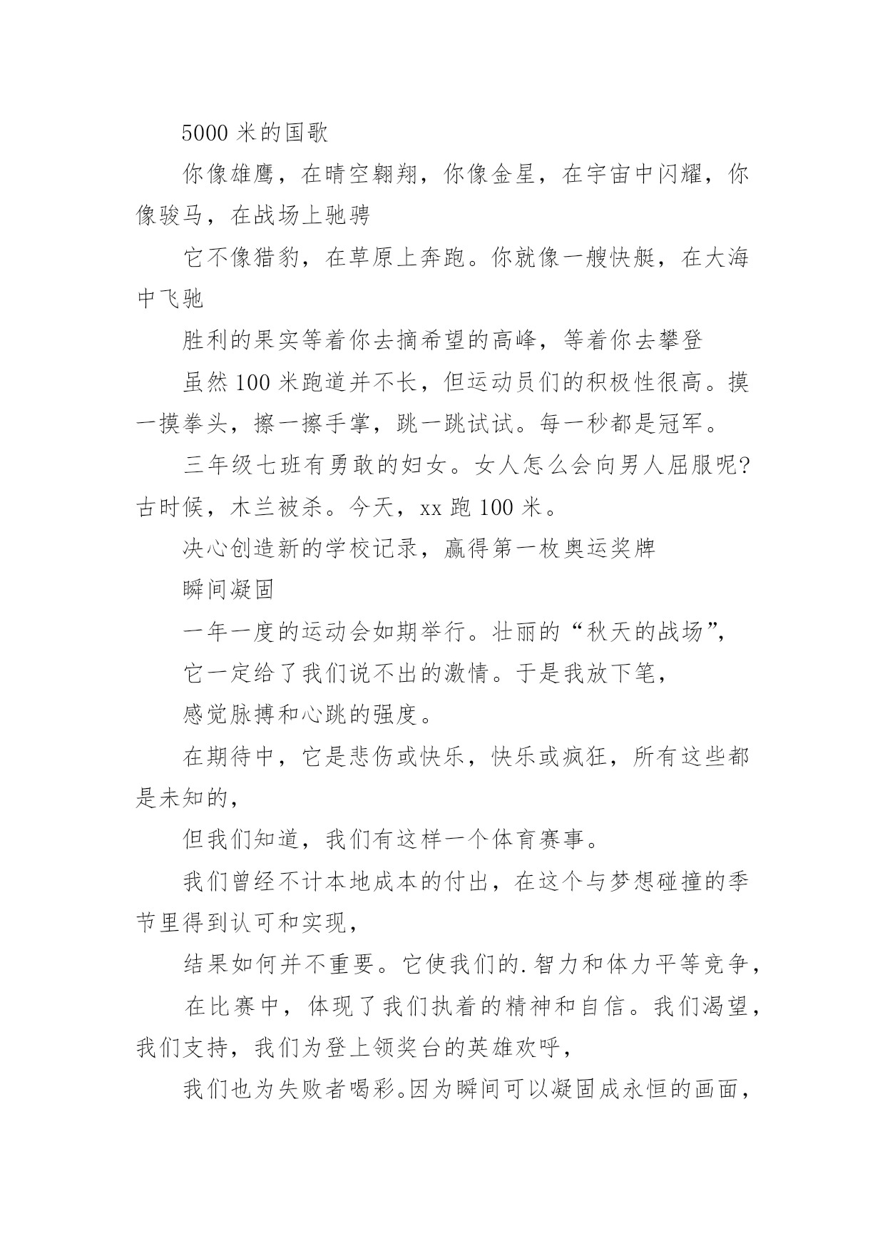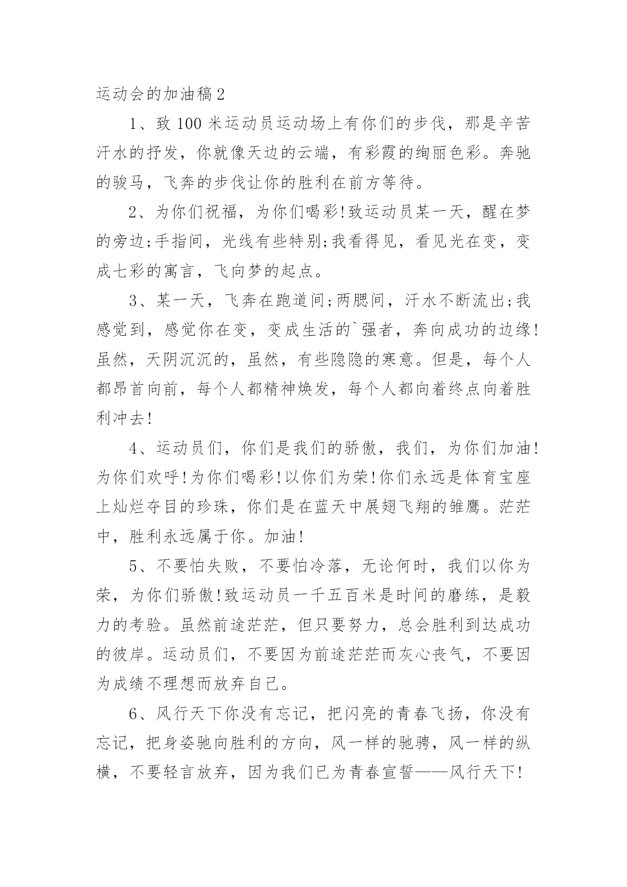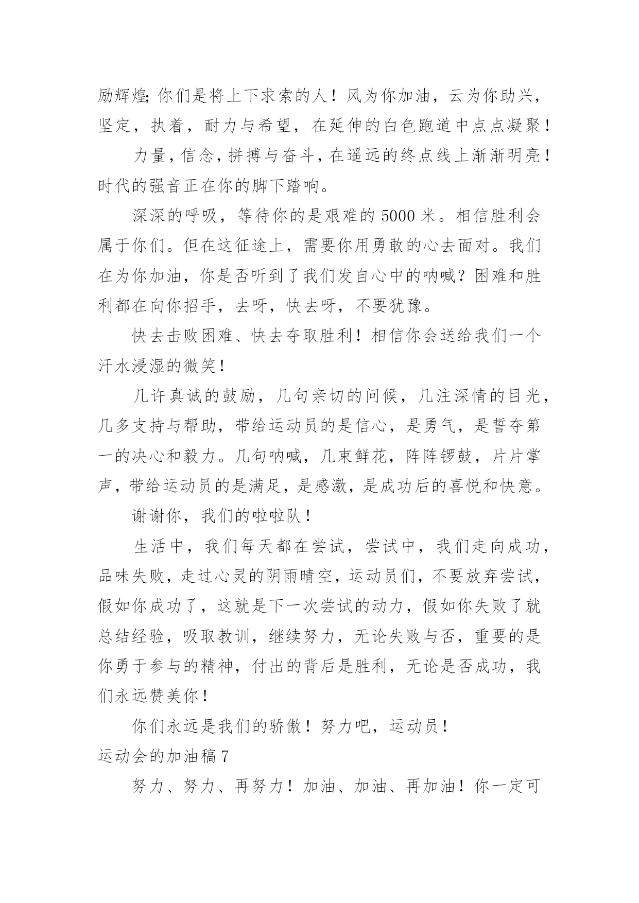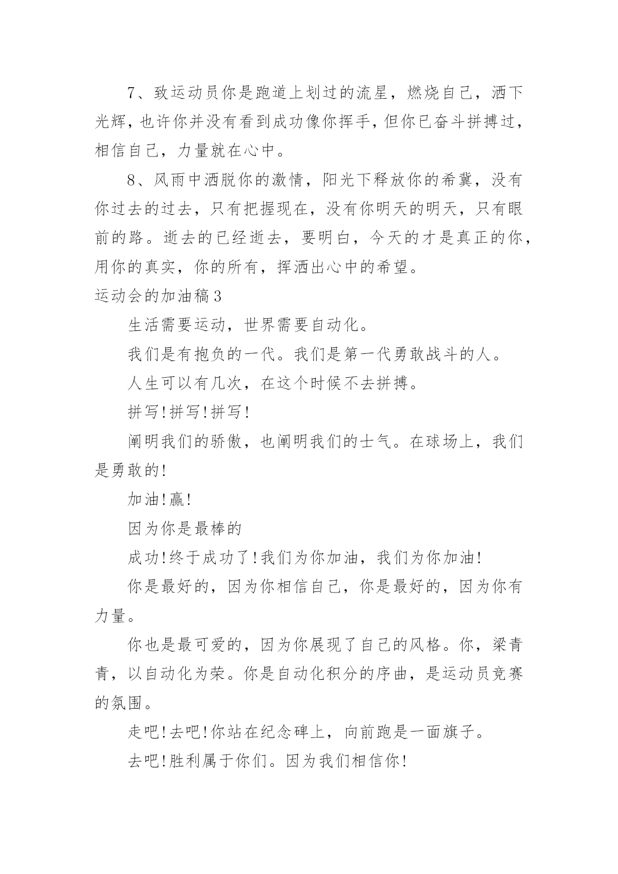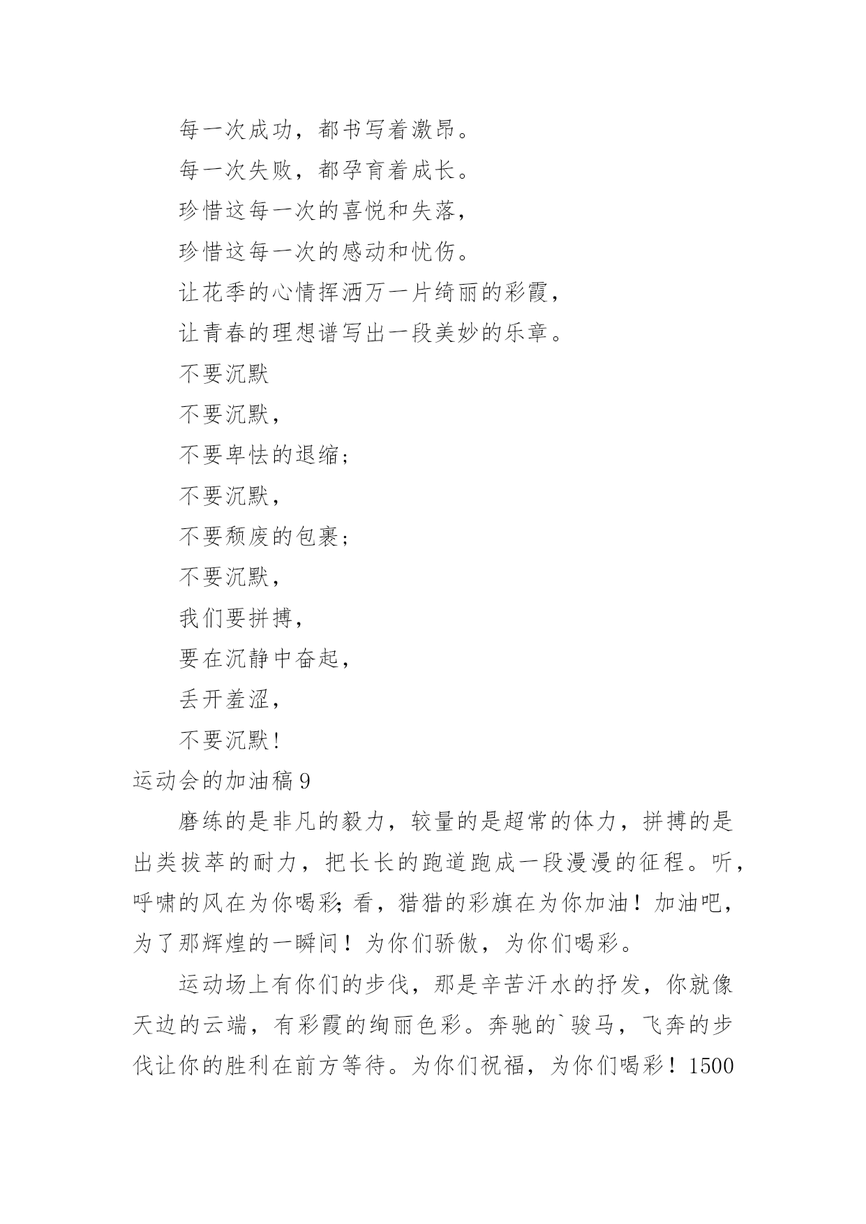 运动会的加油稿运动会的加油稿(汇编15篇)在社会发展不断提速的今天,各种加油稿频频出现,借助加油稿可以点燃对方的激情,激发对方的斗志。你写加油稿时总是无从下笔?以下是小编为大家收集的运动会的加油稿,欢迎大家借鉴与参考,希望对大家有所帮助。运动会的加油稿1命运全在搏击奋斗就有希望失败只有一种那就是放弃努力爱拼才会赢勇者敢于拼搏你是勇者吗那就拼搏吧鲜花总是与荆棘相伴阳光总是与风雨同行成功总是与失败并存人生不如意之时常一二明媚之日常_那就一笑而过轻松上路吧运动会的加油稿21、致100米运动员运动场上有你们的步伐,那是辛苦汗水的抒发,你就像天边的云端,有彩霞的绚丽色彩。奔驰的骏马,飞奔的步伐让你的胜利在前方等待。2、为你们祝福,为你们喝彩!致运动员某一天,醒在梦的旁边;手指间,光线有些特别;我看得见,看见光在变,变成七彩的寓言,飞向梦的起点。3、某一天,飞奔在跑道间;两腮间,汗水不断流出;我感觉到,感觉你在变,变成生活的`强者,奔向成功的边缘!虽然,天阴沉沉的,虽然,有些隐隐的寒意。但是,每个人都昂首向前,每个人都精神焕发,每个人都向着终点向着胜利冲去!4、运动员们,你们是我们的骄傲,我们,为你们加油!为你们欢呼!为你们喝彩!以你们为荣!你们永远是体育宝座上灿烂夺目的珍珠,你们是在蓝天中展翅飞翔的雏鹰。茫茫中,胜利永远属于你。加油!5、不要怕失败,不要怕冷落,无论何时,我们以你为荣,为你们骄傲!致运动员一千五百米是时间的磨练,是毅力的考验。虽然前途茫茫,但只要努力,总会胜利到达成功的彼岸。运动员们,不要因为前途茫茫而灰心丧气,不要因为成绩不理想而放弃自己。6、风行天下你没有忘记,把闪亮的青春飞扬,你没有忘记,把身姿驰向胜利的方向,风一样的驰骋,风一样的纵横,不要轻言放弃,因为我们已为青春宣誓——风行天下!7、致运动员你是跑道上划过的流星,燃烧自己,洒下光辉,也许你并没有看到成功像你挥手,但你已奋斗拼搏过,相信自己,力量就在心中。8、风雨中洒脱你的激情,阳光下释放你的希冀,没有你过去的过去,只有把握现在,没有你明天的明天,只有眼前的路。逝去的已经逝去,要明白,今天的才是真正的你,用你的真实,你的所有,挥洒出心中的希望。运动会的加油稿3生活需要运动,世界需要自动化。我们是有抱负的一代。我们是第一代勇敢战斗的人。人生可以有几次,在这个时候不去拼搏。拼写!拼写!拼写!阐明我们的骄傲,也阐明我们的士气。在球场上,我们是勇敢的!加油!赢!因为你是最棒的成功!终于成功了!我们为你加油,我们为你加油!你是最好的,因为你相信自己,你是最好的,因为你有力量。你也是最可爱的,因为你展现了自己的风格。你,梁青青,以自动化为荣。你是自动化积分的序曲,是运动员竞赛的氛围。走吧!去吧!你站在纪念碑上,向前跑是一面旗子。去吧!胜利属于你们。因为我们相信你!5000米的国歌你像雄鹰,在晴空翱翔,你像金星,在宇宙中闪耀,你像骏马,在战场上驰骋它不像猎豹,在草原上奔跑。你就像一艘快艇,在大海中飞驰胜利的果实等着你去摘希望的高峰,等着你去攀登虽然100米跑道并不长,但运动员们的积极性很高。摸一摸拳头,擦一擦手掌,跳一跳试试。每一秒都是冠军。三年级七班有勇敢的妇女。女人怎么会向男人屈服呢?古时候,木兰被杀。今天,xx跑100米。决心创造新的学校记录,赢得第一枚奥运奖牌瞬间凝固一年一度的运动会如期举行。壮丽的“秋天的战场”,它一定给了我们说不出的激情。于是我放下笔,感觉脉搏和心跳的强度。在期待中,它是悲伤或快乐,快乐或疯狂,所有这些都是未知的,但我们知道,我们有这样一个体育赛事。我们曾经不计本地成本的付出,在这个与梦想碰撞的季节里得到认可和实现,结果如何并不重要。它使我们的.智力和体力平等竞争,在比赛中,体现了我们执着的精神和自信。我们渴望,我们支持,我们为登上领奖台的英雄欢呼,我们也为失败者喝彩。因为瞬间可以凝固成永恒的画面,叙述不老的追求,演绎勇敢的品质。运动会的加油稿4我知道这是意志的考验,长长的跑道上,留下长长的坚持。我知道这是耐力的考验,每一步的前进,充满执著和坚定。我知道你是今天的明星,我衷心为你祝福!为你喝彩!无悔的.选择运动会的加油稿51、困难和胜利都在向你招手,去呀,快去呀,不要犹豫。2、你用行动诉说着一个不变的真理。3、坚定,执着,耐力与期望,在延伸的白色跑道中点点凝聚!力量,信念,拼搏与奋斗,在遥远的终点线上渐渐明亮!时代的强音正在你的脚下踏响。4、迎接自我,挑战自我,战胜自我!我们相信你们一定能行,加油吧,运动员!终点就在眼前!5、互相学习,取长补短,再接再厉,勇攀高峰。6、不为鲜花的围绕,不为刹那的荣耀,仅有执着的信念,化作不停的奔跑,心中燃烧着梦想,脚下不停的步伐!7、人生的路,有坦途,也有坎坷;走过的岁月,有欢笑,也有苦涩。泪水告诉我一个跌倒的