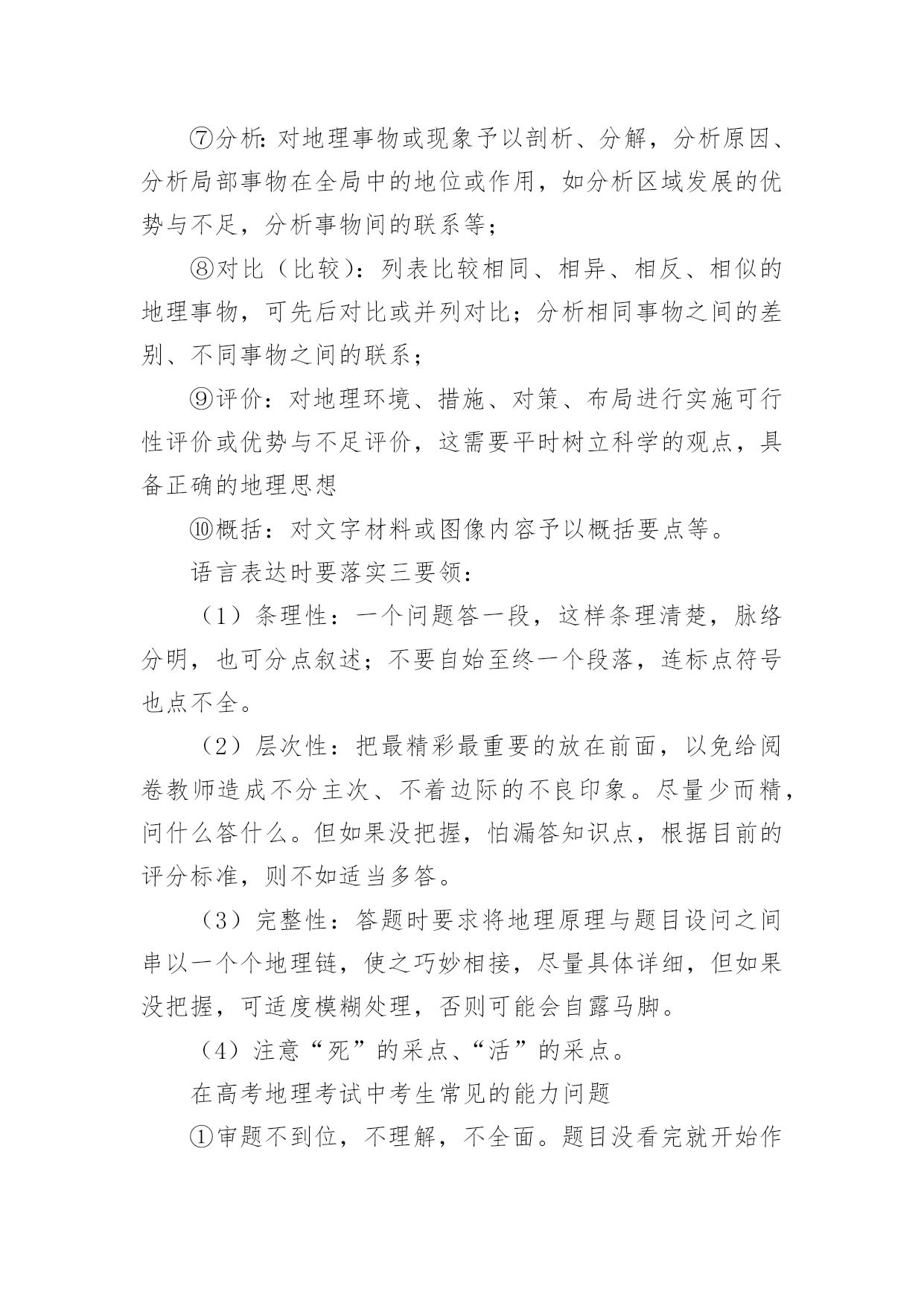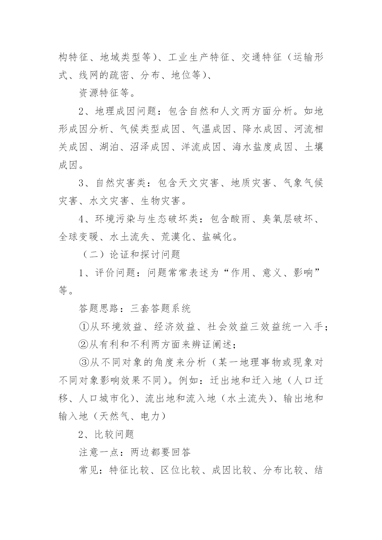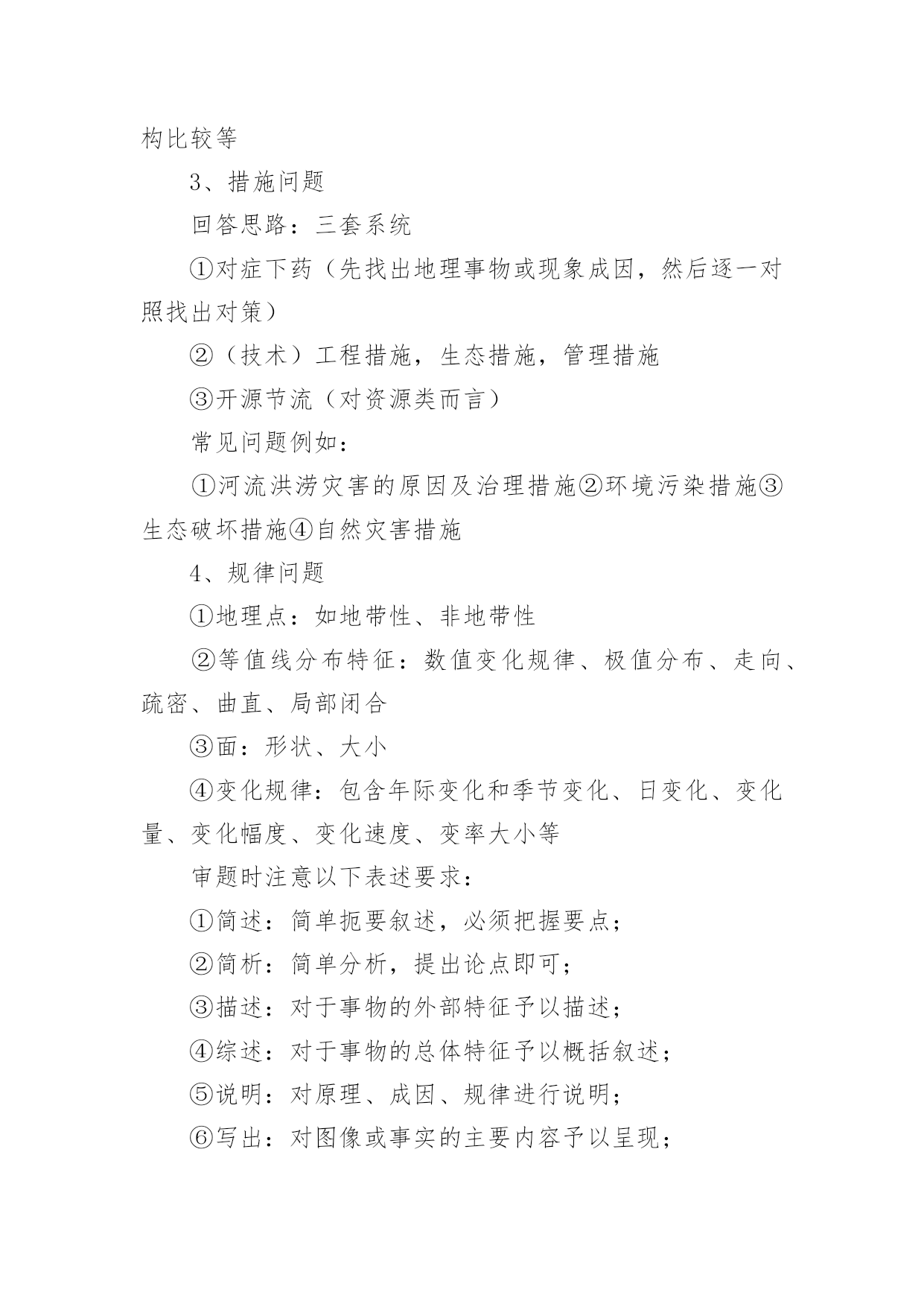 高考地理答题技巧总结高考地理答题技巧总结高考地理重点知识就那么几十个,大家要想在高考中拿高分,地理大题题型和答题技巧就必须要掌握,接下来小编搜集了高考地理答题技巧总结,仅供大家参考,希望帮助到大家。一、选择题解题技巧和规律(一)选择题的命题规律1、选择题的命题具有较强的综合性2、多为单项选择题(如全国卷、天津卷等)3、多为连题型选择题(一个材料包含多个选择题)4、选择题内容更加关注社会热点(二)应试策略1、沉着冷静,相信自己判断2、认真审题3、先易后难,跳过难题或自己认为没有把握的题目,回头再做4、认真检查,但不要轻易改动答案(三)应试技巧1、做到:“三审”,即一审材料(加以引申)、二审题干(画出关键词)、三审选项(找出合理、正确并与材料和题干有关的选项)。2、读完题组内每一个小题,注意各小题之间的前后提示语,然后再从容做题。3、仔细分析题干,明确解题条件4、选项错误的几种情况:(1)因果颠倒(2)前后矛盾(3)表述绝对化(4)概念混淆(5)表述错误或不完整(6)以偏概全,以点带面(7)与题干无关(四)解题方法介绍1、直选法:运用学过的知识可以直接选出来,多考察记忆性知识,注意必须看完所有选项再选择。2、排除法:如果选项罗列地理事物或现象比较多,可以先将选项与题干对照,排除掉明显错误的选项,重点分析剩余选项。3、优选法:如果选项中有多项合理,但题干中有“最”、“主导”、“第一”等字样时,要选择最合理选项。4、转换法:即将条件换成另外一种相同的说法,该说法与选项更直接,利于选择。5、图示法:将比较抽象的内容用直观示意图表示出来,利于选择,如太阳直射点移动、昼夜长短变化等题目。6、逻辑推理法:根据题干提供的条件,判断某种事物是否具有某种性质或结果,需要进行逻辑推理或运算逐步得出正确的结论,即为逻辑推理法。(五)选择题类型:1、正误选择题:可以用排除法、直选法来选择,但必须将所有选项都看完再决定对错。2、最佳选择题:可以用比较法、优选法、直选法来选择。3、因果选择题:由因推果,或由果推因,可以用直选法、推理法、逆向思维法。4、组合型选择题:由多项选择转化为单项选择题,方法是排除法,先确定明显正确或错误选项,最后分析剩下的选项。5、时间和空间顺序排列选择题:解题关键是根据自己最熟悉或有把握的点,确定一个或多个即可选择正确顺序。6、选择题组:先给定材料,图表或文字,然后从几个角度命制几道选择题。做题时注意以下方面:(1)分析材料,画出文字中的关键词,图表反映出的信息,如概念规律、变化趋势、分布等,并将各个信息进行联系或汇总。(2)统览给出的几道选择题,看一下它们之间是否具有条件继承关系、后面题目对前面题目有无启示、每道题用哪个条件,所有条件是否都用到了。二、综合问答题解题技巧和规律综合题常见类别有:(一)、描述和阐释事物1、特征问题:包含自然地理特征,如位置特征、地形特征、气候特征、水系特征、水文特征、地表植被特征、土壤特征等;人文地理特征,如农业生产特征(区位特征、结构特征、地域类型等)、工业生产特征、交通特征(运输形式、线网的疏密、分布、地位等)、资源特征等。2、地理成因问题:包含自然和人文两方面分析。如地形成因分析、气候类型成因、气温成因、降水成因、河流相关成因、湖泊、沼泽成因、洋流成因、海水盐度成因、土壤成因。3、自然灾害类:包含天文灾害、地质灾害、气象气候灾害、水文灾害、生物灾害。4、环境污染与生态破坏类:包含酸雨、臭氧层破坏、全球变暖、水土流失、荒漠化、盐碱化。(二)论证和探讨问题1、评价问题:问题常常表述为“作用、意义、影响”等。答题思路:三套答题系统①从环境效益、经济效益、社会效益三效益统一入手;②从有利和不利两方面来辨证阐述;③从不同对象的角度来分析(某一地理事物或现象对不同对象影响效果不同)。例如:迁出地和迁入地(人口迁移、人口城市化)、流出地和流入地(水土流失)、输出地和输入地(天然气、电力)2、比较问题注意一点:两边都要回答常见:特征比较、区位比较、成因比较、分布比较、结构比较等3、措施问题回答思路:三套系统①对症下药(先找出地理事物或现象成因,然后逐一对照找出对策)②(技术)工程措施,生态措施,管理措施③开源节流(对资源类而言)常见问题例如:①河流洪涝灾害的原因及治理措施②环境污染措施③生态破坏措施④自然灾害措施4、规律问题①地理点:如地带性、非地带性②等值线分布特征:数值变化规律、极值分布、走向、疏密、曲直、局部闭合③面:形状、大小④变化规律:包含年际变化和季节变化、日变化、变化量、变化幅度、变化速度、变率大小等审题时注意以下表述要求:①简述:简单扼要叙述,必须把握要点;②简析:简单分析,提出论点即可;③描述:对于事物的外部特征予以描述;④综述:对于事物的总体特征予以概括叙述;⑤说明:对原理、成因、规律进