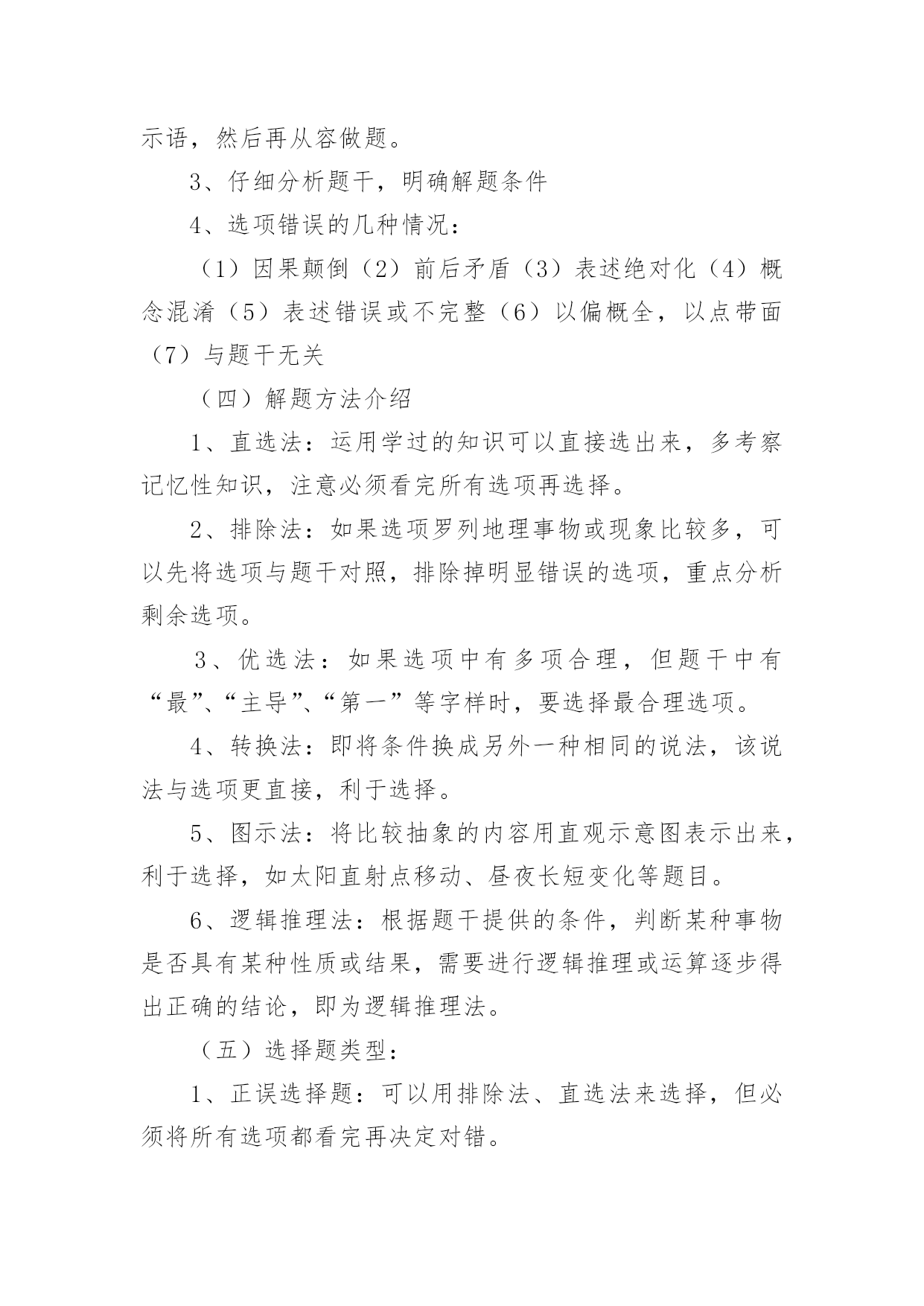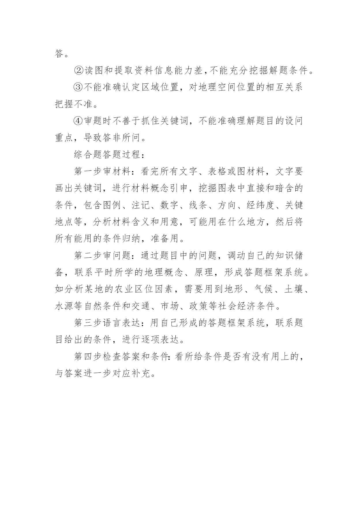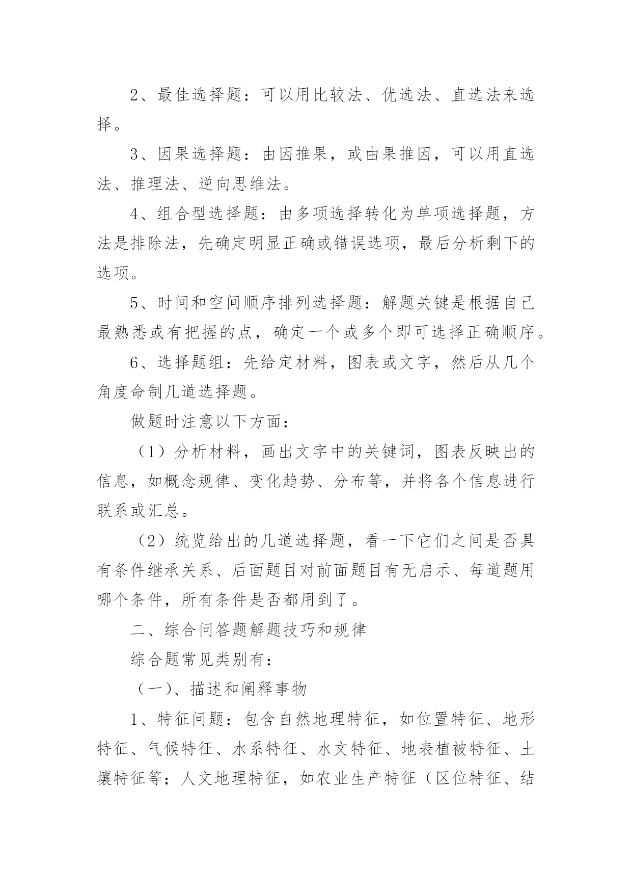 高考地理答题技巧总结高考地理答题技巧总结高考地理重点知识就那么几十个,大家要想在高考中拿高分,地理大题题型和答题技巧就必须要掌握,接下来小编搜集了高考地理答题技巧总结,仅供大家参考,希望帮助到大家。一、选择题解题技巧和规律(一)选择题的命题规律1、选择题的命题具有较强的综合性2、多为单项选择题(如全国卷、天津卷等)3、多为连题型选择题(一个材料包含多个选择题)4、选择题内容更加关注社会热点(二)应试策略1、沉着冷静,相信自己判断2、认真审题3、先易后难,跳过难题或自己认为没有把握的题目,回头再做4、认真检查,但不要轻易改动答案(三)应试技巧1、做到:“三审”,即一审材料(加以引申)、二审题干(画出关键词)、三审选项(找出合理、正确并与材料和题干有关的选项)。2、读完题组内每一个小题,注意各小题之间的前后提示语,然后再从容做题。3、仔细分析题干,明确解题条件4、选项错误的几种情况:(1)因果颠倒(2)前后矛盾(3)表述绝对化(4)概念混淆(5)表述错误或不完整(6)以偏概全,以点带面(7)与题干无关(四)解题方法介绍1、直选法:运用学过的知识可以直接选出来,多考察记忆性知识,注意必须看完所有选项再选择。2、排除法:如果选项罗列地理事物或现象比较多,可以先将选项与题干对照,排除掉明显错误的选项,重点分析剩余选项。3、优选法:如果选项中有多项合理,但题干中有“最”、“主导”、“第一”等字样时,要选择最合理选项。4、转换法:即将条件换成另外一种相同的说法,该说法与选项更直接,利于选择。5、图示法:将比较抽象的内容用直观示意图表示出来,利于选择,如太阳直射点移动、昼夜长短变化等题目。6、逻辑推理法:根据题干提供的条件,判断某种事物是否具有某种性质或结果,需要进行逻辑推理或运算逐步得出正确的结论,即为逻辑推理法。(五)选择题类型:1、正误选择题:可以用排除法、直选法来选择,但必须将所有选项都看完再决定对错。2、最佳选择题:可以用比较法、优选法、直选法来选择。3、因果选择题:由因推果,或由果推因,可以用直选法、推理法、逆向思维法。4、组合型选择题:由多项选择转化为单项选择题,方法是排除法,先确定明显正确或错误选项,最后分析剩下的选项。5、时间和空间顺序排列选择题:解题关键是根据自己最熟悉或有把握的点,确定一个或多个即可选择正确顺序。6、选择题组:先给定材料,图表或文字,然后从几个角度命制几道选择题。做题时注意以下方面:(1)分析材料,画出文字中的关键词,图表反映出的信息,如概念规律、变化趋势、分布等,并将各个信息进行联系或汇总。(2)统览给出的几道选择题,看一下它们之间是否具有条件继承关系、后面题目对前面题目有无启示、每道题用哪个条件,所有条件是否都用到了。二、综合问答题解题技巧和规律综合题常见类别有:(一)、描述和阐释事物1、特征问题:包含自然地理特征,如位置特征、地形特征、气候特征、水系特征、水文特征、地表植被特征、土壤特征等;人文地理特征,如农业生产特征(区位特征、结构特征、地域类型等)、工业生产特征、交通特征(运输形式、线网的疏密、分布、地位等)、资源特征等。2、地理成因问题:包含自然和人文两方面分析。如地形成因分析、气候类型成因、气温成因、降水成因、河流相关成因、湖泊、沼泽成因、洋流成因、海水盐度成因、土壤成因。3、自然灾害类:包含天文灾害、地质灾害、气象气候灾害、水文灾害、生物灾害。4、环境污染与生态破坏类:包含酸雨、臭氧层破坏、全球变暖、水土流失、荒漠化、盐碱化。(二)论证和探讨问题1、评价问题:问题常常表述为“作用、意义、影响”等。答题思路:三套答题系统①从环境效益、经济效益、社会效益三效益统一入手;②从有利和不利两方面来辨证阐述;③从不同对象的角度来分析(某一地理事物或现象对不同对象影响效果不同)。例如:迁出地和迁入地(人口迁移、人口城市化)、流出地和流入地(水土流失)、输出地和输入地(天然气、电力)2、比较问题注意一点:两边都要回答常见:特征比较、区位比较、成因比较、分布比较、结构比较等3、措施问题回答思路:三套系统①对症下药(先找出地理事物或现象成因,然后逐一对照找出对策)②(技术)工程措施,生态措施,管理措施③开源节流(对资源类而言)常见问题例如:①河流洪涝灾害的原因及治理措施②环境污染措施③生态破坏措施④自然灾害措施4、规律问题①地理点:如地带性、非地带性②等值线分布特征:数值变化规律、极值分布、走向、疏密、曲直、局部闭合③面:形状、大小④变化规律:包含年际变化和季节变化、日变化、变化量、变化幅度、变化速度、变率大小等审题时注意以下表述要求:①简述:简单扼要叙述,必须把握要点;②简析:简单分析,提出论点即可;③描述:对于事物的外部特征予以描述;④综述:对于事物的总体特征予以概括叙述;⑤说明:对原理、成因、规律进