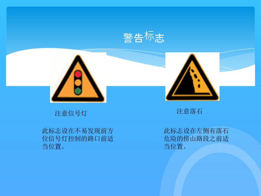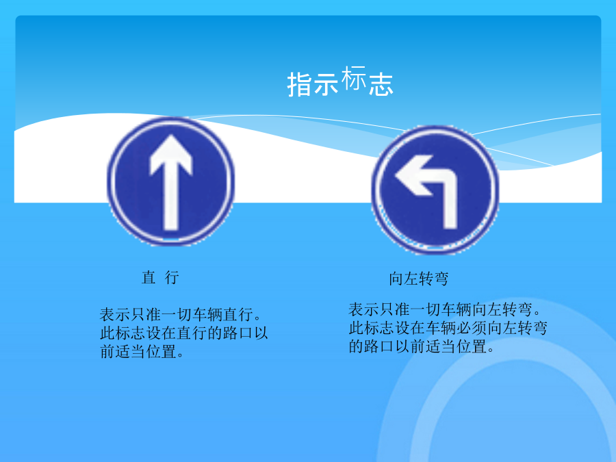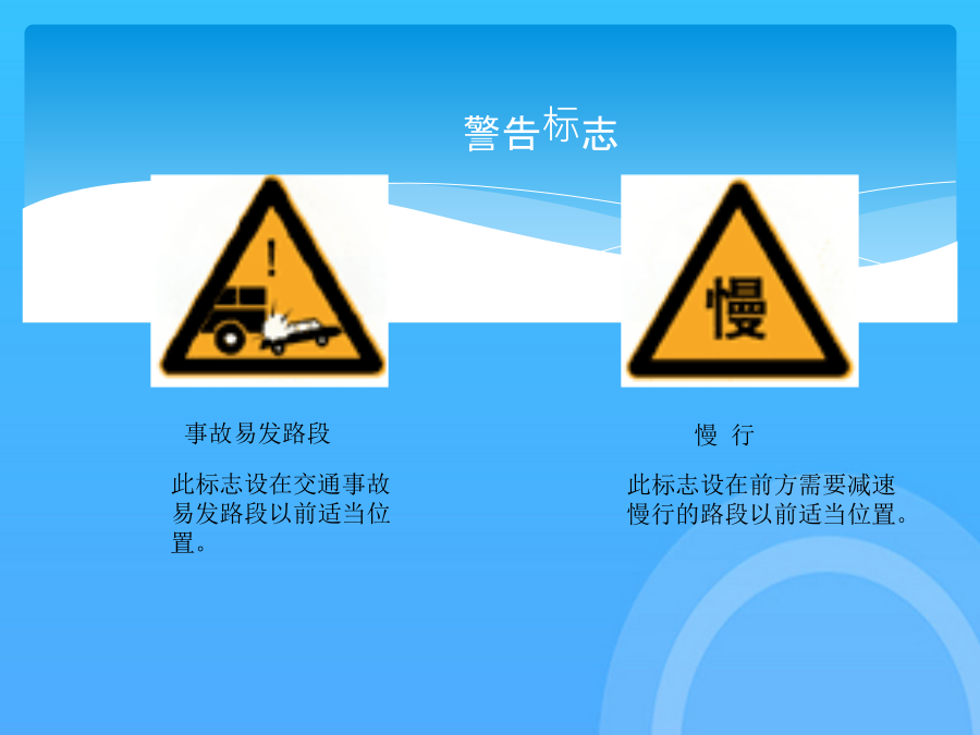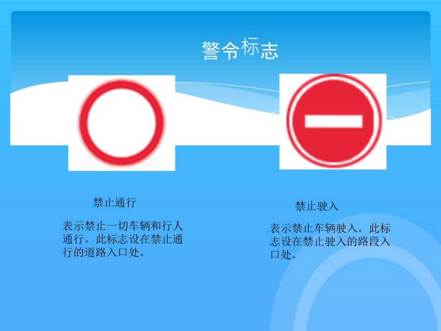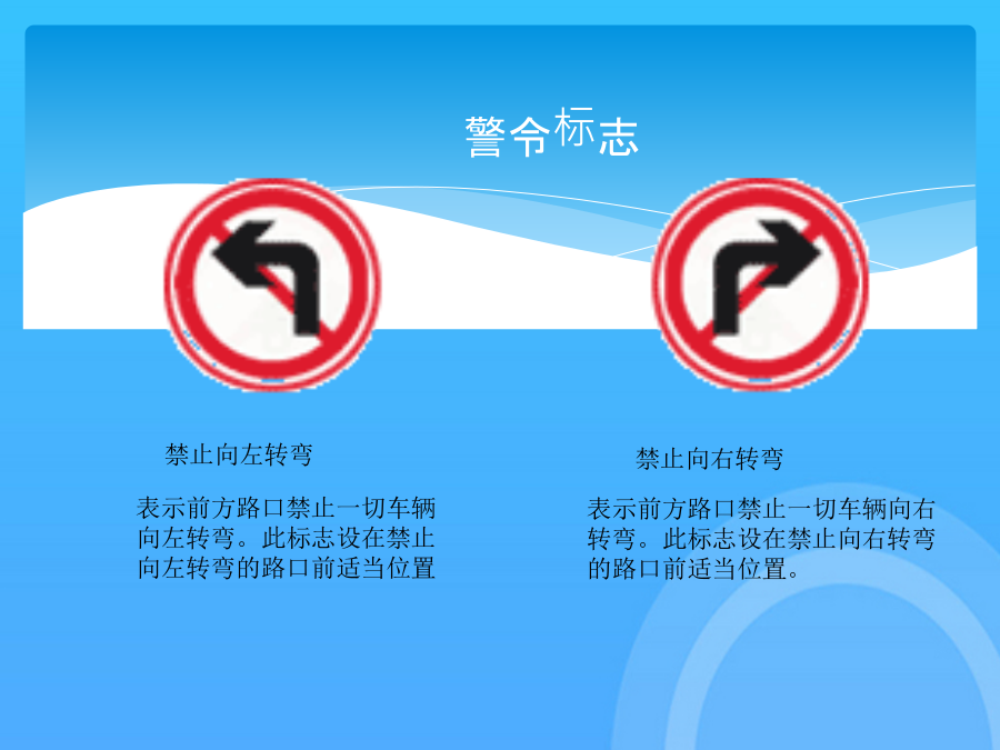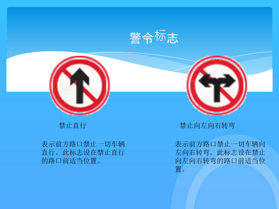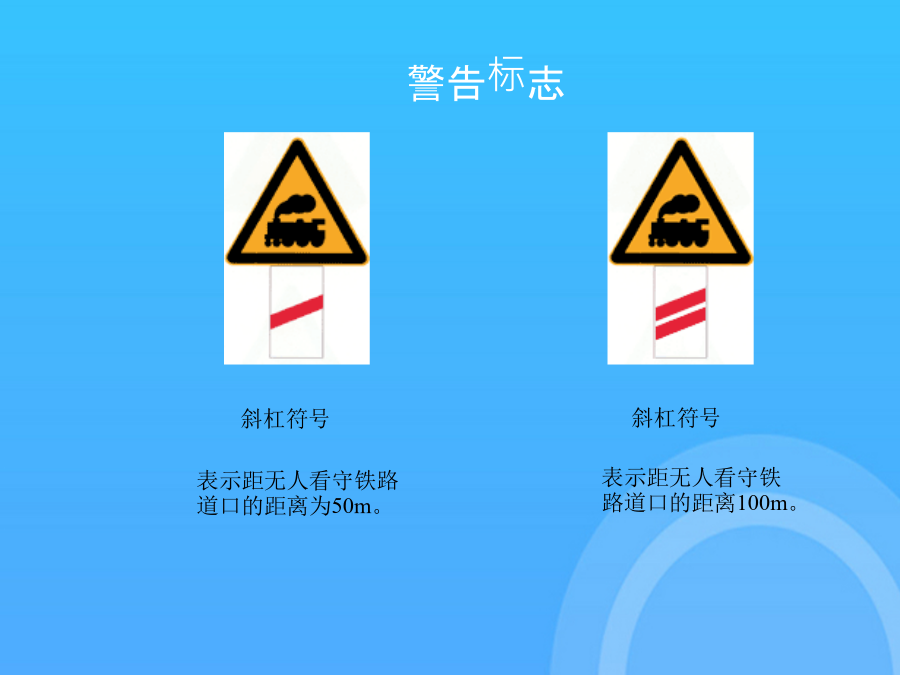 我认识的交通标志警告标志警告标志表示距无人看守铁路道口的距离为50m。此标志设在人行横道的两侧。此标志设在允许机动车掉头路段的起点和路口以前适当位置。表示只准一切车辆直行和向右转弯。此标志设在前方需要减速慢行的路段以前适当位置。此标志设在允许机动车掉头路段的起点和路口以前适当位置。200m前预告高速公路入口二六班张皓宇表示只准一切车辆向左和向右转弯。表示距无人看守铁路道口的距离100m。表示只准一切车辆直行。此标志设在车辆必须向左和向右转弯的路口以前适当位置。表示只准一切车辆靠右侧道路行驶。表示前方路口禁止一切车辆向左转弯。表示该处为专供行人横穿马路的通道。警令标志警令标志警令标志警令标志指示标志指示标志指示标志指示标志指示标志指示标志指路标志指路标志指路标志道路施工安全标志谢谢观赏谢谢