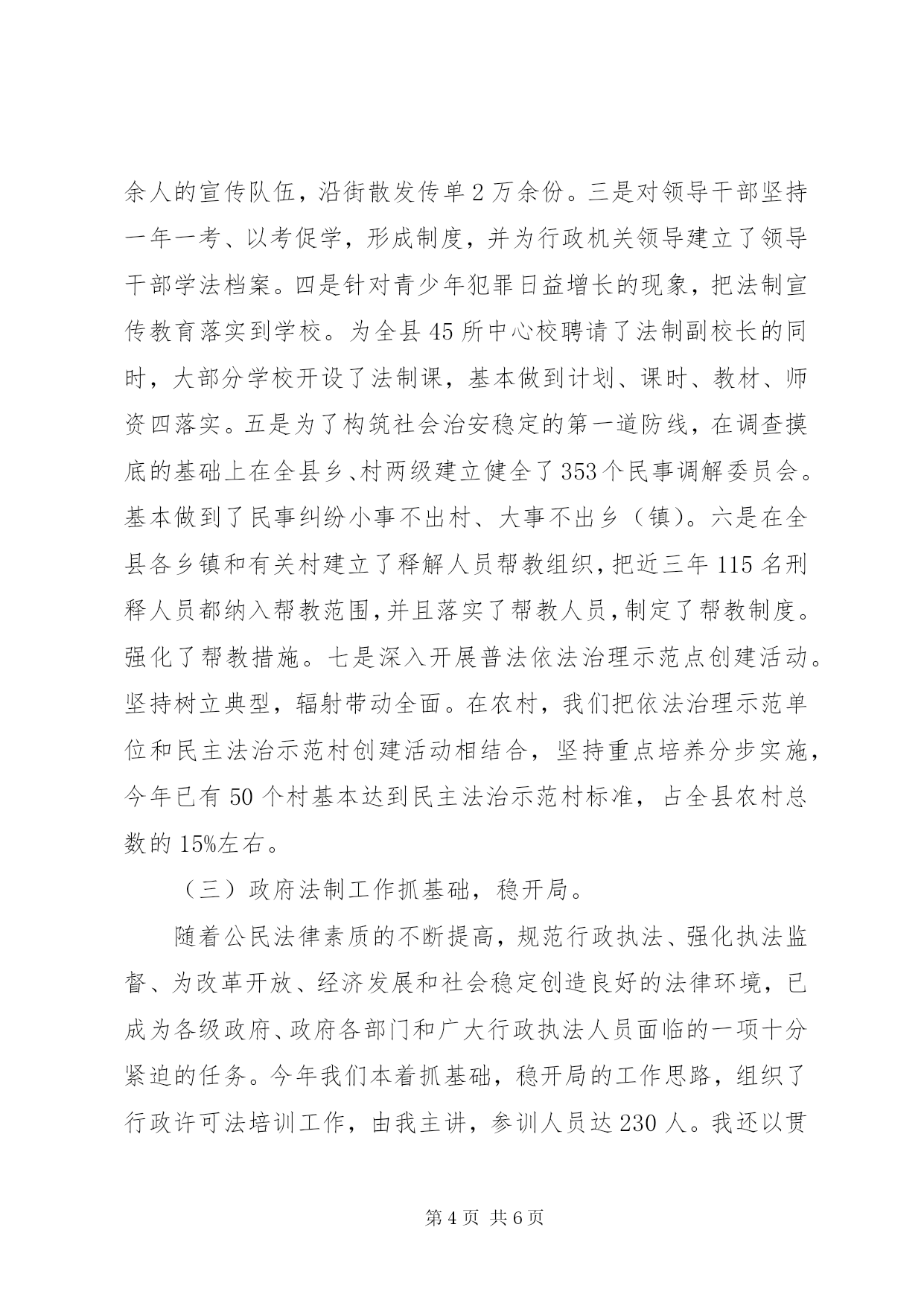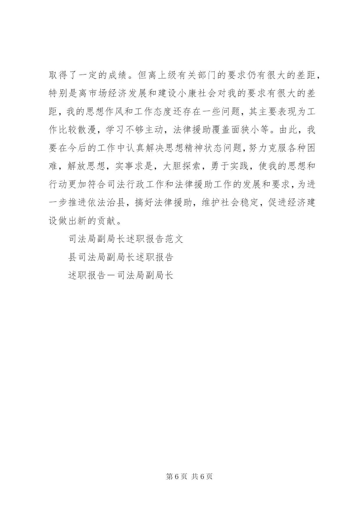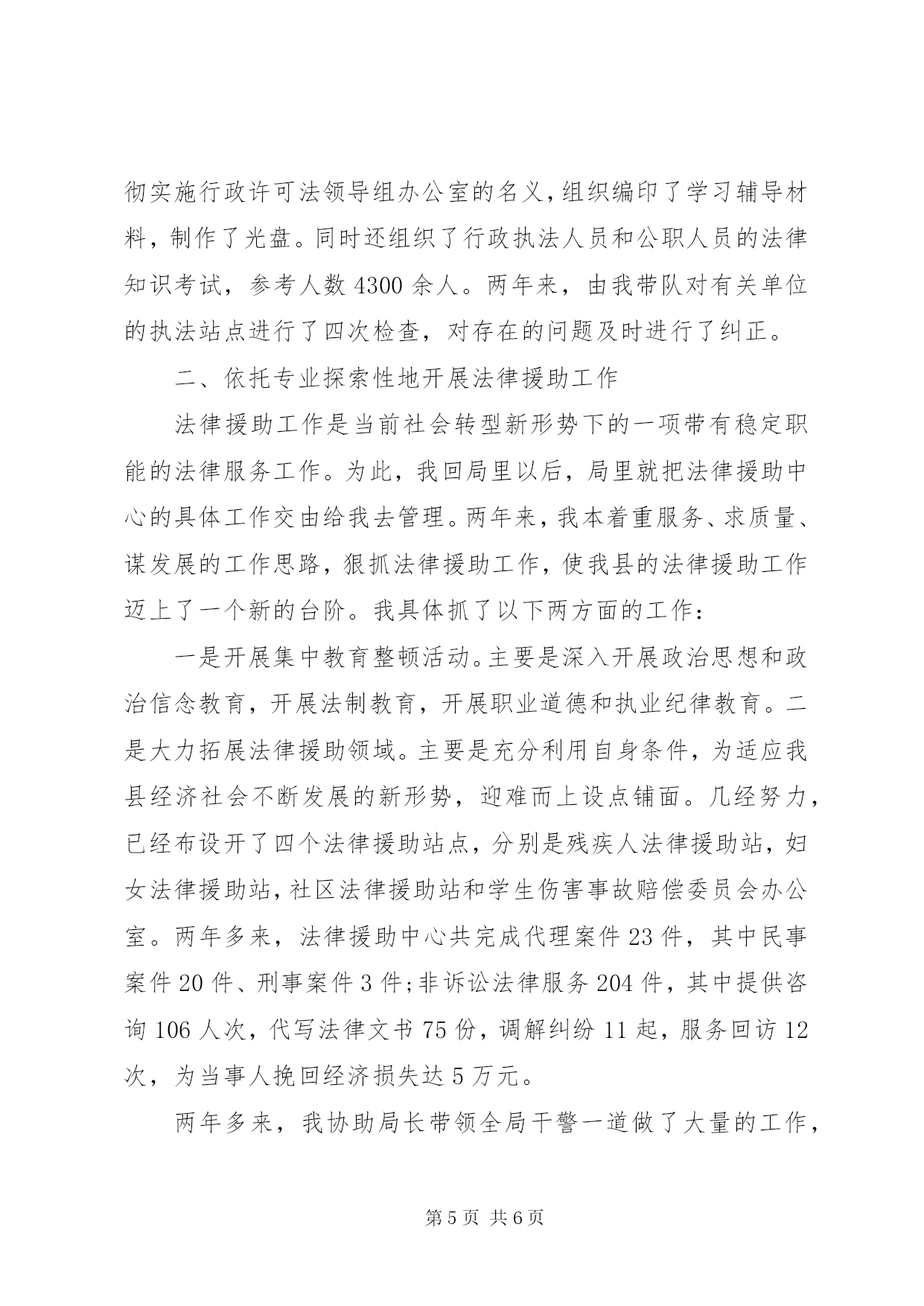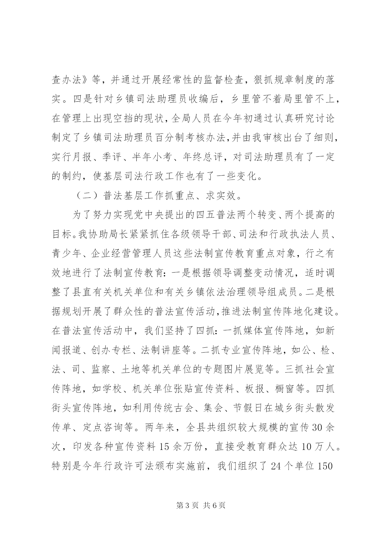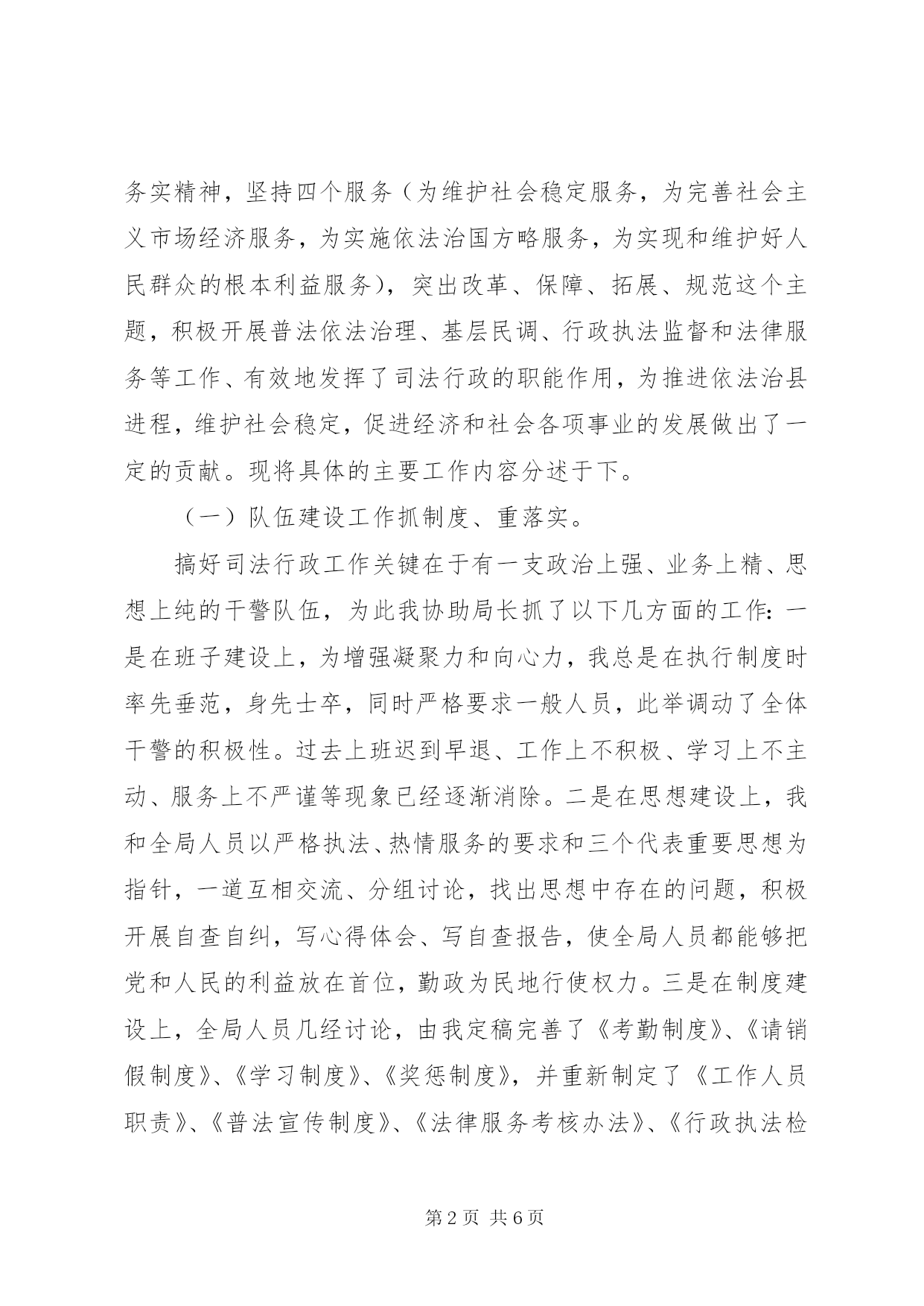 第PAGE\*Arabic\*MERGEFORMAT6页共NUMPAGES\*MERGEFORMAT6页县司法局副局长述职报告范文我是于20xx年7月份由县公证处调XX县区司法局副局长的。两年多来,我一直遵循着协助局长搞全局工作、依托专业抓法律援助的工作思路,开拓视野,创造性地为全局工作出谋划策;努力学习,探索性地开展法律援助工作。经过两年多的锻炼,已经积累了一定的工作经验,掌握了必要的法援技巧,取得了较大的成绩。一、协助局长创造性地搞好全局各项工作县司法行政机关的主要职责。一是组织开展普法宣传教育活动;二是管理公证、律师,法律援助及其它法律服务机构;三是管理基层司法行政工作,指导人民调解、刑释解教人员的安置帮教。司法局兼挂县委依法治县领导组办公室的牌子,负责依法治县日常具体工作;司法局还兼具县政府法制工作机构的职责,具体职能有,一是代替政府草拟并审核备案政府各部门的规范性文件;二是处理政府行政复议案件和行政赔偿案件,并受政府委托出庭应诉;三是组织行政执法人员的教育培训考核工作,并对其执法行为进行监督检查;四是组织开展法制宣传工作,调处各行政机关在执法过程中发生的矛盾争议。两年多来,我和局长带领全局人员齐心协力,克服工作基础差、人员精神不振、文化素质偏低、经费短缺、装备落后等诸多困难,以邓小平理论和三个代表重要思想为指导,大力弘扬求真务实精神,坚持四个服务(为维护社会稳定服务,为完善社会主义市场经济服务,为实施依法治国方略服务,为实现和维护好人民群众的根本利益服务),突出改革、保障、拓展、规范这个主题,积极开展普法依法治理、基层民调、行政执法监督和法律服务等工作、有效地发挥了司法行政的职能作用,为推进依法治县进程,维护社会稳定,促进经济和社会各项事业的发展做出了一定的贡献。现将具体的主要工作内容分述于下。(一)队伍建设工作抓制度、重落实。搞好司法行政工作关键在于有一支政治上强、业务上精、思想上纯的干警队伍,为此我协助局长抓了以下几方面的工作:一是在班子建设上,为增强凝聚力和向心力,我总是在执行制度时率先垂范,身先士卒,同时严格要求一般人员,此举调动了全体干警的积极性。过去上班迟到早退、工作上不积极、学习上不主动、服务上不严谨等现象已经逐渐消除。二是在思想建设上,我和全局人员以严格执法、热情服务的要求和三个代表重要思想为指针,一道互相交流、分组讨论,找出思想中存在的问题,积极开展自查自纠,写心得体会、写自查报告,使全局人员都能够把党和人民的利益放在首位,勤政为民地行使权力。三是在制度建设上,全局人员几经讨论,由我定稿完善了《考勤制度》、《请销假制度》、《学习制度》、《奖惩制度》,并重新制定了《工作人员职责》、《普法宣传制度》、《法律服务考核办法》、《行政执法检查办法》等,并通过开展经常性的监督检查,狠抓规章制度的落实。四是针对乡镇司法助理员收编后,乡里管不着局里管不上,在管理上出现空挡的现状,全局人员在今年初通过认真研究讨论制定了乡镇司法助理员百分制考核办法,并由我审核出台了细则,实行月报、季评、半年小考、年终总评,对司法助理员有了一定的制约,使基层司法行政工作也有了一些变化。(二)普法基层工作抓重点、求实效。为了努力实现党中央提出的四五普法两个转变、两个提高的目标。我协助局长紧紧抓住各级领导干部、司法和行政执法人员、青少年、企业经营管理人员这些法制宣传教育重点对象,行之有效地进行了法制宣传教育:一是根据领导调整变动情况,适时调整了县直有关机关单位和有关乡镇依法治理领导组成员。二是根据规划开展了群众性的普法宣传活动,推进法制宣传阵地化建设。在普法宣传活动中,我们坚持了四抓:一抓媒体宣传阵地,如新闻报道、创办专栏、法制讲座等。二抓专业宣传阵地,如公、检、法、司、监察、土地等机关单位的专题图片展览等。三抓社会宣传阵地,如学校、机关单位张贴宣传资料、板报、橱窗等。四抓街头宣传阵地,如利用传统古会、集会、节假日在城乡街头散发传单、定点咨询等。两年来,全县共组织较大规模的宣传30余次,印发各种宣传资料15余万份,直接受教育群众达10万人。特别是今年行政许可法颁布实施前,我们组织了24个单位150余人的宣传队伍,沿街散发传单2万余份。三是对领导干部坚持一年一考、以考促学,形成制度,并为行政机关领导建立了领导干部学法档案。四是针对青少年犯罪日益增长的现象,把法制宣传教育落实到学校。为全县45所中心校聘请了法制副校长的同时,大部分学校开设了法制课,基本做到计划、课时、教材、师资四落实。五是为了构筑社会治安稳定的第一道防线,在调查摸底的基础上在全县乡、村两级建立健全了353个民事调解委员会。基本做到了民事纠纷小事不出村、大事不出乡(镇)。六是在全县各乡镇和有关村建立了释解人员帮教组织,把近三年115名刑释人员都纳入帮教范