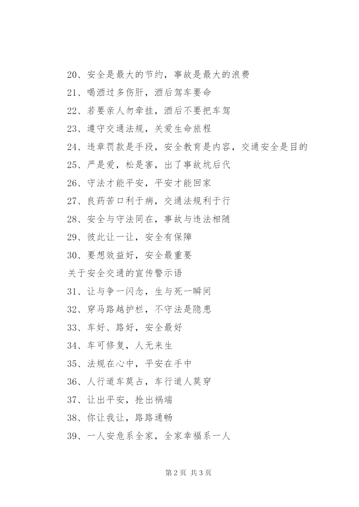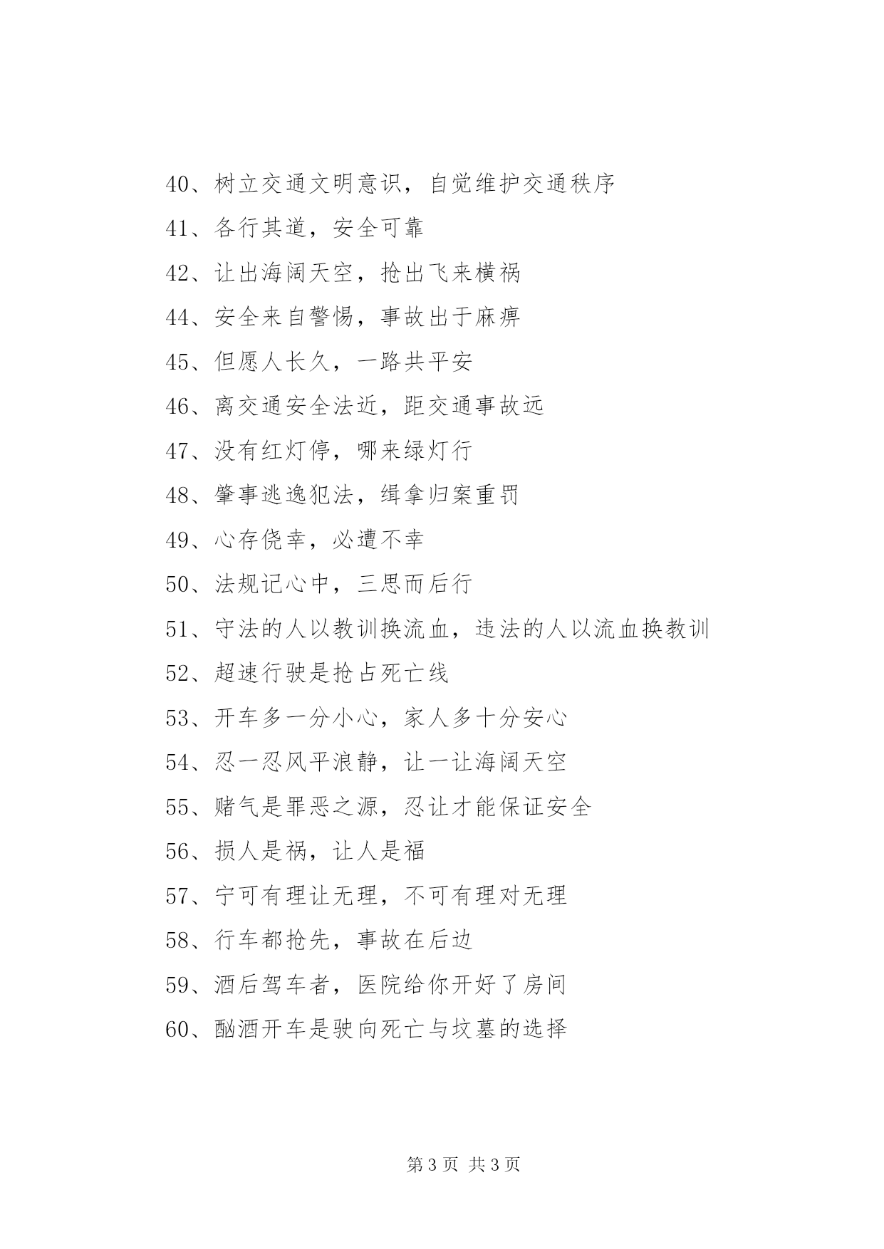 第PAGE\*Arabic\*MERGEFORMAT3页共NUMPAGES\*MERGEFORMAT3页关于安全交通的警示语关于安全交通的警示语推荐1、醉(罪)在酒中,毁(悔)在杯中2、十次肇事九次快,莫和死神去比赛3、文明礼让安全在,瞬间麻痹事故来4、人要安全靠右行,车要安全靠慢行5、实线虚线斑马线,都是生命安全线6、虽为坦途超速者戒;纵有捷径乱穿者止7、超车超速痛快一时,酿成车祸悔恨一生8、礼让三分平安在,抢行一秒后悔迟9、道路非比球场,不要合理冲撞10、骑车请戴安全帽,流汗总比流血好11、爱妻爱子爱家庭,无视交规等于零12、安全带常系生命线,红绿灯常护遵章人13、乱穿马路最危险,文明行路保安全14、违章横穿高速路,难免踏上黄泉路15、心无交规,路有坎坷16、你让我让,安全保障;我争他抢,只有伤亡17、大事小事不如不出事,早到快到不如安全到18、狭路相逢君先过,并驾齐驱君先行19、眼睛中藏不住一粒沙子,开车时来不得半点马虎20、安全是最大的节约,事故是最大的浪费21、喝酒过多伤肝,酒后驾车要命22、若要亲人勿牵挂,酒后不要把车驾23、遵守交通法规,关爱生命旅程24、违章罚款是手段,安全教育是内容,交通安全是目的25、严是爱,松是害,出了事故坑后代26、守法才能平安,平安才能回家27、良药苦口利于病,交通法规利于行28、安全与守法同在,事故与违法相随29、彼此让一让,安全有保障30、要想效益好,安全最重要关于安全交通的宣传警示语31、让与争一闪念,生与死一瞬间32、穿马路越护栏,不守法是隐患33、车好、路好,安全最好34、车可修复,人无来生35、法规在心中,平安在手中36、人行道车莫占,车行道人莫穿37、让出平安,抢出祸端38、你让我让,路路通畅39、一人安危系全家,全家幸福系一人40、树立交通文明意识,自觉维护交通秩序41、各行其道,安全可靠42、让出海阔天空,抢出飞来横祸44、安全来自警惕,事故出于麻痹45、但愿人长久,一路共平安46、离交通安全法近,距交通事故远47、没有红灯停,哪来绿灯行48、肇事逃逸犯法,缉拿归案重罚49、心存侥幸,必遭不幸50、法规记心中,三思而后行51、守法的人以教训换流血,违法的人以流血换教训52、超速行驶是抢占死亡线53、开车多一分小心,家人多十分安心54、忍一忍风平浪静,让一让海阔天空55、赌气是罪恶之源,忍让才能保证安全56、损人是祸,让人是福57、宁可有理让无理,不可有理对无理58、行车都抢先,事故在后边59、酒后驾车者,医院给你开好了房间60、酗酒开车是驶向死亡与坟墓的选择