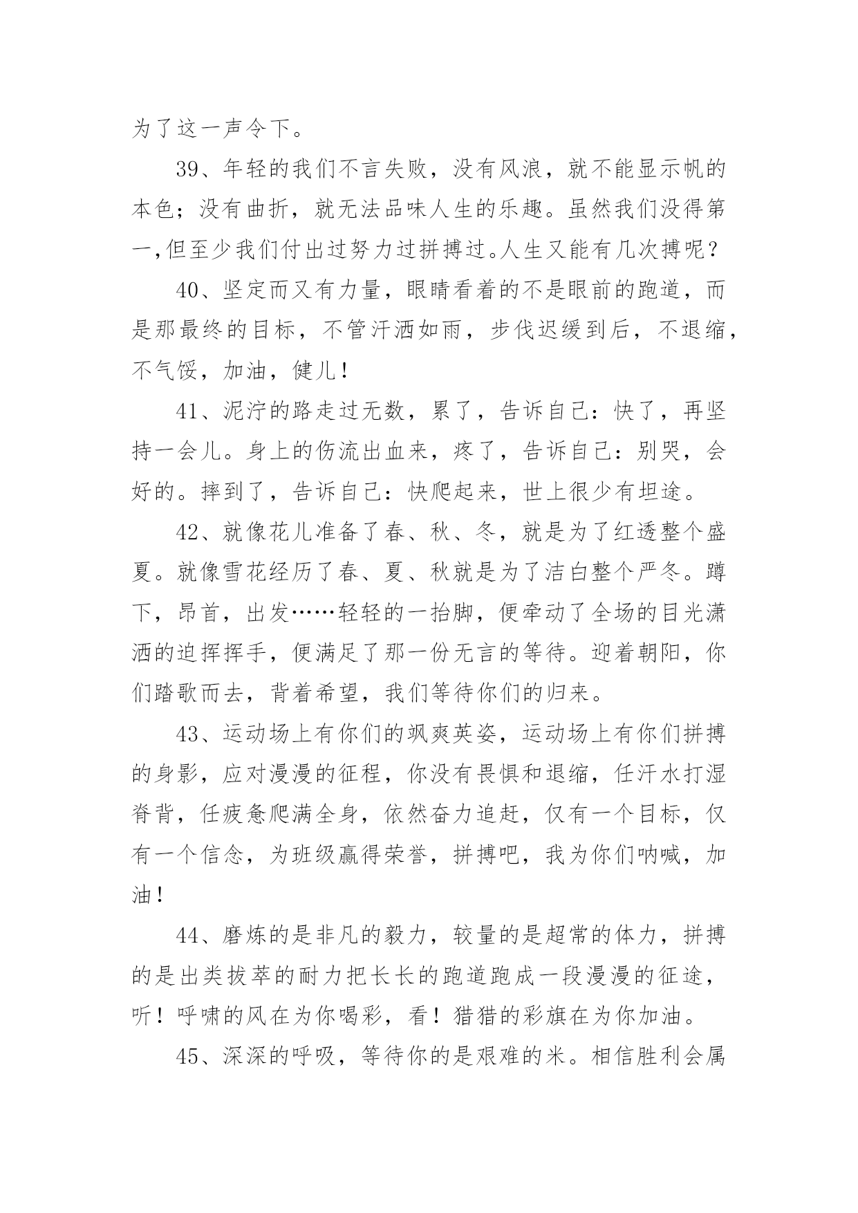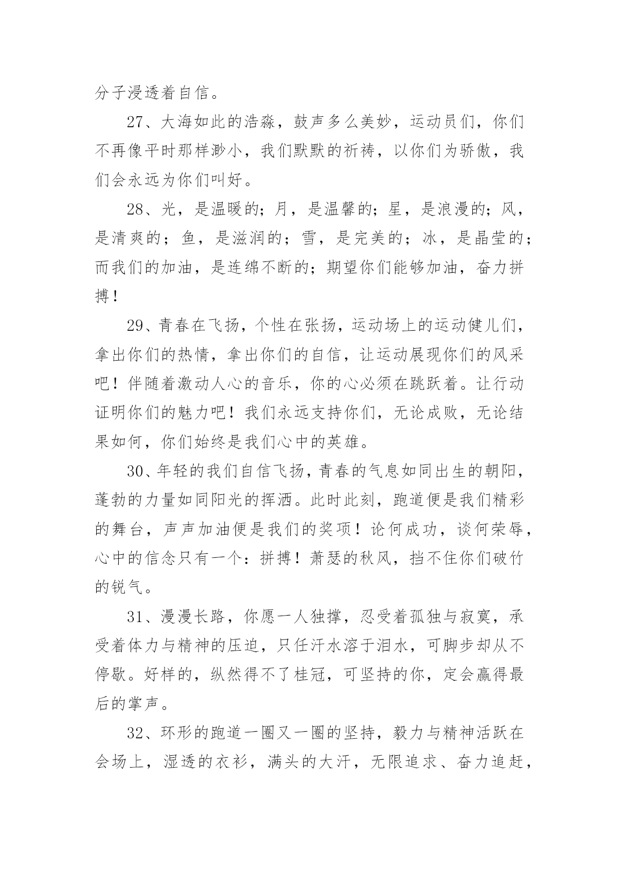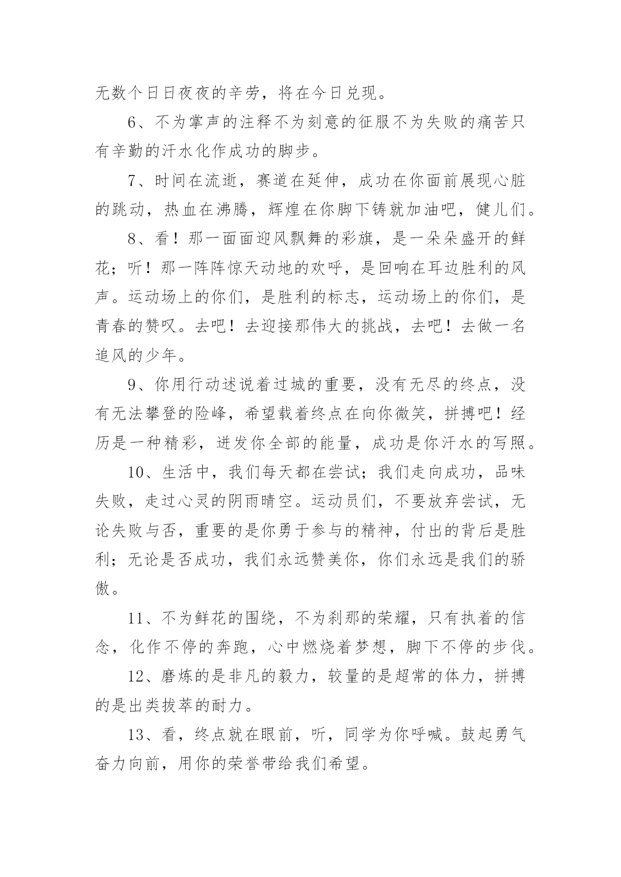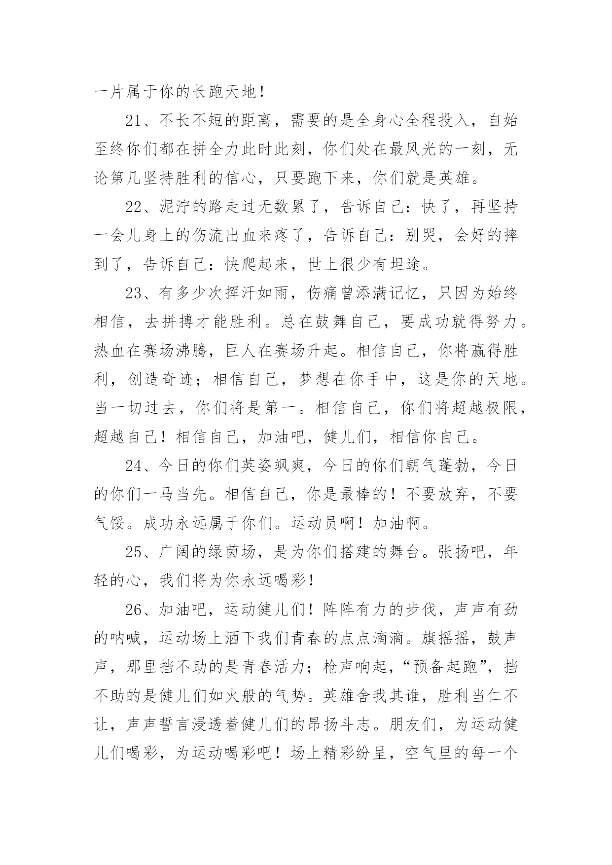 学校运动会加油稿学校运动会加油稿270句在现实社会中,很多地方都会使用到加油稿,借助加油稿可以表达对对方的鼓励和支持。那么你有了解过加油稿吗?以下是小编精心整理的学校运动会加油稿,希望对大家有所帮助。1、你的汗水洒在跑道,浇灌着成功的花朵开放;你的欢笑飞扬在赛场,为班争光数你最棒;跑吧,追吧,在这广阔的赛场上,你似骏马似离铉的箭;跑吧,追吧,你比虎猛比豹强。2、虽然你们在场上的时间很短暂,但你们的身影依然停留在人们的脑海里,因为你们是赛场上最可爱的人。3、时间在流逝,赛道在延伸,成功在你面前展现心脏的跳动,热血在沸腾,辉煌在你脚下铸就加油吧,健儿们!4、像一出舞台剧,有主角,配角,也有无名的幕后工作者,我们的运动会也在这样的配合中进行着,在赛场上展现英姿的是那些运动员,还有那些为比赛筹措,进行贡献的工作人员们。还有那些拉拉队员们。5、将这美永驻心底,即使深锁,也永不会退色,所有的这一切,都将在心灵的空中,如彩虹一般,留下美的而永恒的瞬间,此生无悔、人类的力量在那一刹那展现,拼搏在那一瞬间化为生命的起点,在那一须臾万物化为虚有,只知道,胜利并不遥远,抬起头望望前面,终点线已依稀可见,无数个日日夜夜的辛劳,将在今日兑现。6、不为掌声的注释不为刻意的征服不为失败的痛苦只有辛勤的汗水化作成功的脚步。7、时间在流逝,赛道在延伸,成功在你面前展现心脏的跳动,热血在沸腾,辉煌在你脚下铸就加油吧,健儿们。8、看!那一面面迎风飘舞的彩旗,是一朵朵盛开的鲜花;听!那一阵阵惊天动地的欢呼,是回响在耳边胜利的风声。运动场上的你们,是胜利的标志,运动场上的你们,是青春的赞叹。去吧!去迎接那伟大的挑战,去吧!去做一名追风的少年。9、你用行动述说着过城的重要,没有无尽的终点,没有无法攀登的险峰,希望载着终点在向你微笑,拼搏吧!经历是一种精彩,迸发你全部的能量,成功是你汗水的写照。10、生活中,我们每天都在尝试;我们走向成功,品味失败,走过心灵的阴雨晴空。运动员们,不要放弃尝试,无论失败与否,重要的是你勇于参与的精神,付出的背后是胜利;无论是否成功,我们永远赞美你,你们永远是我们的骄傲。11、不为鲜花的围绕,不为刹那的荣耀,只有执着的信念,化作不停的奔跑,心中燃烧着梦想,脚下不停的步伐。12、磨炼的是非凡的毅力,较量的是超常的体力,拼搏的是出类拔萃的耐力。13、看,终点就在眼前,听,同学为你呼喊。鼓起勇气奋力向前,用你的荣誉带给我们希望。14、面对艰苦的征程,你们毫不畏惧,接力棒在你们手中传递着集体的力量,听,我们在为你呐喊,你们诠释着奥运的精神,你们是我们心中的骄傲。相信胜利会属于你们,但在这征途上,需要你勇敢的心去面对。我们在为你加油,你是否听到了我们发自内心的呐喊,困难和胜利都在向你招手,去呀,不要犹豫,快去击败困难,快去夺取胜利!15、踏上跑道,是一种选择。离开起点,是一种勇气。驰骋赛场,是一种胜利。16、人生的路,有坦途,也有坎坷;做过的岁月,有欢笑,也有苦涩,泪水告诉我一个跌倒的故事,汗水使我多了一份沉重,几多成熟。17、一滴滴汗水,飘洒在绿茵场上,伴随着矫健的步伐,奏出希望的乐章。一种种信念,放在蔚蓝的天空,伴随着你那深沉的眼光,画出美丽的弧线。人生能有几回搏?千百双眼睛注视着你,为了希望、为了胜利,跑出青春的梦想。18、是种子就该有绿色的希望,是种子就该有金色的梦想,不要躺在封闭的暖房,怕什么秋日薄薄的风霜,既然已走上了运动场,心里就不要多想,跑道已洒满阳光,不要羞涩、不要紧张,听秋雁在空中为你歌唱,快去拾取片片金黄,充满信心,就有希望。19、洒一把艰辛的汗水,继续抬起疲倦的脚步,爆发的一吼气贯长虹,继续向前,不论成功与否,你已曾经拥有,曾记否,在终点欢呼,震惊四周。20、运动健将们,用你的实力,用你的精神,去开拓出,一片属于你的长跑天地!21、不长不短的距离,需要的是全身心全程投入,自始至终你们都在拼全力此时此刻,你们处在最风光的一刻,无论第几坚持胜利的信心,只要跑下来,你们就是英雄。22、泥泞的路走过无数累了,告诉自己:快了,再坚持一会儿身上的伤流出血来疼了,告诉自己:别哭,会好的摔到了,告诉自己:快爬起来,世上很少有坦途。23、有多少次挥汗如雨,伤痛曾添满记忆,只因为始终相信,去拼搏才能胜利。总在鼓舞自己,要成功就得努力。热血在赛场沸腾,巨人在赛场升起。相信自己,你将赢得胜利,创造奇迹;相信自己,梦想在你手中,这是你的天地。当一切过去,你们将是第一。相信自己,你们将超越极限,超越自己!相信自己,加油吧,健儿们,相信你自己。24、今日的你们英姿飒爽,今日的你们朝气蓬勃,今日的你们一马当先。相信自己,你是最棒的!不要放弃,不要气馁。成功永远属于你们。运动员啊!加油啊。25、广阔的绿茵场,是为你们搭建的舞台。张扬吧,年轻的心,我们将为你永