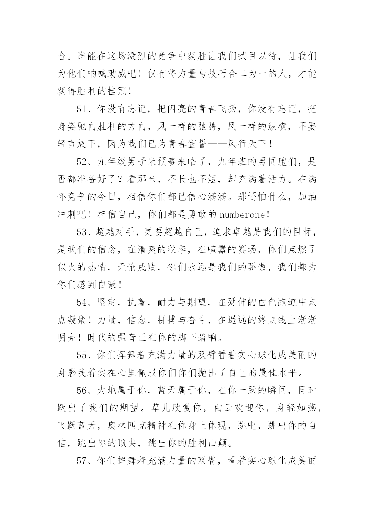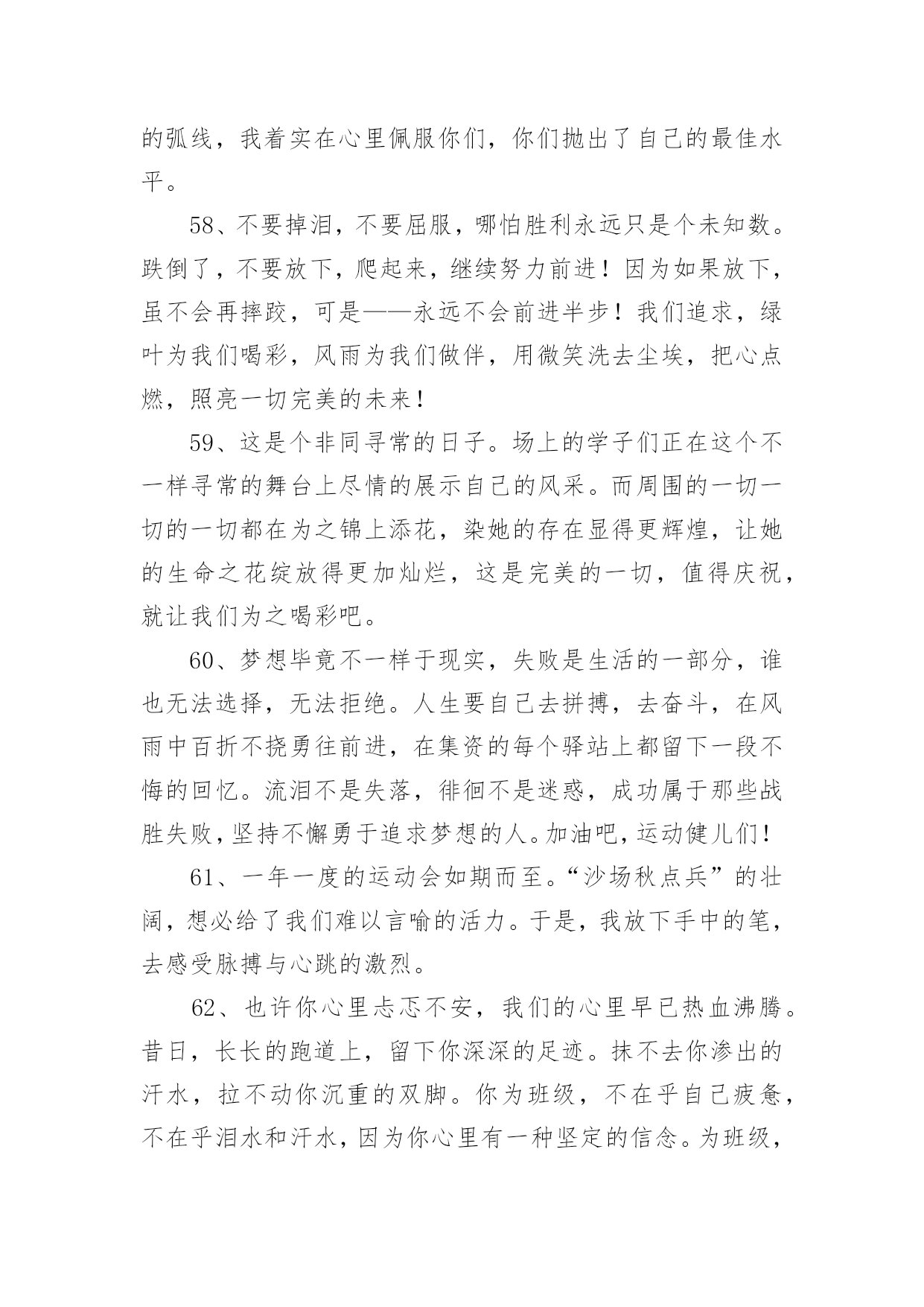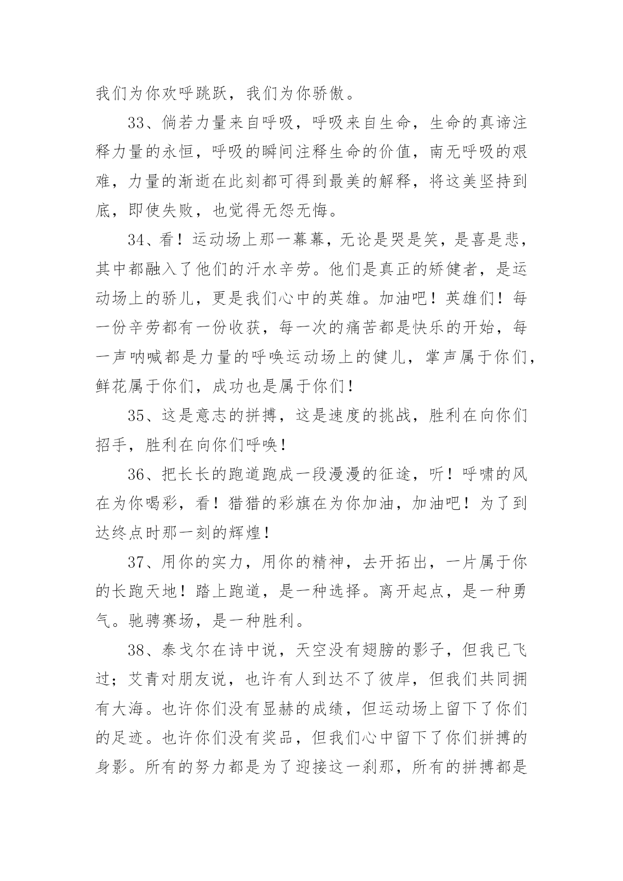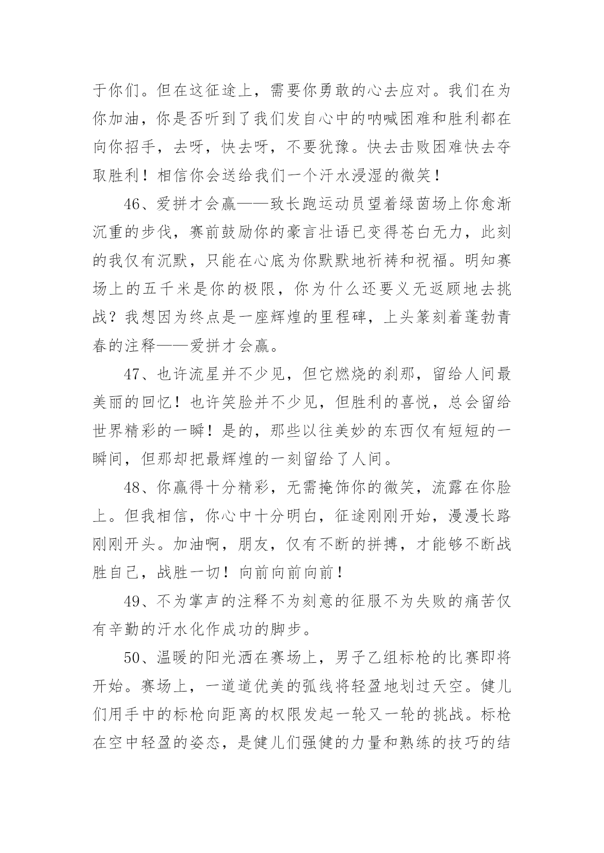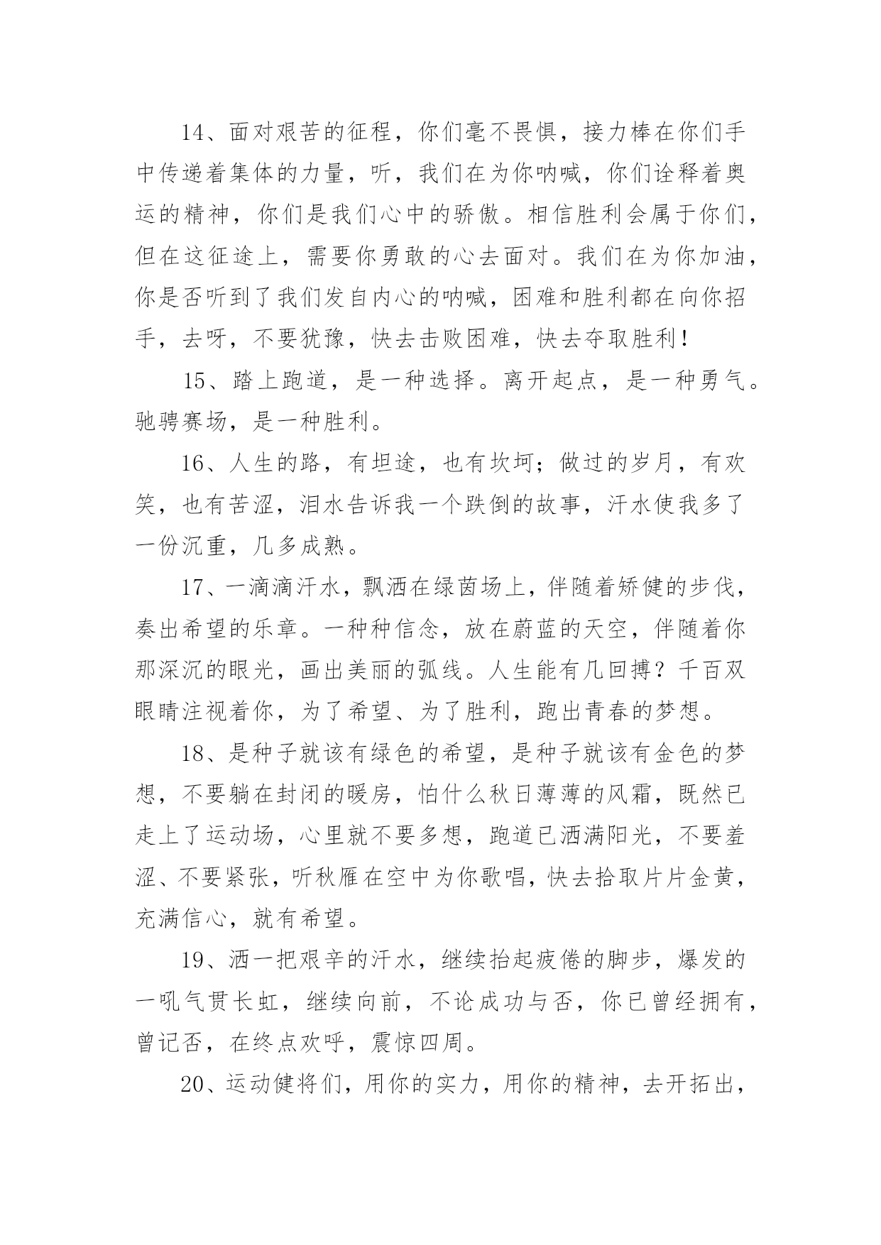 学校运动会加油稿学校运动会加油稿270句在现实社会中,很多地方都会使用到加油稿,借助加油稿可以表达对对方的鼓励和支持。那么你有了解过加油稿吗?以下是小编精心整理的学校运动会加油稿,希望对大家有所帮助。1、你的汗水洒在跑道,浇灌着成功的花朵开放;你的欢笑飞扬在赛场,为班争光数你最棒;跑吧,追吧,在这广阔的赛场上,你似骏马似离铉的箭;跑吧,追吧,你比虎猛比豹强。2、虽然你们在场上的时间很短暂,但你们的身影依然停留在人们的脑海里,因为你们是赛场上最可爱的人。3、时间在流逝,赛道在延伸,成功在你面前展现心脏的跳动,热血在沸腾,辉煌在你脚下铸就加油吧,健儿们!4、像一出舞台剧,有主角,配角,也有无名的幕后工作者,我们的运动会也在这样的配合中进行着,在赛场上展现英姿的是那些运动员,还有那些为比赛筹措,进行贡献的工作人员们。还有那些拉拉队员们。5、将这美永驻心底,即使深锁,也永不会退色,所有的这一切,都将在心灵的空中,如彩虹一般,留下美的而永恒的瞬间,此生无悔、人类的力量在那一刹那展现,拼搏在那一瞬间化为生命的起点,在那一须臾万物化为虚有,只知道,胜利并不遥远,抬起头望望前面,终点线已依稀可见,无数个日日夜夜的辛劳,将在今日兑现。6、不为掌声的注释不为刻意的征服不为失败的痛苦只有辛勤的汗水化作成功的脚步。7、时间在流逝,赛道在延伸,成功在你面前展现心脏的跳动,热血在沸腾,辉煌在你脚下铸就加油吧,健儿们。8、看!那一面面迎风飘舞的彩旗,是一朵朵盛开的鲜花;听!那一阵阵惊天动地的欢呼,是回响在耳边胜利的风声。运动场上的你们,是胜利的标志,运动场上的你们,是青春的赞叹。去吧!去迎接那伟大的挑战,去吧!去做一名追风的少年。9、你用行动述说着过城的重要,没有无尽的终点,没有无法攀登的险峰,希望载着终点在向你微笑,拼搏吧!经历是一种精彩,迸发你全部的能量,成功是你汗水的写照。10、生活中,我们每天都在尝试;我们走向成功,品味失败,走过心灵的阴雨晴空。运动员们,不要放弃尝试,无论失败与否,重要的是你勇于参与的精神,付出的背后是胜利;无论是否成功,我们永远赞美你,你们永远是我们的骄傲。11、不为鲜花的围绕,不为刹那的荣耀,只有执着的信念,化作不停的奔跑,心中燃烧着梦想,脚下不停的步伐。12、磨炼的是非凡的毅力,较量的是超常的体力,拼搏的是出类拔萃的耐力。13、看,终点就在眼前,听,同学为你呼喊。鼓起勇气奋力向前,用你的荣誉带给我们希望。14、面对艰苦的征程,你们毫不畏惧,接力棒在你们手中传递着集体的力量,听,我们在为你呐喊,你们诠释着奥运的精神,你们是我们心中的骄傲。相信胜利会属于你们,但在这征途上,需要你勇敢的心去面对。我们在为你加油,你是否听到了我们发自内心的呐喊,困难和胜利都在向你招手,去呀,不要犹豫,快去击败困难,快去夺取胜利!15、踏上跑道,是一种选择。离开起点,是一种勇气。驰骋赛场,是一种胜利。16、人生的路,有坦途,也有坎坷;做过的岁月,有欢笑,也有苦涩,泪水告诉我一个跌倒的故事,汗水使我多了一份沉重,几多成熟。17、一滴滴汗水,飘洒在绿茵场上,伴随着矫健的步伐,奏出希望的乐章。一种种信念,放在蔚蓝的天空,伴随着你那深沉的眼光,画出美丽的弧线。人生能有几回搏?千百双眼睛注视着你,为了希望、为了胜利,跑出青春的梦想。18、是种子就该有绿色的希望,是种子就该有金色的梦想,不要躺在封闭的暖房,怕什么秋日薄薄的风霜,既然已走上了运动场,心里就不要多想,跑道已洒满阳光,不要羞涩、不要紧张,听秋雁在空中为你歌唱,快去拾取片片金黄,充满信心,就有希望。19、洒一把艰辛的汗水,继续抬起疲倦的脚步,爆发的一吼气贯长虹,继续向前,不论成功与否,你已曾经拥有,曾记否,在终点欢呼,震惊四周。20、运动健将们,用你的实力,用你的精神,去开拓出,一片属于你的长跑天地!21、不长不短的距离,需要的是全身心全程投入,自始至终你们都在拼全力此时此刻,你们处在最风光的一刻,无论第几坚持胜利的信心,只要跑下来,你们就是英雄。22、泥泞的路走过无数累了,告诉自己:快了,再坚持一会儿身上的伤流出血来疼了,告诉自己:别哭,会好的摔到了,告诉自己:快爬起来,世上很少有坦途。23、有多少次挥汗如雨,伤痛曾添满记忆,只因为始终相信,去拼搏才能胜利。总在鼓舞自己,要成功就得努力。热血在赛场沸腾,巨人在赛场升起。相信自己,你将赢得胜利,创造奇迹;相信自己,梦想在你手中,这是你的天地。当一切过去,你们将是第一。相信自己,你们将超越极限,超越自己!相信自己,加油吧,健儿们,相信你自己。24、今日的你们英姿飒爽,今日的你们朝气蓬勃,今日的你们一马当先。相信自己,你是最棒的!不要放弃,不要气馁。成功永远属于你们。运动员啊!加油啊。25、广阔的绿茵场,是为你们搭建的舞台。张扬吧,年轻的心,我们将为你永