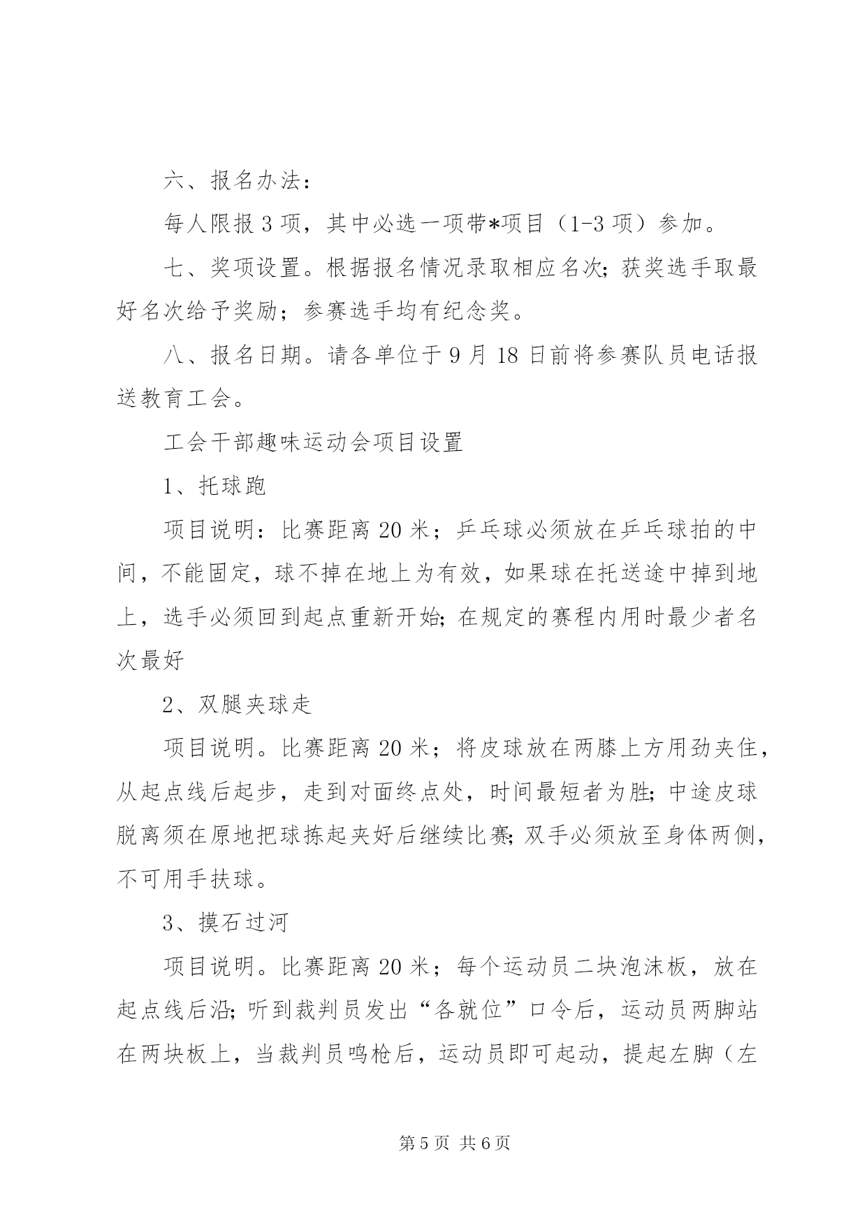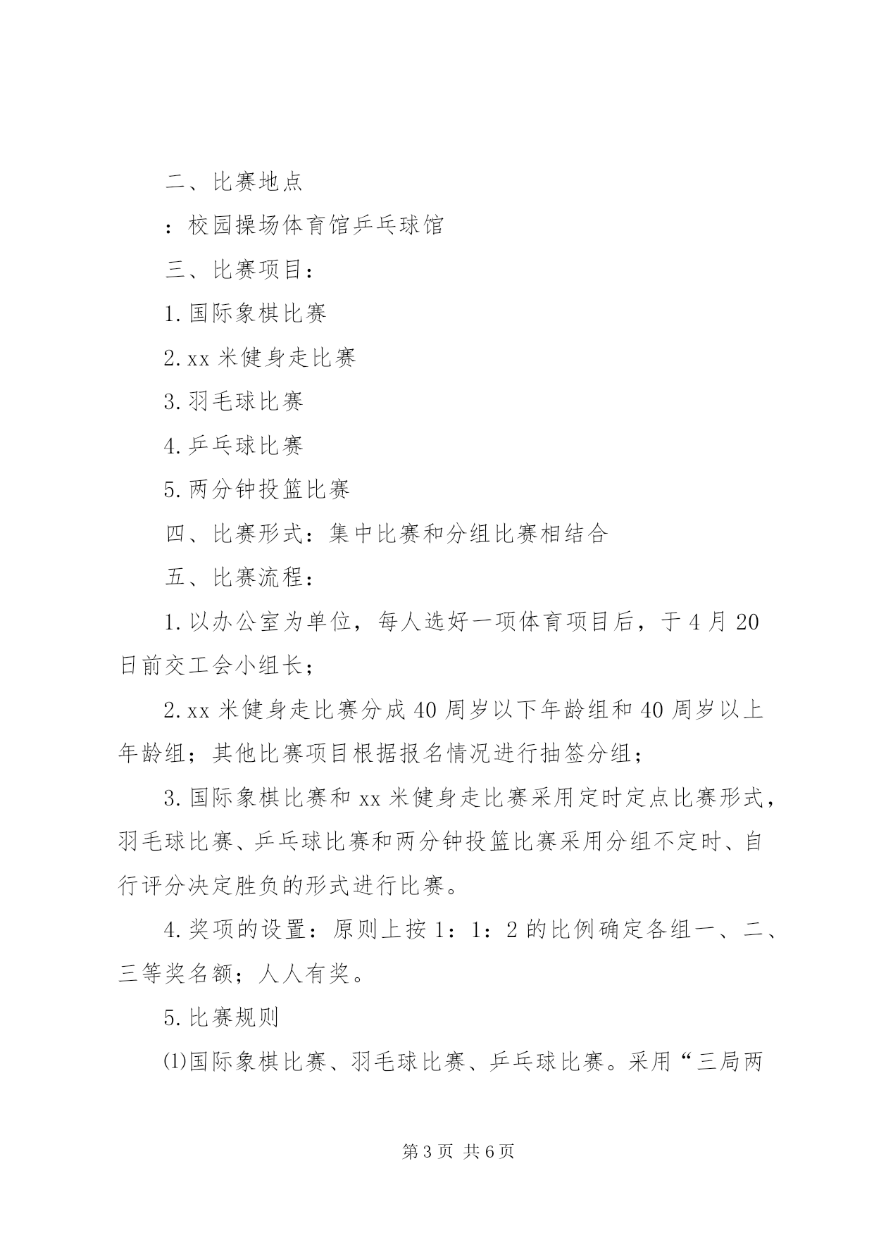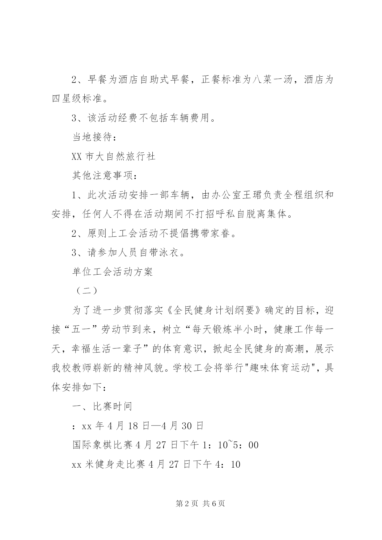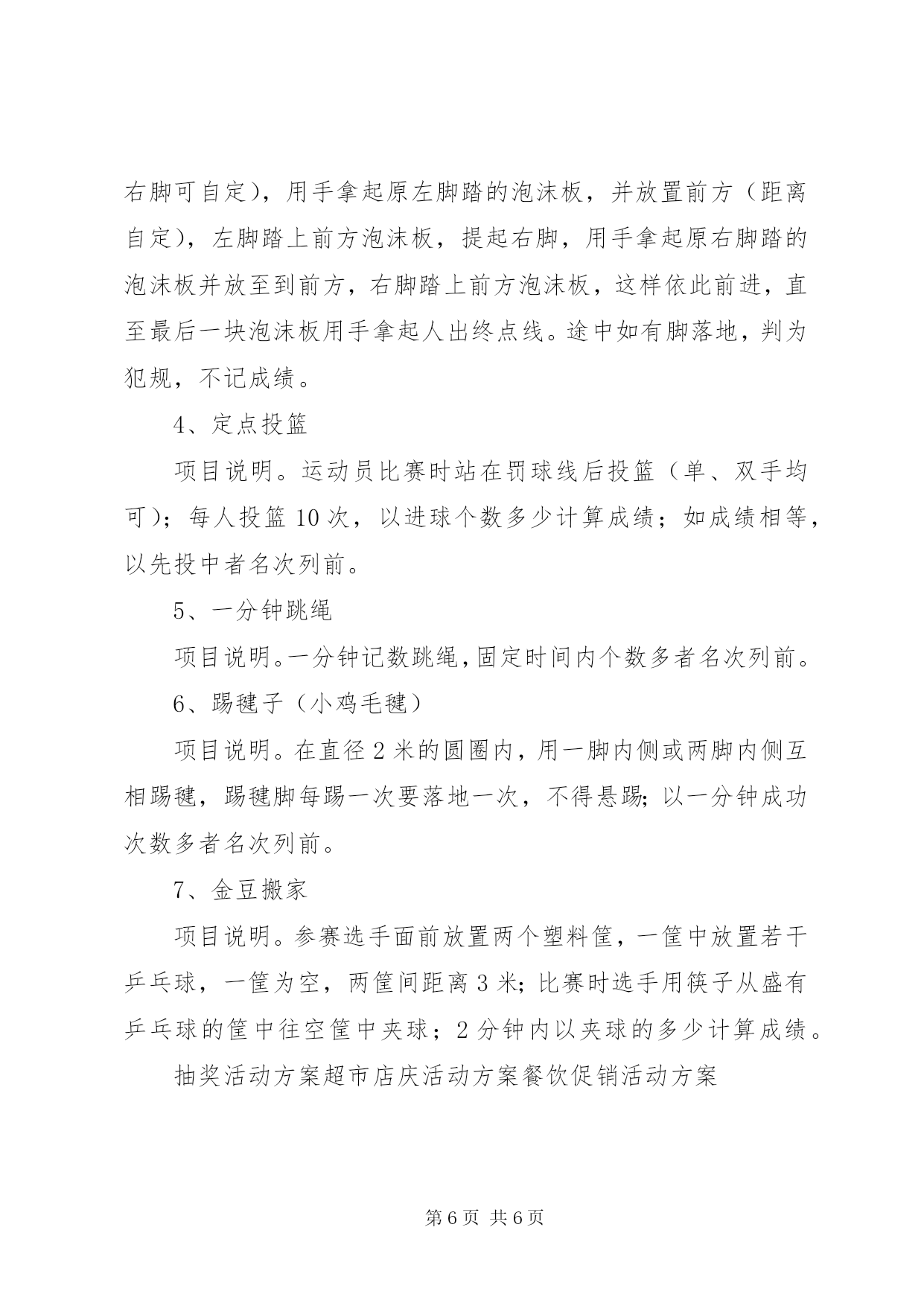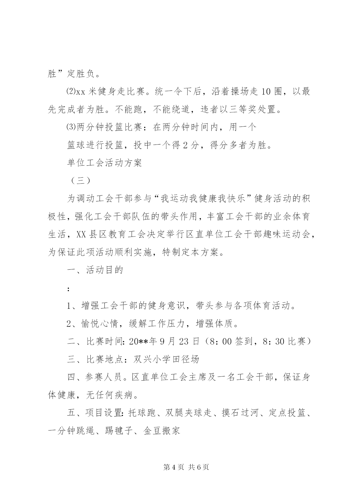 第PAGE\*Arabic\*MERGEFORMAT6页共NUMPAGES\*MERGEFORMAT6页单位工会活动方案(一)参与人员:单位员工(不含司机及安排值班人员)活动时间:**年7月31日至8月1日活动地点:XX市——万绿湖、野趣沟、镜花缘、漂流活动车辆:一台中巴车活动安排:1、7月31日早9。30点北京大厦集合出发,前往河源。2、12:00抵达河源后与当地旅行社接待联系,对方接团安排导游、午餐。3、午餐后游览华南地区最大的人工湖万绿湖,湖上游船观光后前往镜花缘风景区:溶洞探险、客家歌舞表演、游泳等。4、入住新世界大酒店,四星级标准双人间。安排晚餐。5、晚餐后前往万绿湖观赏亚洲第一彩色音乐喷泉。6、8月1日8:00开始早餐,9:00出发前往野趣沟自然风景区游玩,项目包括水上滑道,水中蹦极等,前往狐狸坳木径攀爬,银龙瀑布漂流。约5~6小时小时,午餐。7、午餐后返回深圳。文秘114版权所有活动费用:1、290元/人,含全体人员三正餐一早餐、酒店住宿一晚、万绿湖游船费用、景点首张门票及导游服务。2、早餐为酒店自助式早餐,正餐标准为八菜一汤,酒店为四星级标准。3、该活动经费不包括车辆费用。当地接待:XX市大自然旅行社其他注意事项:1、此次活动安排一部车辆,由办公室王珺负责全程组织和安排,任何人不得在活动期间不打招呼私自脱离集体。2、原则上工会活动不提倡携带家眷。3、请参加人员自带泳衣。单位工会活动方案(二)为了进一步贯彻落实《全民健身计划纲要》确定的目标,迎接“五一”劳动节到来,树立“每天锻炼半小时,健康工作每一天,幸福生活一辈子”的体育意识,掀起全民健身的高潮,展示我校教师崭新的精神风貌。学校工会将举行"趣味体育运动",具体安排如下:一、比赛时间:xx年4月18日—4月30日国际象棋比赛4月27日下午1:10~5:00xx米健身走比赛4月27日下午4:10二、比赛地点:校园操场体育馆乒乓球馆三、比赛项目:1.国际象棋比赛2.xx米健身走比赛3.羽毛球比赛4.乒乓球比赛5.两分钟投篮比赛四、比赛形式:集中比赛和分组比赛相结合五、比赛流程:1.以办公室为单位,每人选好一项体育项目后,于4月20日前交工会小组长;2.xx米健身走比赛分成40周岁以下年龄组和40周岁以上年龄组;其他比赛项目根据报名情况进行抽签分组;3.国际象棋比赛和xx米健身走比赛采用定时定点比赛形式,羽毛球比赛、乒乓球比赛和两分钟投篮比赛采用分组不定时、自行评分决定胜负的形式进行比赛。4.奖项的设置:原则上按1:1:2的比例确定各组一、二、三等奖名额;人人有奖。5.比赛规则⑴国际象棋比赛、羽毛球比赛、乒乓球比赛。采用“三局两胜”定胜负。⑵xx米健身走比赛。统一令下后,沿着操场走10圈,以最先完成者为胜。不能跑,不能绕道,违者以三等奖处置。⑶两分钟投篮比赛:在两分钟时间内,用一个篮球进行投篮,投中一个得2分,得分多者为胜。单位工会活动方案(三)为调动工会干部参与“我运动我健康我快乐”健身活动的积极性,强化工会干部队伍的带头作用,丰富工会干部的业余体育生活,XX县区教育工会决定举行区直单位工会干部趣味运动会,为保证此项活动顺利实施,特制定本方案。一、活动目的:1、增强工会干部的健身意识,带头参与各项体育活动。2、愉悦心情,缓解工作压力,增强体质。二、比赛时间:20**年9月23日(8:00签到,8:30比赛)三、比赛地点:双兴小学田径场四、参赛人员。区直单位工会主席及一名工会干部,保证身体健康,无任何疾病。五、项目设置:托球跑、双腿夹球走、摸石过河、定点投篮、一分钟跳绳、踢毽子、金豆搬家六、报名办法:每人限报3项,其中必选一项带*项目(1-3项)参加。七、奖项设置。根据报名情况录取相应名次;获奖选手取最好名次给予奖励;参赛选手均有纪念奖。八、报名日期。请各单位于9月18日前将参赛队员电话报送教育工会。工会干部趣味运动会项目设置1、托球跑项目说明:比赛距离20米;乒乓球必须放在乒乓球拍的中间,不能固定,球不掉在地上为有效,如果球在托送途中掉到地上,选手必须回到起点重新开始;在规定的赛程内用时最少者名次最好2、双腿夹球走项目说明。比赛距离20米;将皮球放在两膝上方用劲夹住,从起点线后起步,走到对面终点处,时间最短者为胜;中途皮球脱离须在原地把球拣起夹好后继续比赛;双手必须放至身体两侧,不可用手扶球。3、摸石过河项目说明。比赛距离20米;每个运动员二块泡沫板,放在起点线后沿;听到裁判员发出“各就位”口令后,运动员两脚站在两块板上,当裁判员鸣枪后,运动员即可起动,提起左脚(左右脚可自定),用手拿起原左脚踏的泡沫板,并放置前方(距离自定),左脚踏上前方泡沫板,提起右脚,用手拿起原右脚踏的泡沫板并放至到前方,右脚踏上前方泡沫板,这样依此前进,直至最后一块