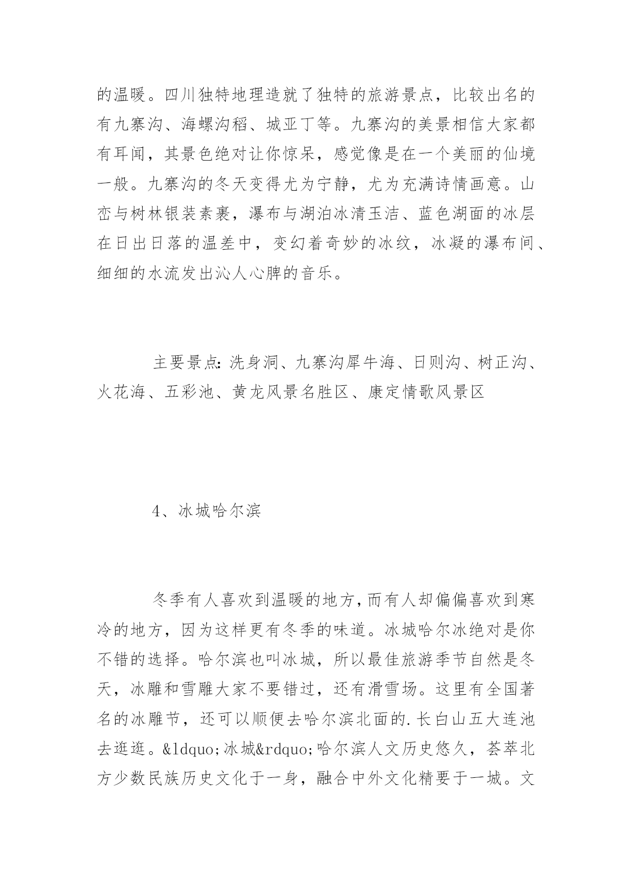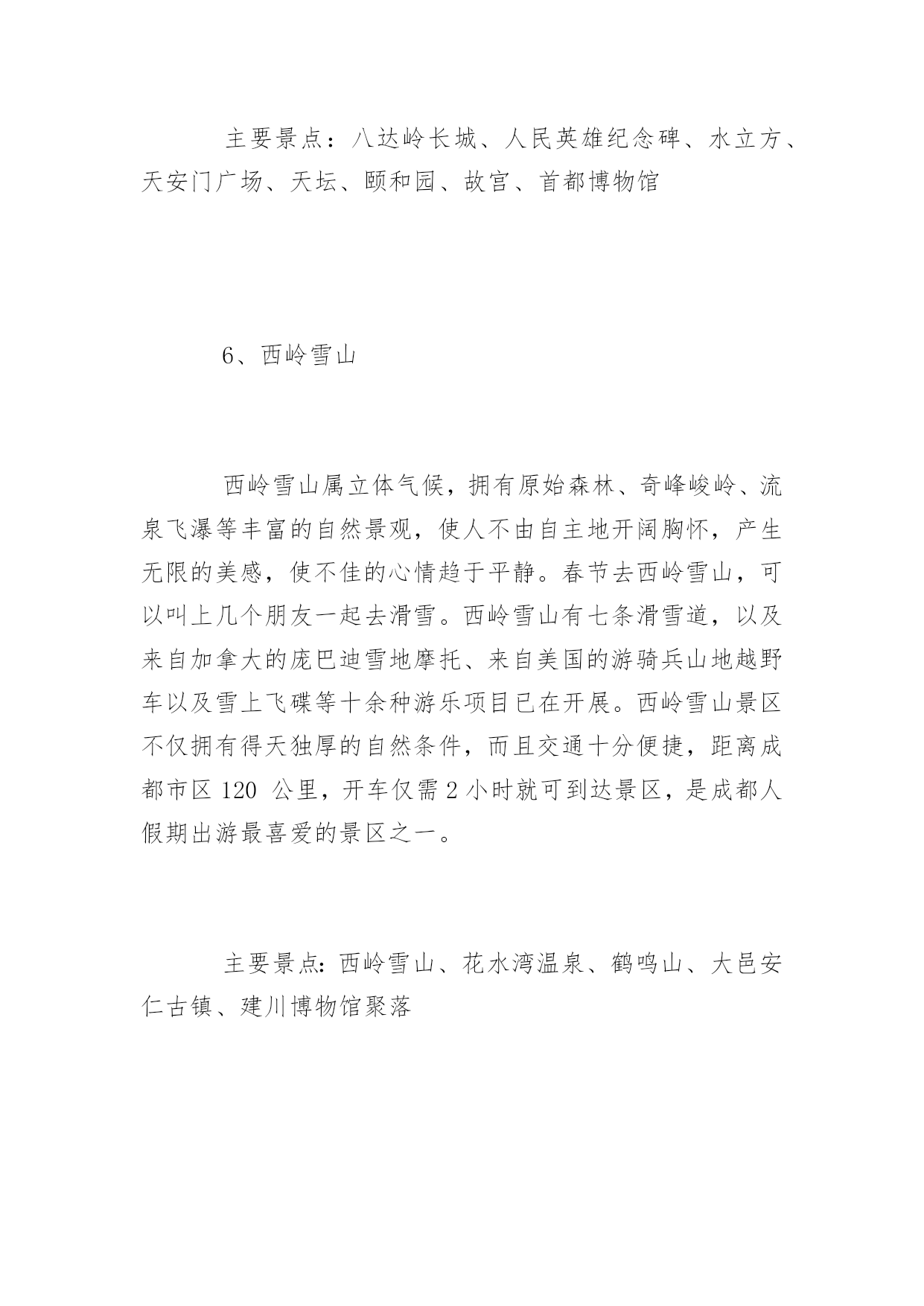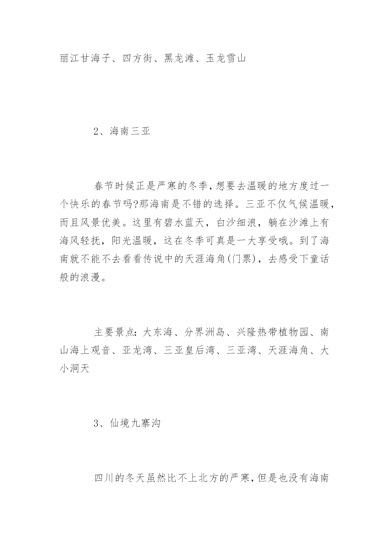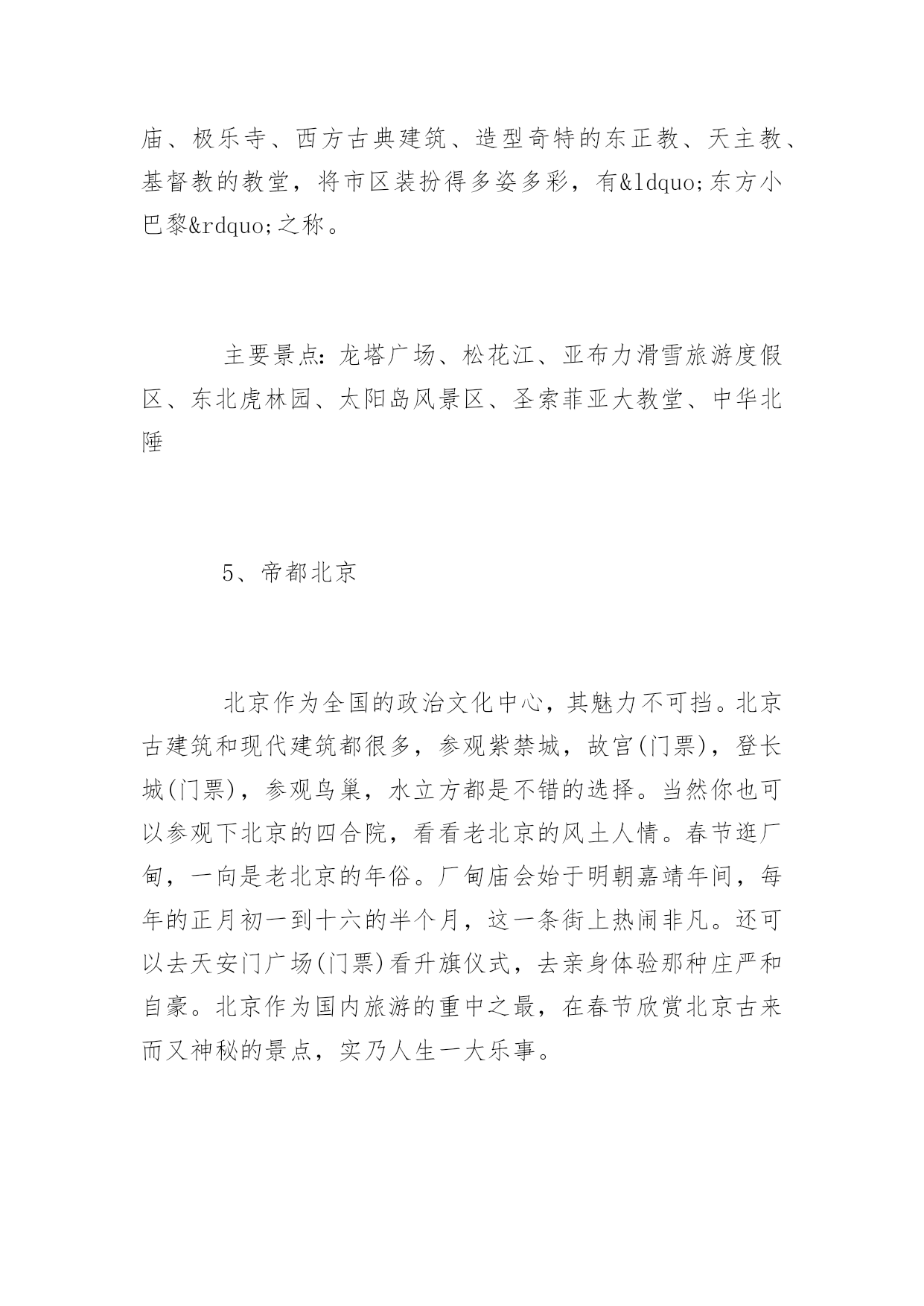 春节旅游地方春节旅游地方推荐春节假期又快到了,国内有许多好玩的地方,以下是为大家分享一些春节旅游地方推荐,供大家参考借鉴,喜欢就收藏起来吧!1、魅力云南云南也是春节国内旅游好去处之一,云南是一个冬季温暖如春的地方,到这里旅游不仅可以躲避寒冷,而且可以享受这如画的风景。云南的昆明是云南的省会,四季温暖如春。昆明里有滇池(门票),其水面雄伟,很有气魄。在滇池旁和爱人漫步,享受鸟语花香,也别有另一番情趣。丽江古镇,艳遇之都,体验古镇的悠闲生活。此外云南的玉龙雪山(门票)也值得一去,玉龙雪山大气磅礴,山上终年积雪,像一条玉龙横卧。喜欢这种景色的朋友更不要错过哦。主要景点:丽江古城(大研古镇)、束河古镇、属都湖、丽江甘海子、四方街、黑龙滩、玉龙雪山2、海南三亚春节时候正是严寒的冬季,想要去温暖的地方度过一个快乐的春节吗?那海南是不错的选择。三亚不仅气候温暖,而且风景优美。这里有碧水蓝天,白沙细浪,躺在沙滩上有海风轻抚,阳光温暖,这在冬季可真是一大享受哦。到了海南就不能不去看看传说中的天涯海角(门票),去感受下童话般的浪漫。主要景点:大东海、分界洲岛、兴隆热带植物园、南山海上观音、亚龙湾、三亚皇后湾、三亚湾、天涯海角、大小洞天3、仙境九寨沟四川的冬天虽然比不上北方的严寒,但是也没有海南的温暖。四川独特地理造就了独特的旅游景点,比较出名的有九寨沟、海螺沟稻、城亚丁等。九寨沟的美景相信大家都有耳闻,其景色绝对让你惊呆,感觉像是在一个美丽的仙境一般。九寨沟的冬天变得尤为宁静,尤为充满诗情画意。山峦与树林银装素裹,瀑布与湖泊冰清玉洁、蓝色湖面的冰层在日出日落的温差中,变幻着奇妙的冰纹,冰凝的瀑布间、细细的水流发出沁人心脾的音乐。主要景点:洗身洞、九寨沟犀牛海、日则沟、树正沟、火花海、五彩池、黄龙风景名胜区、康定情歌风景区4、冰城哈尔滨冬季有人喜欢到温暖的地方,而有人却偏偏喜欢到寒冷的地方,因为这样更有冬季的味道。冰城哈尔冰绝对是你不错的选择。哈尔滨也叫冰城,所以最佳旅游季节自然是冬天,冰雕和雪雕大家不要错过,还有滑雪场。这里有全国著名的冰雕节,还可以顺便去哈尔滨北面的.长白山五大连池去逛逛。“冰城”哈尔滨人文历史悠久,荟萃北方少数民族历史文化于一身,融合中外文化精要于一城。文庙、极乐寺、西方古典建筑、造型奇特的东正教、天主教、基督教的教堂,将市区装扮得多姿多彩,有“东方小巴黎”之称。主要景点:龙塔广场、松花江、亚布力滑雪旅游度假区、东北虎林园、太阳岛风景区、圣索菲亚大教堂、中华北陲5、帝都北京北京作为全国的政治文化中心,其魅力不可挡。北京古建筑和现代建筑都很多,参观紫禁城,故宫(门票),登长城(门票),参观鸟巢,水立方都是不错的选择。当然你也可以参观下北京的四合院,看看老北京的风土人情。春节逛厂甸,一向是老北京的年俗。厂甸庙会始于明朝嘉靖年间,每年的正月初一到十六的半个月,这一条街上热闹非凡。还可以去天安门广场(门票)看升旗仪式,去亲身体验那种庄严和自豪。北京作为国内旅游的重中之最,在春节欣赏北京古来而又神秘的景点,实乃人生一大乐事。主要景点:八达岭长城、人民英雄纪念碑、水立方、天安门广场、天坛、颐和园、故宫、首都博物馆6、西岭雪山西岭雪山属立体气候,拥有原始森林、奇峰峻岭、流泉飞瀑等丰富的自然景观,使人不由自主地开阔胸怀,产生无限的美感,使不佳的心情趋于平静。春节去西岭雪山,可以叫上几个朋友一起去滑雪。西岭雪山有七条滑雪道,以及来自加拿大的庞巴迪雪地摩托、来自美国的游骑兵山地越野车以及雪上飞碟等十余种游乐项目已在开展。西岭雪山景区不仅拥有得天独厚的自然条件,而且交通十分便捷,距离成都市区120公里,开车仅需2小时就可到达景区,是成都人假期出游最喜爱的景区之一。主要景点:西岭雪山、花水湾温泉、鹤鸣山、大邑安仁古镇、建川博物馆聚落