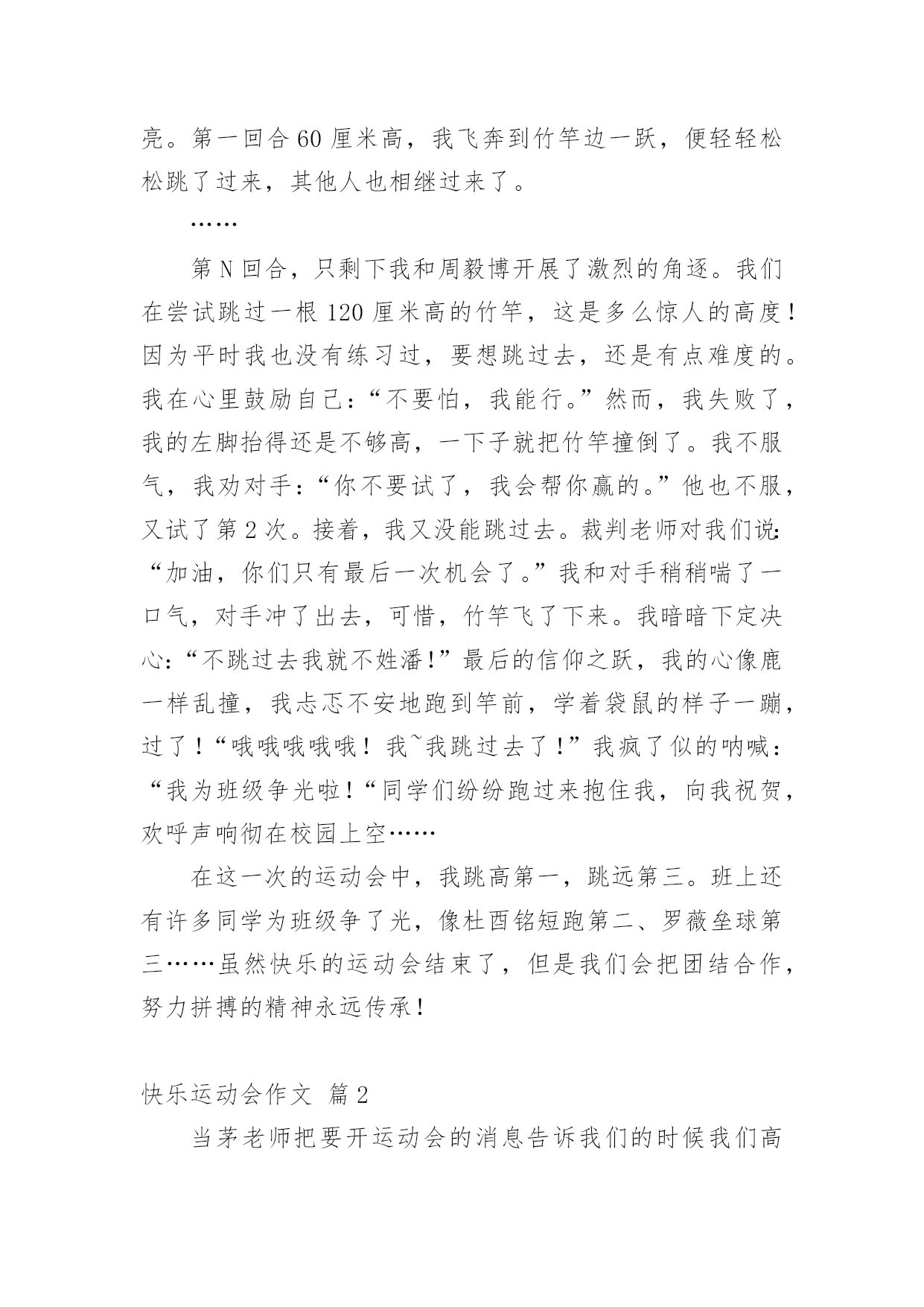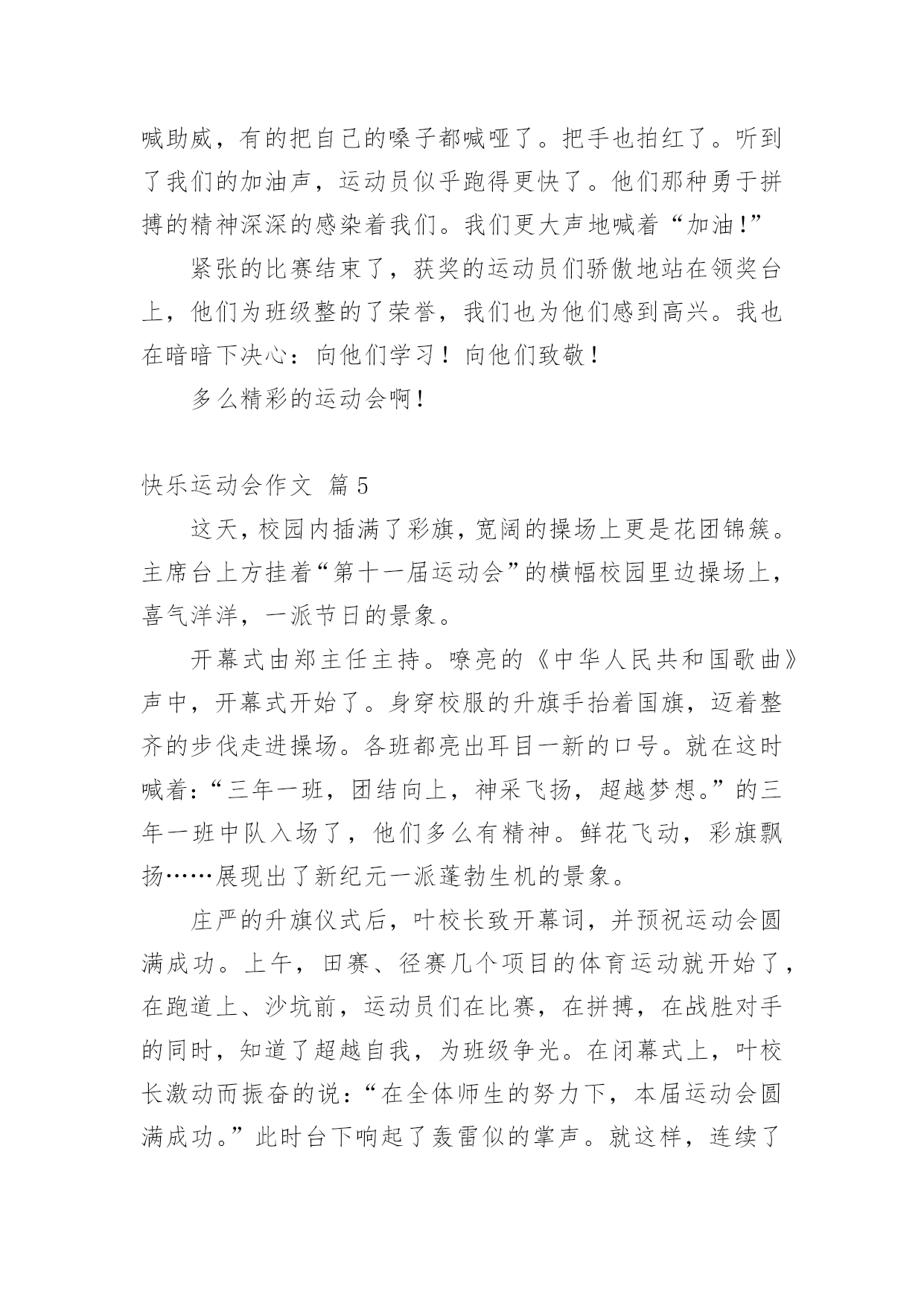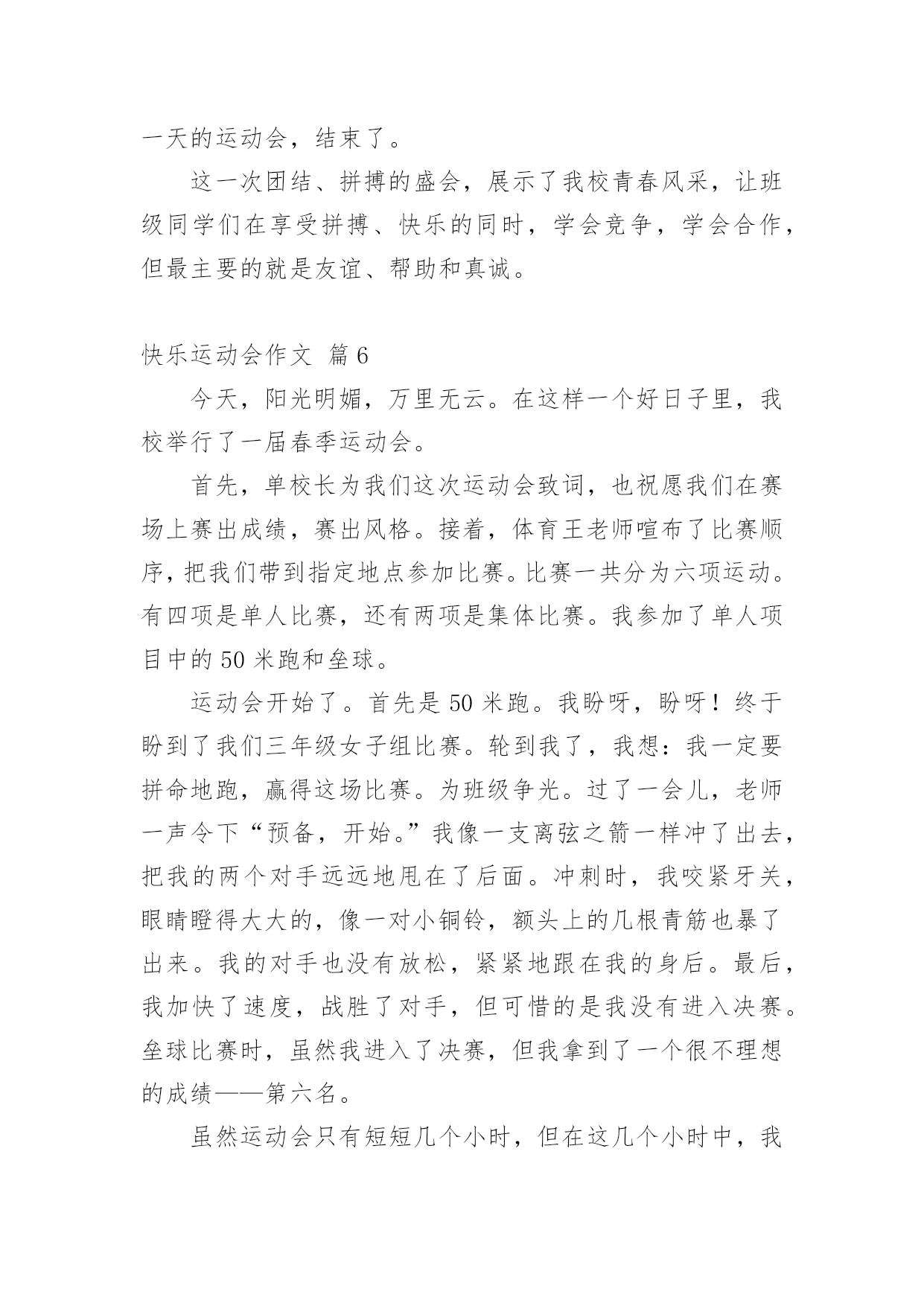 快乐运动会作文【精品】快乐运动会作文7篇在学习、工作、生活中,大家都写过作文吧,作文是一种言语活动,具有高度的综合性和创造性。那么一般作文是怎么写的呢?以下是小编为大家整理的快乐运动会作文7篇,欢迎大家分享。快乐运动会作文篇15月5日,我们南郊小学如期举行了一年一度的田径运动会。本次是第39届运动会,同学们一听到这个好消息,各班踊跃报名。比赛项目有跳高、跳远、垒球、60米、300米……我平时就爱好体育,又是学校足球队员,这次运动会当然少不了我。老师和同学都对我抱有很大的希望,我对自己也充满信心。运动会开始了,操场上热闹极了。有的同学正在跳远,只见他大步流星,用百米跑的速度冲到黄线前,奋力一跳,跳出一米多远;有的同学正在参加男子60米短跑,只听发令枪一响,运动员就像离弦的箭似的飞奔出去。瞧,运动员们你追我赶,谁也不甘落后;还有的同学参加了男子300米长跑,四1班的运动员稳如泰山,不快不慢地跟在其他人后面,在最后半圈的时候,他就瞬间爆发,冲在最前面,拿到了冠军……我是参加跳高的,我的对手有:陶正义、周毅博、尤张亮。第一回合60厘米高,我飞奔到竹竿边一跃,便轻轻松松跳了过来,其他人也相继过来了。……第N回合,只剩下我和周毅博开展了激烈的角逐。我们在尝试跳过一根120厘米高的竹竿,这是多么惊人的高度!因为平时我也没有练习过,要想跳过去,还是有点难度的。我在心里鼓励自己:“不要怕,我能行。”然而,我失败了,我的左脚抬得还是不够高,一下子就把竹竿撞倒了。我不服气,我劝对手:“你不要试了,我会帮你赢的。”他也不服,又试了第2次。接着,我又没能跳过去。裁判老师对我们说:“加油,你们只有最后一次机会了。”我和对手稍稍喘了一口气,对手冲了出去,可惜,竹竿飞了下来。我暗暗下定决心:“不跳过去我就不姓潘!”最后的信仰之跃,我的心像鹿一样乱撞,我忐忑不安地跑到竿前,学着袋鼠的样子一蹦,过了!“哦哦哦哦哦!我~我跳过去了!”我疯了似的呐喊:“我为班级争光啦!“同学们纷纷跑过来抱住我,向我祝贺,欢呼声响彻在校园上空……在这一次的运动会中,我跳高第一,跳远第三。班上还有许多同学为班级争了光,像杜酉铭短跑第二、罗薇垒球第三……虽然快乐的运动会结束了,但是我们会把团结合作,努力拼搏的精神永远传承!快乐运动会作文篇2当茅老师把要开运动会的消息告诉我们的时候我们高兴得不得了,运动员们都在为运动会做准备。一、跳高——运动场上展身姿跳高运动员们个个精神抖擞,腾空跃起,像展翅飞翔的海燕,又像凌空直上的雄鹰。“加油!加油!”一阵热烈的.欢呼声冲破了这紧张的气氛,震荡着运动场。当快要接近高架时,他的左腿突然在地上猛地一蹬,两手在身旁划了道长长的半弧线,高腾起,迅速转体……“好!又过去了!”观众的喝彩声像潮水一般涌起。在喝彩声中横杆又上升了新的高度,伴随着这喝彩声,运动健儿又向新的目标攀登。二、掷实心球——为班级夺冠实心球运动员中其中有我。到了比赛场地老师给我们几个讲了规则:你们一共4个人分两轮进行比赛一轮淘汰一个人,每轮可以投3个球。好了,下面601班的蔡妮娜,“呯”落地了“呯”“呯”好下一个602班王婉琦“啊?到我了?”“呯”“呯”“呯”第一轮比赛结束,602班朱慧玲你被淘汰了!“呯”“呯”“呯”又是几球落地,第二轮结束了!602班李孟瑶你淘汰出局了!“呜!呜!呜!又要测量米数了,好担心哦!我会不会第一呢?”602班王婉琦你以7。54米的成绩荣获第一名。“哇!我得了第一!哦耶太好了!”那时心里有说不出的喜悦我为我们班争光了!我兴高采烈地走到了领取奖状和奖品的地方,拿了奖状和奖品。一张纸对我有着非凡的意义——那是我在小学最后一次参加运动会最后一次拿着属于小学颁发的奖状。快乐运动会作文篇3今天是大家期待已久的运动会,有好多人的爸爸妈妈都来了还有我爸爸也有来喔!让我觉得好高兴。运动会准备要开始了我们先把椅子搬到我们的休息区,等了一会儿王主任说要排队进场,所以各班都排好队准备进场。校长说完话后,首先是四到六年级的健康操,每个人都抬头挺胸的,很有精神的跳着健康操我们健康操结束后,接着是一年级的五十米赛跑,一年级真是可爱,有的不是鞋子掉了,不然就是慢别一拍,真是好笑,一会儿,终于轮到我弟弟五十米赛跑了,虽然他已经很努力了,但是他还是跑了最后一名,我想他一定很难过吧!不过弟弟还是有运动家的精神,不到最后,永不放弃。一年及二年级…。。终于轮到我们六年级的一百米赛跑,第一组跑完,换第二组,我已经努力跑得非常努力了,但是还是拿了……第五名,真难过。后来我们六年级跑完一百米后,我便拿着庭彣妈妈送的饮料来解解渴,真好喝。在我们休息的这段时间,五年级在草皮上做趣味竞赛,还有四年级的障碍接力,还真是精采啊!不过最精采的还是压轴的拔河比和赛碍接力。终于轮到了六年级的项目:“拔河”。我们六年级跟五年级