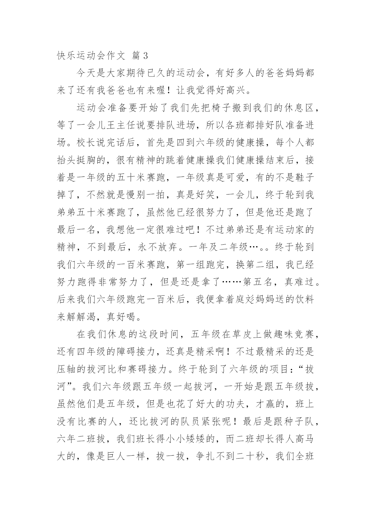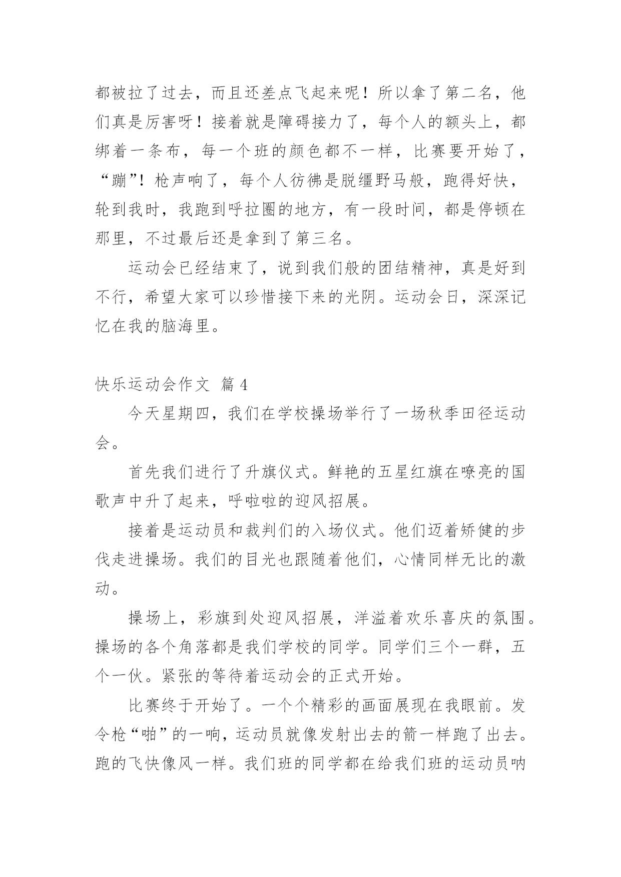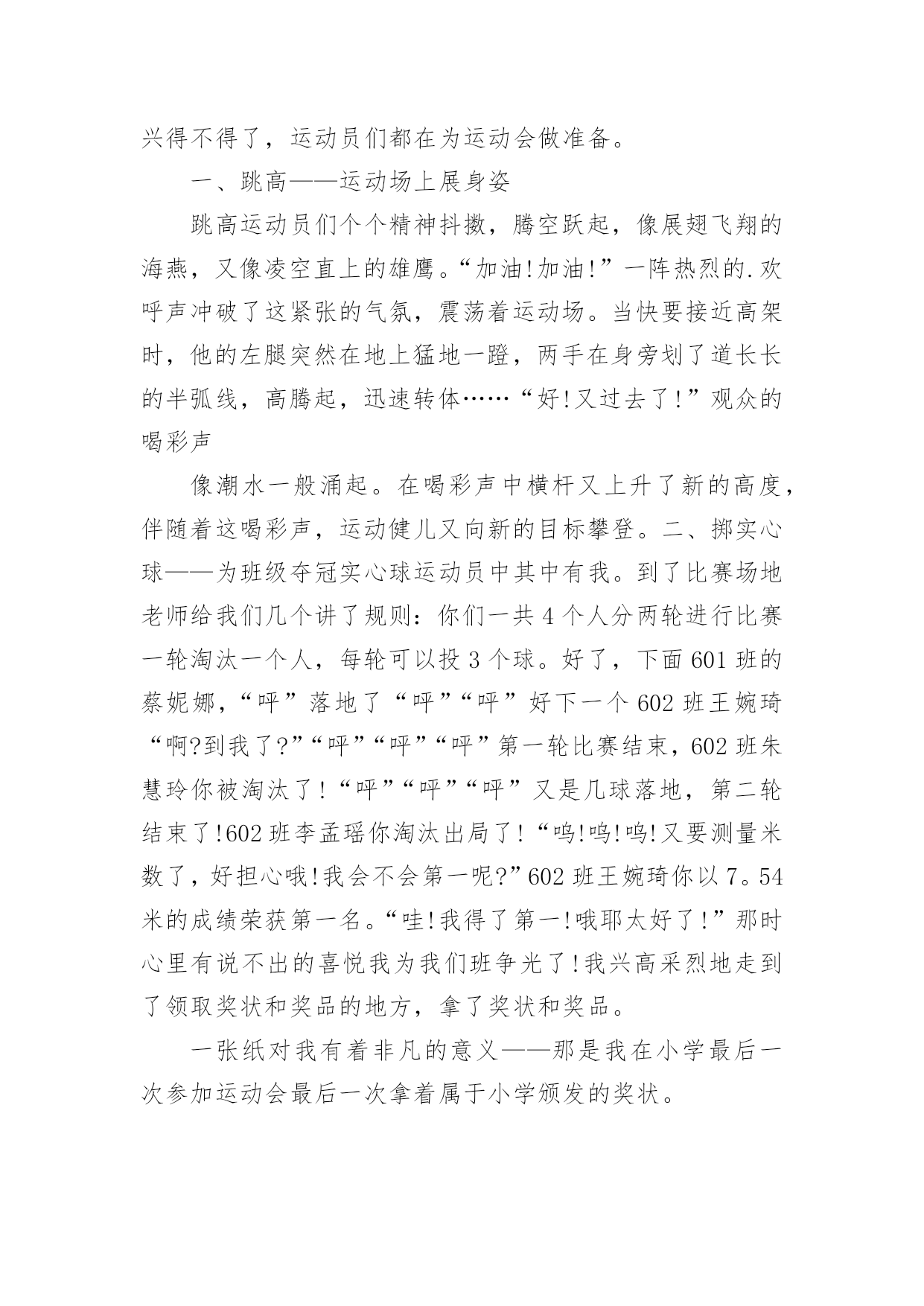 快乐运动会作文【精品】快乐运动会作文7篇在学习、工作、生活中,大家都写过作文吧,作文是一种言语活动,具有高度的综合性和创造性。那么一般作文是怎么写的呢?以下是小编为大家整理的快乐运动会作文7篇,欢迎大家分享。快乐运动会作文篇15月5日,我们南郊小学如期举行了一年一度的田径运动会。本次是第39届运动会,同学们一听到这个好消息,各班踊跃报名。比赛项目有跳高、跳远、垒球、60米、300米……我平时就爱好体育,又是学校足球队员,这次运动会当然少不了我。老师和同学都对我抱有很大的希望,我对自己也充满信心。运动会开始了,操场上热闹极了。有的同学正在跳远,只见他大步流星,用百米跑的速度冲到黄线前,奋力一跳,跳出一米多远;有的同学正在参加男子60米短跑,只听发令枪一响,运动员就像离弦的箭似的飞奔出去。瞧,运动员们你追我赶,谁也不甘落后;还有的同学参加了男子300米长跑,四1班的运动员稳如泰山,不快不慢地跟在其他人后面,在最后半圈的时候,他就瞬间爆发,冲在最前面,拿到了冠军……我是参加跳高的,我的对手有:陶正义、周毅博、尤张亮。第一回合60厘米高,我飞奔到竹竿边一跃,便轻轻松松跳了过来,其他人也相继过来了。……第N回合,只剩下我和周毅博开展了激烈的角逐。我们在尝试跳过一根120厘米高的竹竿,这是多么惊人的高度!因为平时我也没有练习过,要想跳过去,还是有点难度的。我在心里鼓励自己:“不要怕,我能行。”然而,我失败了,我的左脚抬得还是不够高,一下子就把竹竿撞倒了。我不服气,我劝对手:“你不要试了,我会帮你赢的。”他也不服,又试了第2次。接着,我又没能跳过去。裁判老师对我们说:“加油,你们只有最后一次机会了。”我和对手稍稍喘了一口气,对手冲了出去,可惜,竹竿飞了下来。我暗暗下定决心:“不跳过去我就不姓潘!”最后的信仰之跃,我的心像鹿一样乱撞,我忐忑不安地跑到竿前,学着袋鼠的样子一蹦,过了!“哦哦哦哦哦!我~我跳过去了!”我疯了似的呐喊:“我为班级争光啦!“同学们纷纷跑过来抱住我,向我祝贺,欢呼声响彻在校园上空……在这一次的运动会中,我跳高第一,跳远第三。班上还有许多同学为班级争了光,像杜酉铭短跑第二、罗薇垒球第三……虽然快乐的运动会结束了,但是我们会把团结合作,努力拼搏的精神永远传承!快乐运动会作文篇2当茅老师把要开运动会的消息告诉我们的时候我们高兴得不得了,运动员们都在为运动会做准备。一、跳高——运动场上展身姿跳高运动员们个个精神抖擞,腾空跃起,像展翅飞翔的海燕,又像凌空直上的雄鹰。“加油!加油!”一阵热烈的.欢呼声冲破了这紧张的气氛,震荡着运动场。当快要接近高架时,他的左腿突然在地上猛地一蹬,两手在身旁划了道长长的半弧线,高腾起,迅速转体……“好!又过去了!”观众的喝彩声像潮水一般涌起。在喝彩声中横杆又上升了新的高度,伴随着这喝彩声,运动健儿又向新的目标攀登。二、掷实心球——为班级夺冠实心球运动员中其中有我。到了比赛场地老师给我们几个讲了规则:你们一共4个人分两轮进行比赛一轮淘汰一个人,每轮可以投3个球。好了,下面601班的蔡妮娜,“呯”落地了“呯”“呯”好下一个602班王婉琦“啊?到我了?”“呯”“呯”“呯”第一轮比赛结束,602班朱慧玲你被淘汰了!“呯”“呯”“呯”又是几球落地,第二轮结束了!602班李孟瑶你淘汰出局了!“呜!呜!呜!又要测量米数了,好担心哦!我会不会第一呢?”602班王婉琦你以7。54米的成绩荣获第一名。“哇!我得了第一!哦耶太好了!”那时心里有说不出的喜悦我为我们班争光了!我兴高采烈地走到了领取奖状和奖品的地方,拿了奖状和奖品。一张纸对我有着非凡的意义——那是我在小学最后一次参加运动会最后一次拿着属于小学颁发的奖状。快乐运动会作文篇3今天是大家期待已久的运动会,有好多人的爸爸妈妈都来了还有我爸爸也有来喔!让我觉得好高兴。运动会准备要开始了我们先把椅子搬到我们的休息区,等了一会儿王主任说要排队进场,所以各班都排好队准备进场。校长说完话后,首先是四到六年级的健康操,每个人都抬头挺胸的,很有精神的跳着健康操我们健康操结束后,接着是一年级的五十米赛跑,一年级真是可爱,有的不是鞋子掉了,不然就是慢别一拍,真是好笑,一会儿,终于轮到我弟弟五十米赛跑了,虽然他已经很努力了,但是他还是跑了最后一名,我想他一定很难过吧!不过弟弟还是有运动家的精神,不到最后,永不放弃。一年及二年级…。。终于轮到我们六年级的一百米赛跑,第一组跑完,换第二组,我已经努力跑得非常努力了,但是还是拿了……第五名,真难过。后来我们六年级跑完一百米后,我便拿着庭彣妈妈送的饮料来解解渴,真好喝。在我们休息的这段时间,五年级在草皮上做趣味竞赛,还有四年级的障碍接力,还真是精采啊!不过最精采的还是压轴的拔河比和赛碍接力。终于轮到了六年级的项目:“拔河”。我们六年级跟五年级