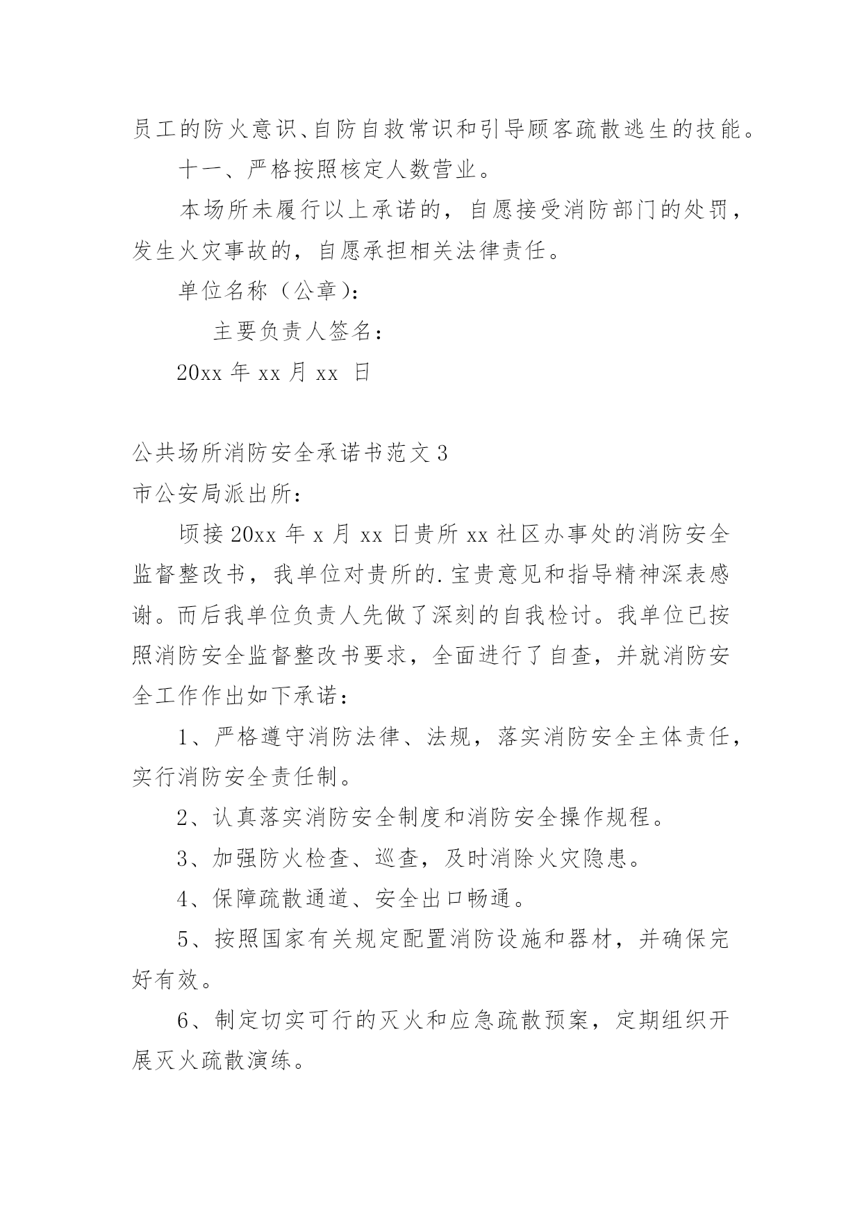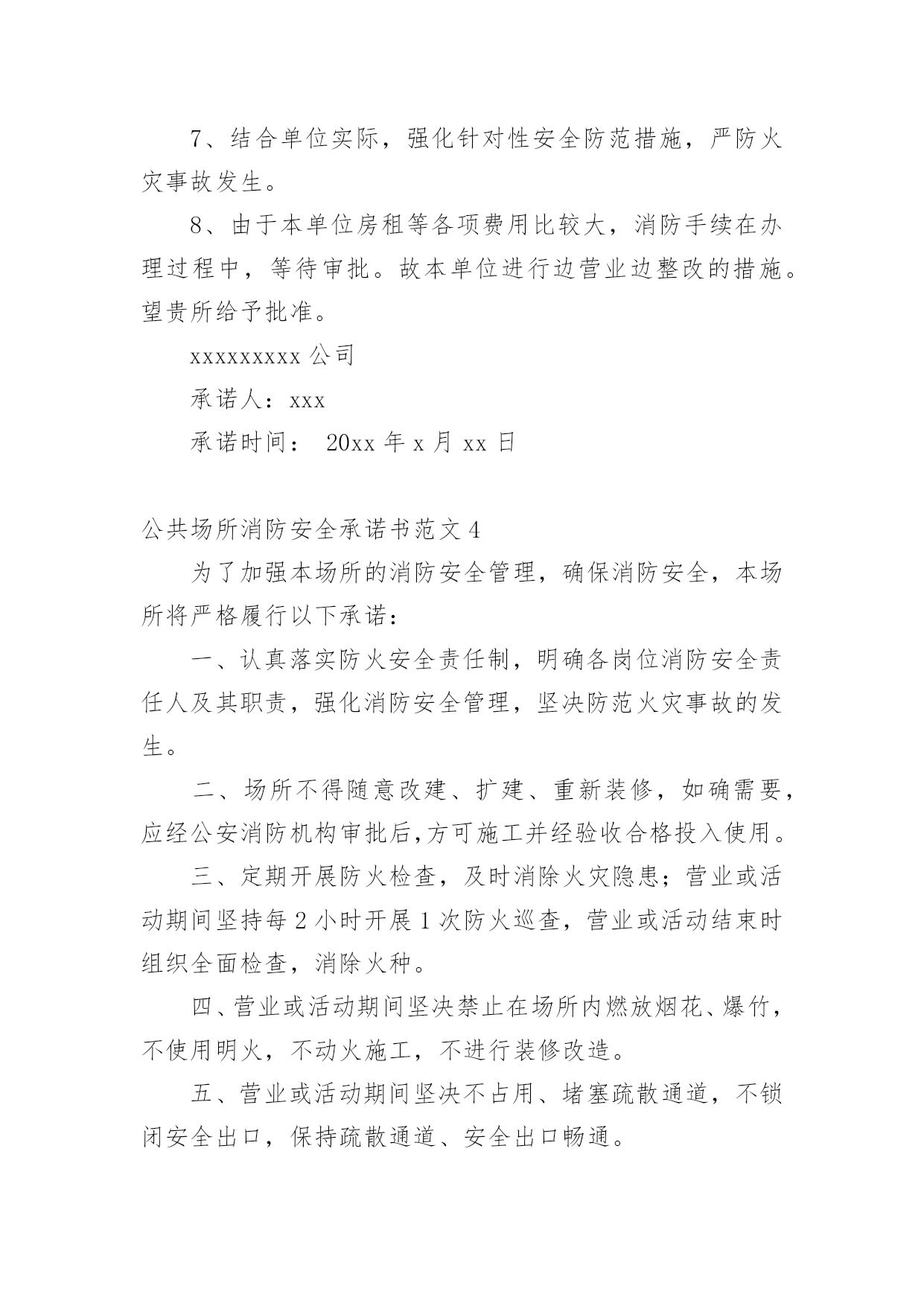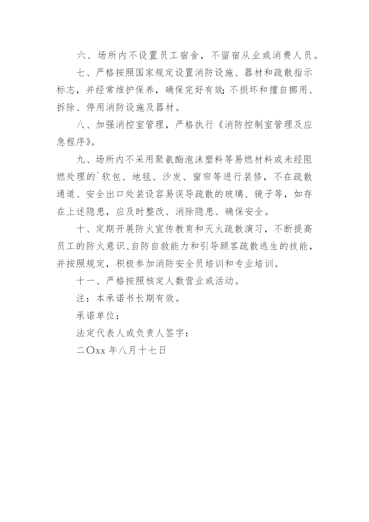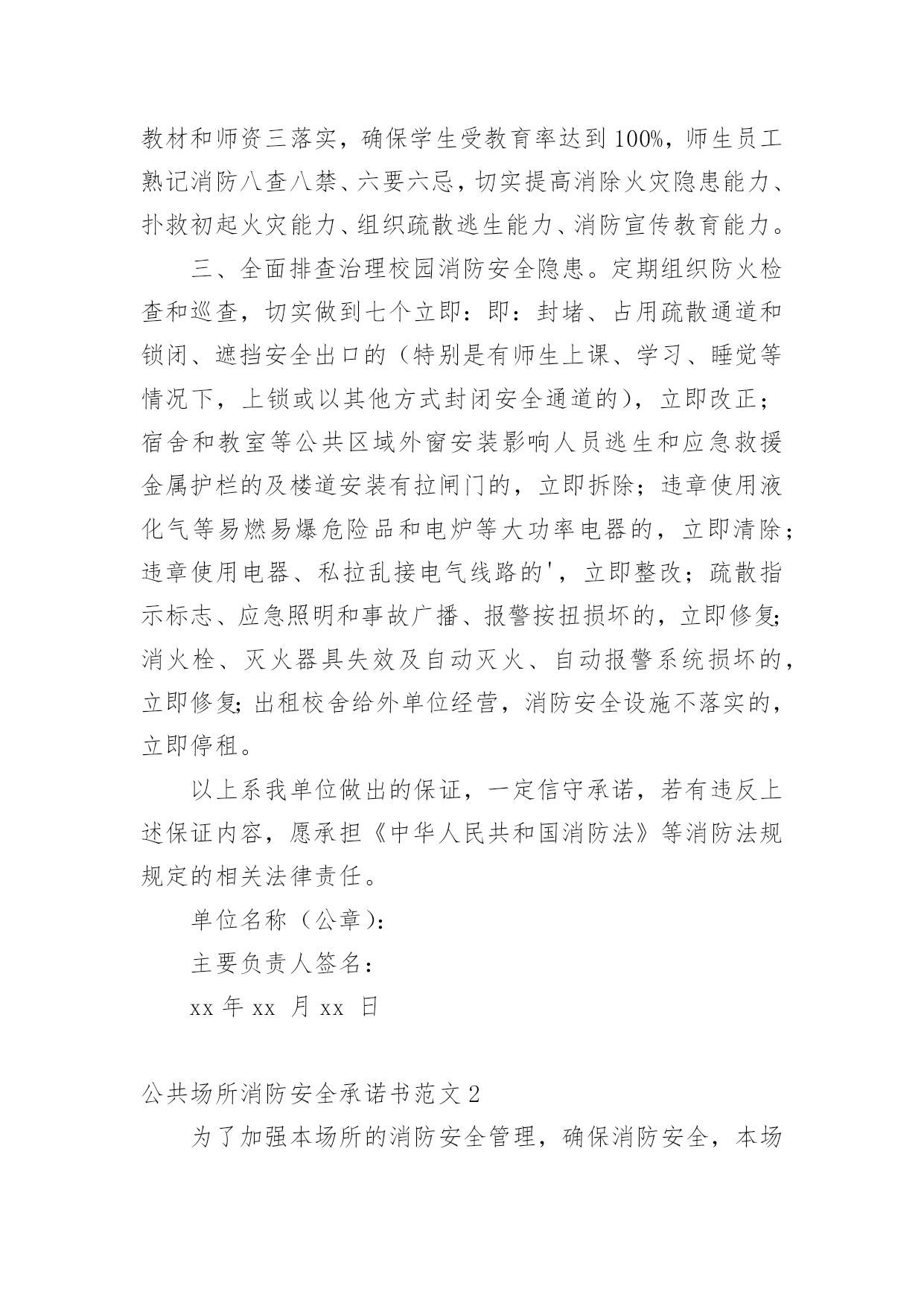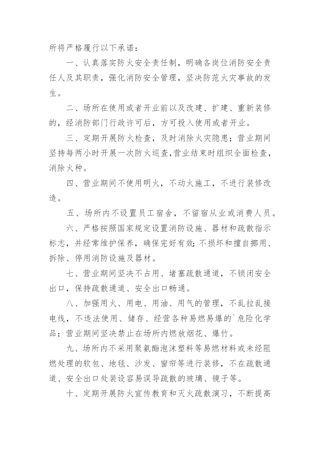 公共场所消防安全承诺书公共场所消防安全承诺书范文在发展不断提速的社会中,需要使用承诺书的场合越来越多,在写作上,承诺书有一定的书写规范。写起承诺书来就毫无头绪?下面是小编收集整理的公共场所消防安全承诺书范文,欢迎大家借鉴与参考,希望对大家有所帮助。公共场所消防安全承诺书范文1为进一步加强学校消防安全管理工作,更好地遵守相关消防法律、法规、规章和技术标准,切实做好学校内部消防安全工作,特郑重做出如下承诺:一、切实履行《中华人民共和国消防法》规定的职责和义务。落实《阆中市学校消防安全管理办法》要求,严格消防安全责任制和岗位责任制,增强领导干部和监管人员的履职尽责意识,建立健全学校消防安全组织网络,完善消防安全各项规章制度,消防安全责任人和管理人落实好各项防火安全职责和措施。持续推进校园消防安全网格化管理达标建设,消防安全管理做到分层、分级,全时段、无缝隙、精细化,目标具体化、责任定量化、管理日常化、考核科学化,及时发现隐患,快速处置,从根本上解决消防安全监管的粗放问题。二、进一步加强消防宣传和教育。加强消防安全从业人员消防安全培训,认真组织消防安全疏散演练,增强组织和引导人员疏散能力。深入推进消防教育进课堂,做到课时、教材和师资三落实,确保学生受教育率达到100%,师生员工熟记消防八查八禁、六要六忌,切实提高消除火灾隐患能力、扑救初起火灾能力、组织疏散逃生能力、消防宣传教育能力。三、全面排查治理校园消防安全隐患。定期组织防火检查和巡查,切实做到七个立即:即:封堵、占用疏散通道和锁闭、遮挡安全出口的(特别是有师生上课、学习、睡觉等情况下,上锁或以其他方式封闭安全通道的),立即改正;宿舍和教室等公共区域外窗安装影响人员逃生和应急救援金属护栏的及楼道安装有拉闸门的,立即拆除;违章使用液化气等易燃易爆危险品和电炉等大功率电器的,立即清除;违章使用电器、私拉乱接电气线路的',立即整改;疏散指示标志、应急照明和事故广播、报警按扭损坏的,立即修复;消火栓、灭火器具失效及自动灭火、自动报警系统损坏的,立即修复;出租校舍给外单位经营,消防安全设施不落实的,立即停租。以上系我单位做出的保证,一定信守承诺,若有违反上述保证内容,愿承担《中华人民共和国消防法》等消防法规规定的相关法律责任。单位名称(公章):主要负责人签名:xx年xx月xx日公共场所消防安全承诺书范文2为了加强本场所的消防安全管理,确保消防安全,本场所将严格履行以下承诺:一、认真落实防火安全责任制,明确各岗位消防安全责任人及其职责,强化消防安全管理,坚决防范火灾事故的发生。二、场所在使用或者开业前以及改建、扩建、重新装修的,经消防部门行政许可后,方可投入使用或者开业。三、定期开展防火检查,及时消除火灾隐患;营业期间坚持每两小时开展一次防火巡查,营业结束时组织全面检查,消除火种。四、营业期间不使用明火,不动火施工,不进行装修改造。五、场所内不设置员工宿舍,不留宿从业或消费人员。六、严格按照国家规定设置消防设施、器材和疏散指示标志,并经常维护保养,确保完好有效;不损坏和擅自挪用、拆除、停用消防设施及器材。七、营业期间坚决不占用、堵塞疏散通道,不锁闭安全出口,保持疏散通道、安全出口畅通。八、加强用火、用电、用油、用气的管理,不乱拉乱接电线,不违法使用、储存、经营各种易燃易爆的`危险化学品;营业期间坚决禁止在场所内燃放烟花、爆竹。九、场所内不采用聚氨酯泡沫塑料等易燃材料或未经阻燃处理的软包、地毯、沙发、窗帘等进行装修,不在疏散通道、安全出口处装设容易误导疏散的玻璃、镜子等。十、定期开展防火宣传教育和灭火疏散演习,不断提高员工的防火意识、自防自救常识和引导顾客疏散逃生的技能。十一、严格按照核定人数营业。本场所未履行以上承诺的,自愿接受消防部门的处罚,发生火灾事故的,自愿承担相关法律责任。单位名称(公章):主要负责人签名:20xx年xx月xx日公共场所消防安全承诺书范文3市公安局派出所:顷接20xx年x月xx日贵所xx社区办事处的消防安全监督整改书,我单位对贵所的.宝贵意见和指导精神深表感谢。而后我单位负责人先做了深刻的自我检讨。我单位已按照消防安全监督整改书要求,全面进行了自查,并就消防安全工作作出如下承诺:1、严格遵守消防法律、法规,落实消防安全主体责任,实行消防安全责任制。2、认真落实消防安全制度和消防安全操作规程。3、加强防火检查、巡查,及时消除火灾隐患。4、保障疏散通道、安全出口畅通。5、按照国家有关规定配置消防设施和器材,并确保完好有效。6、制定切实可行的灭火和应急疏散预案,定期组织开展灭火疏散演练。7、结合单位实际,强化针对性安全防范措施,严防火灾事故发生。8、由于本单位房租等各项费用比较大,消防手续在办理过程中,等待审批。故本单位进行边营业边整改的措施。望贵所给予批准。xxxxxx