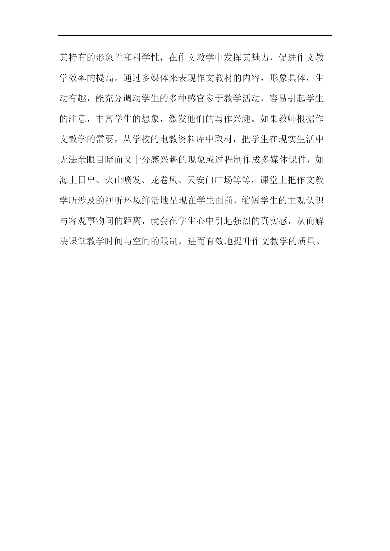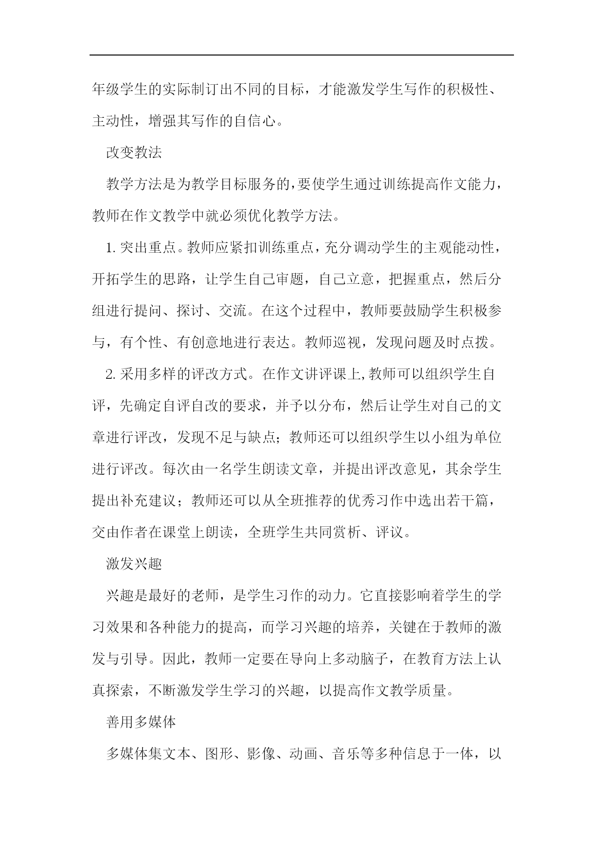 优化作文教学提高教学效率〔关键词〕语文教学;写作;制订目标;改变教法;激发兴趣;多媒体作文是学生思想水平和文字表达能力的具体体现,是衡量学生语文素质的重要标志之一。然而现在的小学生一提写作就心烦、头痛,毫无兴趣可言。究其原因,主要是学生不知道“写什么”,“怎样写”,经过冥思苦想,还是无从下笔。要改变这种状况,就必须改变传统作文教学教师命题、教师指导、教师批改、教师讲评的单项活动,必须变“单项活动”为“多项结合”,同时还要对作文教学起决定作用的各个要素进行优化。制订目标目标是师生教学活动的出发点和归宿,在教学中发挥调控作用,并贯穿于教学活动的始终。学生只有认清作文教学的目标,看准努力方向,才能成为自觉主动的学习者。同样是写事,在对“写具体”的要求上,各年级的目标就不同。如,三年级只提“内容要具体”,四年级提出“把事情的经过写具体”,五年级是“要写清楚事情的经过”。教师应围绕目标提出写作要求,既不要拔高,也不要降低。如,三年级的学生写对话,教师只要求学生写清楚说的是什么话,是谁说的,有时还要写出人物说话时的动作、表情、语气等,对文章的开头、结尾,以至表达的中心等没有提出要求。而五年级的写事作文,则要求学生写清楚时间、地点、人物,事情发生的起因、经过、结果以及这件事给自己的启发、教育等。教师只有根据不同年级学生的实际制订出不同的目标,才能激发学生写作的积极性、主动性,增强其写作的自信心。改变教法教学方法是为教学目标服务的,要使学生通过训练提高作文能力,教师在作文教学中就必须优化教学方法。1.突出重点。教师应紧扣训练重点,充分调动学生的主观能动性,开拓学生的思路,让学生自己审题,自己立意,把握重点,然后分组进行提问、探讨、交流。在这个过程中,教师要鼓励学生积极参与,有个性、有创意地进行表达。教师巡视,发现问题及时点拨。2.采用多样的评改方式。在作文讲评课上,教师可以组织学生自评,先确定自评自改的要求,并予以分布,然后让学生对自己的文章进行评改,发现不足与缺点;教师还可以组织学生以小组为单位进行评改。每次由一名学生朗读文章,并提出评改意见,其余学生提出补充建议;教师还可以从全班推荐的优秀习作中选出若干篇,交由作者在课堂上朗读,全班学生共同赏析、评议。激发兴趣兴趣是最好的老师,是学生习作的动力。它直接影响着学生的学习效果和各种能力的提高,而学习兴趣的培养,关键在于教师的激发与引导。因此,教师一定要在导向上多动脑子,在教育方法上认真探索,不断激发学生学习的兴趣,以提高作文教学质量。善用多媒体多媒体集文本、图形、影像、动画、音乐等多种信息于一体,以其特有的形象性和科学性,在作文教学中发挥其魅力,促进作文教学效率的提高。通过多媒体来表现作文教材的内容,形象具体,生动有趣,能充分调动学生的多种感官参于教学活动,容易引起学生的注意,丰富学生的想象,激发他们的写作兴趣。如果教师根据作文教学的需要,从学校的电教资料库中取材,把学生在现实生活中无法亲眼目睹而又十分感兴趣的现象或过程制作成多媒体课件,如海上日出、火山喷发、龙卷风、天安门广场等等,课堂上把作文教学所涉及的视听环境鲜活地呈现在学生面前,缩短学生的主观认识与客观事物间的距离,就会在学生心中引起强烈的真实感,从而解决课堂教学时间与空间的限制,进而有效地提升作文教学的质量。