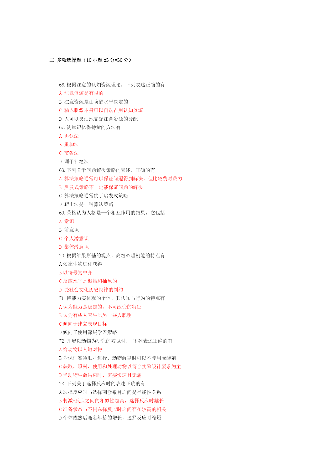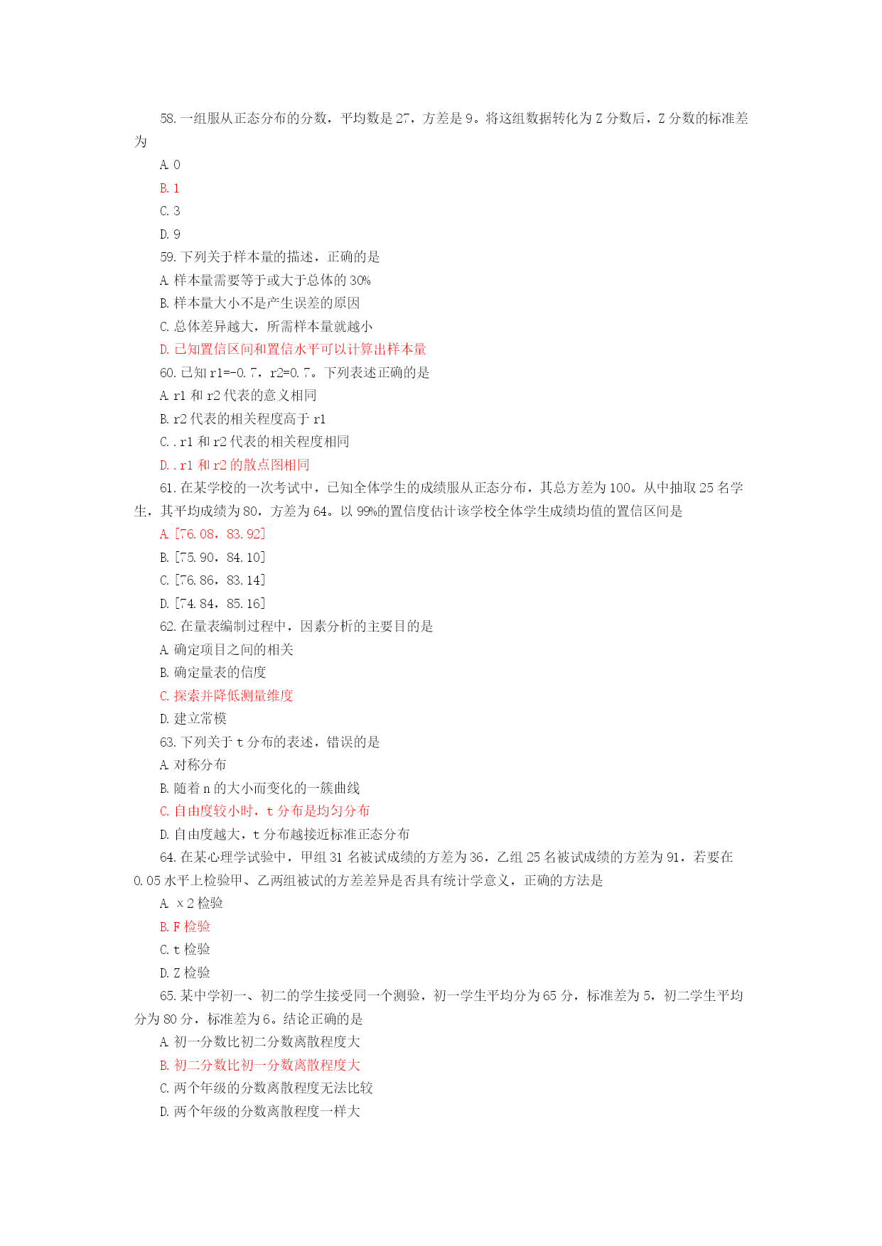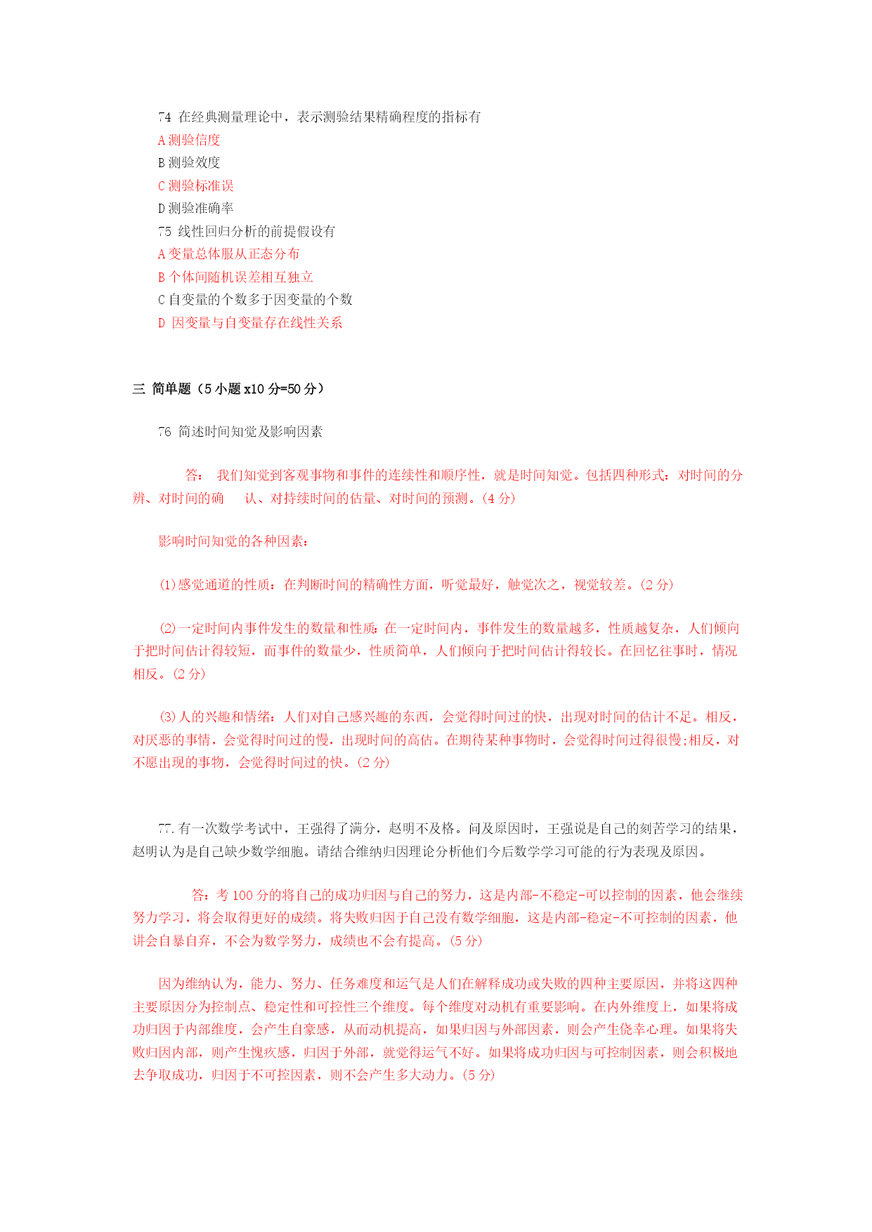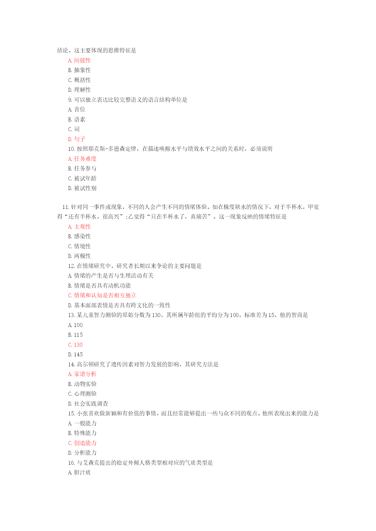 2011年全国硕士研究生入学统一考试心理学专业基础综合试题一单项选择题(65小题x2分=130分)1.除嗅觉外,感觉信息传入大脑皮层最后一个中转站是A.丘脑B.下丘脑C.海马D.桥脑2.初级视觉区、初级听觉区、躯体感觉区、言语运动区,在大脑皮层的部位依次是A.顶叶,额叶,颞叶,枕叶,B.顶叶,枕叶,颞叶,额叶C.枕叶,额叶,顶叶,颞叶D.枕叶,颞叶,顶叶,额叶3.根据听觉位置理论,耳蜗对高频声波反应的敏感区域位于A.顶部B.中部C.背部D.底部4.“甜蜜的嗓音”、“温暖的色彩”这种感觉现象是A.适应B.对比C.后像D.联觉5.故地重游往往令人触景生情,回忆起许多在其他情况下不太容易想起的事情,能解释此现象的是A.层次网络模型B.逆行性遗忘C.编码特异性原理D.激活扩散模型6.根据艾宾浩斯遗忘曲线,为了取得最好的记忆效果,个体对初次识记的无意义材料进行复习的时间应在识记后A.1小时内B.2-12小时C.13-24小时D.24小时后7.小明在游戏中把凳子当马骑,这种活动反应的想象功能是A.再造B.补充C.替代D.预见8.天空出现朝霞,就会下雨;天空出现晚霞,就会放晴。人们由此得出“朝霞不出门,晚霞行千里”的结论。这主要体现的思维特征是A.间接性B.抽象性C.概括性D.理解性9.可以独立表达比较完整语义的语言结构单位是A.音位B.语素C.词D.句子10.按照耶克斯-多德森定律,在描述唤醒水平与绩效水平之间的关系时,必须说明A.任务难度B.任务参与C.被试年龄D.被试性别11.针对同一事件或现象,不同的人会产生不同的情绪体验。如在极度缺水的情况下,对于半杯水,甲觉得“还有半杯水,很高兴”;乙觉得“只在半杯水了,真痛苦”。这一现象反映的情绪特征是A.主观性B.感染性C.情境性D.两极性12.在情绪研究中,研究者长期以来争论的主要问题是A.情绪的产生是否与生理活动有关B.情绪是否具有动机功能C.情绪和认知是否相互独立D.基本面部表情是否具有跨文化的一致性13.某儿童智力测验的原始分数为130,其所属年龄组的平均分为100,标准差为15,他的智商是A.100B.115C.130D.14514.高尔顿研究了遗传因素对智力发展的影响,其研究方法是A.家谱分析B.动物实验C.心理测验D.社会实践调查15.小张喜欢做新颖和有价值的事情,而且经常能够提出一些与众不同的观点。他所表现出来的能力是A.一般能力B.特殊能力C.创造能力D.分析能力16.与艾森克提出的稳定外倾人格类型相对应的气质类型是A.胆汁质B.多血质C.黏液质D.抑郁质17.“掩耳盗铃”现象体现的心理防御机制主要是A.转移作用B.反向作用C.退行作用D.否认作用18.许多人认为,坐火车比乘飞机更安全。这种社会判断的成因是A.调整性启发B.可得性启发C.代表性启发D.参照点启发19.根据社会交换理论,无偿献血属于A.本能的亲社会行为B.纯粹的利他行为C.纯粹的利已行为D.间接的互惠行为20.认为心理发展只有量的连续累积、不存在阶段性的理论是A.心理社会发展理论B.发生认识论C.心理**发展理论D.社会学习理论21.在个体发展过程中,衰退最早的心理机能是A.感觉和知觉B.记忆C.想象D.思维22.某儿童认为周围世界绕着他转,月亮跟着他走;他只知道自己有个哥哥,但不知道自己就是哥哥的弟弟。该儿童心理发展所处的阶段是A.具体运算阶段B.前运算阶段C.后运算阶段D.形式运算阶段23.根据布朗芬布伦纳(U.Bronfenbrenner)的生态系统理论,下列说法错误的是A.微观系统指儿童直接接触的环境B.环境是动态的、不断变化的C.生态系统理论强调个体与环境的相互作用D.外层系统包括社会意识形态、法律、文化等24.根据柯尔伯格的理论,道德发展的最高阶段是A.法律和秩序的取向B.社会契约的取向C.工具性的相对主义D.普遍的道德原则取向25.下列关于成人中期的人格发展特点的表述,错误的是A.自我发展处于从众水平B.性别角色进入整合阶段C.对生活的评价具有现实性D.对自己的内心世界日益关注26.语法知识的学习促进了语言的表达。这种迁移现象是A.陈述性知识对陈述性知识的迁移B.陈述性知识对程序性知识的迁移C.程序性知识对陈述性知识的迁移D.程序性知识对程序性知识的迁移27.根据阿特金森(J.W.Atkinson)的成就动机理论,高成就动机者在面对不同难度的任务时,倾向选择的任务难度是A.低难度B.较低难度C.中等难度D.高难度28.概念学习中的变式是指A.变更教学组织方式B.变更言语表达方式C.变更概念的本质属性D.变更正例的无关属性29.在桑代克早期提出的学习规律中,体现了共同要素迁移理论思想的是A.多重反应律B.优势元素律C.联合转移律D.类推反应率30.认知领域学习的内容相当于A.陈