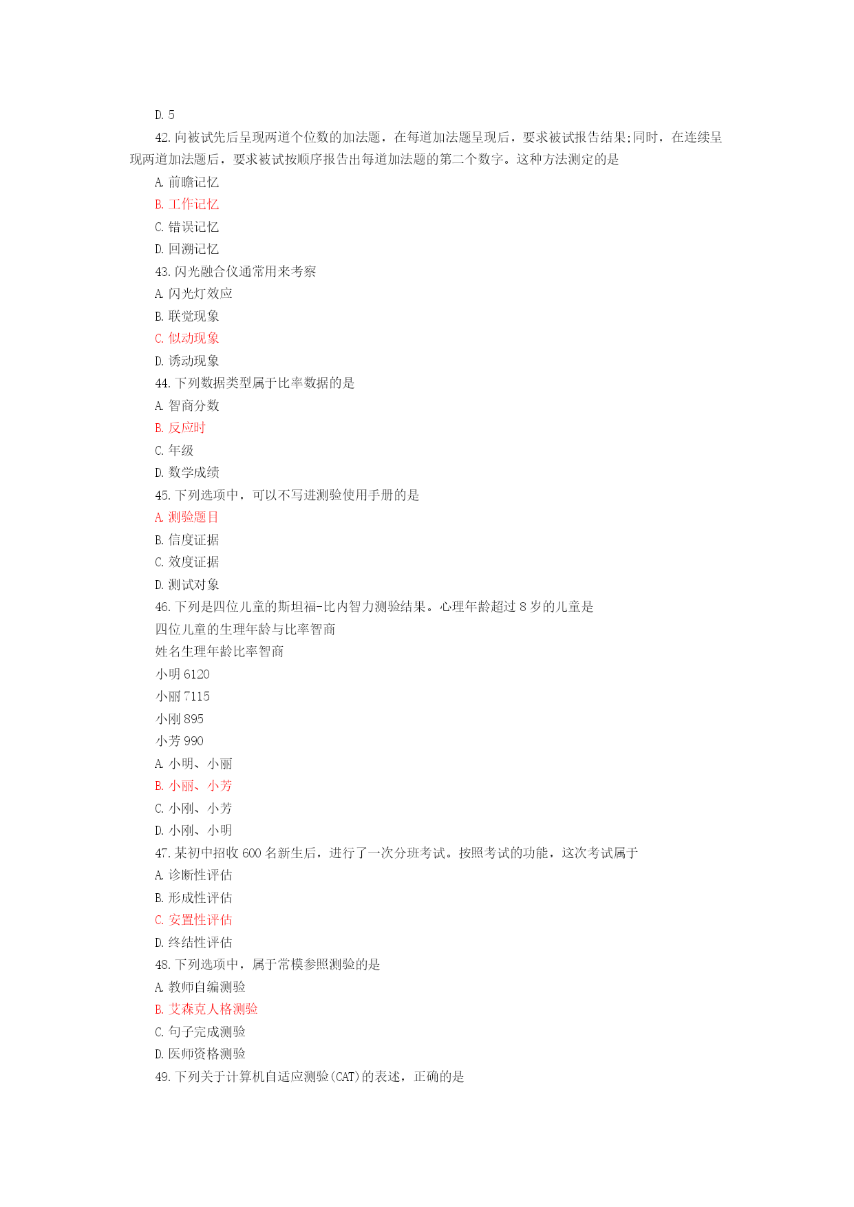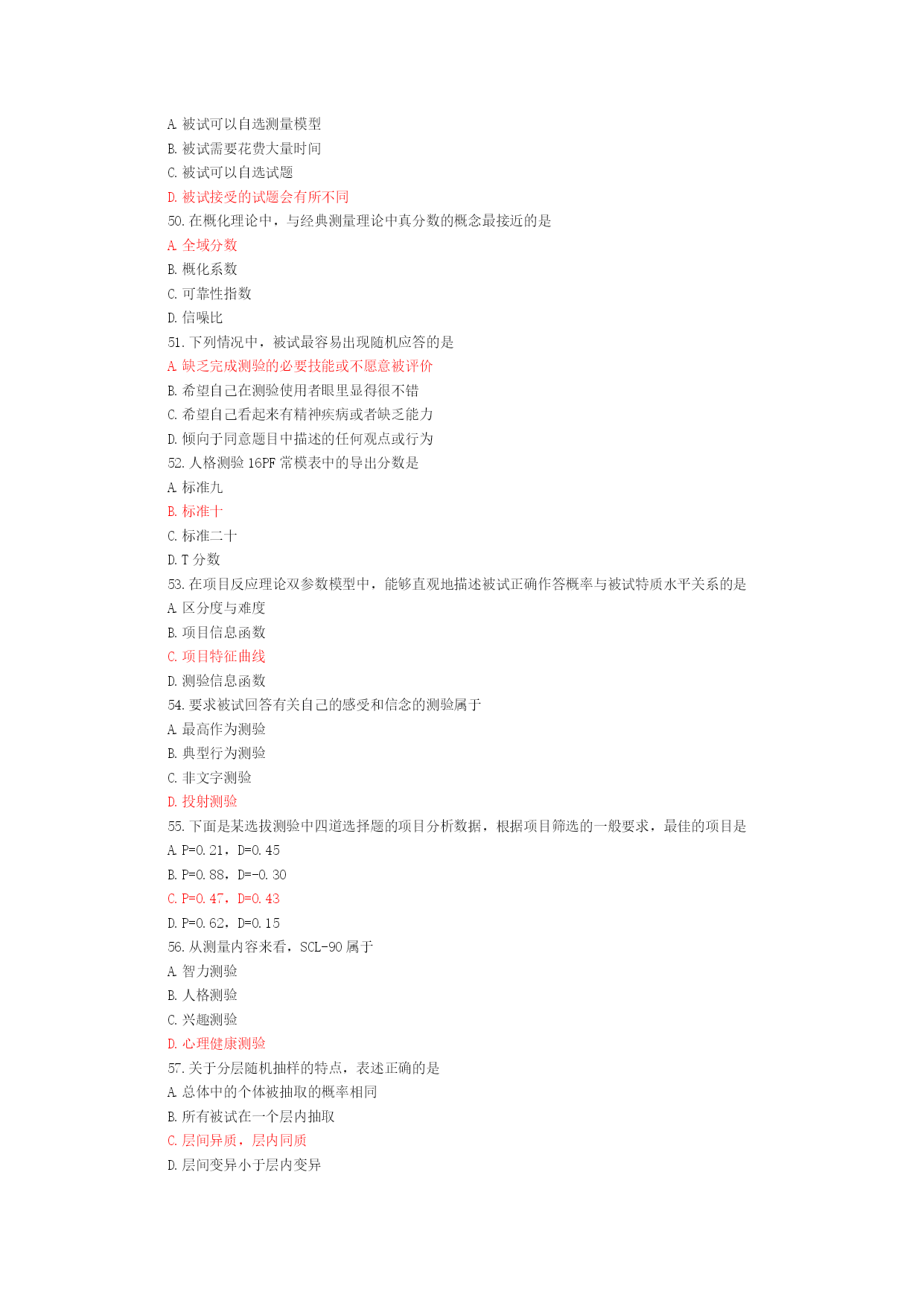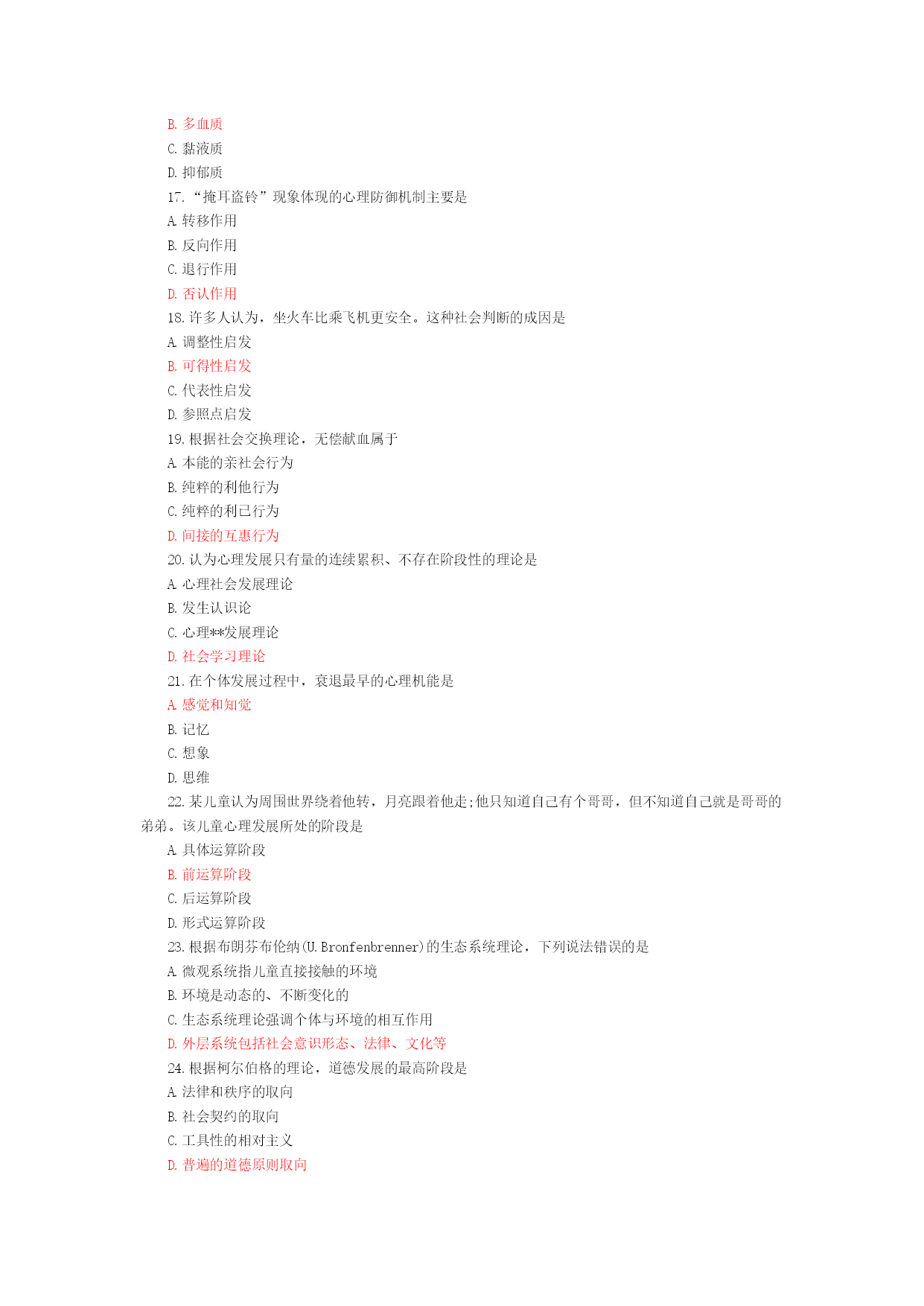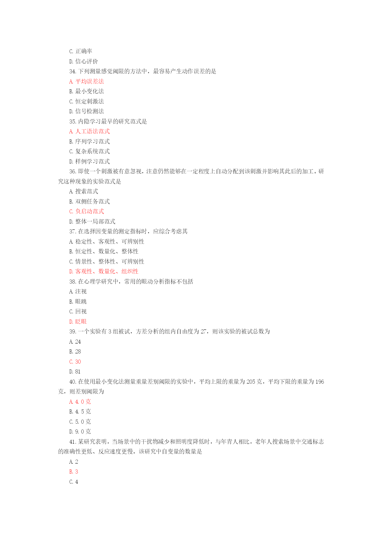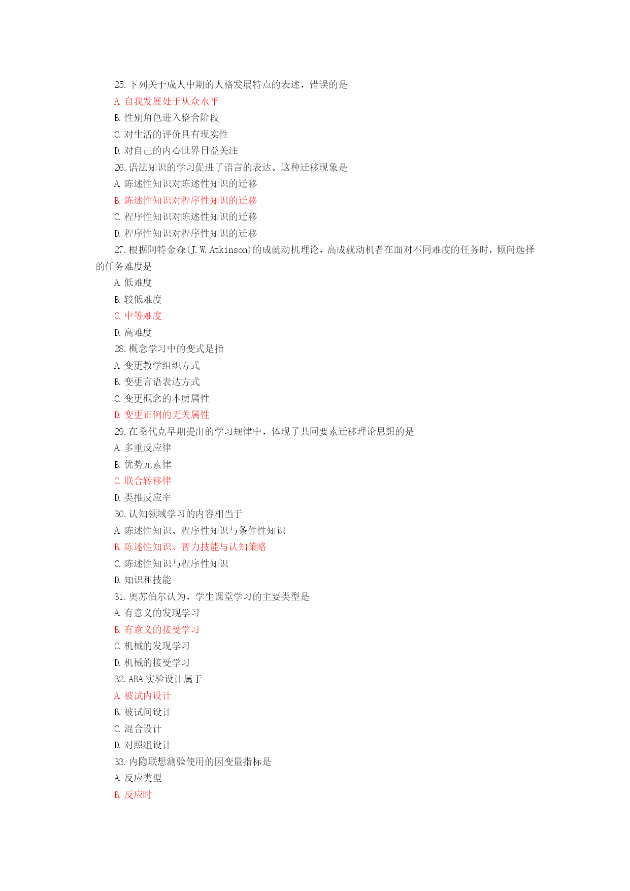 2011年全国硕士研究生入学统一考试心理学专业基础综合试题一单项选择题(65小题x2分=130分)1.除嗅觉外,感觉信息传入大脑皮层最后一个中转站是A.丘脑B.下丘脑C.海马D.桥脑2.初级视觉区、初级听觉区、躯体感觉区、言语运动区,在大脑皮层的部位依次是A.顶叶,额叶,颞叶,枕叶,B.顶叶,枕叶,颞叶,额叶C.枕叶,额叶,顶叶,颞叶D.枕叶,颞叶,顶叶,额叶3.根据听觉位置理论,耳蜗对高频声波反应的敏感区域位于A.顶部B.中部C.背部D.底部4.“甜蜜的嗓音”、“温暖的色彩”这种感觉现象是A.适应B.对比C.后像D.联觉5.故地重游往往令人触景生情,回忆起许多在其他情况下不太容易想起的事情,能解释此现象的是A.层次网络模型B.逆行性遗忘C.编码特异性原理D.激活扩散模型6.根据艾宾浩斯遗忘曲线,为了取得最好的记忆效果,个体对初次识记的无意义材料进行复习的时间应在识记后A.1小时内B.2-12小时C.13-24小时D.24小时后7.小明在游戏中把凳子当马骑,这种活动反应的想象功能是A.再造B.补充C.替代D.预见8.天空出现朝霞,就会下雨;天空出现晚霞,就会放晴。人们由此得出“朝霞不出门,晚霞行千里”的结论。这主要体现的思维特征是A.间接性B.抽象性C.概括性D.理解性9.可以独立表达比较完整语义的语言结构单位是A.音位B.语素C.词D.句子10.按照耶克斯-多德森定律,在描述唤醒水平与绩效水平之间的关系时,必须说明A.任务难度B.任务参与C.被试年龄D.被试性别11.针对同一事件或现象,不同的人会产生不同的情绪体验。如在极度缺水的情况下,对于半杯水,甲觉得“还有半杯水,很高兴”;乙觉得“只在半杯水了,真痛苦”。这一现象反映的情绪特征是A.主观性B.感染性C.情境性D.两极性12.在情绪研究中,研究者长期以来争论的主要问题是A.情绪的产生是否与生理活动有关B.情绪是否具有动机功能C.情绪和认知是否相互独立D.基本面部表情是否具有跨文化的一致性13.某儿童智力测验的原始分数为130,其所属年龄组的平均分为100,标准差为15,他的智商是A.100B.115C.130D.14514.高尔顿研究了遗传因素对智力发展的影响,其研究方法是A.家谱分析B.动物实验C.心理测验D.社会实践调查15.小张喜欢做新颖和有价值的事情,而且经常能够提出一些与众不同的观点。他所表现出来的能力是A.一般能力B.特殊能力C.创造能力D.分析能力16.与艾森克提出的稳定外倾人格类型相对应的气质类型是A.胆汁质B.多血质C.黏液质D.抑郁质17.“掩耳盗铃”现象体现的心理防御机制主要是A.转移作用B.反向作用C.退行作用D.否认作用18.许多人认为,坐火车比乘飞机更安全。这种社会判断的成因是A.调整性启发B.可得性启发C.代表性启发D.参照点启发19.根据社会交换理论,无偿献血属于A.本能的亲社会行为B.纯粹的利他行为C.纯粹的利已行为D.间接的互惠行为20.认为心理发展只有量的连续累积、不存在阶段性的理论是A.心理社会发展理论B.发生认识论C.心理**发展理论D.社会学习理论21.在个体发展过程中,衰退最早的心理机能是A.感觉和知觉B.记忆C.想象D.思维22.某儿童认为周围世界绕着他转,月亮跟着他走;他只知道自己有个哥哥,但不知道自己就是哥哥的弟弟。该儿童心理发展所处的阶段是A.具体运算阶段B.前运算阶段C.后运算阶段D.形式运算阶段23.根据布朗芬布伦纳(U.Bronfenbrenner)的生态系统理论,下列说法错误的是A.微观系统指儿童直接接触的环境B.环境是动态的、不断变化的C.生态系统理论强调个体与环境的相互作用D.外层系统包括社会意识形态、法律、文化等24.根据柯尔伯格的理论,道德发展的最高阶段是A.法律和秩序的取向B.社会契约的取向C.工具性的相对主义D.普遍的道德原则取向25.下列关于成人中期的人格发展特点的表述,错误的是A.自我发展处于从众水平B.性别角色进入整合阶段C.对生活的评价具有现实性D.对自己的内心世界日益关注26.语法知识的学习促进了语言的表达。这种迁移现象是A.陈述性知识对陈述性知识的迁移B.陈述性知识对程序性知识的迁移C.程序性知识对陈述性知识的迁移D.程序性知识对程序性知识的迁移27.根据阿特金森(J.W.Atkinson)的成就动机理论,高成就动机者在面对不同难度的任务时,倾向选择的任务难度是A.低难度B.较低难度C.中等难度D.高难度28.概念学习中的变式是指A.变更教学组织方式B.变更言语表达方式C.变更概念的本质属性D.变更正例的无关属性29.在桑代克早期提出的学习规律中,体现了共同要素迁移理论思想的是A.多重反应律B.优势元素律C.联合转移律D.类推反应率30.认知领域学习的内容相当于A.陈