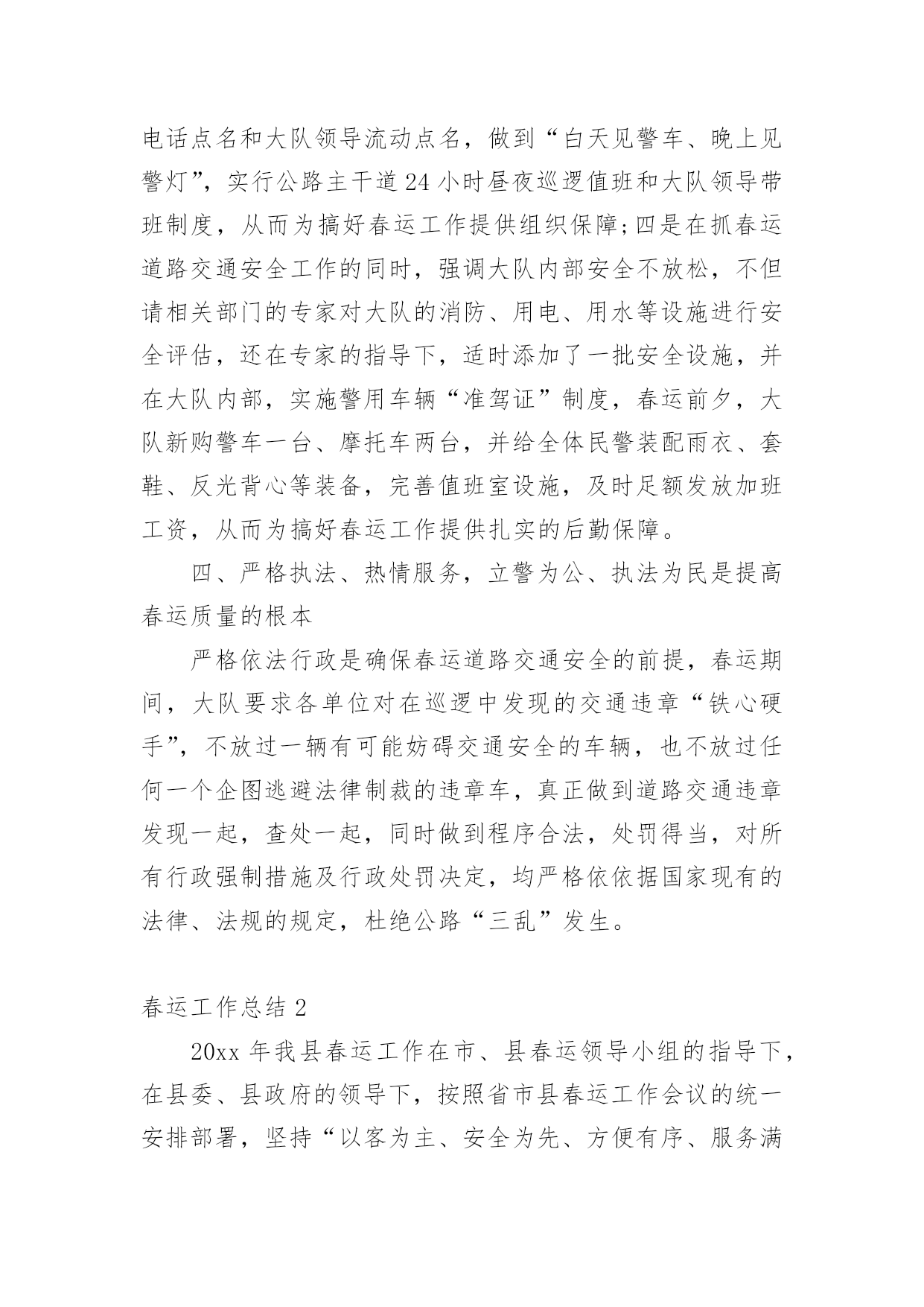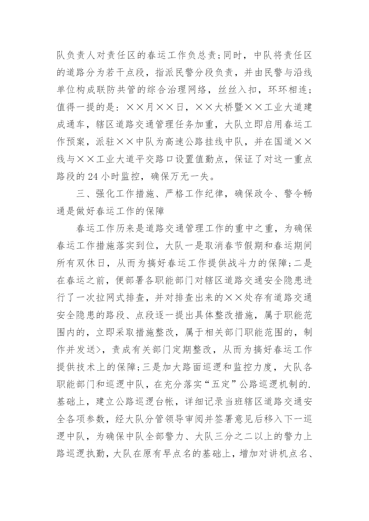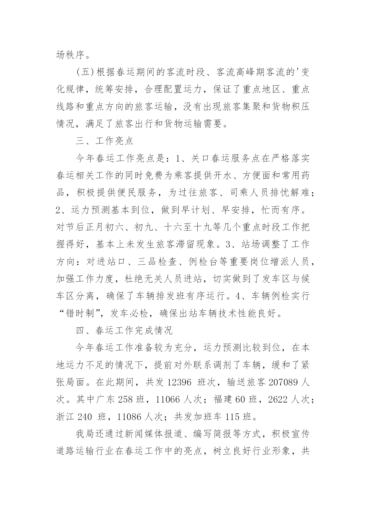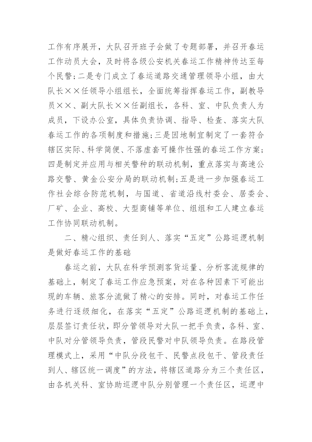 春运工作总结【热门】春运工作总结15篇总结是把一定阶段内的有关情况分析研究,做出有指导性的经验方法以及结论的书面材料,它可以明确下一步的工作方向,少走弯路,少犯错误,提高工作效益,因此十分有必须要写一份总结哦。那么你知道总结如何写吗?下面是小编帮大家整理的春运工作总结,希望能够帮助到大家。春运工作总结1春运自××月××日开始,至××月××日结束。据统计,春运××天,大队共出动警力××余人次,查处各类道路交通违章××起,其中:客车超载××辆次,非法从事客运××辆次,其他道道路交通违章××起,转运旅客××人。大队各科、室、中队按照春运工作的指导原则,加强领导,精心组织,注重安全,提高服务,实现了春运工作“安全、有序、畅通”的目标;与去年春运相比,道路交通形势全面好大,道路交通事故四项指数分别下降:13%、75%、62%、94%。综合分析,今年春运工作的特点有以下几个方面:一、机构健全、方案科学,措施合理、目标明确、指挥有方是做好春运工作的关键一是根据上级公安机关××年春运道路交通管理工作的总体部署和市交警支队的具体工作方案,为确保辖区春运工作有序展开,大队召开班子会做了专题部署,并召开春运工作动员大会,及时将各级公安机关春运工作精神传达至每个民警;二是专门成立了春运道路交通管理领导小组,由大队长××任领导小组组长,全面统筹指挥春运工作,副教导员××、副大队长××任副组长,各科、室、中队负责人为成员,下设办公室,具体负责协调、指导、检查、落实大队春运工作的各项制度和措施;三是因地制宜制定了一套符合辖区实际、科学简便、不落虚套可操作性强的春运工作方案;四是制定并应用与相关警种的联动机制,重点落实与高速公路交警、黄金公安分局的联动机制;五是进一步加强春运工作社会综合防范机制,与国道、省道沿线村委会、居委会、厂矿、企业、高校、大型商铺等单位、组组和工人建立春运工作协同联动机制。二、精心组织、责任到人、落实“五定”公路巡逻机制是做好春运工作的基础春运之前,大队在科学预测客货运量、分析客流规律的基础上,制定了春运工作应急预案,对在各种因素下可能出现的车辆、旅客分流做了精心的安排。同时,对春运工作任务进行逐级细化,在落实“五定”公路巡逻机制的基础上,层层签订责任状,即分管领导对大队一把手负责,各科、室、中队对分管领导负责,管段民警对中队领导负责。在路段管理模式上,采用“中队分段包干、民警点段包干、管段责任到人、辖区统一调度”的方法,将辖区道路分为三个责任区,由各机关科、室协助巡逻中队分别管理一个责任区,巡逻中队负责人对责任区的春运工作负总责;同时,中队将责任区的道路分为若干点段,指派民警分段负责,并由民警与沿线单位构成联防共管的综合治理网络,丝丝入扣,环环相连;值得一提的是:××月××日,××大桥暨××工业大道建成通车,辖区道路交通管理任务加重,大队立即启用春运工作预案,派驻××中队为高速公路挂线中队,并在国道××线与××工业大道平交路口设置值勤点,保证了对这一重点路段的24小时监控,确保万无一失。三、强化工作措施、严格工作纪律,确保政令、警令畅通是做好春运工作的保障春运工作历来是道路交通管理工作的重中之重,为确保春运工作措施落实到位,大队一是取消春节假期和春运期间所有双休日,从而为搞好春运工作提供战斗力的保障;二是在春运之前,便部署各职能部门对辖区道路交通安全隐患进行了一次拉网式排查,并对排查出来的××处存有道路交通安全隐患的路段、点段逐一提出具体整改措施,属于职能范围内的,立即采取措施整改,属于相关部门职能范围的,制作并发送>,责成有关部门定期整改,从而为搞好春运工作提供技术上的保障;三是加大路面巡逻和监控力度,大队各职能部门和巡逻中队,在充分落实“五定”公路巡逻机制的.基础上,建立公路巡逻台帐,详细记录当班辖区道路交通安全各项参数,经大队分管领导审阅并签署意见后移入下一巡逻中队,为确保中队全部警力、大队三分之二以上的警力上路巡逻执勤,大队在原有早点名的基础上,增加对讲机点名、电话点名和大队领导流动点名,做到“白天见警车、晚上见警灯”,实行公路主干道24小时昼夜巡逻值班和大队领导带班制度,从而为搞好春运工作提供组织保障;四是在抓春运道路交通安全工作的同时,强调大队内部安全不放松,不但请相关部门的专家对大队的消防、用电、用水等设施进行安全评估,还在专家的指导下,适时添加了一批安全设施,并在大队内部,实施警用车辆“准驾证”制度,春运前夕,大队新购警车一台、摩托车两台,并给全体民警装配雨衣、套鞋、反光背心等装备,完善值班室设施,及时足额发放加班工资,从而为搞好春运工作提供扎实的后勤保障。四、严格执法、热情服务,立警为公、执法为民是提高春运质量的根本严格依法行政是确保春运道路交通安全的前提,春运期间,大队要求各单位对在巡逻中发现的交通违章“铁心