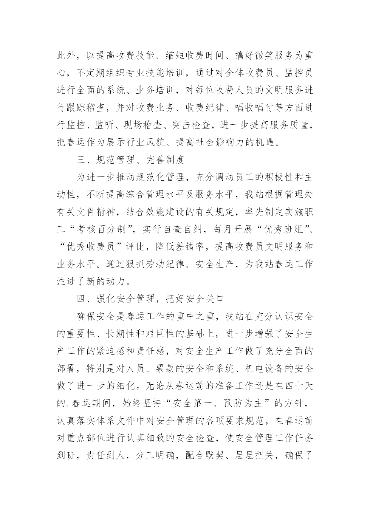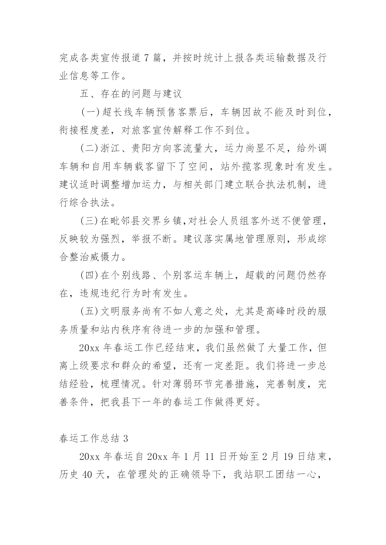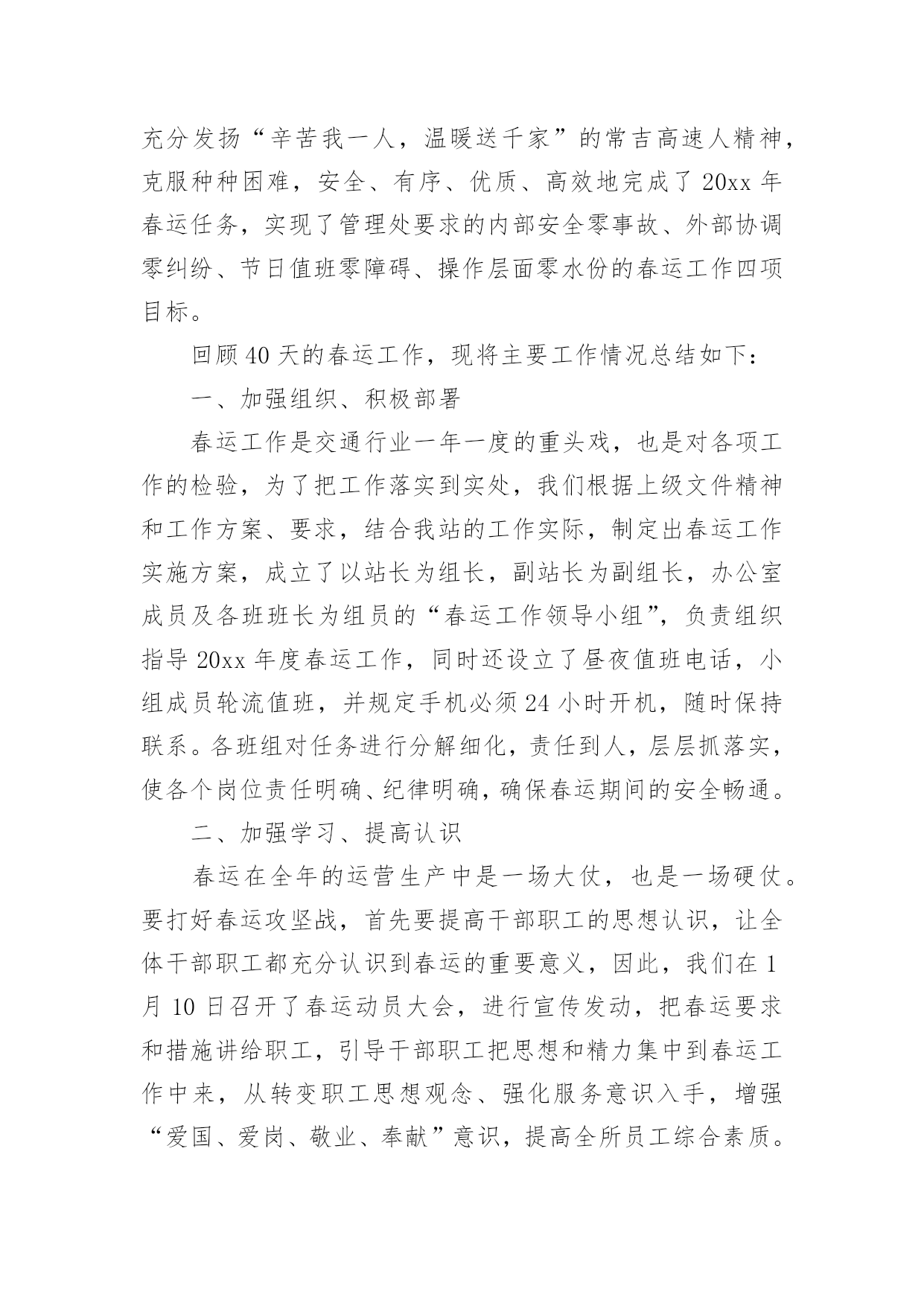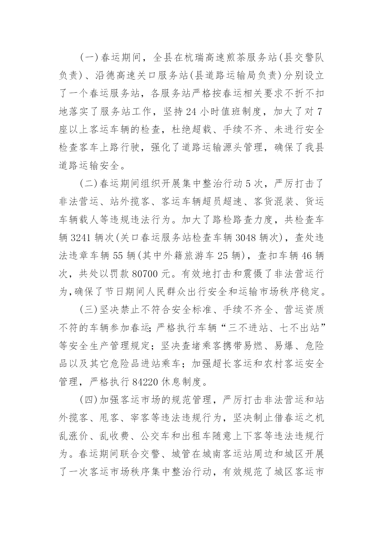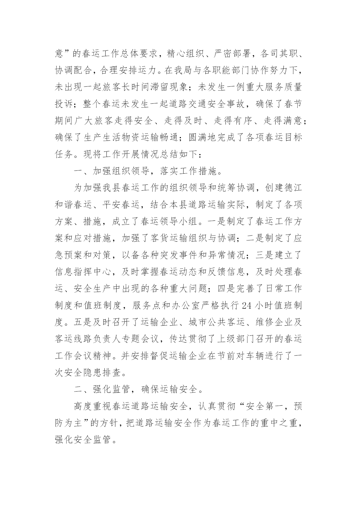 春运工作总结【热门】春运工作总结15篇总结是把一定阶段内的有关情况分析研究,做出有指导性的经验方法以及结论的书面材料,它可以明确下一步的工作方向,少走弯路,少犯错误,提高工作效益,因此十分有必须要写一份总结哦。那么你知道总结如何写吗?下面是小编帮大家整理的春运工作总结,希望能够帮助到大家。春运工作总结1春运自××月××日开始,至××月××日结束。据统计,春运××天,大队共出动警力××余人次,查处各类道路交通违章××起,其中:客车超载××辆次,非法从事客运××辆次,其他道道路交通违章××起,转运旅客××人。大队各科、室、中队按照春运工作的指导原则,加强领导,精心组织,注重安全,提高服务,实现了春运工作“安全、有序、畅通”的目标;与去年春运相比,道路交通形势全面好大,道路交通事故四项指数分别下降:13%、75%、62%、94%。综合分析,今年春运工作的特点有以下几个方面:一、机构健全、方案科学,措施合理、目标明确、指挥有方是做好春运工作的关键一是根据上级公安机关××年春运道路交通管理工作的总体部署和市交警支队的具体工作方案,为确保辖区春运工作有序展开,大队召开班子会做了专题部署,并召开春运工作动员大会,及时将各级公安机关春运工作精神传达至每个民警;二是专门成立了春运道路交通管理领导小组,由大队长××任领导小组组长,全面统筹指挥春运工作,副教导员××、副大队长××任副组长,各科、室、中队负责人为成员,下设办公室,具体负责协调、指导、检查、落实大队春运工作的各项制度和措施;三是因地制宜制定了一套符合辖区实际、科学简便、不落虚套可操作性强的春运工作方案;四是制定并应用与相关警种的联动机制,重点落实与高速公路交警、黄金公安分局的联动机制;五是进一步加强春运工作社会综合防范机制,与国道、省道沿线村委会、居委会、厂矿、企业、高校、大型商铺等单位、组组和工人建立春运工作协同联动机制。二、精心组织、责任到人、落实“五定”公路巡逻机制是做好春运工作的基础春运之前,大队在科学预测客货运量、分析客流规律的基础上,制定了春运工作应急预案,对在各种因素下可能出现的车辆、旅客分流做了精心的安排。同时,对春运工作任务进行逐级细化,在落实“五定”公路巡逻机制的基础上,层层签订责任状,即分管领导对大队一把手负责,各科、室、中队对分管领导负责,管段民警对中队领导负责。在路段管理模式上,采用“中队分段包干、民警点段包干、管段责任到人、辖区统一调度”的方法,将辖区道路分为三个责任区,由各机关科、室协助巡逻中队分别管理一个责任区,巡逻中队负责人对责任区的春运工作负总责;同时,中队将责任区的道路分为若干点段,指派民警分段负责,并由民警与沿线单位构成联防共管的综合治理网络,丝丝入扣,环环相连;值得一提的是:××月××日,××大桥暨××工业大道建成通车,辖区道路交通管理任务加重,大队立即启用春运工作预案,派驻××中队为高速公路挂线中队,并在国道××线与××工业大道平交路口设置值勤点,保证了对这一重点路段的24小时监控,确保万无一失。三、强化工作措施、严格工作纪律,确保政令、警令畅通是做好春运工作的保障春运工作历来是道路交通管理工作的重中之重,为确保春运工作措施落实到位,大队一是取消春节假期和春运期间所有双休日,从而为搞好春运工作提供战斗力的保障;二是在春运之前,便部署各职能部门对辖区道路交通安全隐患进行了一次拉网式排查,并对排查出来的××处存有道路交通安全隐患的路段、点段逐一提出具体整改措施,属于职能范围内的,立即采取措施整改,属于相关部门职能范围的,制作并发送>,责成有关部门定期整改,从而为搞好春运工作提供技术上的保障;三是加大路面巡逻和监控力度,大队各职能部门和巡逻中队,在充分落实“五定”公路巡逻机制的.基础上,建立公路巡逻台帐,详细记录当班辖区道路交通安全各项参数,经大队分管领导审阅并签署意见后移入下一巡逻中队,为确保中队全部警力、大队三分之二以上的警力上路巡逻执勤,大队在原有早点名的基础上,增加对讲机点名、电话点名和大队领导流动点名,做到“白天见警车、晚上见警灯”,实行公路主干道24小时昼夜巡逻值班和大队领导带班制度,从而为搞好春运工作提供组织保障;四是在抓春运道路交通安全工作的同时,强调大队内部安全不放松,不但请相关部门的专家对大队的消防、用电、用水等设施进行安全评估,还在专家的指导下,适时添加了一批安全设施,并在大队内部,实施警用车辆“准驾证”制度,春运前夕,大队新购警车一台、摩托车两台,并给全体民警装配雨衣、套鞋、反光背心等装备,完善值班室设施,及时足额发放加班工资,从而为搞好春运工作提供扎实的后勤保障。四、严格执法、热情服务,立警为公、执法为民是提高春运质量的根本严格依法行政是确保春运道路交通安全的前提,春运期间,大队要求各单位对在巡逻中发现的交通违章“铁心