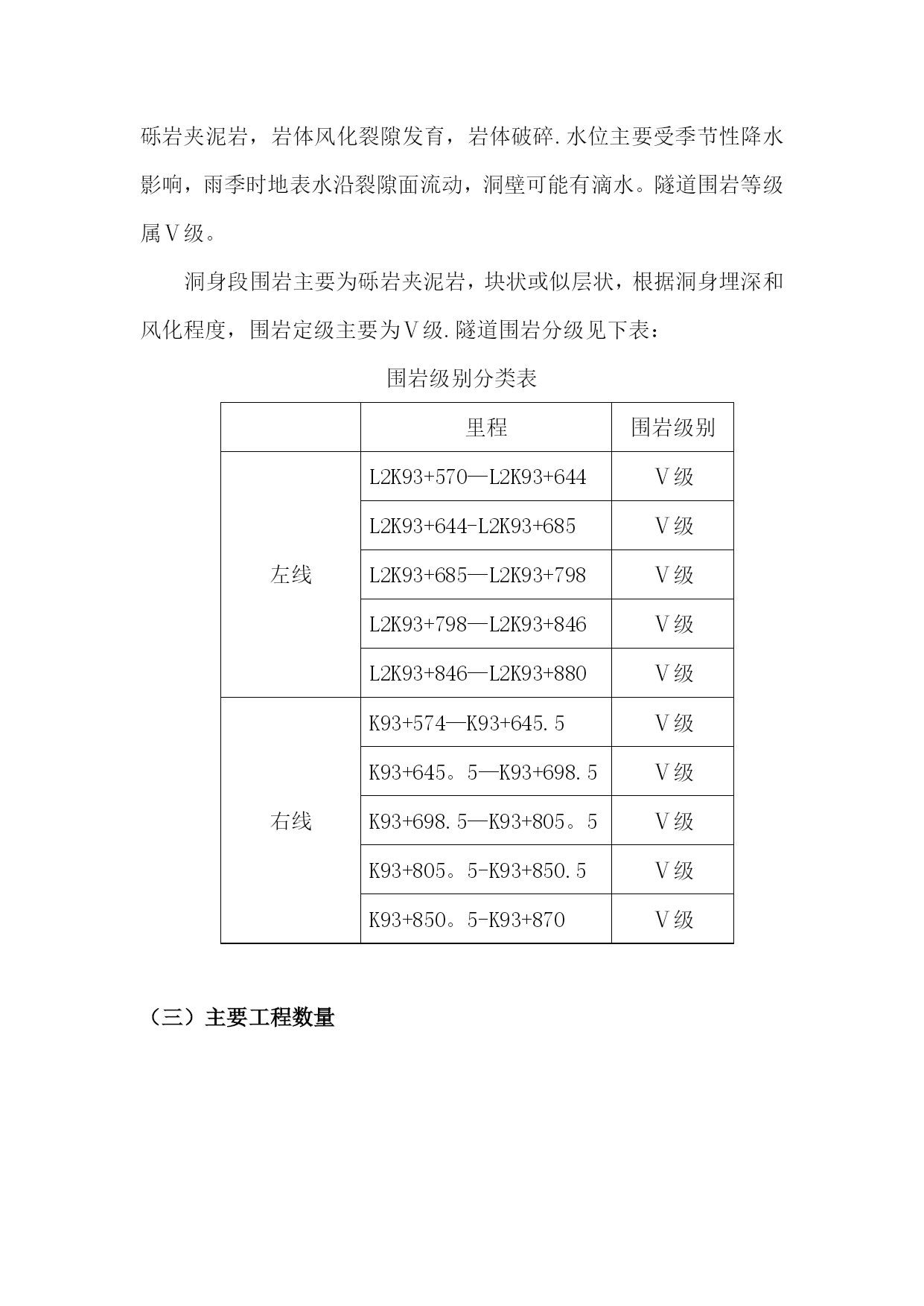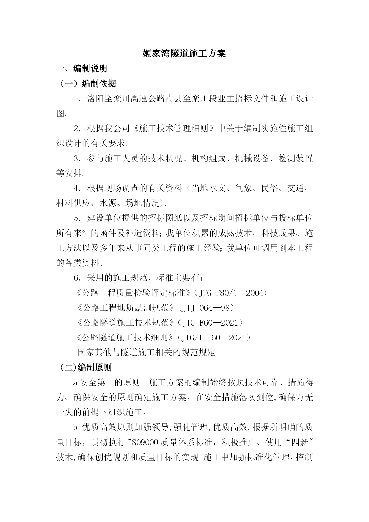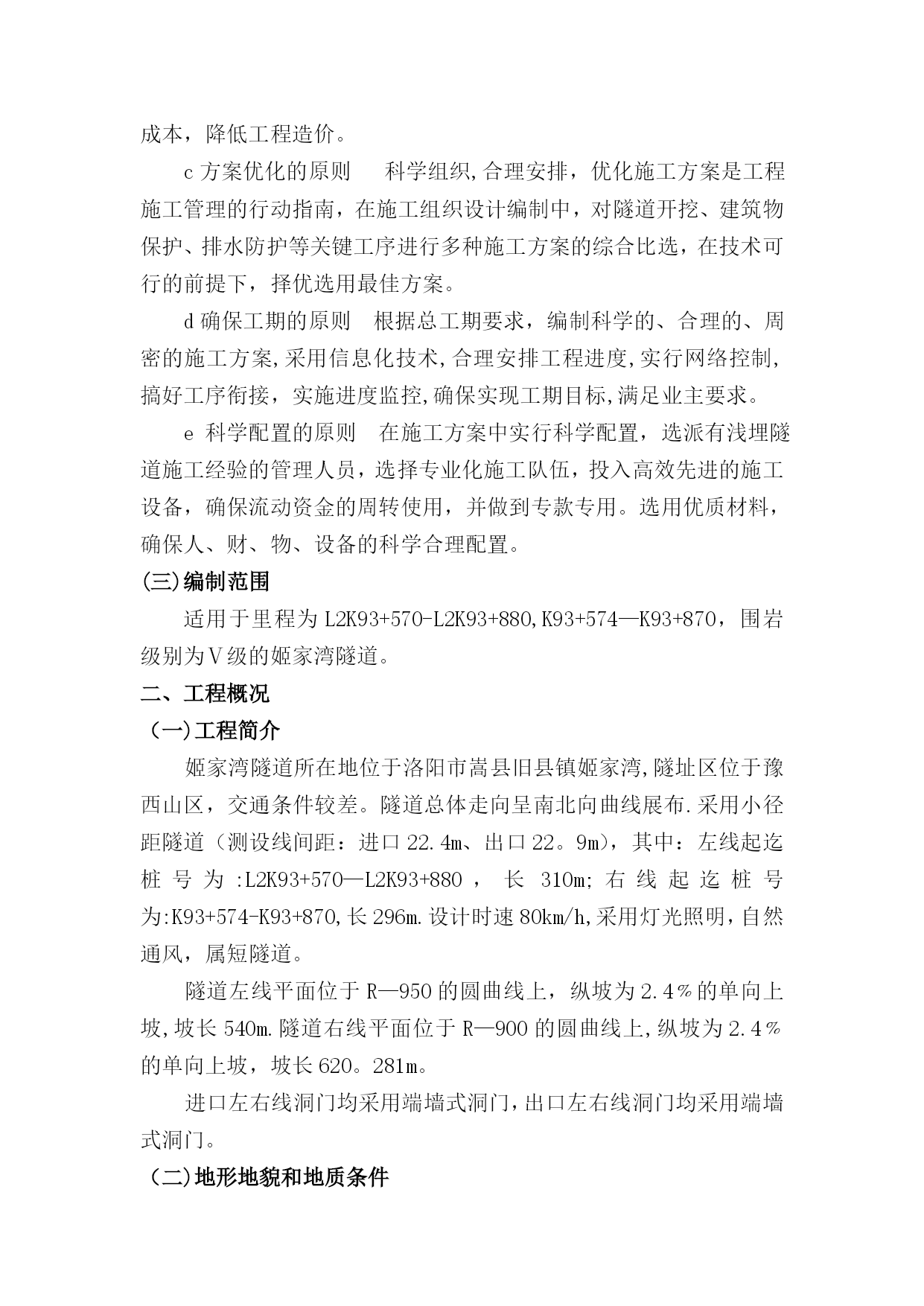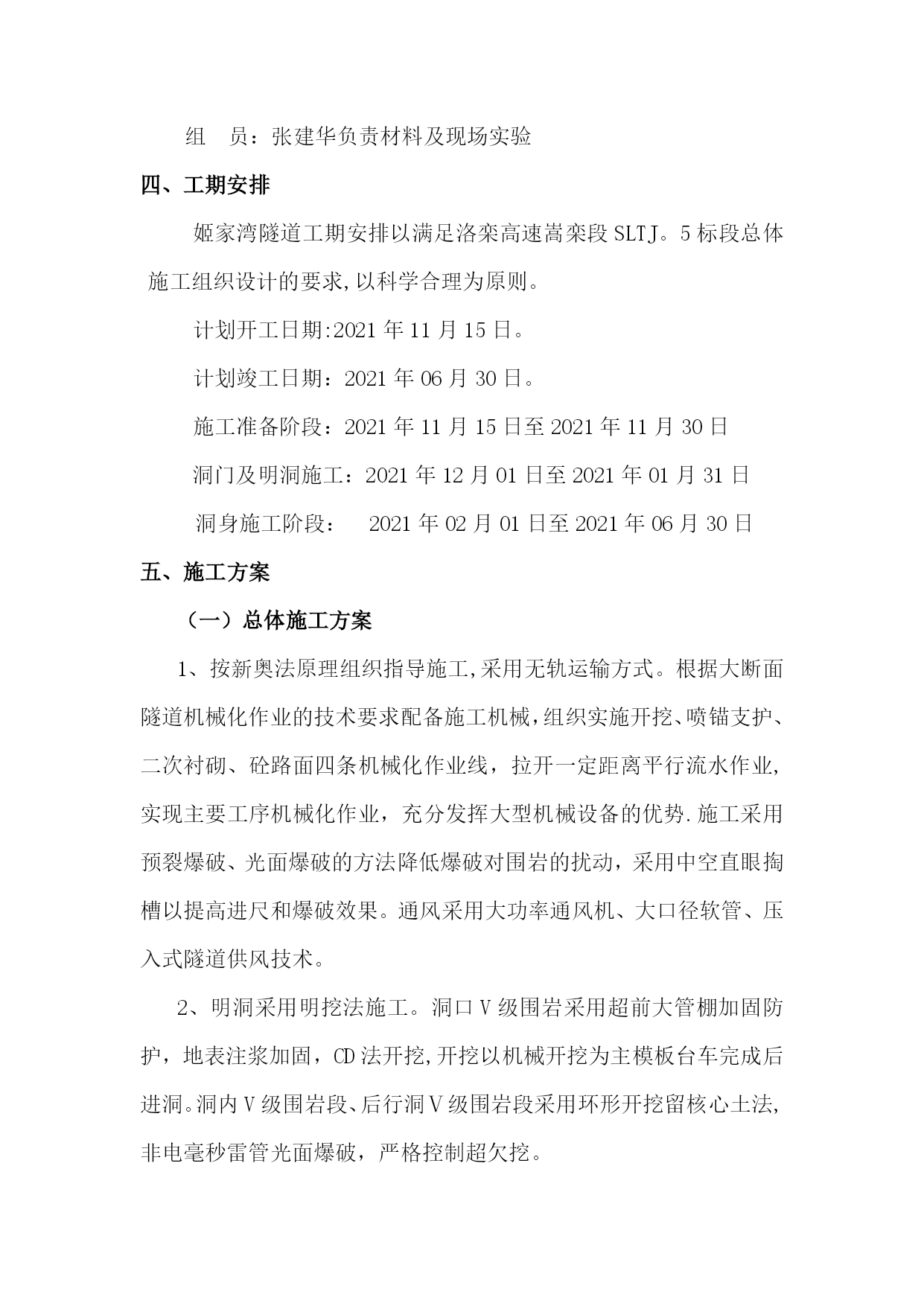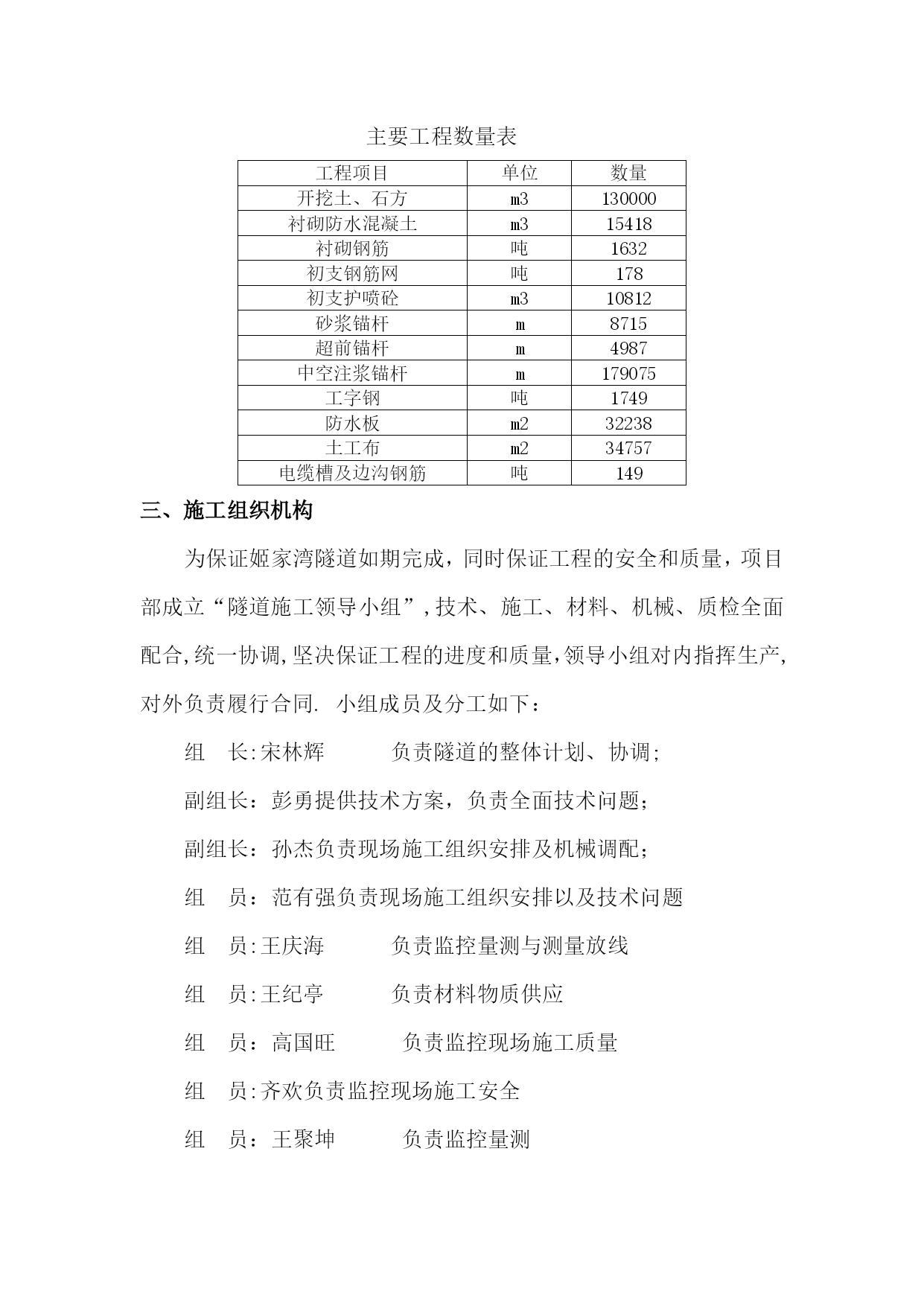 隧道施工方案54271实用文档(实用文档,可以直接使用,可编辑优秀版资料,欢迎下载)姬家湾隧道施工方案一、编制说明(一)编制依据1.洛阳至栾川高速公路嵩县至栾川段业主招标文件和施工设计图.2.根据我公司《施工技术管理细则》中关于编制实施性施工组织设计的有关要求.3.参与施工人员的技术状况、机构组成、机械设备、检测装置等安排.4.根据现场调查的有关资料(当地水文、气象、民俗、交通、材料供应、水源、场地情况).5.建设单位提供的招标图纸以及招标期间招标单位与投标单位所有来往的函件及补遗资料;我单位积累的成熟技术、科技成果、施工方法以及多年来从事同类工程的施工经验;我单位可调用到本工程的各类资料。6.采用的施工规范、标准主要有:《公路工程质量检验评定标准》(JTGF80/1—2004)《公路工程地质勘测规范》(JTJ064—98)《公路隧道施工技术规范》(JTGF60—2021)《公路隧道施工技术细则》(JTG/TF60—2021)国家其他与隧道施工相关的规范规定(二)编制原则a安全第一的原则施工方案的编制始终按照技术可靠、措施得力、确保安全的原则确定施工方案。在安全措施落实到位,确保万无一失的前提下组织施工。b优质高效原则加强领导,强化管理,优质高效.根据所明确的质量目标,贯彻执行ISO9000质量体系标准,积极推广、使用“四新"技术,确保创优规划和质量目标的实现.施工中加强标准化管理,控制成本,降低工程造价。c方案优化的原则科学组织,合理安排,优化施工方案是工程施工管理的行动指南,在施工组织设计编制中,对隧道开挖、建筑物保护、排水防护等关键工序进行多种施工方案的综合比选,在技术可行的前提下,择优选用最佳方案。d确保工期的原则根据总工期要求,编制科学的、合理的、周密的施工方案,采用信息化技术,合理安排工程进度,实行网络控制,搞好工序衔接,实施进度监控,确保实现工期目标,满足业主要求。e科学配置的原则在施工方案中实行科学配置,选派有浅埋隧道施工经验的管理人员,选择专业化施工队伍,投入高效先进的施工设备,确保流动资金的周转使用,并做到专款专用。选用优质材料,确保人、财、物、设备的科学合理配置。(三)编制范围适用于里程为L2K93+570-L2K93+880,K93+574—K93+870,围岩级别为Ⅴ级的姬家湾隧道。二、工程概况(一)工程简介姬家湾隧道所在地位于洛阳市嵩县旧县镇姬家湾,隧址区位于豫西山区,交通条件较差。隧道总体走向呈南北向曲线展布.采用小径距隧道(测设线间距:进口22.4m、出口22。9m),其中:左线起迄桩号为:L2K93+570—L2K93+880,长310m;右线起迄桩号为:K93+574-K93+870,长296m.设计时速80km/h,采用灯光照明,自然通风,属短隧道。隧道左线平面位于R—950的圆曲线上,纵坡为2.4﹪的单向上坡,坡长540m.隧道右线平面位于R—900的圆曲线上,纵坡为2.4﹪的单向上坡,坡长620。281m。进口左右线洞门均采用端墙式洞门,出口左右线洞门均采用端墙式洞门。(二)地形地貌和地质条件1、地形地貌拟建隧道区属秦岭余脉之伏牛山区,山岭纵横,层峦叠嶂,河谷交织,地形起伏大,隧道区地形起伏大,地面标高基本在490—580之间,相对高差90。0m。隧道底标高在504.560-511.480米之间。2、地质条件2。1地质构造项目区在大地构造位置上属华北地台南缘与秦岭褶皱系北侧衔接部位。本区盖层褶皱构造主要属于加里东期褶皱,分布普遍,规模较大,奠定了本区构造基本框架。地质历史上,本区经历多次构造运动,其中以北西向和北东向最为发育,区内主要断裂构造有旧县—下蛮谷断裂带、马超营断裂带、坡前街-大沟河断裂带、叫河-陶湾-后坪断裂带.2.2地层岩性隧址区地层属华北地层区,区内上覆盖层为第四系全新统的残积和坡积碎石,分布不连续主要分布在坡脚和隧道进出口等处,下伏基岩为元古界(Pt)英安岩.2.3水文地质隧道区域内主要发育有基岩裂隙水,其特点是大气降水补给,通过岩体裂隙连同受重力影响,由高处向低处汇集,当有裂隙在低地面处出露时流出岩体。2.4围岩级别隧道进出口段山体坡度较陡,坡度25°—55°,地表覆盖粉质粘土薄层,洞身轴线与岩体节理裂隙面呈60°~80°交角,隧道围岩为砾岩夹泥岩,岩体风化裂隙发育,岩体破碎.水位主要受季节性降水影响,雨季时地表水沿裂隙面流动,洞壁可能有滴水。隧道围岩等级属Ⅴ级。洞身段围岩主要为砾岩夹泥岩,块状或似层状,根据洞身埋深和风化程度,围岩定级主要为Ⅴ级.隧道围岩分级见下表:围岩级别分类表里程围岩级别左线L2K93+570—L2K93+644Ⅴ级L2K93+644-L2K93+685Ⅴ级L2