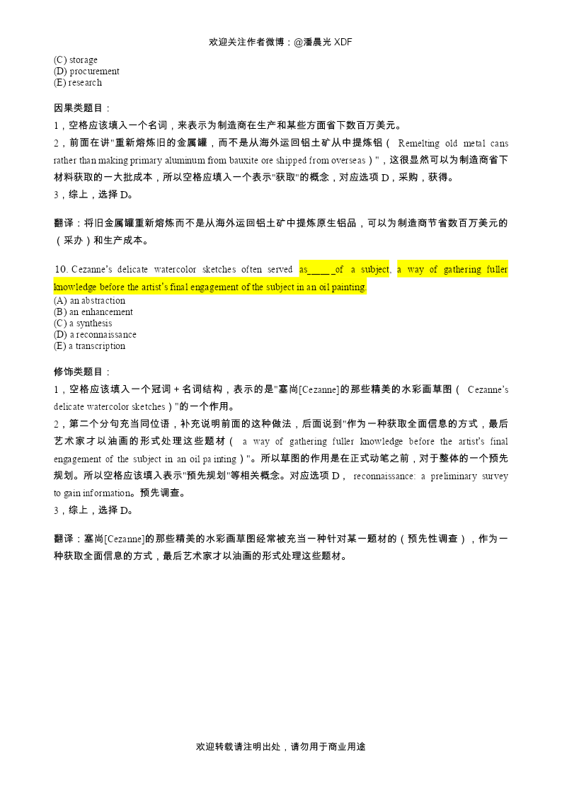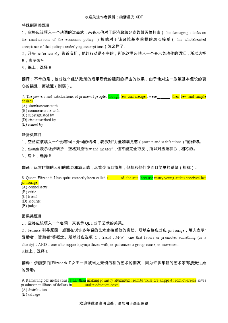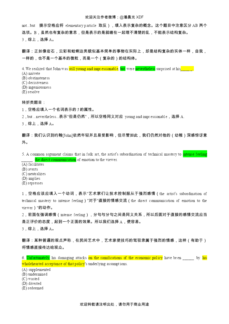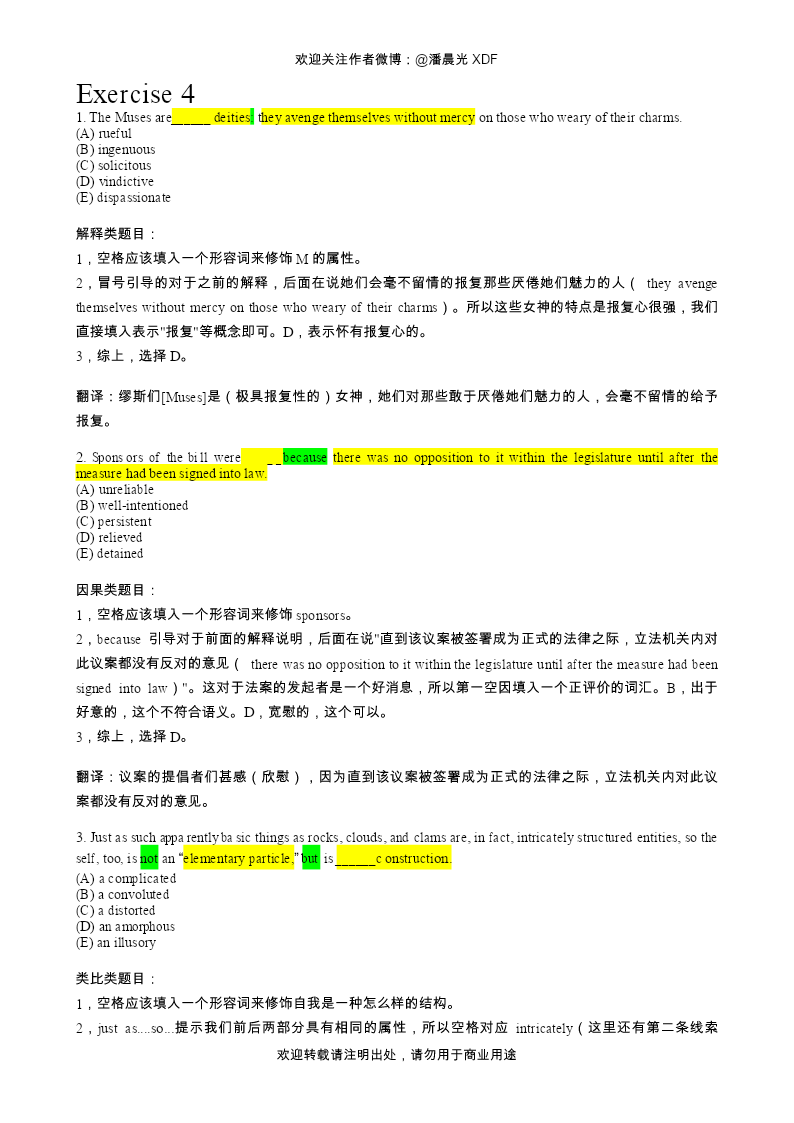 欢迎关注作者微博:@潘晨光XDF《新GRE填空教程》绿皮书完全解析V1.0—Exercise4@潘晨光XDF1.0版使用说明:1.对于每个题目,均按照“题目分类”→“分步解析”→“题干翻译"”来编辑。2.解题所采用的方法,为课堂所讲的”六步法“即:功能→概念→逻辑→语义→词汇→句意,但并不是严格按照“六步”来解析,对于简单的清晰地题目,不必多费笔墨。3.对于六步法此处不再赘述,没有参加过培训的新G考生也不必担心,“分步解析“本着清晰通俗简洁的原则,适合所有备考新G的考生。4.图例说明:蓝色,黄色部分是解题线索,或语义对应点。绿色部分是逻辑判断线索。5.复习备考中应当以绿皮书为主,先自行解题,在做完之后再对照本材料进行总结,归纳。绿皮书建议大家反复做够三遍以上,反复体会解题方法与技巧,才能在考场上快速反应。6.版本说明:该版本为第一版,简单起见特命名为V1.0,1.0版本中题干翻译采用的是郝海龙老师的译作,在此特别感谢。笔者打算在后续版本中,不断完善内容,补充更多新G原题解析。并且会及时跟随XDF教材的修订,修改解析内容。7.本材料仅供学习交流使用,版权归笔者所有,转载请注明出处,请勿用于商业用途。8.欢迎诸位读者,新G考生,以及各路同行就本材料提出改善意见。笔者的联系方式:新浪微博:@潘晨光XDF人人网:潘晨光。9.祝大家取得理想的成绩!步入理想的学府!2013.5V1.0欢迎转载请注明出处,请勿用于商业用途欢迎关注作者微博:@潘晨光XDFExercise41.TheMusesare______deities:theyavengethemselveswithoutmercyonthosewhowearyoftheircharms.(A)rueful(B)ingenuous(C)solicitous(D)vindictive(E)dispassionate解释类题目:1,空格应该填入一个形容词来修饰M的属性。2,冒号引导的对于之前的解释,后面在说她们会毫不留情的报复那些厌倦她们魅力的人(theyavengethemselveswithoutmercyonthosewhowearyoftheircharms)。所以这些女神的特点是报复心很强,我们直接填入表示"报复"等概念即可。D,表示怀有报复心的。3,综上,选择D。翻译:缪斯们[Muses]是(极具报复性的)女神,她们对那些敢于厌倦她们魅力的人,会毫不留情的给予报复。2.Sponsorsofthebillwere______becausetherewasnooppositiontoitwithinthelegislatureuntilafterthemeasurehadbeensignedintolaw.(A)unreliable(B)well-intentioned(C)persistent(D)relieved(E)detained因果类题目:1,空格应该填入一个形容词来修饰sponsors。2,because引导对于前面的解释说明,后面在说"直到该议案被签署成为正式的法律之际,立法机关内对此议案都没有反对的意见(therewasnooppositiontoitwithinthelegislatureuntilafterthemeasurehadbeensignedintolaw)"。这对于法案的发起者是一个好消息,所以第一空因填入一个正评价的词汇。B,出于好意的,这个不符合语义。D,宽慰的,这个可以。3,综上,选择D。翻译:议案的提倡者们甚感(欣慰),因为直到该议案被签署成为正式的法律之际,立法机关内对此议案都没有反对的意见。3.Justassuchapparentlybasicthingsasrocks,clouds,andclamsare,infact,intricatelystructuredentities,sotheself,too,isnotan“elementaryparticle,”butis______construction.(A)acomplicated(B)aconvoluted(C)adistorted(D)anamorphous(E)anillusory类比类题目:1,空格应该填入一个形容词来修饰自我是一种怎么样的结构。2,justas....so...提示我们前后两部分具有相同的属性,所以空格对应intricately(这里还有第二条线索欢迎转载请注明出处,请勿用于商业用途欢迎关注作者微博:@潘晨光XDFnot...but提示空格应将