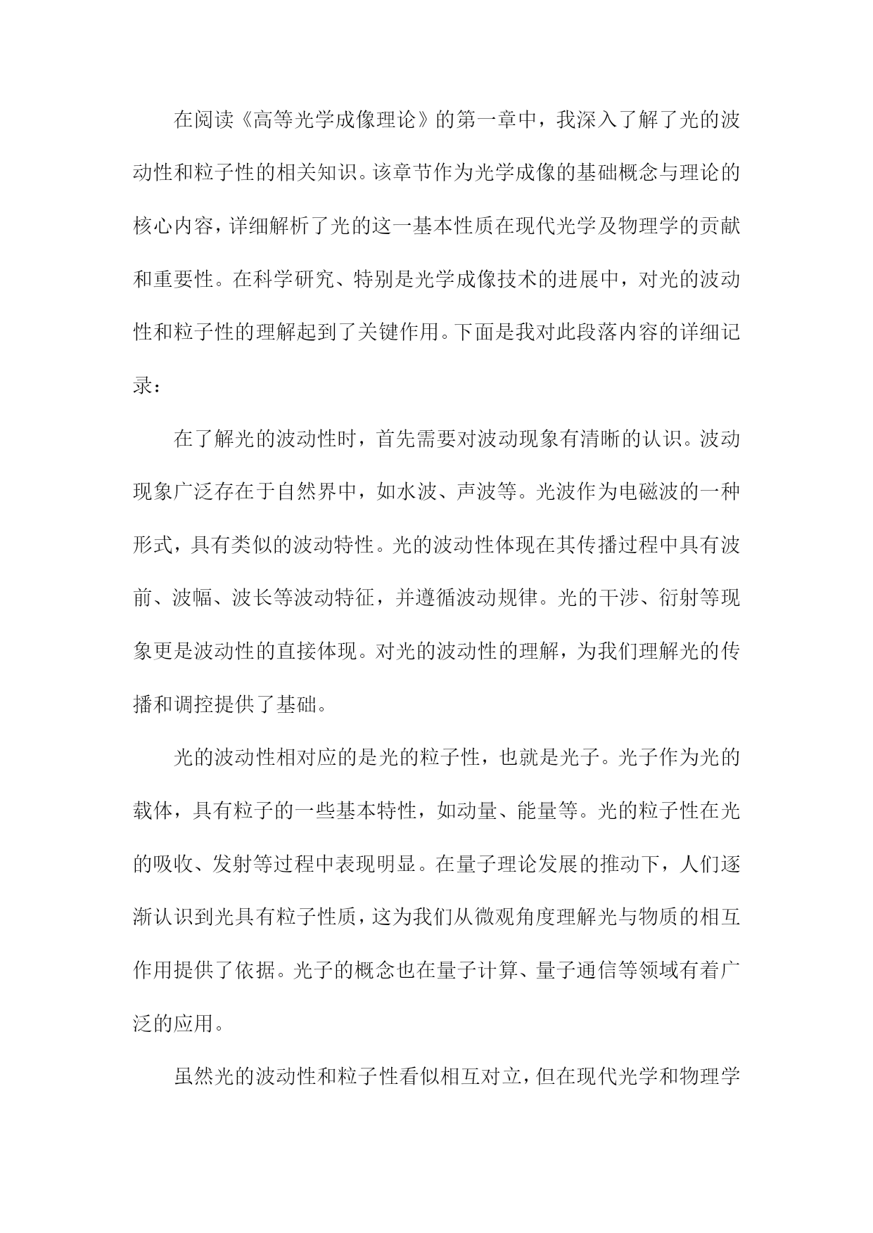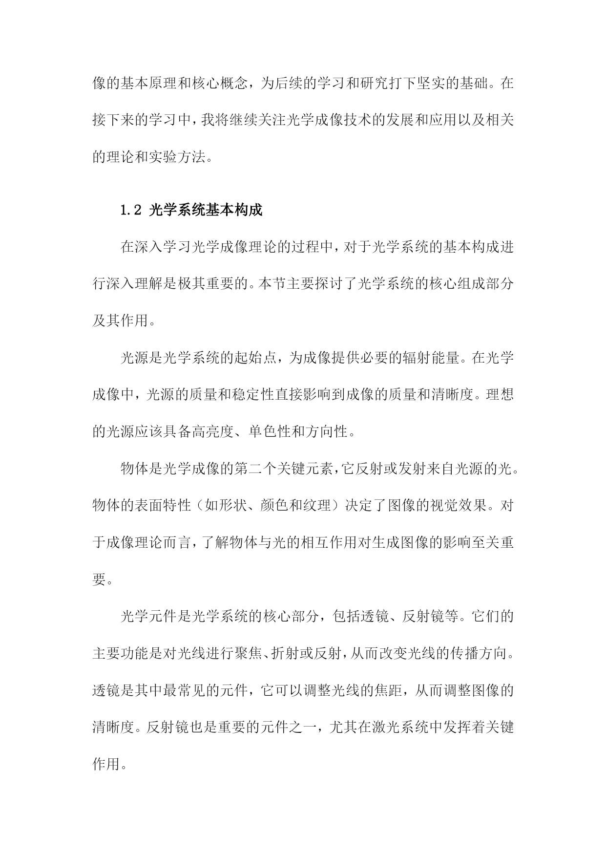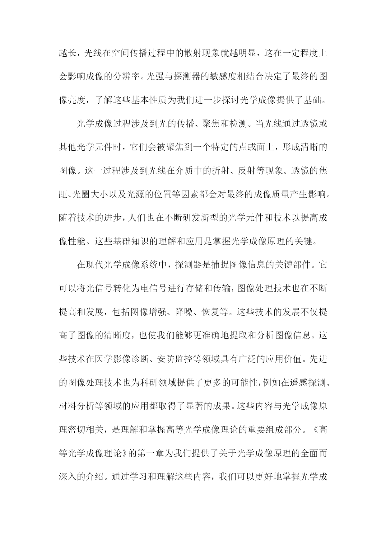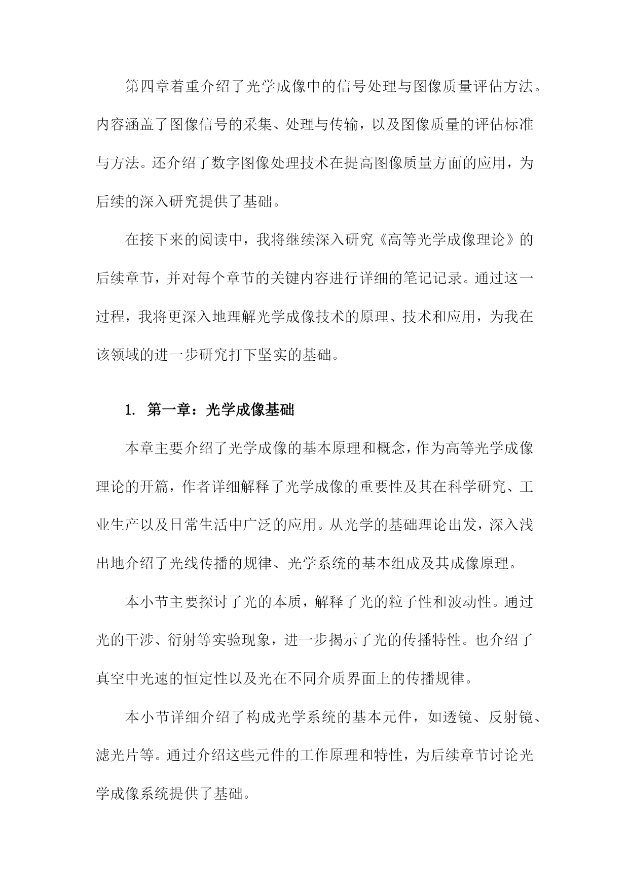 《高等光学成像理论》读书记录一、章节概览《高等光学成像理论》是一部深入剖析光学成像技术的学术著作。在阅读过程中,我对各个章节的内容进行了详细的笔记记录,并对关键概念进行了深入理解。以下是关于章节概览的部分内容:第一章主要介绍了光学成像的基本原理和基础知识,内容涵盖了光的传播、光的干涉、衍射和散射等基本物理现象,以及它们在成像过程中的应用。还介绍了光学系统的基本构成和性能参数,为后续章节打下了坚实的基础。第二章重点介绍了高等光学成像技术,包括超分辨率成像、多光子成像、结构化照明技术等。这些技术在提高光学成像的分辨率、信噪比和动态范围等方面具有显著优势,是当代光学成像领域的重要研究方向。第三章主要讨论了光学成像系统的设计与优化方法,内容涵盖了光学系统的基本设计原则、光学元件的选型与配置、系统性能的评估与优化等。还介绍了光学系统的实用设计方法,包括基于计算机辅助设计工具的设计流程,对于从事光学系统设计的工作者具有很高的实用价值。第四章着重介绍了光学成像中的信号处理与图像质量评估方法。内容涵盖了图像信号的采集、处理与传输,以及图像质量的评估标准与方法。还介绍了数字图像处理技术在提高图像质量方面的应用,为后续的深入研究提供了基础。在接下来的阅读中,我将继续深入研究《高等光学成像理论》的后续章节,并对每个章节的关键内容进行详细的笔记记录。通过这一过程,我将更深入地理解光学成像技术的原理、技术和应用,为我在该领域的进一步研究打下坚实的基础。1.第一章:光学成像基础本章主要介绍了光学成像的基本原理和概念,作为高等光学成像理论的开篇,作者详细解释了光学成像的重要性及其在科学研究、工业生产以及日常生活中广泛的应用。从光学的基础理论出发,深入浅出地介绍了光线传播的规律、光学系统的基本组成及其成像原理。本小节主要探讨了光的本质,解释了光的粒子性和波动性。通过光的干涉、衍射等实验现象,进一步揭示了光的传播特性。也介绍了真空中光速的恒定性以及光在不同介质界面上的传播规律。本小节详细介绍了构成光学系统的基本元件,如透镜、反射镜、滤光片等。通过介绍这些元件的工作原理和特性,为后续章节讨论光学成像系统提供了基础。本小节重点阐述了光学成像的基本原理,即光线通过光学系统后形成实像或虚像的过程。通过详细解释物像关系、光线追踪等方法,使读者对光学成像原理有了更深入的理解。还介绍了像质评价参数,如分辨率、对比度等,为后续的图像处理和评价打下基础。本小节根据光学成像系统的特点和应用领域,对其进行了分类。介绍了各类光学成像系统的优点和局限性,并简要阐述了其在科研、医疗、军事、工业等领域的应用。通过本章的学习,我对光学成像理论有了更深入的了解,为后续章节的学习打下了坚实的基础。在接下来的学习中,我将进一步探讨高等光学成像理论中的相关问题,如光的波动性与粒子性的统光学系统的优化设计、图像处理和评价等。1.1光学成像原理在深入阅读《高等光学成像理论》的第一章节中,我主要学习了关于光学成像的基本原理。光学成像作为一门古老的学科,在现代科技领域仍然发挥着不可替代的作用。本节内容主要介绍了光学成像的基本原理和核心概念。理解光的本质对于掌握光学成像原理至关重要,在现代物理学中,光被视为一种电磁波,具有波动性和粒子性的双重特性。它具有特定的波长、频率和能量,这些特性对于成像质量有着直接的影响。波长越长,光线在空间传播过程中的散射现象就越明显,这在一定程度上会影响成像的分辨率。光强与探测器的敏感度相结合决定了最终的图像亮度,了解这些基本性质为我们进一步探讨光学成像提供了基础。光学成像过程涉及到光的传播、聚焦和检测。当光线通过透镜或其他光学元件时,它们会被聚焦到一个特定的点或面上,形成清晰的图像。这一过程涉及到光线在介质中的折射、反射等现象。透镜的焦距、光圈大小以及光源的位置等因素都会对最终的成像质量产生影响。随着技术的进步,人们也在不断研发新型的光学元件和技术以提高成像性能。这些基础知识的理解和应用是掌握光学成像原理的关键。在现代光学成像系统中,探测器是捕捉图像信息的关键部件。它可以将光信号转化为电信号进行存储和传输,图像处理技术也在不断提高和发展,包括图像增强、降噪、恢复等。这些技术的发展不仅提高了图像的清晰度,也使我们能够更准确地提取和分析图像信息。这些技术在医学影像诊断、安防监控等领域具有广泛的应用价值。先进的图像处理技术也为科研领域提供了更多的可能性,例如在遥感探测、材料分析等领域的应用都取得了显著的成果。这些内容与光学成像原理密切相关,是理解和掌握高等光学成像理论的重要组成部分。《高等光学成像理论》的第一章为我们提供了关于光学成像原理的全面而深入的介绍。通过学习和理解这些内容,我们可以更好地掌握光学成像的基本原理和核心概念,为后续的学习和研究打