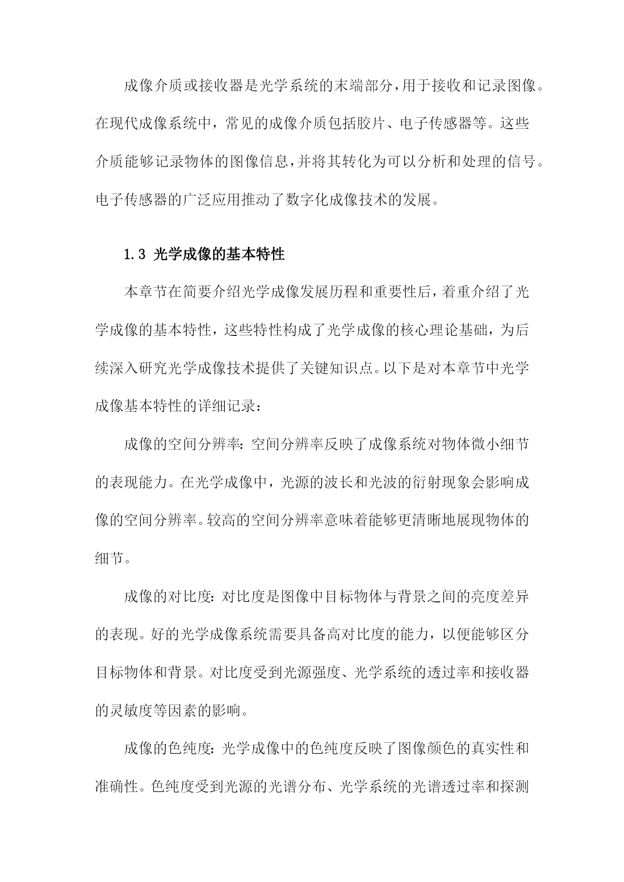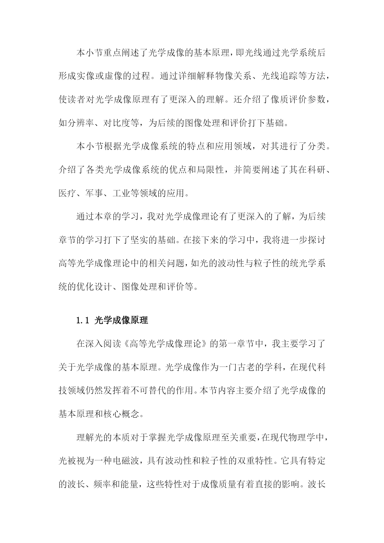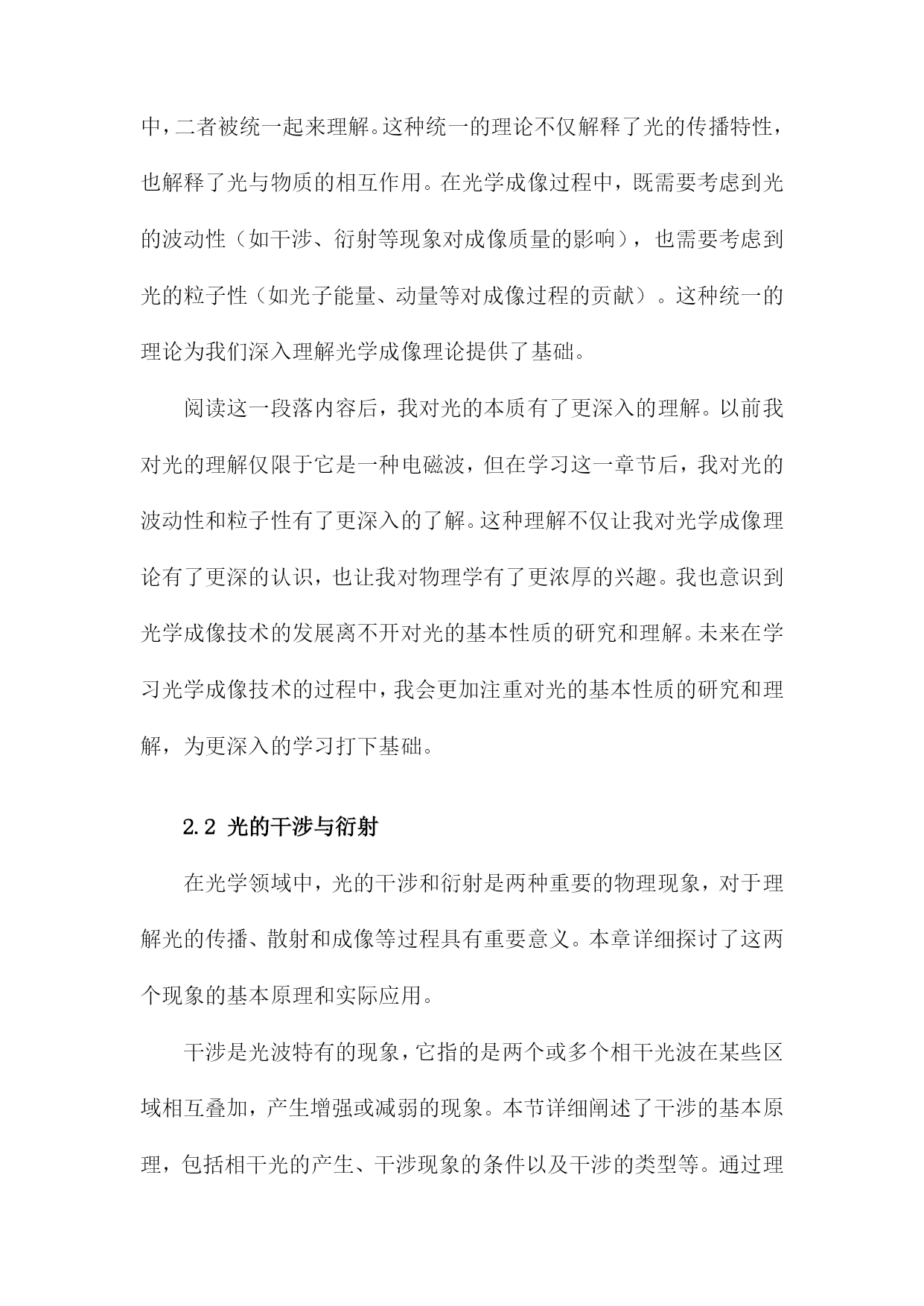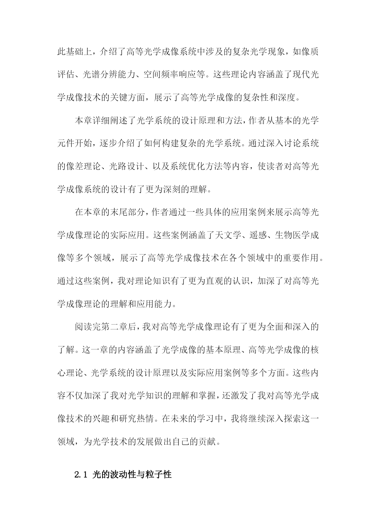 《高等光学成像理论》读书记录一、章节概览《高等光学成像理论》是一部深入剖析光学成像技术的学术著作。在阅读过程中,我对各个章节的内容进行了详细的笔记记录,并对关键概念进行了深入理解。以下是关于章节概览的部分内容:第一章主要介绍了光学成像的基本原理和基础知识,内容涵盖了光的传播、光的干涉、衍射和散射等基本物理现象,以及它们在成像过程中的应用。还介绍了光学系统的基本构成和性能参数,为后续章节打下了坚实的基础。第二章重点介绍了高等光学成像技术,包括超分辨率成像、多光子成像、结构化照明技术等。这些技术在提高光学成像的分辨率、信噪比和动态范围等方面具有显著优势,是当代光学成像领域的重要研究方向。第三章主要讨论了光学成像系统的设计与优化方法,内容涵盖了光学系统的基本设计原则、光学元件的选型与配置、系统性能的评估与优化等。还介绍了光学系统的实用设计方法,包括基于计算机辅助设计工具的设计流程,对于从事光学系统设计的工作者具有很高的实用价值。第四章着重介绍了光学成像中的信号处理与图像质量评估方法。内容涵盖了图像信号的采集、处理与传输,以及图像质量的评估标准与方法。还介绍了数字图像处理技术在提高图像质量方面的应用,为后续的深入研究提供了基础。在接下来的阅读中,我将继续深入研究《高等光学成像理论》的后续章节,并对每个章节的关键内容进行详细的笔记记录。通过这一过程,我将更深入地理解光学成像技术的原理、技术和应用,为我在该领域的进一步研究打下坚实的基础。1.第一章:光学成像基础本章主要介绍了光学成像的基本原理和概念,作为高等光学成像理论的开篇,作者详细解释了光学成像的重要性及其在科学研究、工业生产以及日常生活中广泛的应用。从光学的基础理论出发,深入浅出地介绍了光线传播的规律、光学系统的基本组成及其成像原理。本小节主要探讨了光的本质,解释了光的粒子性和波动性。通过光的干涉、衍射等实验现象,进一步揭示了光的传播特性。也介绍了真空中光速的恒定性以及光在不同介质界面上的传播规律。本小节详细介绍了构成光学系统的基本元件,如透镜、反射镜、滤光片等。通过介绍这些元件的工作原理和特性,为后续章节讨论光学成像系统提供了基础。本小节重点阐述了光学成像的基本原理,即光线通过光学系统后形成实像或虚像的过程。通过详细解释物像关系、光线追踪等方法,使读者对光学成像原理有了更深入的理解。还介绍了像质评价参数,如分辨率、对比度等,为后续的图像处理和评价打下基础。本小节根据光学成像系统的特点和应用领域,对其进行了分类。介绍了各类光学成像系统的优点和局限性,并简要阐述了其在科研、医疗、军事、工业等领域的应用。通过本章的学习,我对光学成像理论有了更深入的了解,为后续章节的学习打下了坚实的基础。在接下来的学习中,我将进一步探讨高等光学成像理论中的相关问题,如光的波动性与粒子性的统光学系统的优化设计、图像处理和评价等。1.1光学成像原理在深入阅读《高等光学成像理论》的第一章节中,我主要学习了关于光学成像的基本原理。光学成像作为一门古老的学科,在现代科技领域仍然发挥着不可替代的作用。本节内容主要介绍了光学成像的基本原理和核心概念。理解光的本质对于掌握光学成像原理至关重要,在现代物理学中,光被视为一种电磁波,具有波动性和粒子性的双重特性。它具有特定的波长、频率和能量,这些特性对于成像质量有着直接的影响。波长越长,光线在空间传播过程中的散射现象就越明显,这在一定程度上会影响成像的分辨率。光强与探测器的敏感度相结合决定了最终的图像亮度,了解这些基本性质为我们进一步探讨光学成像提供了基础。光学成像过程涉及到光的传播、聚焦和检测。当光线通过透镜或其他光学元件时,它们会被聚焦到一个特定的点或面上,形成清晰的图像。这一过程涉及到光线在介质中的折射、反射等现象。透镜的焦距、光圈大小以及光源的位置等因素都会对最终的成像质量产生影响。随着技术的进步,人们也在不断研发新型的光学元件和技术以提高成像性能。这些基础知识的理解和应用是掌握光学成像原理的关键。在现代光学成像系统中,探测器是捕捉图像信息的关键部件。它可以将光信号转化为电信号进行存储和传输,图像处理技术也在不断提高和发展,包括图像增强、降噪、恢复等。这些技术的发展不仅提高了图像的清晰度,也使我们能够更准确地提取和分析图像信息。这些技术在医学影像诊断、安防监控等领域具有广泛的应用价值。先进的图像处理技术也为科研领域提供了更多的可能性,例如在遥感探测、材料分析等领域的应用都取得了显著的成果。这些内容与光学成像原理密切相关,是理解和掌握高等光学成像理论的重要组成部分。《高等光学成像理论》的第一章为我们提供了关于光学成像原理的全面而深入的介绍。通过学习和理解这些内容,我们可以更好地掌握光学成像的基本原理和核心概念,为后续的学习和研究打