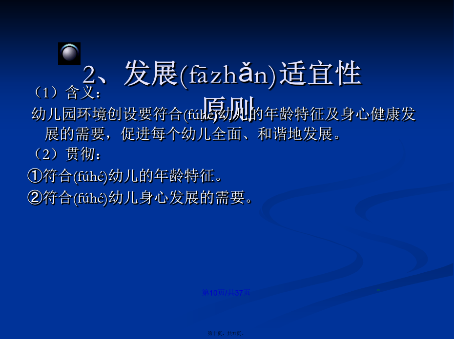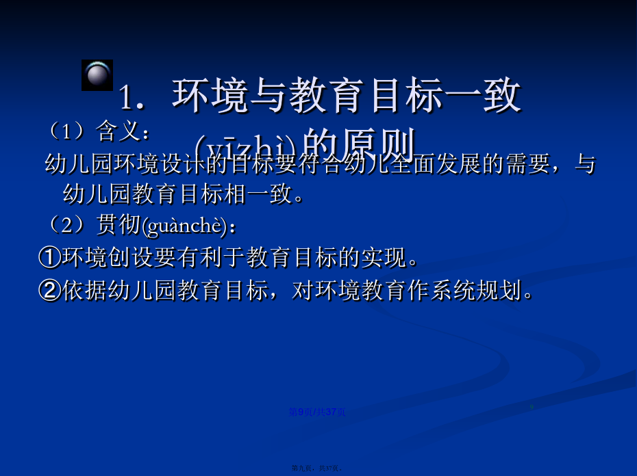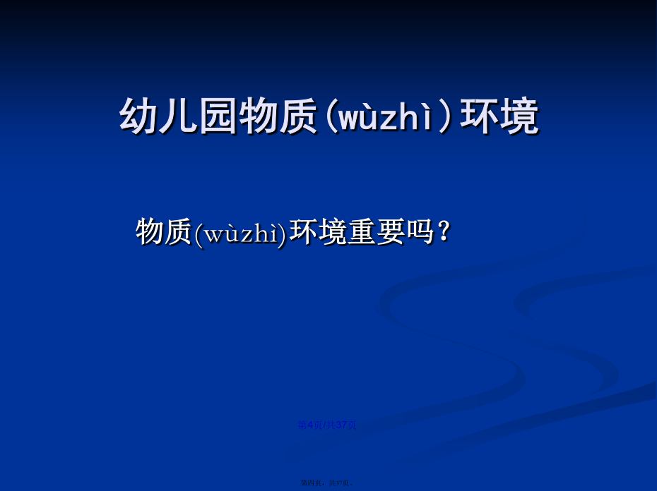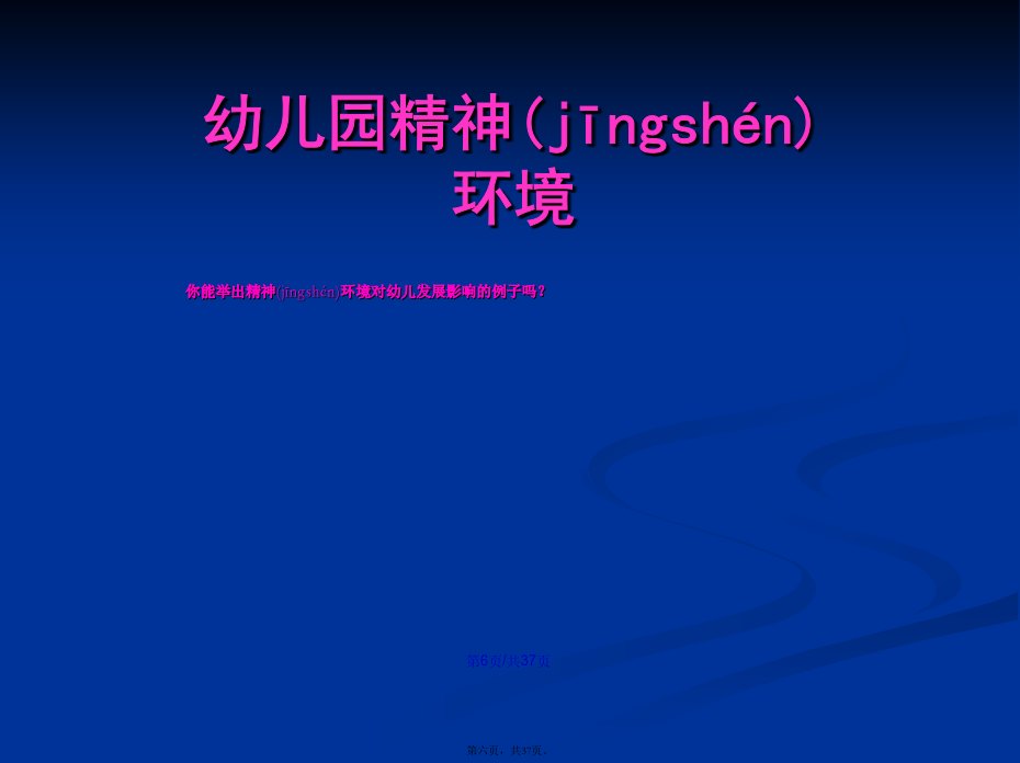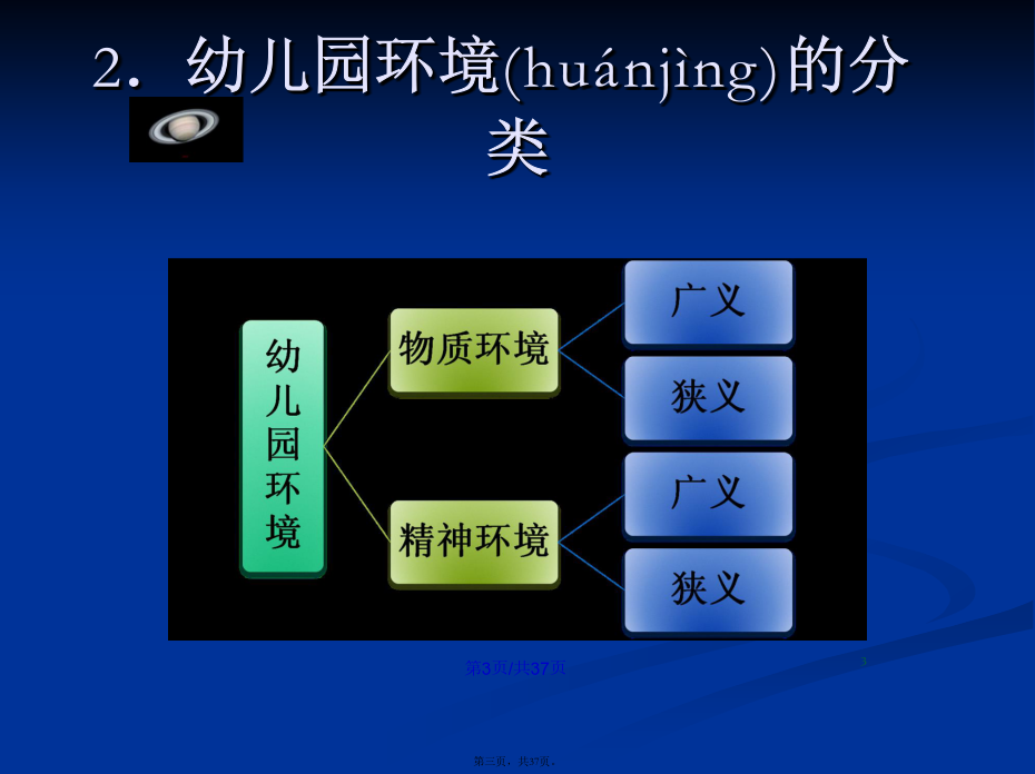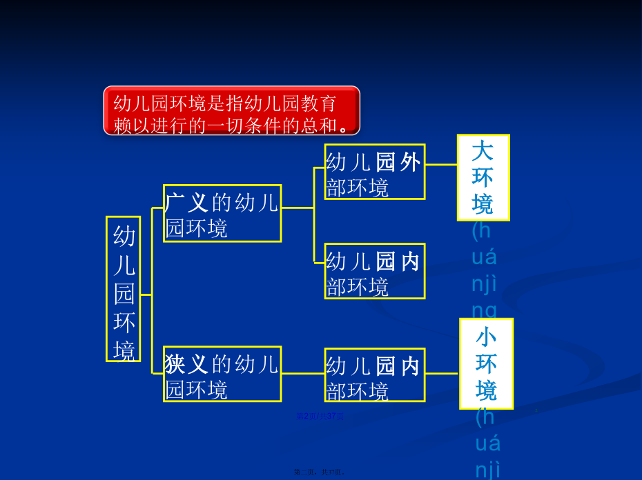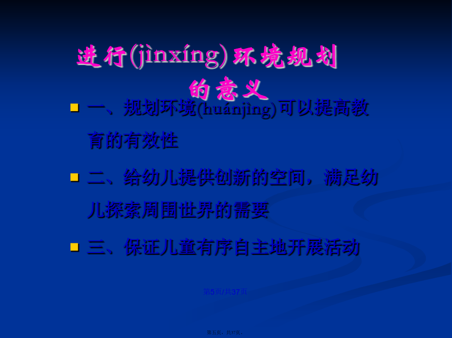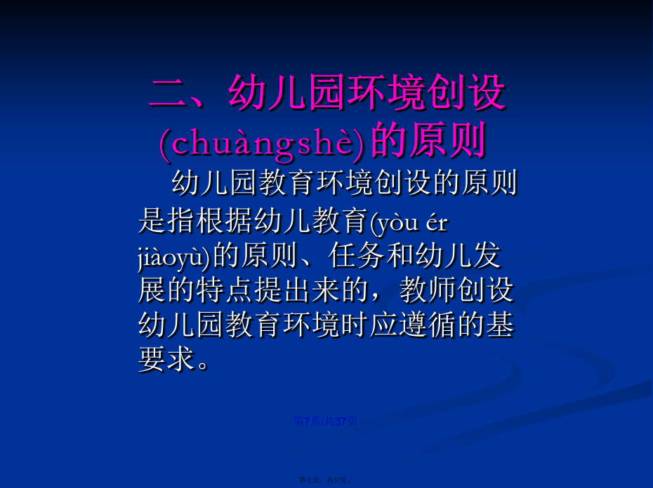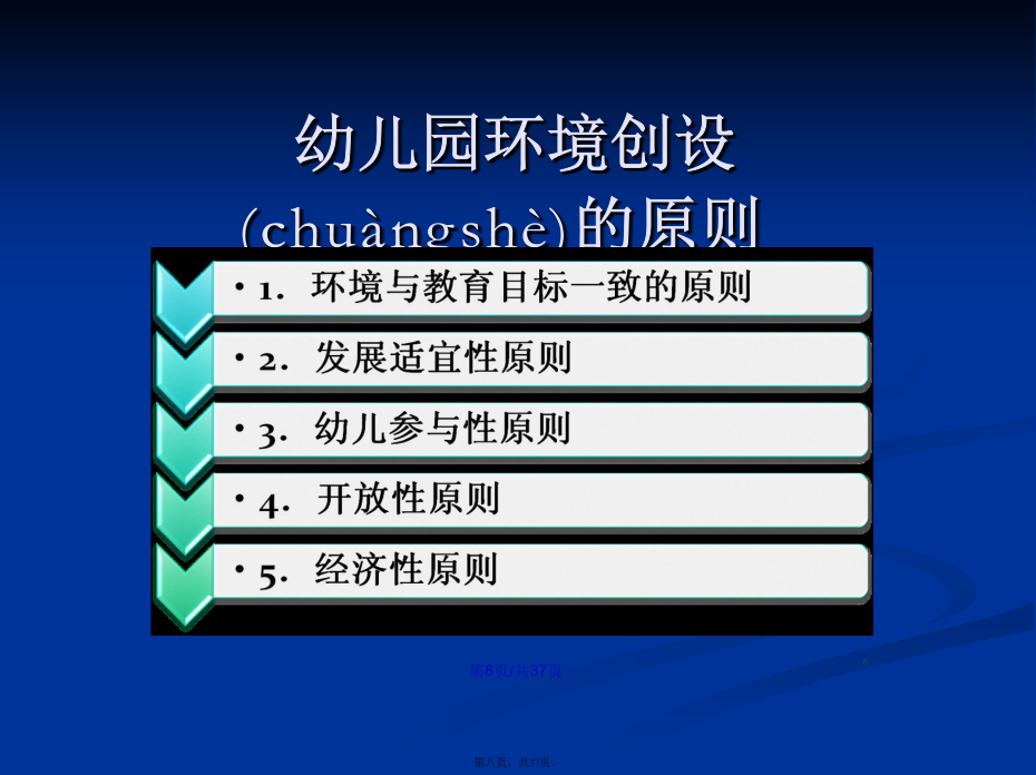 会计学22.幼儿园环境(huánjìng)的分类幼儿园物质(wùzhì)环境进行(jìnxíng)环境规划的意义幼儿园精神(jīngshén)环境二、幼儿园环境创设(chuàngshè)的原则幼儿园环境创设(chuàngshè)的原则1.环境与教育目标一致(yīzhì)的原则2、发展(fāzhǎn)适宜性原则11总结(zǒngjié)3、幼儿(yòuér)参与性原则4、开放性原则(yuánzé)某教师为了使幼儿(yòuér)不出安全事故,总是限制幼儿(yòuér)活动,尤其是少让幼儿(yòuér)户外活动,你认为该教师的做法是否正确?为什么?总结(zǒngjié)5、经济性原则(yuánzé)总结(zǒngjié)(四)创设(chuàngshè)幼儿园环境应注意的问题1.保障(bǎozhàng)幼儿的安全与健康(3)实施:①物质环境的安全:如园址的选择要考虑环境是否有污染;电线(diànxiàn)、开关和插座、消毒液、外用药液应放在幼儿手不可及的地方;防护装置是否符合要求等。②心理环境的安全:使幼儿产生心理安全感。如良好的师幼关系、同伴关系以及合理的生活制度与要求等。2.注重精神(jīngshén)环境的创设293031323.发挥(fāhuī)教师在幼儿园环境创设中的重要作用四、环境创设中教师(jiàoshī)的作用谢谢(xièxie)大家!感谢您的观看(guānkàn)!