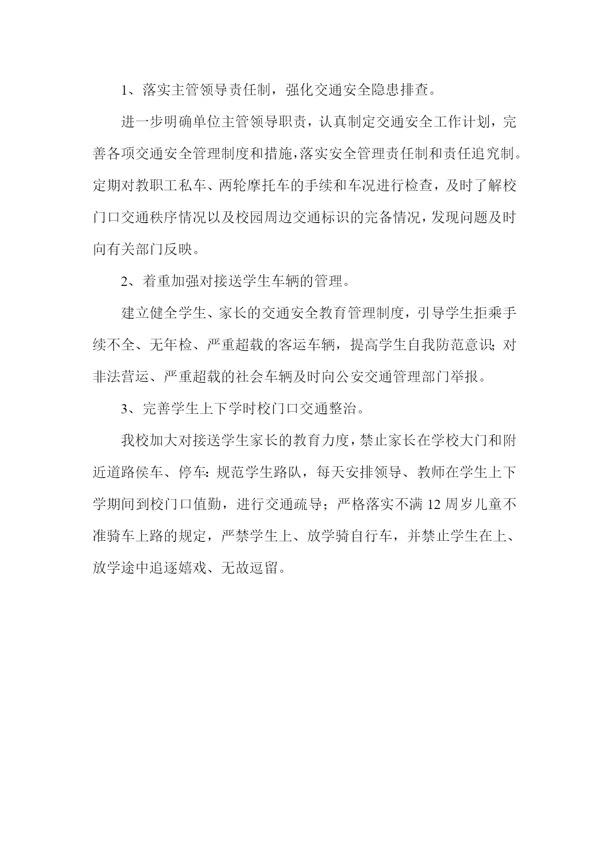 新堡子小学2011-2012学年交通安全工作计划一、指导思想:以党的十七届四中全会精神为指导,以提高广大教职员工和学生的交通安全意识为目标;在上级有关部门的指导下,认真贯彻相关文件精神,狠抓宣传教育,提高教职员工和学生的交通安全意识;狠抓常规,促进交通安全工作日常管理。全面落实交通安全防范责任制,有效控制交通安全责任事故发生,切实保护师生和学校财产安全,为创建平安校园打下坚实的基础。二、工作思路:我校领导要高度重视交通安全工作,建立健全相关组织,明确各部门职责,完善制定出各类制度,并且建立专项档案。(一)抓好两个交通安全宣传阵地建设,营造良好宣传氛围。1、充分利用橱窗、黑板报等资源,对师生进行交通法规知识的宣传,提高师生的交通安全防范意识和能力。学校指派专人负责,定期更换内容并存档备案。2、广泛开展主题班队会、专题讲座、国旗下讲话、校本课程等形式多样的“交通安全教育课”,每学期至少两节次,由各班主任主讲,内容符合各年龄段学生的生理特点和接受能力。我校还通过召开家长会,举办家教讲座、等形式向家长宣传交通安全知识。(二)切实加强三项交通安全日常管理,落实上级会议精神1、落实主管领导责任制,强化交通安全隐患排查。进一步明确单位主管领导职责,认真制定交通安全工作计划,完善各项交通安全管理制度和措施,落实安全管理责任制和责任追究制。定期对教职工私车、两轮摩托车的手续和车况进行检查,及时了解校门口交通秩序情况以及校园周边交通标识的完备情况,发现问题及时向有关部门反映。2、着重加强对接送学生车辆的管理。建立健全学生、家长的交通安全教育管理制度,引导学生拒乘手续不全、无年检、严重超载的客运车辆,提高学生自我防范意识;对非法营运、严重超载的社会车辆及时向公安交通管理部门举报。3、完善学生上下学时校门口交通整治。我校加大对接送学生家长的教育力度,禁止家长在学校大门和附近道路侯车、停车:规范学生路队,每天安排领导、教师在学生上下学期间到校门口值勤,进行交通疏导;严格落实不满12周岁儿童不准骑车上路的规定,严禁学生上、放学骑自行车,并禁止学生在上、放学途中追逐嬉戏、无故逗留。新堡子小学交通安全工作计划二〇一一年九月
