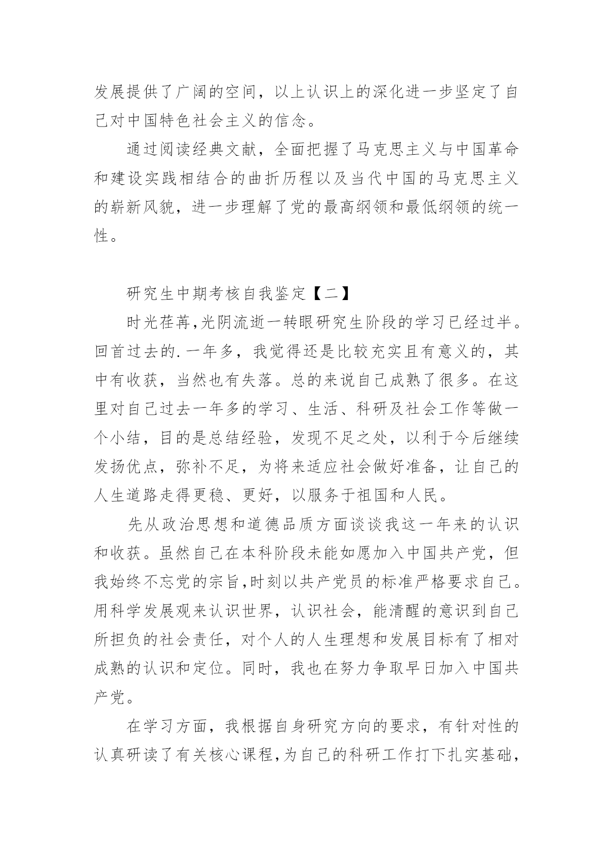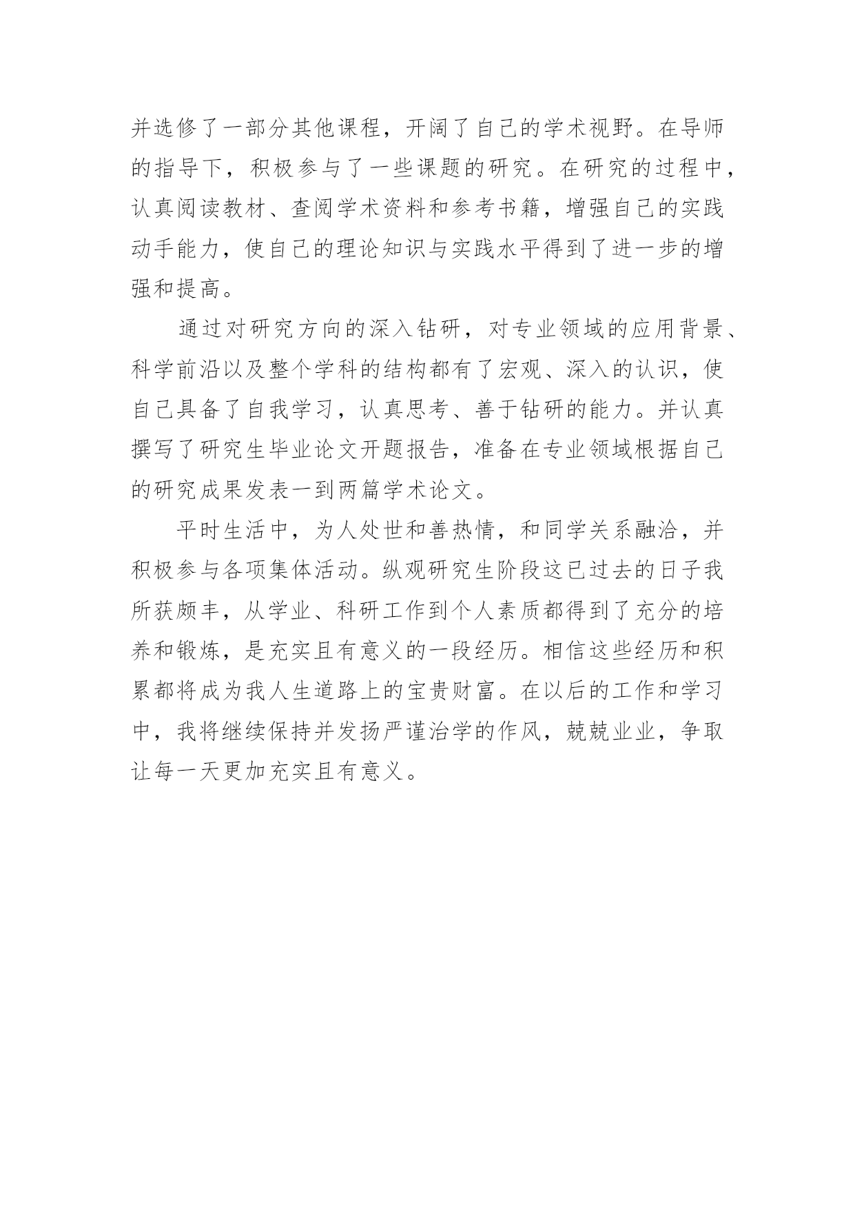 研究生中期考核自我鉴定研究生中期考核自我鉴定汇编导语:自我鉴定是个人在一个时期、一个年度、一个阶段对自己的学习和工作生活等表现的一个自我总结,具有评语和结论性质。以下是小编带来的研究生中期考核自我鉴定,欢迎各位参阅。研究生中期考核自我鉴定【一】本人林,男,xx年xx月xx日生,xx年9月进入xx学院xx部研究生队部队政治工作学专业学习,入学前任xx省xx市xx消防大队xx职务。入学以来,本人在有关领导、导师的关心、帮助及指导下认真完成各项课业任务,努力提高各种素质和能力,不断实现由部队在职干部向一名合格军校研究生的转变。研究生中期考核工作临近,为总结成绩、克服不足,现按首席导师要求,特从以下六个方面作个人自我评定如下:思想政治和纪律作风方面入学前虽然也学习过一些马克思主义理论,但未能从总体上进行把握,理解得亦不够深刻。入学后,通过参与“马克思主义哲学创新”课程的研究和讨论,深刻认识到马克思主义是一个开放的科学体系,她具有与时俱进的理论品质,这为马克思主义理论的不断丰富、发展提供了广阔的空间,以上认识上的深化进一步坚定了自己对中国特色社会主义的信念。通过阅读经典文献,全面把握了马克思主义与中国革命和建设实践相结合的曲折历程以及当代中国的马克思主义的崭新风貌,进一步理解了党的最高纲领和最低纲领的统一性。研究生中期考核自我鉴定【二】时光荏苒,光阴流逝一转眼研究生阶段的学习已经过半。回首过去的.一年多,我觉得还是比较充实且有意义的,其中有收获,当然也有失落。总的来说自己成熟了很多。在这里对自己过去一年多的学习、生活、科研及社会工作等做一个小结,目的是总结经验,发现不足之处,以利于今后继续发扬优点,弥补不足,为将来适应社会做好准备,让自己的人生道路走得更稳、更好,以服务于祖国和人民。先从政治思想和道德品质方面谈谈我这一年来的认识和收获。虽然自己在本科阶段未能如愿加入中国共产党,但我始终不忘党的宗旨,时刻以共产党员的标准严格要求自己。用科学发展观来认识世界,认识社会,能清醒的意识到自己所担负的社会责任,对个人的人生理想和发展目标有了相对成熟的认识和定位。同时,我也在努力争取早日加入中国共产党。在学习方面,我根据自身研究方向的要求,有针对性的认真研读了有关核心课程,为自己的科研工作打下扎实基础,并选修了一部分其他课程,开阔了自己的学术视野。在导师的指导下,积极参与了一些课题的研究。在研究的过程中,认真阅读教材、查阅学术资料和参考书籍,增强自己的实践动手能力,使自己的理论知识与实践水平得到了进一步的增强和提高。通过对研究方向的深入钻研,对专业领域的应用背景、科学前沿以及整个学科的结构都有了宏观、深入的认识,使自己具备了自我学习,认真思考、善于钻研的能力。并认真撰写了研究生毕业论文开题报告,准备在专业领域根据自己的研究成果发表一到两篇学术论文。平时生活中,为人处世和善热情,和同学关系融洽,并积极参与各项集体活动。纵观研究生阶段这已过去的日子我所获颇丰,从学业、科研工作到个人素质都得到了充分的培养和锻炼,是充实且有意义的一段经历。相信这些经历和积累都将成为我人生道路上的宝贵财富。在以后的工作和学习中,我将继续保持并发扬严谨治学的作风,兢兢业业,争取让每一天更加充实且有意义。
