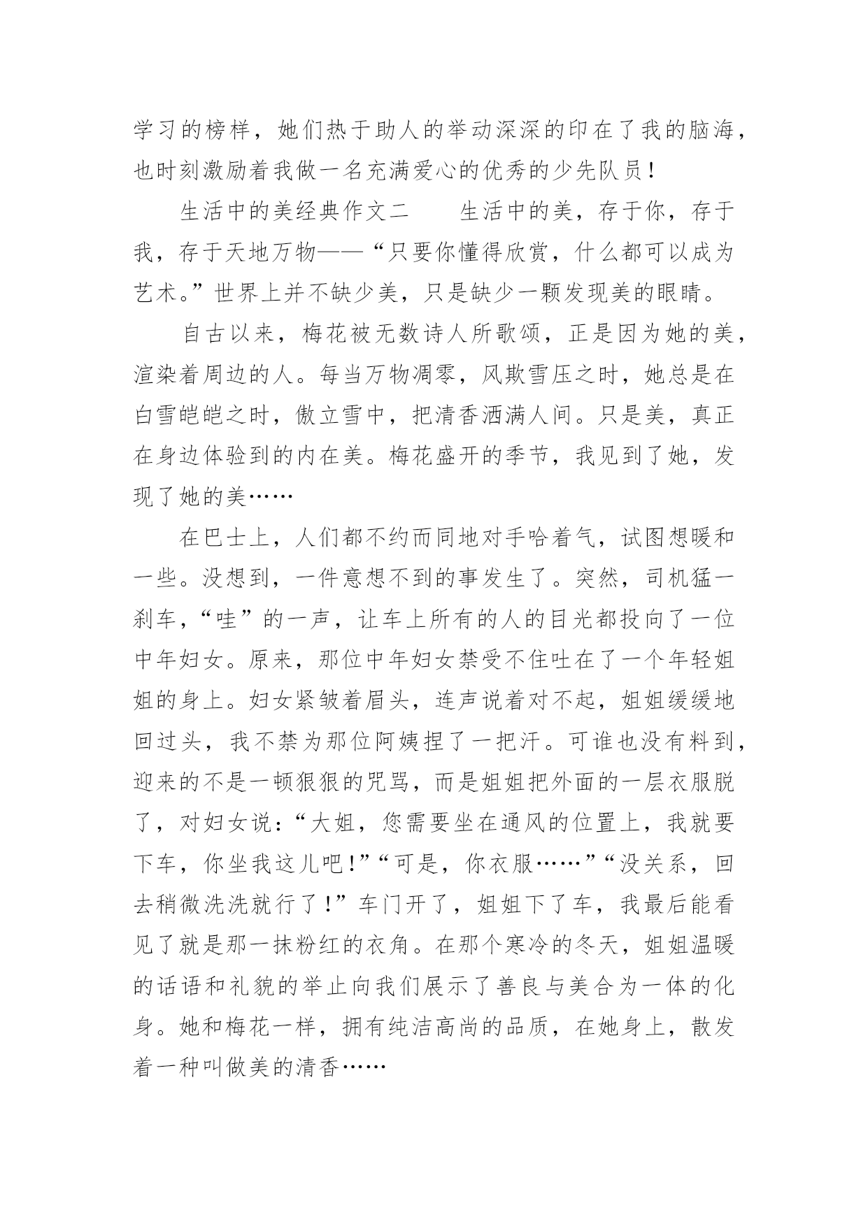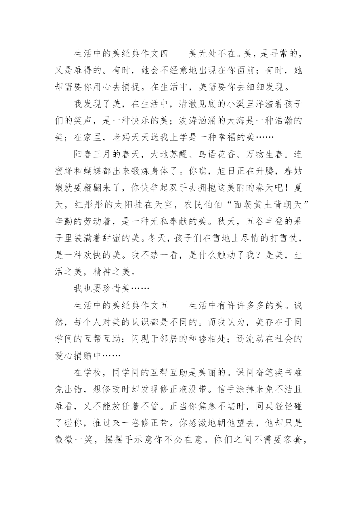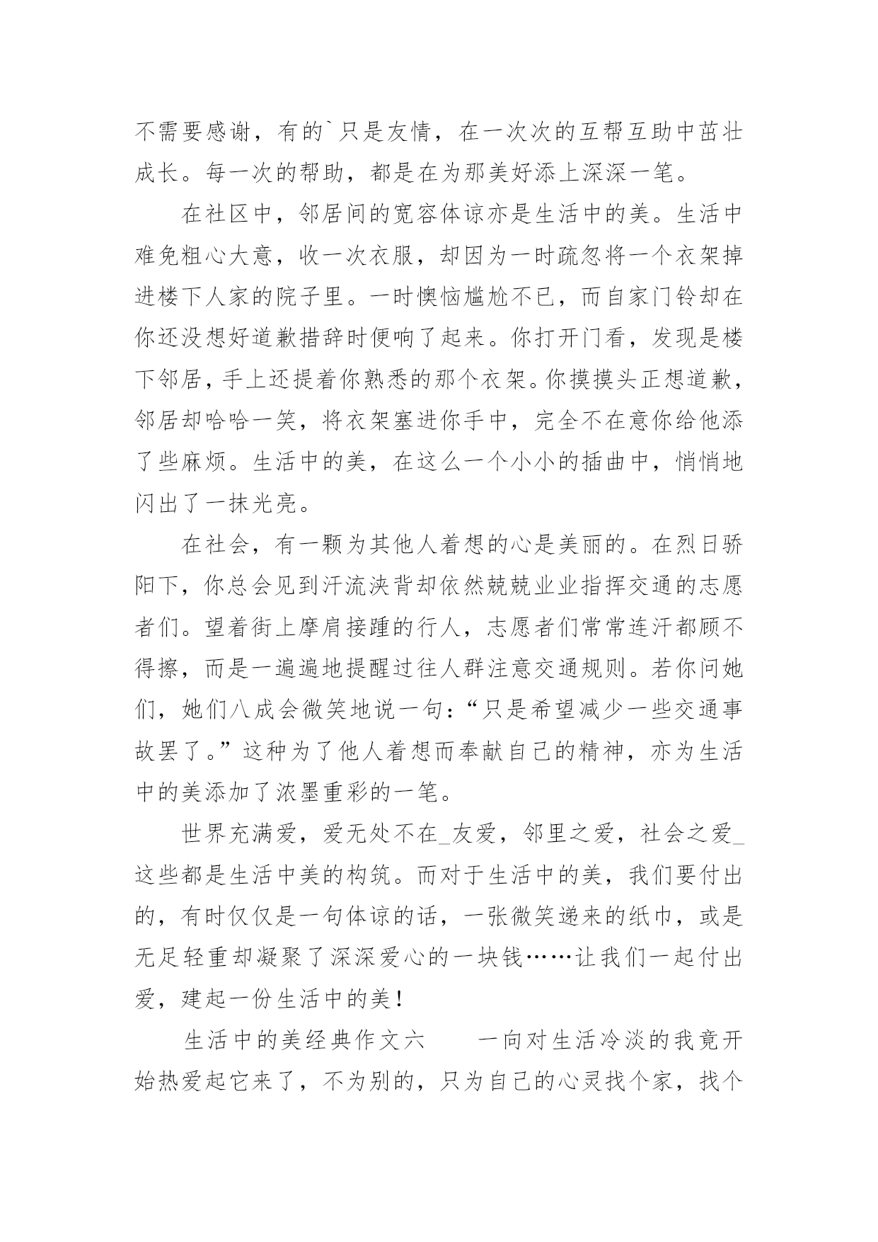 生活中的美经典作文生活中的美经典作文生活是美丽的,也是需要我们去发现的。下面是小编为大家整理的关于生活中的美的经典作文,欢迎大家的阅读。生活中的美经典作文一生活中处处都有美,有些是风景美,而更多的是人们的心灵美,就看你有没有一双发现美的眼睛。一天,我与老妈在公交车上看到这样一幕。在大马路上,两位骑电动车的阿姨不小心撞到了一块,人应该是不碍事,但两辆车的车把扭在了一起,怎么也没弄开,挡住了半条马路。我们所坐的公交车正好路过此地,我看到:两位阿姨正在费力的向两边拉车把,由于用力过多脸都憋的通红了,但两辆车的车把就好像紧紧的咬合在了一起一样,还是纹丝不动,一时两位阿姨都急的手足无措,不知该怎么办了。这时有很多车辆都从她们旁边绕开走了,还有些骑车的人把车子靠在马路边上,两腿撑地在看热闹,却没有人上前帮忙。司机师傅看到挡在马路上的两辆扭在一起的电动车,还有费劲力气也拉不开的两位阿姨,就果断的把公交车停下,走上前去帮忙。这时一位过路的骑自行车的叔叔也连忙放好车子上前帮忙去了,两位叔叔齐心协力,共同帮助阿姨把车子拉开,然后把车子推到人行道上,看到没有大碍了,司机师傅才上车开车,继续赶路。虽然这只是件小事,但司机师傅和陌生的叔叔却是我们学习的榜样,她们热于助人的举动深深的印在了我的脑海,也时刻激励着我做一名充满爱心的优秀的少先队员!生活中的美经典作文二生活中的美,存于你,存于我,存于天地万物——“只要你懂得欣赏,什么都可以成为艺术。”世界上并不缺少美,只是缺少一颗发现美的眼睛。自古以来,梅花被无数诗人所歌颂,正是因为她的美,渲染着周边的人。每当万物凋零,风欺雪压之时,她总是在白雪皑皑之时,傲立雪中,把清香洒满人间。只是美,真正在身边体验到的内在美。梅花盛开的季节,我见到了她,发现了她的美……在巴士上,人们都不约而同地对手哈着气,试图想暖和一些。没想到,一件意想不到的事发生了。突然,司机猛一刹车,“哇”的一声,让车上所有的人的目光都投向了一位中年妇女。原来,那位中年妇女禁受不住吐在了一个年轻姐姐的身上。妇女紧皱着眉头,连声说着对不起,姐姐缓缓地回过头,我不禁为那位阿姨捏了一把汗。可谁也没有料到,迎来的不是一顿狠狠的咒骂,而是姐姐把外面的一层衣服脱了,对妇女说:“大姐,您需要坐在通风的位置上,我就要下车,你坐我这儿吧!”“可是,你衣服……”“没关系,回去稍微洗洗就行了!”车门开了,姐姐下了车,我最后能看见了就是那一抹粉红的衣角。在那个寒冷的冬天,姐姐温暖的话语和礼貌的举止向我们展示了善良与美合为一体的化身。她和梅花一样,拥有纯洁高尚的品质,在她身上,散发着一种叫做美的清香……家里面井然有序,窗明几净,这是整洁的美;端庄秀丽,静谧可人,这是沉静的美;落落大方,清新自然,这是自信的美;平和洒脱,超然脱俗,这是闲适的美;粗旷豪放,不拘小节,这是大气的美。美的极致,便是安详。美是一种毫无烦忧的愉悦,用一种欣赏美的眼光去观赏世界,你会发现到处都有美的印痕。为心灵开一扇窗,让智慧的光芒和生活中炫目多彩的美呈现在你眼前。生活中的美经典作文三美,在生活中常有,但总有人说身边没有美。我很纳闷,生活中明明就有很多美。每天都站岗的警察。她们不畏惧风吹雨打,只有一个信念:为人服务。夏天,不论有多么热,她们仍然坚持着,不让小偷得逞;秋天,她们不怕秋风扫落叶,叶落在她们的头上,她们仍在帮助看不见路的老人指引正确的道路;冬天,她们一点也不惧怕北风“呼呼”地吹,还阻止着一次次交通事故的发生。这,就是一种美,一种人的心灵美。美术家们创造出一幅幅美妙的图画。她们有的在纸上创造;有的在麦田上创造;还有的,在冰上创造!但不论怎样,这一幅幅画作都是优美的。这难道不是一种美吗?景物也有美。绿色的小草衬着鲜红的花,衬着蓝蓝的天空。在阳光的照射下,水面波光粼粼,再加上山间的绿树红花,水边绿草茵茵,构成了一幅美丽的自然风景画!这更是一种独特又迷人的景物美。听了我的这么多解说,难道你还认为生活中根本没有美吗。生活中的美经典作文四美无处不在。美,是寻常的,又是难得的。有时,她会不经意地出现在你面前;有时,她却需要你用心去捕捉。在生活中,美需要你去细细发现。我发现了美,在生活中,清澈见底的小溪里洋溢着孩子们的笑声,是一种快乐的美;波涛汹涌的大海是一种浩瀚的美;在家里,老妈天天送我上学是一种幸福的美……阳春三月的春天,大地苏醒、鸟语花香、万物生春。连蜜蜂和蝴蝶都出来锻炼身体了。你瞧,旭日正在升腾,春姑娘就要翩翩来了,你快举起双手去拥抱这美丽的春天吧!夏天,红彤彤的太阳挂在天空,农民伯伯“面朝黄土背朝天”辛勤的劳动着,是一种无私奉献的美。秋天,五谷丰登的果子里装满着甜蜜的美。冬天,孩子们在雪地上尽情的打雪仗,是一种欢快的美。我不禁一看,是什么触动了我?是美,生活之美,精神之美。我也要珍惜美……生活中的