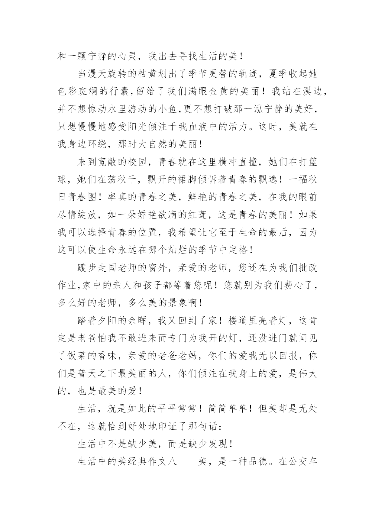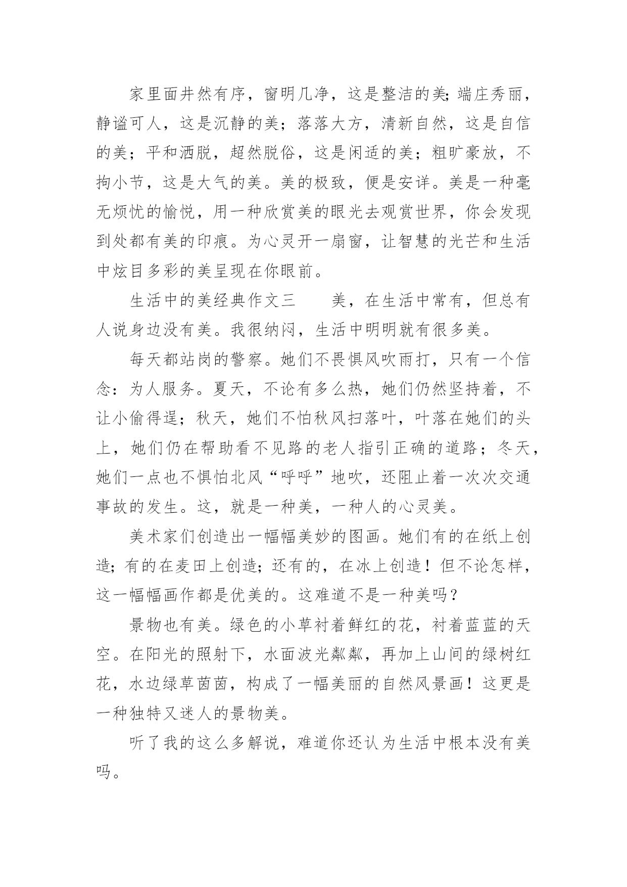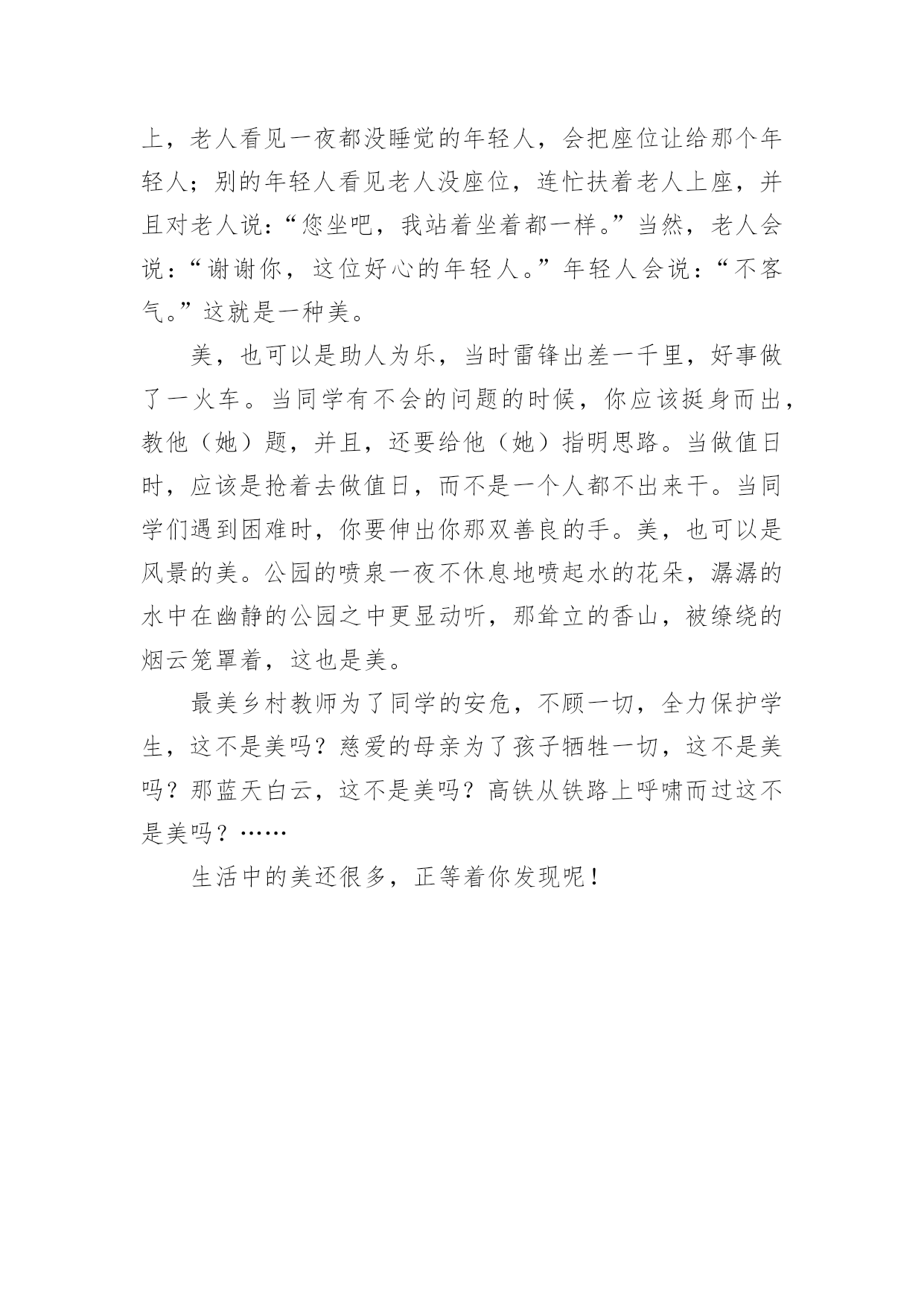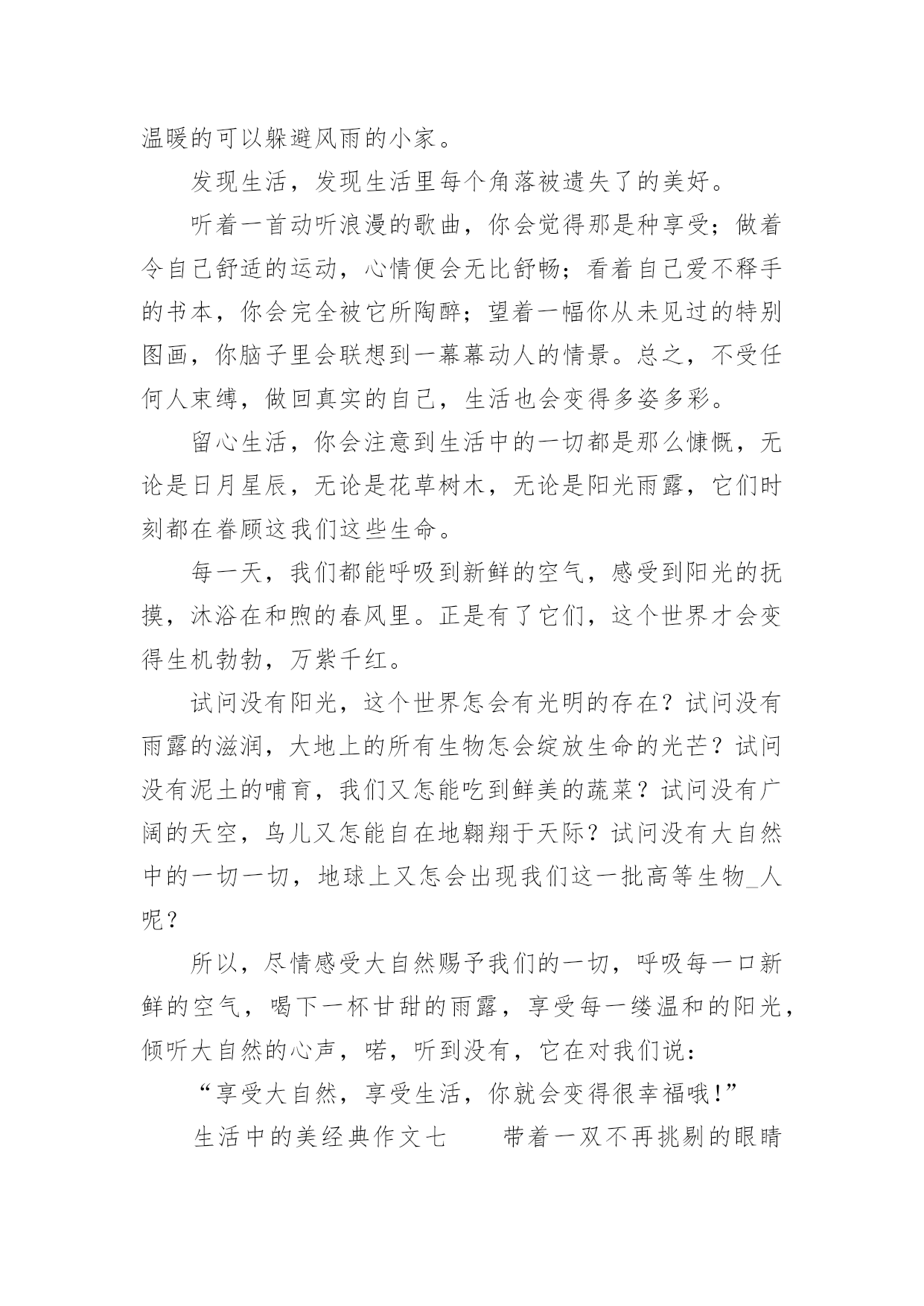 生活中的美经典作文生活中的美经典作文生活是美丽的,也是需要我们去发现的。下面是小编为大家整理的关于生活中的美的经典作文,欢迎大家的阅读。生活中的美经典作文一生活中处处都有美,有些是风景美,而更多的是人们的心灵美,就看你有没有一双发现美的眼睛。一天,我与老妈在公交车上看到这样一幕。在大马路上,两位骑电动车的阿姨不小心撞到了一块,人应该是不碍事,但两辆车的车把扭在了一起,怎么也没弄开,挡住了半条马路。我们所坐的公交车正好路过此地,我看到:两位阿姨正在费力的向两边拉车把,由于用力过多脸都憋的通红了,但两辆车的车把就好像紧紧的咬合在了一起一样,还是纹丝不动,一时两位阿姨都急的手足无措,不知该怎么办了。这时有很多车辆都从她们旁边绕开走了,还有些骑车的人把车子靠在马路边上,两腿撑地在看热闹,却没有人上前帮忙。司机师傅看到挡在马路上的两辆扭在一起的电动车,还有费劲力气也拉不开的两位阿姨,就果断的把公交车停下,走上前去帮忙。这时一位过路的骑自行车的叔叔也连忙放好车子上前帮忙去了,两位叔叔齐心协力,共同帮助阿姨把车子拉开,然后把车子推到人行道上,看到没有大碍了,司机师傅才上车开车,继续赶路。虽然这只是件小事,但司机师傅和陌生的叔叔却是我们学习的榜样,她们热于助人的举动深深的印在了我的脑海,也时刻激励着我做一名充满爱心的优秀的少先队员!生活中的美经典作文二生活中的美,存于你,存于我,存于天地万物——“只要你懂得欣赏,什么都可以成为艺术。”世界上并不缺少美,只是缺少一颗发现美的眼睛。自古以来,梅花被无数诗人所歌颂,正是因为她的美,渲染着周边的人。每当万物凋零,风欺雪压之时,她总是在白雪皑皑之时,傲立雪中,把清香洒满人间。只是美,真正在身边体验到的内在美。梅花盛开的季节,我见到了她,发现了她的美……在巴士上,人们都不约而同地对手哈着气,试图想暖和一些。没想到,一件意想不到的事发生了。突然,司机猛一刹车,“哇”的一声,让车上所有的人的目光都投向了一位中年妇女。原来,那位中年妇女禁受不住吐在了一个年轻姐姐的身上。妇女紧皱着眉头,连声说着对不起,姐姐缓缓地回过头,我不禁为那位阿姨捏了一把汗。可谁也没有料到,迎来的不是一顿狠狠的咒骂,而是姐姐把外面的一层衣服脱了,对妇女说:“大姐,您需要坐在通风的位置上,我就要下车,你坐我这儿吧!”“可是,你衣服……”“没关系,回去稍微洗洗就行了!”车门开了,姐姐下了车,我最后能看见了就是那一抹粉红的衣角。在那个寒冷的冬天,姐姐温暖的话语和礼貌的举止向我们展示了善良与美合为一体的化身。她和梅花一样,拥有纯洁高尚的品质,在她身上,散发着一种叫做美的清香……家里面井然有序,窗明几净,这是整洁的美;端庄秀丽,静谧可人,这是沉静的美;落落大方,清新自然,这是自信的美;平和洒脱,超然脱俗,这是闲适的美;粗旷豪放,不拘小节,这是大气的美。美的极致,便是安详。美是一种毫无烦忧的愉悦,用一种欣赏美的眼光去观赏世界,你会发现到处都有美的印痕。为心灵开一扇窗,让智慧的光芒和生活中炫目多彩的美呈现在你眼前。生活中的美经典作文三美,在生活中常有,但总有人说身边没有美。我很纳闷,生活中明明就有很多美。每天都站岗的警察。她们不畏惧风吹雨打,只有一个信念:为人服务。夏天,不论有多么热,她们仍然坚持着,不让小偷得逞;秋天,她们不怕秋风扫落叶,叶落在她们的头上,她们仍在帮助看不见路的老人指引正确的道路;冬天,她们一点也不惧怕北风“呼呼”地吹,还阻止着一次次交通事故的发生。这,就是一种美,一种人的心灵美。美术家们创造出一幅幅美妙的图画。她们有的在纸上创造;有的在麦田上创造;还有的,在冰上创造!但不论怎样,这一幅幅画作都是优美的。这难道不是一种美吗?景物也有美。绿色的小草衬着鲜红的花,衬着蓝蓝的天空。在阳光的照射下,水面波光粼粼,再加上山间的绿树红花,水边绿草茵茵,构成了一幅美丽的自然风景画!这更是一种独特又迷人的景物美。听了我的这么多解说,难道你还认为生活中根本没有美吗。生活中的美经典作文四美无处不在。美,是寻常的,又是难得的。有时,她会不经意地出现在你面前;有时,她却需要你用心去捕捉。在生活中,美需要你去细细发现。我发现了美,在生活中,清澈见底的小溪里洋溢着孩子们的笑声,是一种快乐的美;波涛汹涌的大海是一种浩瀚的美;在家里,老妈天天送我上学是一种幸福的美……阳春三月的春天,大地苏醒、鸟语花香、万物生春。连蜜蜂和蝴蝶都出来锻炼身体了。你瞧,旭日正在升腾,春姑娘就要翩翩来了,你快举起双手去拥抱这美丽的春天吧!夏天,红彤彤的太阳挂在天空,农民伯伯“面朝黄土背朝天”辛勤的劳动着,是一种无私奉献的美。秋天,五谷丰登的果子里装满着甜蜜的美。冬天,孩子们在雪地上尽情的打雪仗,是一种欢快的美。我不禁一看,是什么触动了我?是美,生活之美,精神之美。我也要珍惜美……生活中的