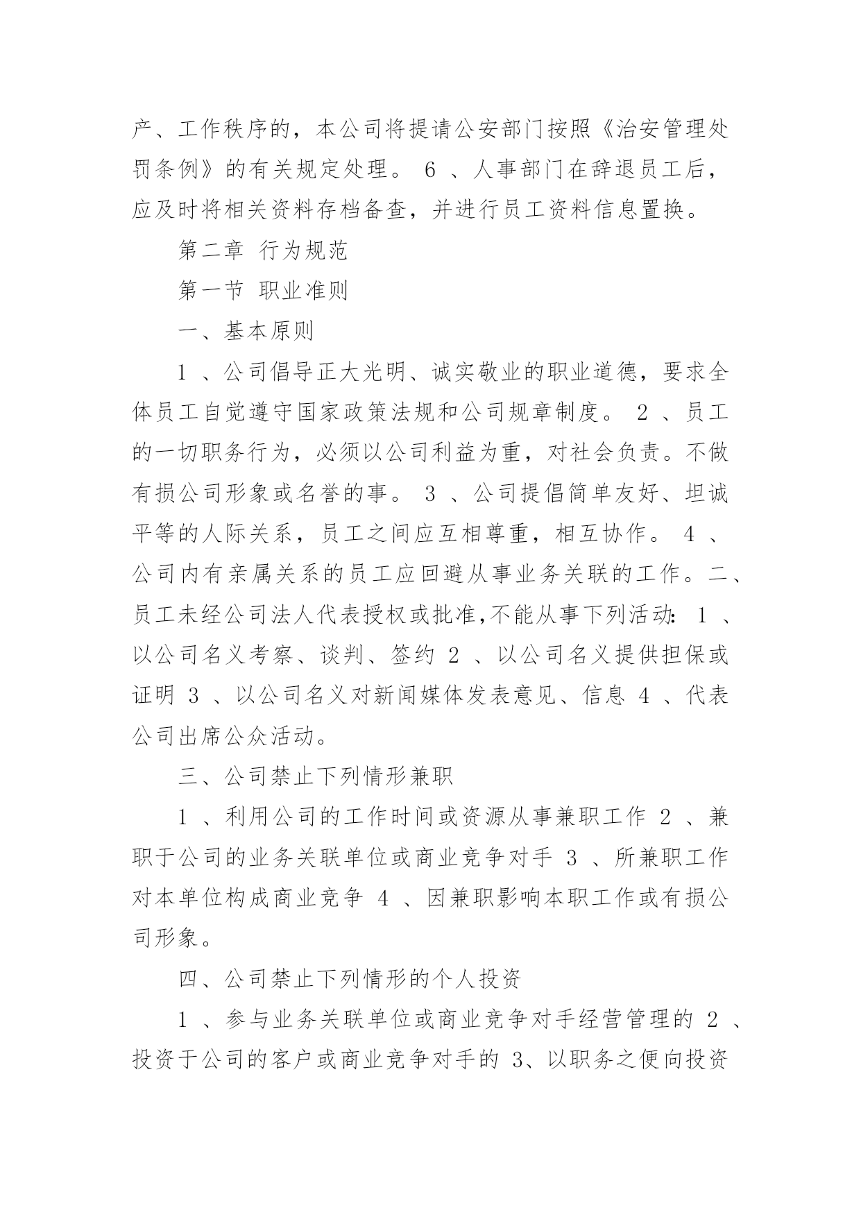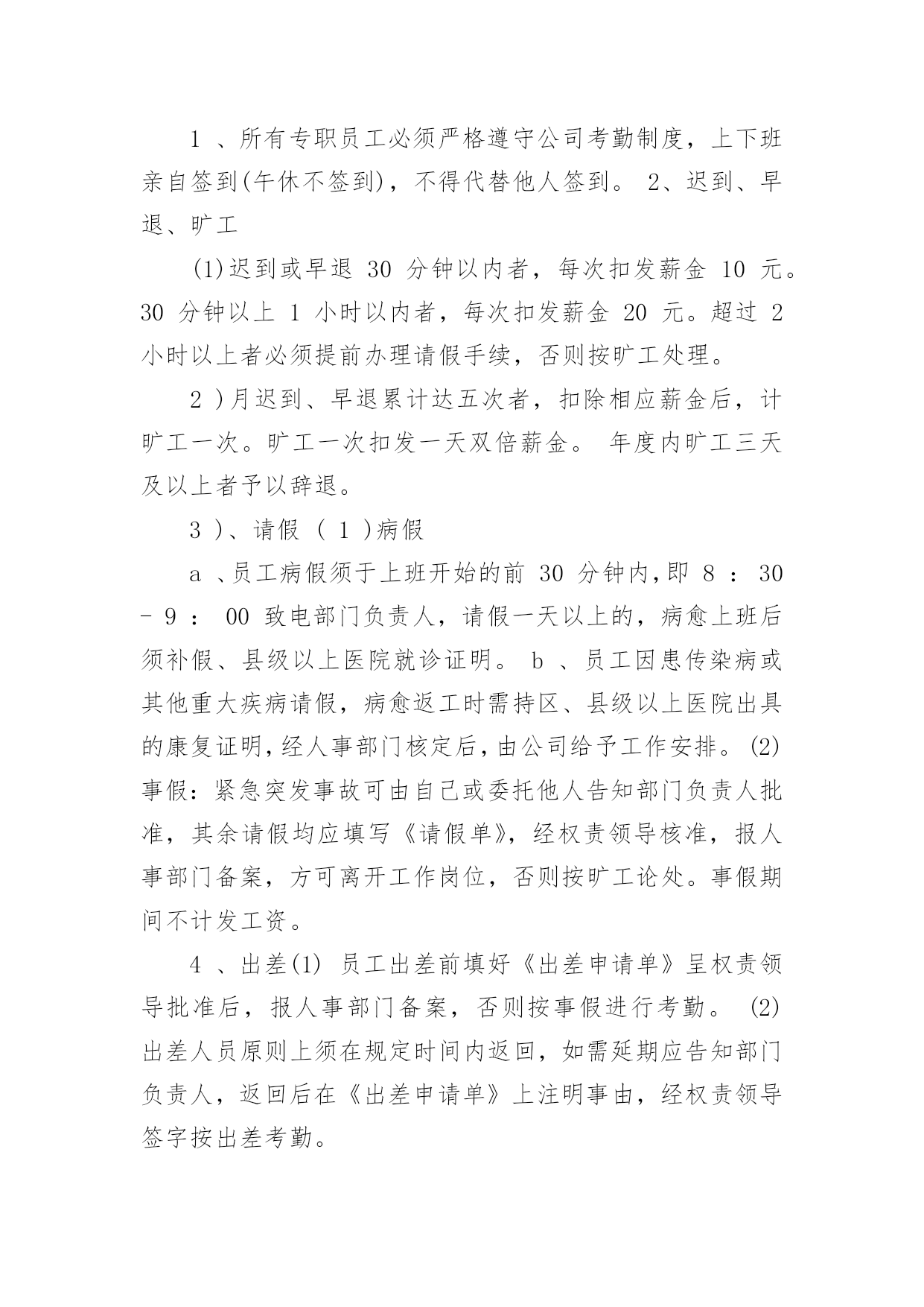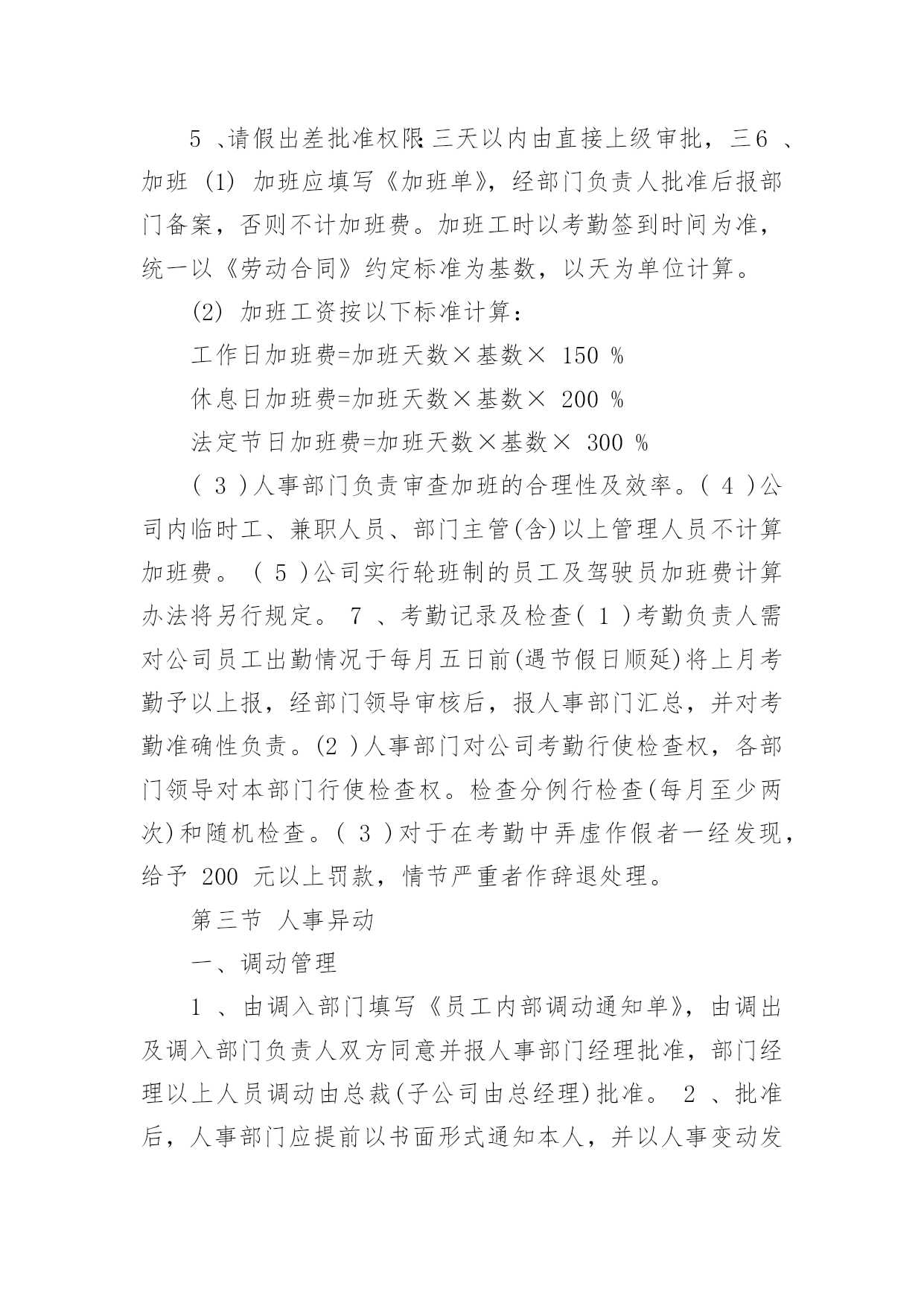公司规章制度最新公司规章制度最新(9篇)在现在的社会生活中,制度使用的情况越来越多,制度是在一定历史条件下形成的法令、礼俗等规范。想学习拟定制度却不知道该请教谁?以下是小编为大家收集的公司规章制度最新,仅供参考,欢迎大家阅读。公司规章制度最新1第一章入职指引第一节入职与试用一、用人原则:重选拔、重潜质、重品德。二、招聘条件:合格的应聘者应具备应聘岗位所要求的年龄18岁以上、学历高中或中专以上文化水平,同时具备敬业精神、协作精神、学习精神和创新精神。第二节考勤管理一、工作时间公司每周工作五天半,员工每日正常工作时间为7.5小时。其中:周一至周五:上午:9:00-12:00下午:13:30-18:00为工作时间12:00-13:30为午餐休息周六:上午:8:30-12:00为工作时间实行轮班制的部门作息时间经上级审查后可以实施。二、考勤1、所有专职员工必须严格遵守公司考勤制度,上下班亲自签到(午休不签到),不得代替他人签到。2、迟到、早退、旷工(1)迟到或早退30分钟以内者,每次扣发薪金10元。30分钟以上1小时以内者,每次扣发薪金20元。超过2小时以上者必须提前办理请假手续,否则按旷工处理。2)月迟到、早退累计达五次者,扣除相应薪金后,计旷工一次。旷工一次扣发一天双倍薪金。年度内旷工三天及以上者予以辞退。3)、请假(1)病假a、员工病假须于上班开始的前30分钟内,即8:30-9:00致电部门负责人,请假一天以上的,病愈上班后须补假、县级以上医院就诊证明。b、员工因患传染病或其他重大疾病请假,病愈返工时需持区、县级以上医院出具的康复证明,经人事部门核定后,由公司给予工作安排。(2)事假:紧急突发事故可由自己或委托他人告知部门负责人批准,其余请假均应填写《请假单》,经权责领导核准,报人事部门备案,方可离开工作岗位,否则按旷工论处。事假期间不计发工资。4、出差(1)员工出差前填好《出差申请单》呈权责领导批准后,报人事部门备案,否则按事假进行考勤。(2)出差人员原则上须在规定时间内返回,如需延期应告知部门负责人,返回后在《出差申请单》上注明事由,经权责领导签字按出差考勤。5、请假出差批准权限:三天以内由直接上级审批,三6、加班(1)加班应填写《加班单》,经部门负责人批准后报部门备案,否则不计加班费。加班工时以考勤签到时间为准,统一以《劳动合同》约定标准为基数,以天为单位计算。(2)加班工资按以下标准计算:工作日加班费=加班天数×基数×150%休息日加班费=加班天数×基数×200%法定节日加班费=加班天数×基数×300%(3)人事部门负责审查加班的合理性及效率。(4)公司内临时工、兼职人员、部门主管(含)以上管理人员不计算加班费。(5)公司实行轮班制的员工及驾驶员加班费计算办法将另行规定。7、考勤记录及检查(1)考勤负责人需对公司员工出勤情况于每月五日前(遇节假日顺延)将上月考勤予以上报,经部门领导审核后,报人事部门汇总,并对考勤准确性负责。(2)人事部门对公司考勤行使检查权,各部门领导对本部门行使检查权。检查分例行检查(每月至少两次)和随机检查。(3)对于在考勤中弄虚作假者一经发现,给予200元以上罚款,情节严重者作辞退处理。第三节人事异动一、调动管理1、由调入部门填写《员工内部调动通知单》,由调出及调入部门负责人双方同意并报人事部门经理批准,部门经理以上人员调动由总裁(子公司由总经理)批准。2、批准后,人事部门应提前以书面形式通知本人,并以人事变动发文通报。3、普通员工须在三天之内,部门负责人在七天之内办理好工作交接手续。4、员工本人应于指定日期履任新职,人事部门将相关文件存档备查,并于信息管理系统中进行信息置换。5、人事部门将根据该员工于新工作岗位上的工作职责,对其进行人事考核,评价员工的异动结果。二、辞职管理1、公司员工因故辞职时,本人应提前三十天向直接上级提交《辞职申请表》,经批准后转送人事部门审核,高级员工、部门经理以上管理人员辞职必须经总裁批准。2、收到员工辞职申请报告后,人事部门负责了解员工辞职的真实原因,并将信息反馈给相关部门,以保证及时进行有针对性的工作改进。3、员工填写《离职手续办理清单》,办理工作移交和财产清还手续。4、人事部门统计辞职员工考勤,计算应领取的薪金,办理社会保险变动。5、员工到财务部办理相关手续,领取薪金。6、人事部门将《离职手续清单》等相关资料存档备查,并进行员工信息资料置换。三、辞退管理1、见本手册第一章第二节六.1及六2.2、部门辞退员工时,由直接上级向人事部门提交《辞职申请表》,经审查后报总裁批准。3、人事部门提前一个月通知员工本人,并向员工下发《离职通知书》。4、员工应在离开公司前办理好工作的交接手续和财产的清还手续;员工在约定日期到财务部办理相关手续,领取薪金和离职补偿金。5、员工无理