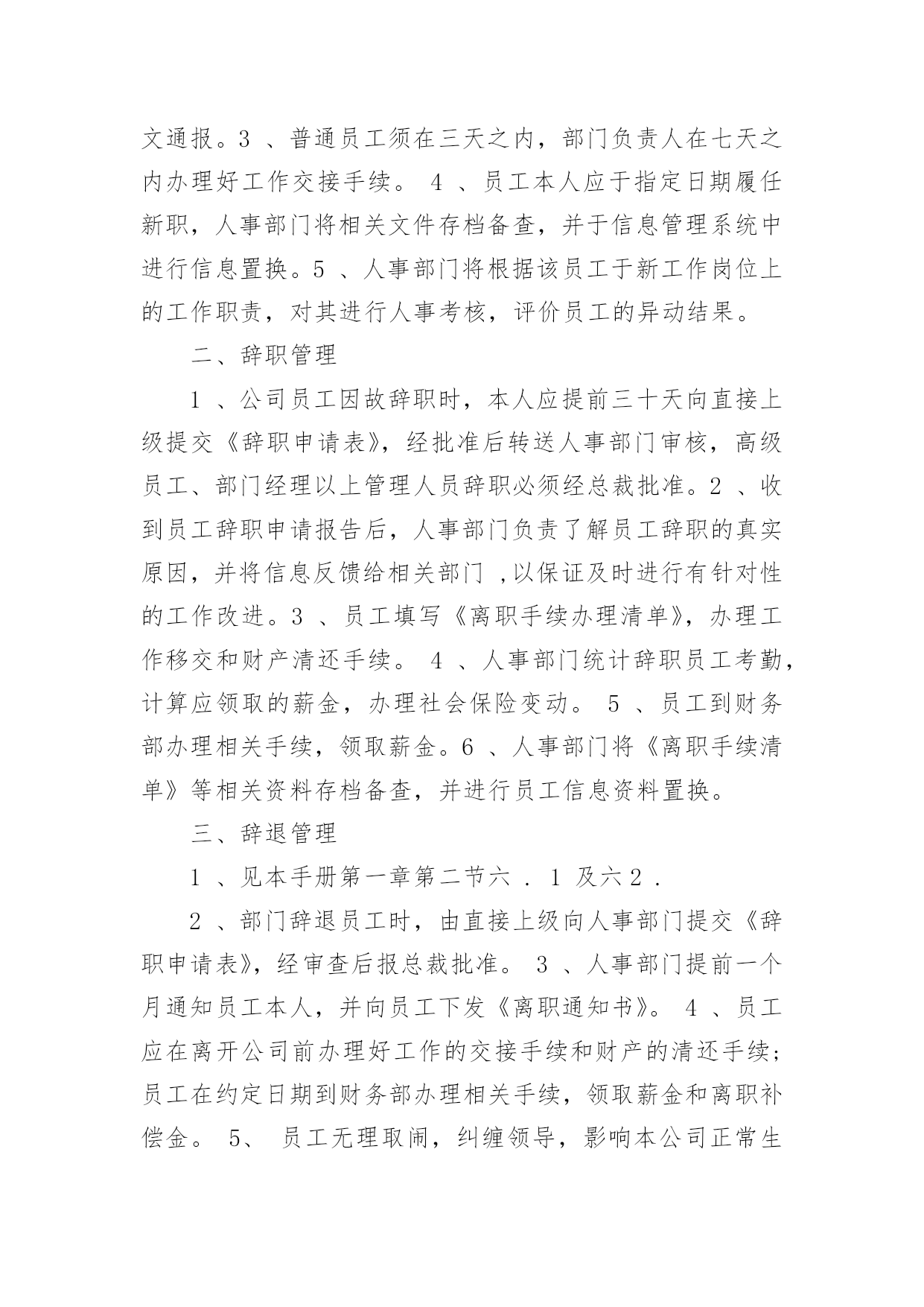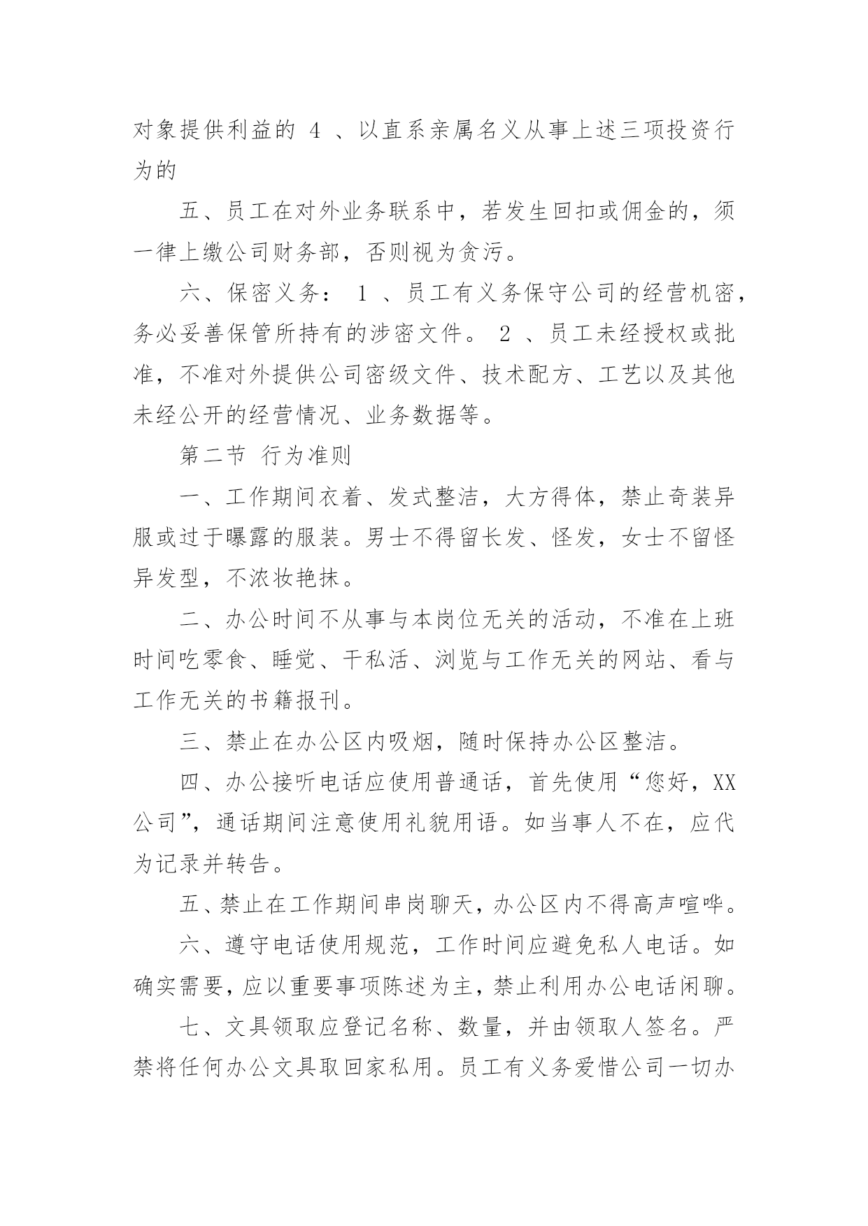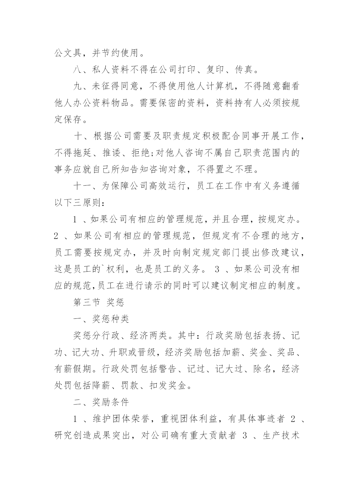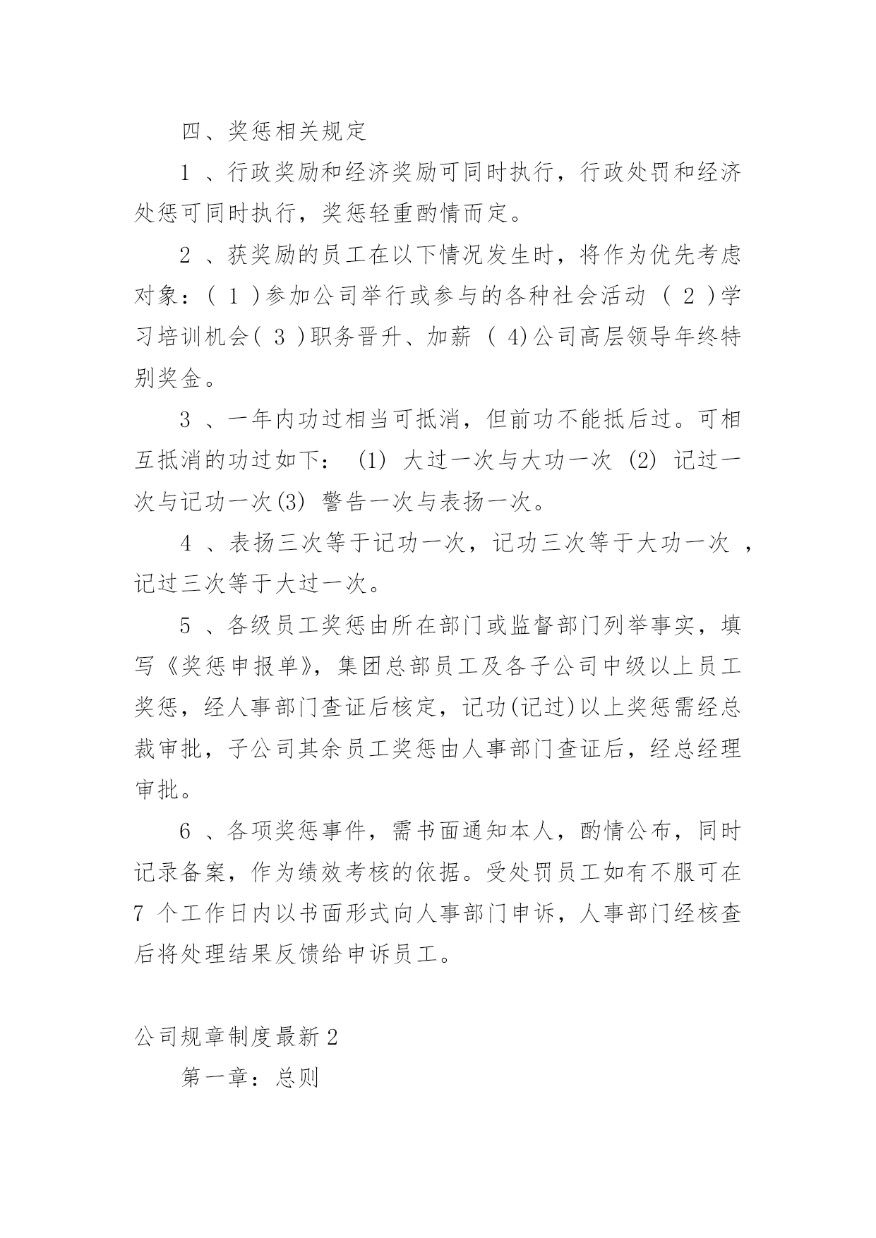 公司规章制度最新公司规章制度最新(9篇)在现在的社会生活中,制度使用的情况越来越多,制度是在一定历史条件下形成的法令、礼俗等规范。想学习拟定制度却不知道该请教谁?以下是小编为大家收集的公司规章制度最新,仅供参考,欢迎大家阅读。公司规章制度最新1第一章入职指引第一节入职与试用一、用人原则:重选拔、重潜质、重品德。二、招聘条件:合格的应聘者应具备应聘岗位所要求的年龄18岁以上、学历高中或中专以上文化水平,同时具备敬业精神、协作精神、学习精神和创新精神。第二节考勤管理一、工作时间公司每周工作五天半,员工每日正常工作时间为7.5小时。其中:周一至周五:上午:9:00-12:00下午:13:30-18:00为工作时间12:00-13:30为午餐休息周六:上午:8:30-12:00为工作时间实行轮班制的部门作息时间经上级审查后可以实施。二、考勤1、所有专职员工必须严格遵守公司考勤制度,上下班亲自签到(午休不签到),不得代替他人签到。2、迟到、早退、旷工(1)迟到或早退30分钟以内者,每次扣发薪金10元。30分钟以上1小时以内者,每次扣发薪金20元。超过2小时以上者必须提前办理请假手续,否则按旷工处理。2)月迟到、早退累计达五次者,扣除相应薪金后,计旷工一次。旷工一次扣发一天双倍薪金。年度内旷工三天及以上者予以辞退。3)、请假(1)病假a、员工病假须于上班开始的前30分钟内,即8:30-9:00致电部门负责人,请假一天以上的,病愈上班后须补假、县级以上医院就诊证明。b、员工因患传染病或其他重大疾病请假,病愈返工时需持区、县级以上医院出具的康复证明,经人事部门核定后,由公司给予工作安排。(2)事假:紧急突发事故可由自己或委托他人告知部门负责人批准,其余请假均应填写《请假单》,经权责领导核准,报人事部门备案,方可离开工作岗位,否则按旷工论处。事假期间不计发工资。4、出差(1)员工出差前填好《出差申请单》呈权责领导批准后,报人事部门备案,否则按事假进行考勤。(2)出差人员原则上须在规定时间内返回,如需延期应告知部门负责人,返回后在《出差申请单》上注明事由,经权责领导签字按出差考勤。5、请假出差批准权限:三天以内由直接上级审批,三6、加班(1)加班应填写《加班单》,经部门负责人批准后报部门备案,否则不计加班费。加班工时以考勤签到时间为准,统一以《劳动合同》约定标准为基数,以天为单位计算。(2)加班工资按以下标准计算:工作日加班费=加班天数×基数×150%休息日加班费=加班天数×基数×200%法定节日加班费=加班天数×基数×300%(3)人事部门负责审查加班的合理性及效率。(4)公司内临时工、兼职人员、部门主管(含)以上管理人员不计算加班费。(5)公司实行轮班制的员工及驾驶员加班费计算办法将另行规定。7、考勤记录及检查(1)考勤负责人需对公司员工出勤情况于每月五日前(遇节假日顺延)将上月考勤予以上报,经部门领导审核后,报人事部门汇总,并对考勤准确性负责。(2)人事部门对公司考勤行使检查权,各部门领导对本部门行使检查权。检查分例行检查(每月至少两次)和随机检查。(3)对于在考勤中弄虚作假者一经发现,给予200元以上罚款,情节严重者作辞退处理。第三节人事异动一、调动管理1、由调入部门填写《员工内部调动通知单》,由调出及调入部门负责人双方同意并报人事部门经理批准,部门经理以上人员调动由总裁(子公司由总经理)批准。2、批准后,人事部门应提前以书面形式通知本人,并以人事变动发文通报。3、普通员工须在三天之内,部门负责人在七天之内办理好工作交接手续。4、员工本人应于指定日期履任新职,人事部门将相关文件存档备查,并于信息管理系统中进行信息置换。5、人事部门将根据该员工于新工作岗位上的工作职责,对其进行人事考核,评价员工的异动结果。二、辞职管理1、公司员工因故辞职时,本人应提前三十天向直接上级提交《辞职申请表》,经批准后转送人事部门审核,高级员工、部门经理以上管理人员辞职必须经总裁批准。2、收到员工辞职申请报告后,人事部门负责了解员工辞职的真实原因,并将信息反馈给相关部门,以保证及时进行有针对性的工作改进。3、员工填写《离职手续办理清单》,办理工作移交和财产清还手续。4、人事部门统计辞职员工考勤,计算应领取的薪金,办理社会保险变动。5、员工到财务部办理相关手续,领取薪金。6、人事部门将《离职手续清单》等相关资料存档备查,并进行员工信息资料置换。三、辞退管理1、见本手册第一章第二节六.1及六2.2、部门辞退员工时,由直接上级向人事部门提交《辞职申请表》,经审查后报总裁批准。3、人事部门提前一个月通知员工本人,并向员工下发《离职通知书》。4、员工应在离开公司前办理好工作的交接手续和财产的清还手续;员工在约定日期到财务部办理相关手续,领取薪金和离职补偿金。5、员工无理
