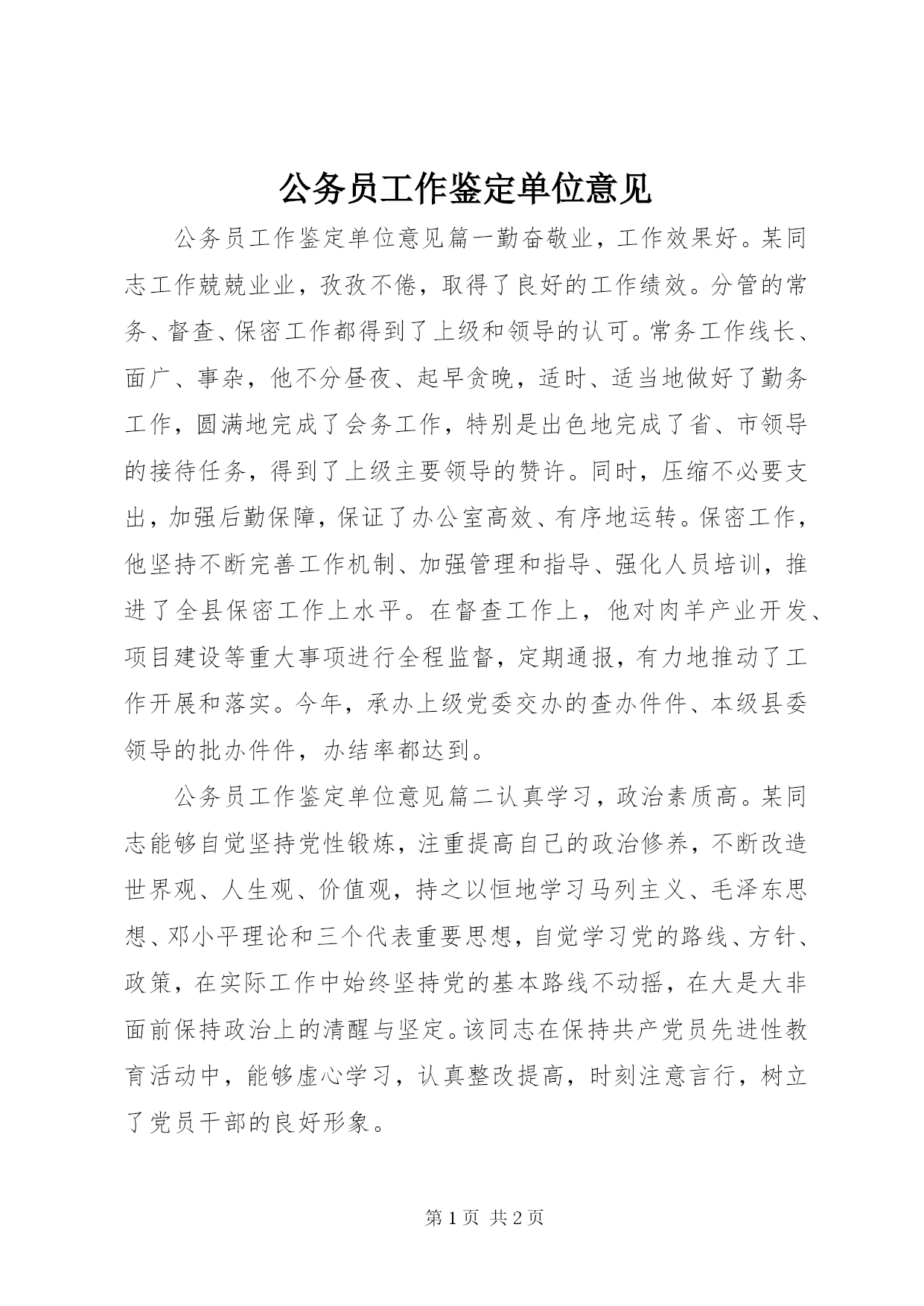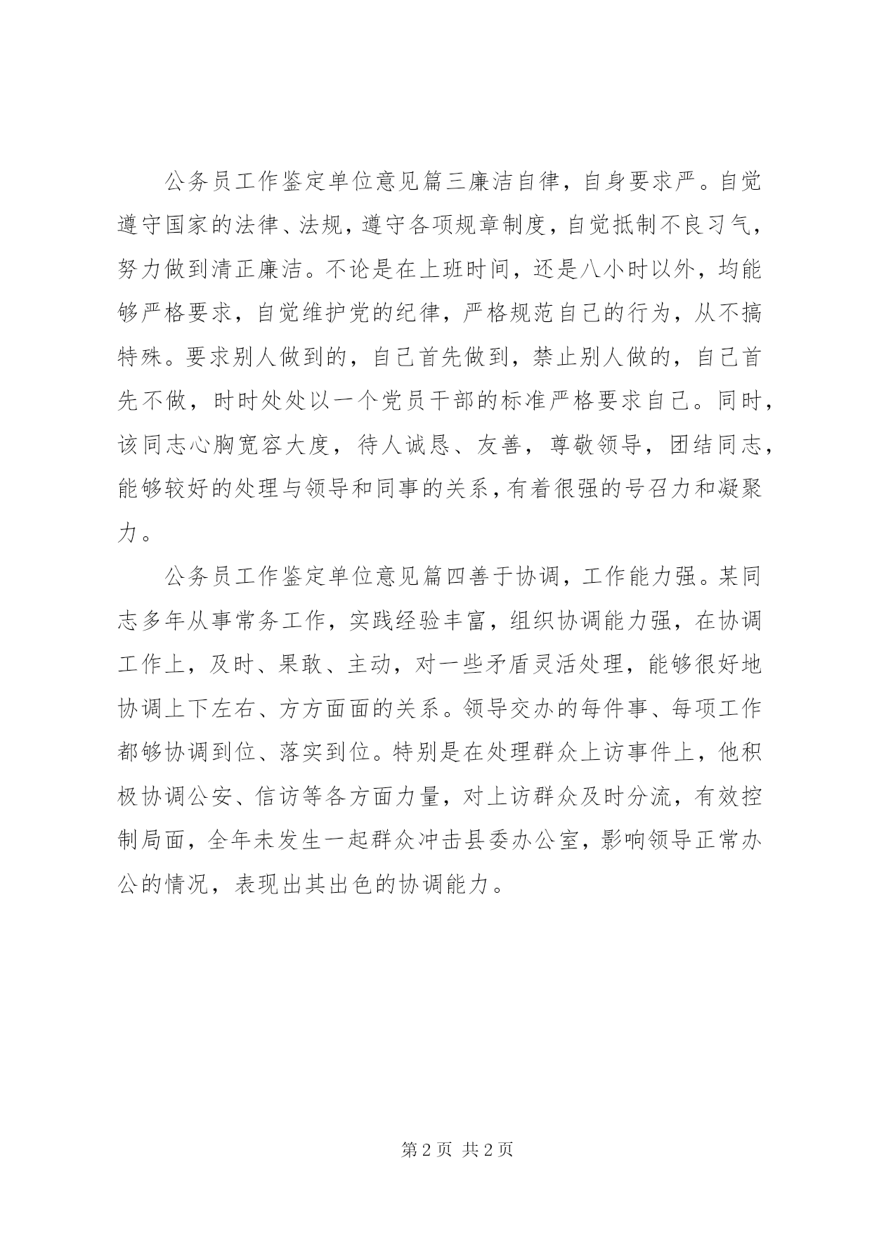 第PAGE\*Arabic\*MERGEFORMAT2页共NUMPAGES\*MERGEFORMAT2页公务员工作鉴定单位意见公务员工作鉴定单位意见篇一勤奋敬业,工作效果好。某同志工作兢兢业业,孜孜不倦,取得了良好的工作绩效。分管的常务、督查、保密工作都得到了上级和领导的认可。常务工作线长、面广、事杂,他不分昼夜、起早贪晚,适时、适当地做好了勤务工作,圆满地完成了会务工作,特别是出色地完成了省、市领导的接待任务,得到了上级主要领导的赞许。同时,压缩不必要支出,加强后勤保障,保证了办公室高效、有序地运转。保密工作,他坚持不断完善工作机制、加强管理和指导、强化人员培训,推进了全县保密工作上水平。在督查工作上,他对肉羊产业开发、项目建设等重大事项进行全程监督,定期通报,有力地推动了工作开展和落实。今年,承办上级党委交办的查办件件、本级县委领导的批办件件,办结率都达到。公务员工作鉴定单位意见篇二认真学习,政治素质高。某同志能够自觉坚持党性锻炼,注重提高自己的政治修养,不断改造世界观、人生观、价值观,持之以恒地学习马列主义、毛泽东思想、邓小平理论和三个代表重要思想,自觉学习党的路线、方针、政策,在实际工作中始终坚持党的基本路线不动摇,在大是大非面前保持政治上的清醒与坚定。该同志在保持共产党员先进性教育活动中,能够虚心学习,认真整改提高,时刻注意言行,树立了党员干部的良好形象。公务员工作鉴定单位意见篇三廉洁自律,自身要求严。自觉遵守国家的法律、法规,遵守各项规章制度,自觉抵制不良习气,努力做到清正廉洁。不论是在上班时间,还是八小时以外,均能够严格要求,自觉维护党的纪律,严格规范自己的行为,从不搞特殊。要求别人做到的,自己首先做到,禁止别人做的,自己首先不做,时时处处以一个党员干部的标准严格要求自己。同时,该同志心胸宽容大度,待人诚恳、友善,尊敬领导,团结同志,能够较好的处理与领导和同事的关系,有着很强的号召力和凝聚力。公务员工作鉴定单位意见篇四善于协调,工作能力强。某同志多年从事常务工作,实践经验丰富,组织协调能力强,在协调工作上,及时、果敢、主动,对一些矛盾灵活处理,能够很好地协调上下左右、方方面面的关系。领导交办的每件事、每项工作都够协调到位、落实到位。特别是在处理群众上访事件上,他积极协调公安、信访等各方面力量,对上访群众及时分流,有效控制局面,全年未发生一起群众冲击县委办公室,影响领导正常办公的情况,表现出其出色的协调能力。