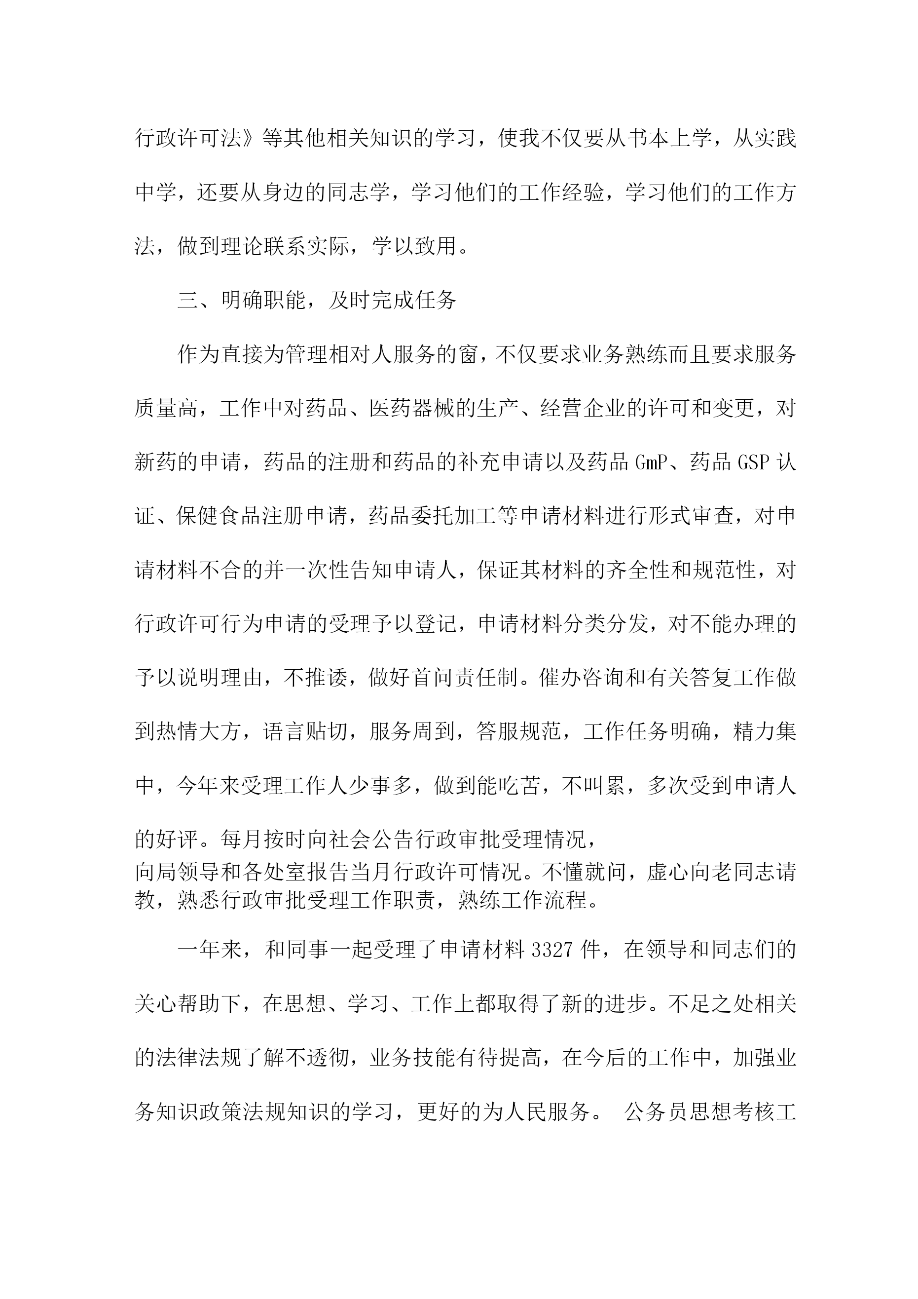 公务员思想考核工作总结范文公务员思想考核工作总结范文写工作总结,是从过去的工作中找出成功与失败,经验与教训,实事求是地总结工作情况。有则改之无则加勉,为接下来的工作确立合理的目标,明确未来发展的方向。那么今天XX小编在这给大家整理一下公务员思想考核工作总结范文,我们一起看看吧!公务员思想考核工作总结范文1一年以来,在局的领导的正确领导下,我很好地履行了工作职责,完成了本职工作任务。现将一年来的工作情况作以简要总结汇报:一、积极向党组织靠拢,培养党性,政治思想觉悟进一步提高一年来,我坚持以科学发展观的理论为指导,运用辩证唯物主义与历史唯物主义去分析和观察事物,明辨是非,坚持真理,坚持正确的世界观、人生观、价值观。在思想上积极构筑抵御资产阶级民主和自由化、拜金主义、自由主义等一切腐朽思想侵蚀的坚固防线。热爱祖国,热爱中国共产党,热爱社会主义,拥护中国共产党的领导,拥护改革开放。认真贯彻执行党的路线、方针、政策,为加快社会主义建设事业认真做好本职工作。二、业务上不断积累,提高素质随着新形势对财政干部业务能力要求的提高,本人十分注重对业务知识的学习和积累。积极参加市财政局和本局内组织的业务培训,提高自身业务素质,争取工作的主动性。在工作之余,还挤出时间自学业务知识,认真学习了关于财政工作的有关法律、法规、方针、政策,并在工作中贯彻执行这些政策规定。平时,我还注重对电脑有关知识进行较为深入的钻研,利用较为扎实的电脑知识使自已在日常工作中达到事半功倍的效果。三、工作中兢兢业业,尽职尽责在工作中,我能够以正确的态度对待各项工作任务,积极主动,勤勤恳恳,有强烈的工作责任心和工作热情,经常加班加点,毫无怨言。自己在目前的工作岗位上已工作了三年,经过三年的锻炼基本能胜任自己的本职工作,能够比较从容地处理日常工作中出现的各类问题。四、日常生活中遵纪守法,热忱参加各种有益活动在日常生活中,我能自觉维护社会公德,遵守局内的各项规章制度,生活勤俭节约,艰苦朴素、对人真诚,平时能与同事团结合作,互帮互助,人际关系和谐融洽。五、存在的问题及今后努力方向回顾一年来的工作,虽然说取得了一定的成绩,但也存在许多不足:是学习不够,缺乏学习的紧迫感和自觉性;二是工作较累的时候有过松弛思想;三是开创性的工作开展的不多。针对以上问题,在新的一年里,我将加强理论学习,进一步提高自身素质;增强大局观念,苦干实干,努力提高工作质量和效率,积极配合领导同事们,为财政事业的发展贡献自己微薄的力量!公务员思想考核工作总结范文2今年以来,在局领导的关心和正确指导下,政治上认真贯彻执行党的路线、方针、政策。思想上始终与党中央保持高度一致,热爱祖国,忠于人民;工作中积极主动,讲求职业道德,爱岗敬业,尽职尽责,团结同事,坚持边工作边学习不断提高业务技能和理论素养;求真务实、乐观上进始终保持严谨认真的工作态度,现将20XX一年来的工作总结如下:一、增强政治理论学习,不断提高政治素养积极参加省局组织的党风廉政建设的学习,学习马克思主义哲学,邓小平理论,深入学习贯彻党的XX大精神,进一步增强责任感、使命感。牢固树立共产主义理想信念,实践中正确认清职责权限,能够做到廉洁奉公,勤政为民,严格按党章要求,国家公务员法的标准来严格要求自己。坚信老老实实做人,踏踏实实做事,始终把人民群众的根本利益放在首位。二、增强业务学习,不断提高业务能力深知我们不管是干哪一项工作如果不善于学习就要落后的道理,能将学习当成是自己必不可缺的任务,利用空闲时间在网上学习新知识新业务,坚持边工作边学习,做到在干中学在学中干,学习一些相关的法律法规知识和文件,注重《药品管理法》、《药品注册管理办法》、《行政许可法》等其他相关知识的学习,使我不仅要从书本上学,从实践中学,还要从身边的同志学,学习他们的工作经验,学习他们的工作方法,做到理论联系实际,学以致用。三、明确职能,及时完成任务作为直接为管理相对人服务的窗,不仅要求业务熟练而且要求服务质量高,工作中对药品、医药器械的生产、经营企业的许可和变更,对新药的申请,药品的注册和药品的补充申请以及药品GmP、药品GSP认证、保健食品注册申请,药品委托加工等申请材料进行形式审查,对申请材料不合的并一次性告知申请人,保证其材料的齐全性和规范性,对行政许可行为申请的受理予以登记,申请材料分类分发,对不能办理的予以说明理由,不推诿,做好首问责任制。催办咨询和有关答复工作做到热情大方,语言贴切,服务周到,答服规范,工作任务明确,精力集中,今年来受理工作人少事多,做到能吃苦,不叫累,多次受到申请人的好评。每月按时向社会公告行政审批受理情况,向局领导和各处室报告当月行政许可情况。不懂就问,虚心向老同志请教,熟悉行政审批受理工作职责,熟练工作流程。一年