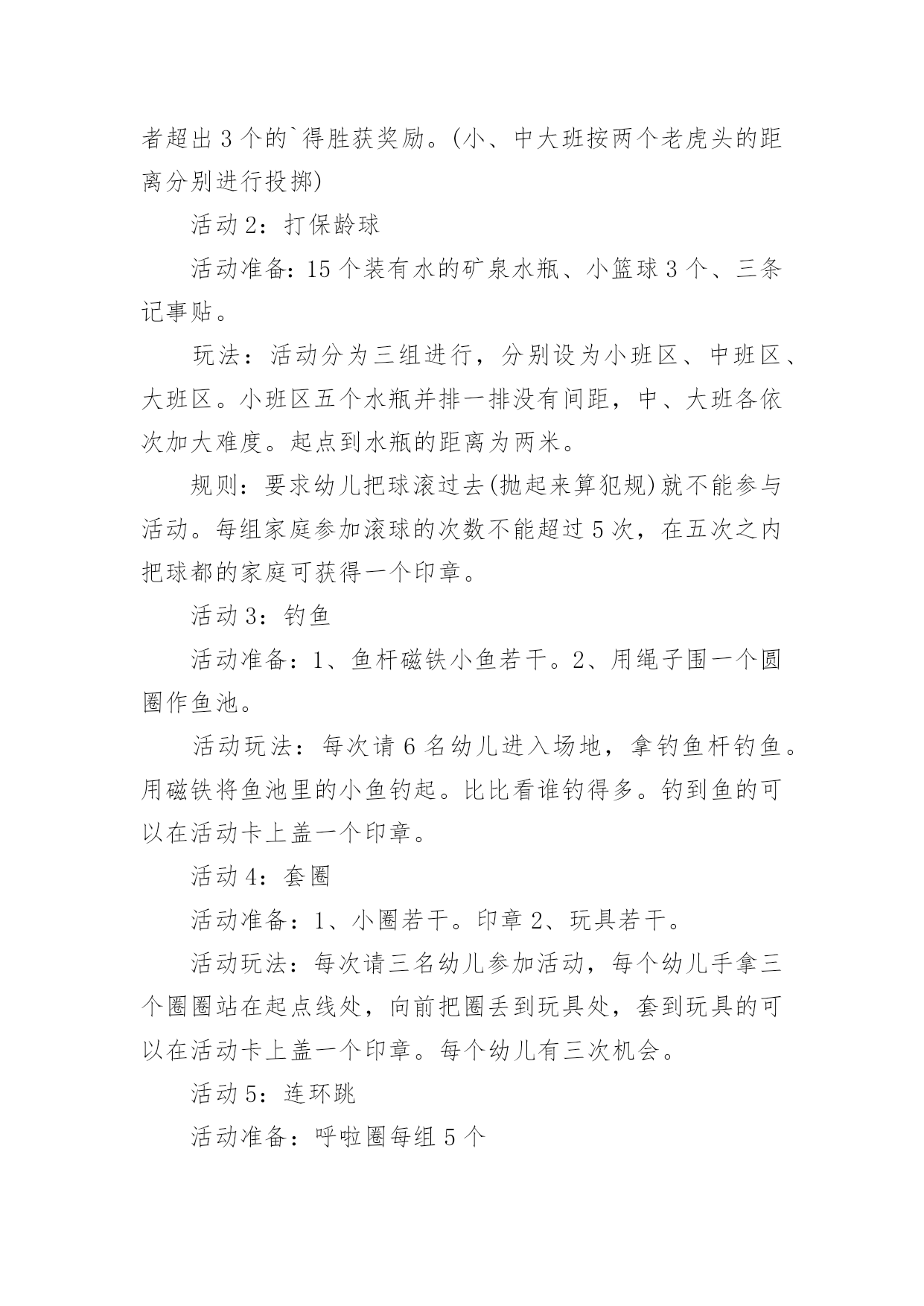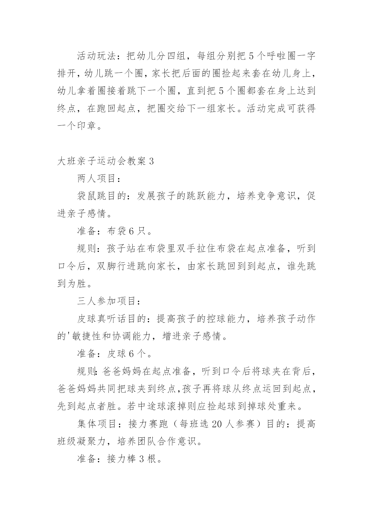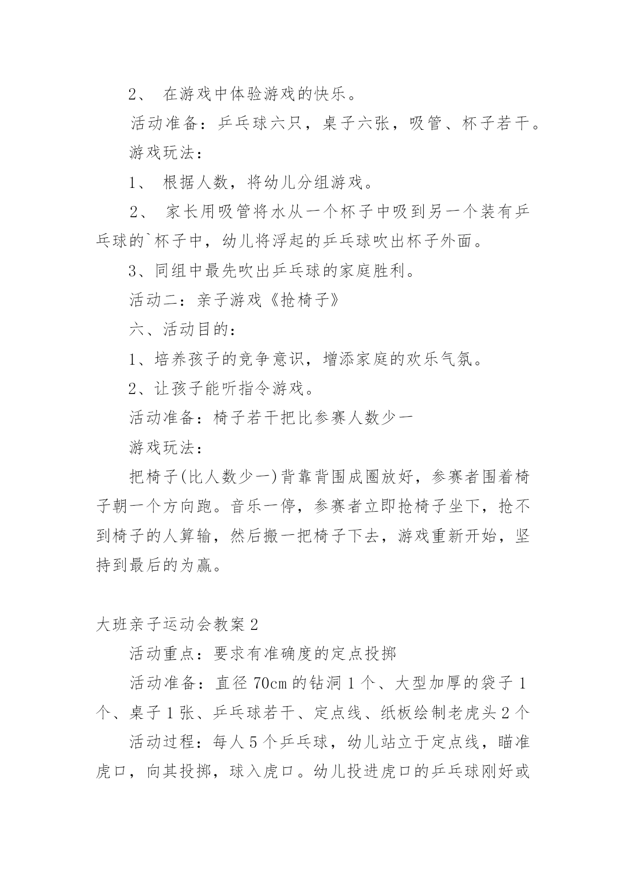 大班亲子运动会教案作为一位无私奉献的人民教师,总不可避免地需要编写教案,借助教案可以让教学工作更科学化。那么教案应该怎么写才合适呢?下面是小编整理的大班亲子运动会教案,供大家参考借鉴,希望可以帮助到有需要的朋友。大班亲子运动会教案1一、活动目标:1、通过和家长的一起游戏,增进幼儿与家人之间的情感。2、加强家园联系,增加教育的透明度,促进孩子的全面发展。3、培养孩子积极参加集体活动,愿意在校园环境下学习,体验活动带来的快乐。二、活动时间:xx年xx月xx日(8:30-----10:30)三、活动地点:xx班教室四、参加对象:全体幼儿和家长、班级老师和阿姨。活动一:游戏《吹乒乓球》五、活动目标:1、在游戏中锻炼幼儿的肺部力量。2、在游戏中体验游戏的快乐。活动准备:乒乓球六只,桌子六张,吸管、杯子若干。游戏玩法:1、根据人数,将幼儿分组游戏。2、家长用吸管将水从一个杯子中吸到另一个装有乒乓球的`杯子中,幼儿将浮起的乒乓球吹出杯子外面。3、同组中最先吹出乒乓球的家庭胜利。活动二:亲子游戏《抢椅子》六、活动目的:1、培养孩子的竞争意识,增添家庭的欢乐气氛。2、让孩子能听指令游戏。活动准备:椅子若干把比参赛人数少一游戏玩法:把椅子(比人数少一)背靠背围成圈放好,参赛者围着椅子朝一个方向跑。音乐一停,参赛者立即抢椅子坐下,抢不到椅子的人算输,然后搬一把椅子下去,游戏重新开始,坚持到最后的为赢。大班亲子运动会教案2活动重点:要求有准确度的定点投掷活动准备:直径70cm的钻洞1个、大型加厚的袋子1个、桌子1张、乒乓球若干、定点线、纸板绘制老虎头2个活动过程:每人5个乒乓球,幼儿站立于定点线,瞄准虎口,向其投掷,球入虎口。幼儿投进虎口的乒乓球刚好或者超出3个的`得胜获奖励。(小、中大班按两个老虎头的距离分别进行投掷)活动2:打保龄球活动准备:15个装有水的矿泉水瓶、小篮球3个、三条记事贴。玩法:活动分为三组进行,分别设为小班区、中班区、大班区。小班区五个水瓶并排一排没有间距,中、大班各依次加大难度。起点到水瓶的距离为两米。规则:要求幼儿把球滚过去(抛起来算犯规)就不能参与活动。每组家庭参加滚球的次数不能超过5次,在五次之内把球都的家庭可获得一个印章。活动3:钓鱼活动准备:1、鱼杆磁铁小鱼若干。2、用绳子围一个圆圈作鱼池。活动玩法:每次请6名幼儿进入场地,拿钓鱼杆钓鱼。用磁铁将鱼池里的小鱼钓起。比比看谁钓得多。钓到鱼的可以在活动卡上盖一个印章。活动4:套圈活动准备:1、小圈若干。印章2、玩具若干。活动玩法:每次请三名幼儿参加活动,每个幼儿手拿三个圈圈站在起点线处,向前把圈丢到玩具处,套到玩具的可以在活动卡上盖一个印章。每个幼儿有三次机会。活动5:连环跳活动准备:呼啦圈每组5个活动玩法:把幼儿分四组,每组分别把5个呼啦圈一字排开,幼儿跳一个圈,家长把后面的圈捡起来套在幼儿身上,幼儿拿着圈接着跳下一个圈,直到把5个圈都套在身上达到终点,在跑回起点,把圈交给下一组家长。活动完成可获得一个印章。大班亲子运动会教案3两人项目:袋鼠跳目的:发展孩子的跳跃能力,培养竞争意识,促进亲子感情。准备:布袋6只。规则:孩子站在布袋里双手拉住布袋在起点准备,听到口令后,双脚行进跳向家长,由家长跳回到到起点,谁先跳到为胜。三人参加项目:皮球真听话目的:提高孩子的控球能力,培养孩子动作的'敏捷性和协调能力,增进亲子感情。准备:皮球6个。规则:爸爸妈妈在起点准备,听到口令后将球夹在背后,爸爸妈妈共同把球夹到终点,孩子再将球从终点运回到起点,先到起点者胜。若中途球滚掉则应捡起球到掉球处重来。集体项目:接力赛跑(每班选20人参赛)目的:提高班级凝聚力,培养团队合作意识。准备:接力棒3根。规则:分成3组(以班级为组)每组20人,每组家长分两队在两边准备,听到口令后,第一个家长手握接力棒,快速跑至终点把接力棒交到另一家长手上,依次往返比赛,最先结束的班级为胜。以班级为单位进行比赛,跑道共设3道。大班亲子运动会教案4一、活动目标:(1)学习双脚夹沙包跳起前挪的方法,掌握动作要领。(重点)2.能连续做双脚夹沙包跳起前掷的动作,提高身体动作的协调性,遵守游戏规则。(难点)3.乐于挑战,体验小组合作获得的成功感。4.发展走、跑、跳等基本动作及动作的灵敏性、协调性。5.愿意参与体育游戏,体验在游戏中奔跑、追逐的乐趣。二、活动准备:物质准备:沙包50个,呼啦圈3个,轮胎3个,活动音乐。经验准备:巩固双脚跳的技能,讨论沙包的`多种玩法。三、活动过程:1、情景引入,师幼做热身活动。(1)幼儿扮演运输队员,教师带领幼儿慢跑-快跑-S型障碍跑-行进起跳等,重点活动脚部、腿部关节,活动身体各个部位。(2)幼儿围绕沙包进行身体动作,活动身体各部位。2、通过“好玩的沙包”游戏,学习连续双脚夹沙包跳起前掷的方