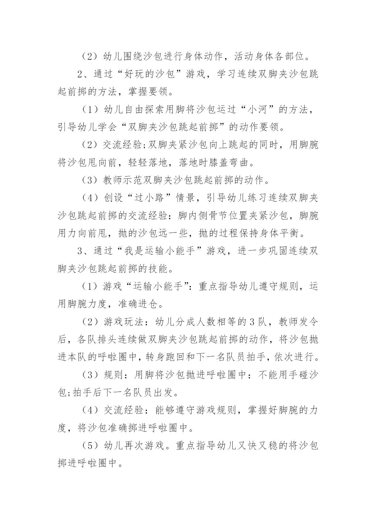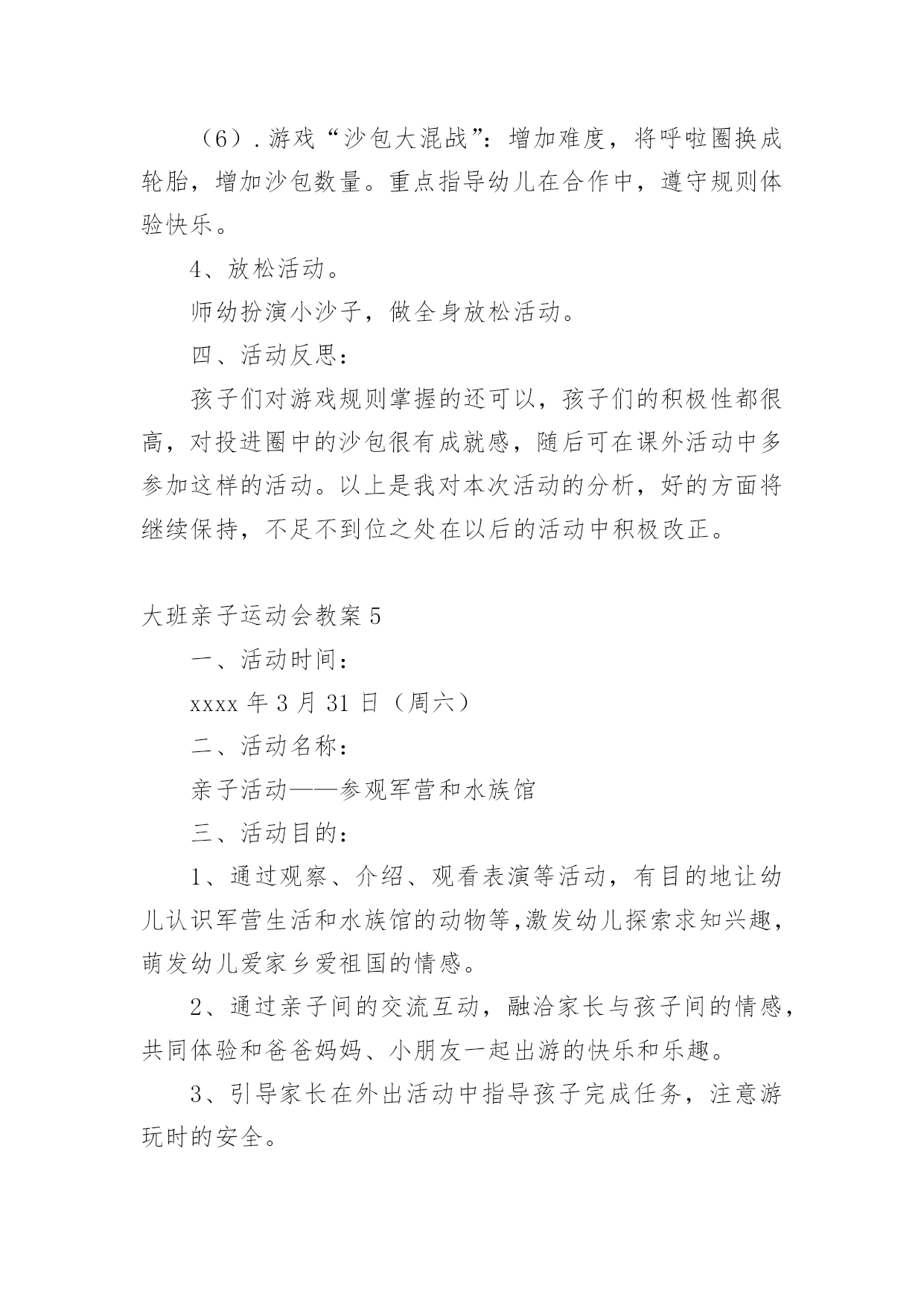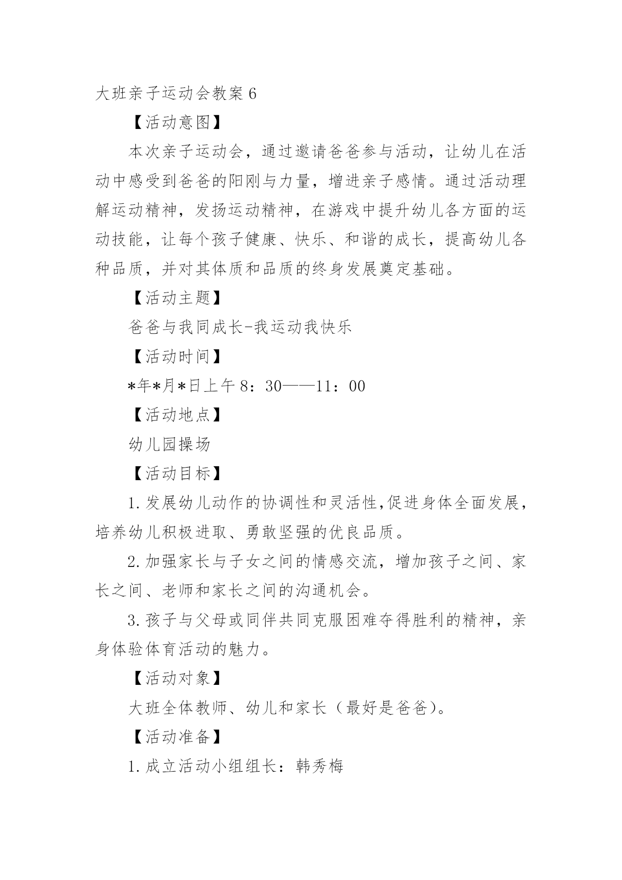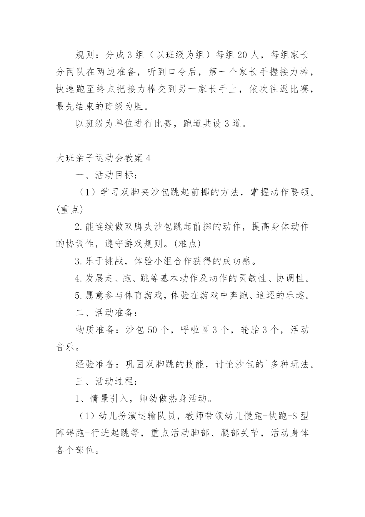 大班亲子运动会教案作为一位无私奉献的人民教师,总不可避免地需要编写教案,借助教案可以让教学工作更科学化。那么教案应该怎么写才合适呢?下面是小编整理的大班亲子运动会教案,供大家参考借鉴,希望可以帮助到有需要的朋友。大班亲子运动会教案1一、活动目标:1、通过和家长的一起游戏,增进幼儿与家人之间的情感。2、加强家园联系,增加教育的透明度,促进孩子的全面发展。3、培养孩子积极参加集体活动,愿意在校园环境下学习,体验活动带来的快乐。二、活动时间:xx年xx月xx日(8:30-----10:30)三、活动地点:xx班教室四、参加对象:全体幼儿和家长、班级老师和阿姨。活动一:游戏《吹乒乓球》五、活动目标:1、在游戏中锻炼幼儿的肺部力量。2、在游戏中体验游戏的快乐。活动准备:乒乓球六只,桌子六张,吸管、杯子若干。游戏玩法:1、根据人数,将幼儿分组游戏。2、家长用吸管将水从一个杯子中吸到另一个装有乒乓球的`杯子中,幼儿将浮起的乒乓球吹出杯子外面。3、同组中最先吹出乒乓球的家庭胜利。活动二:亲子游戏《抢椅子》六、活动目的:1、培养孩子的竞争意识,增添家庭的欢乐气氛。2、让孩子能听指令游戏。活动准备:椅子若干把比参赛人数少一游戏玩法:把椅子(比人数少一)背靠背围成圈放好,参赛者围着椅子朝一个方向跑。音乐一停,参赛者立即抢椅子坐下,抢不到椅子的人算输,然后搬一把椅子下去,游戏重新开始,坚持到最后的为赢。大班亲子运动会教案2活动重点:要求有准确度的定点投掷活动准备:直径70cm的钻洞1个、大型加厚的袋子1个、桌子1张、乒乓球若干、定点线、纸板绘制老虎头2个活动过程:每人5个乒乓球,幼儿站立于定点线,瞄准虎口,向其投掷,球入虎口。幼儿投进虎口的乒乓球刚好或者超出3个的`得胜获奖励。(小、中大班按两个老虎头的距离分别进行投掷)活动2:打保龄球活动准备:15个装有水的矿泉水瓶、小篮球3个、三条记事贴。玩法:活动分为三组进行,分别设为小班区、中班区、大班区。小班区五个水瓶并排一排没有间距,中、大班各依次加大难度。起点到水瓶的距离为两米。规则:要求幼儿把球滚过去(抛起来算犯规)就不能参与活动。每组家庭参加滚球的次数不能超过5次,在五次之内把球都的家庭可获得一个印章。活动3:钓鱼活动准备:1、鱼杆磁铁小鱼若干。2、用绳子围一个圆圈作鱼池。活动玩法:每次请6名幼儿进入场地,拿钓鱼杆钓鱼。用磁铁将鱼池里的小鱼钓起。比比看谁钓得多。钓到鱼的可以在活动卡上盖一个印章。活动4:套圈活动准备:1、小圈若干。印章2、玩具若干。活动玩法:每次请三名幼儿参加活动,每个幼儿手拿三个圈圈站在起点线处,向前把圈丢到玩具处,套到玩具的可以在活动卡上盖一个印章。每个幼儿有三次机会。活动5:连环跳活动准备:呼啦圈每组5个活动玩法:把幼儿分四组,每组分别把5个呼啦圈一字排开,幼儿跳一个圈,家长把后面的圈捡起来套在幼儿身上,幼儿拿着圈接着跳下一个圈,直到把5个圈都套在身上达到终点,在跑回起点,把圈交给下一组家长。活动完成可获得一个印章。大班亲子运动会教案3两人项目:袋鼠跳目的:发展孩子的跳跃能力,培养竞争意识,促进亲子感情。准备:布袋6只。规则:孩子站在布袋里双手拉住布袋在起点准备,听到口令后,双脚行进跳向家长,由家长跳回到到起点,谁先跳到为胜。三人参加项目:皮球真听话目的:提高孩子的控球能力,培养孩子动作的'敏捷性和协调能力,增进亲子感情。准备:皮球6个。规则:爸爸妈妈在起点准备,听到口令后将球夹在背后,爸爸妈妈共同把球夹到终点,孩子再将球从终点运回到起点,先到起点者胜。若中途球滚掉则应捡起球到掉球处重来。集体项目:接力赛跑(每班选20人参赛)目的:提高班级凝聚力,培养团队合作意识。准备:接力棒3根。规则:分成3组(以班级为组)每组20人,每组家长分两队在两边准备,听到口令后,第一个家长手握接力棒,快速跑至终点把接力棒交到另一家长手上,依次往返比赛,最先结束的班级为胜。以班级为单位进行比赛,跑道共设3道。大班亲子运动会教案4一、活动目标:(1)学习双脚夹沙包跳起前挪的方法,掌握动作要领。(重点)2.能连续做双脚夹沙包跳起前掷的动作,提高身体动作的协调性,遵守游戏规则。(难点)3.乐于挑战,体验小组合作获得的成功感。4.发展走、跑、跳等基本动作及动作的灵敏性、协调性。5.愿意参与体育游戏,体验在游戏中奔跑、追逐的乐趣。二、活动准备:物质准备:沙包50个,呼啦圈3个,轮胎3个,活动音乐。经验准备:巩固双脚跳的技能,讨论沙包的`多种玩法。三、活动过程:1、情景引入,师幼做热身活动。(1)幼儿扮演运输队员,教师带领幼儿慢跑-快跑-S型障碍跑-行进起跳等,重点活动脚部、腿部关节,活动身体各个部位。(2)幼儿围绕沙包进行身体动作,活动身体各部位。2、通过“好玩的沙包”游戏,学习连续双脚夹沙包跳起前掷的方