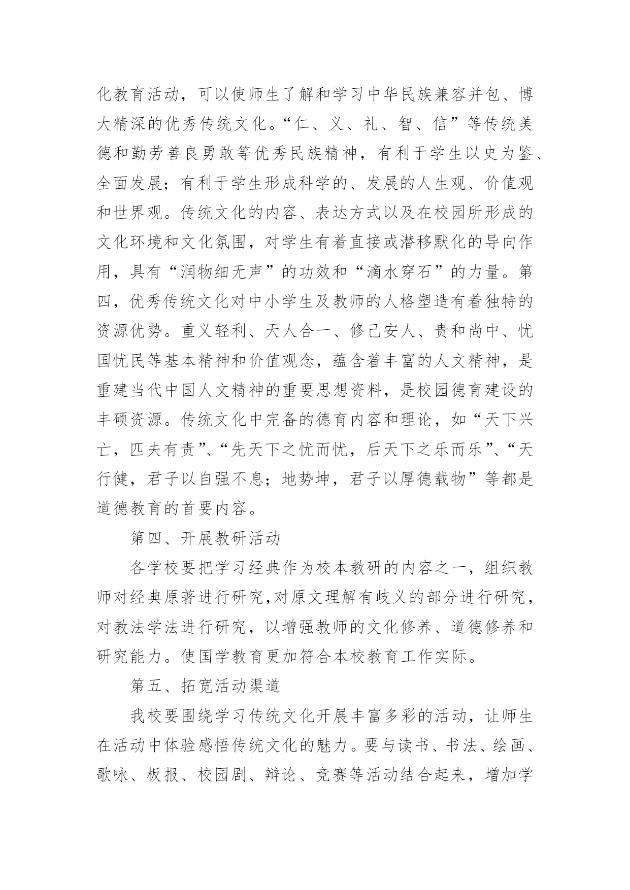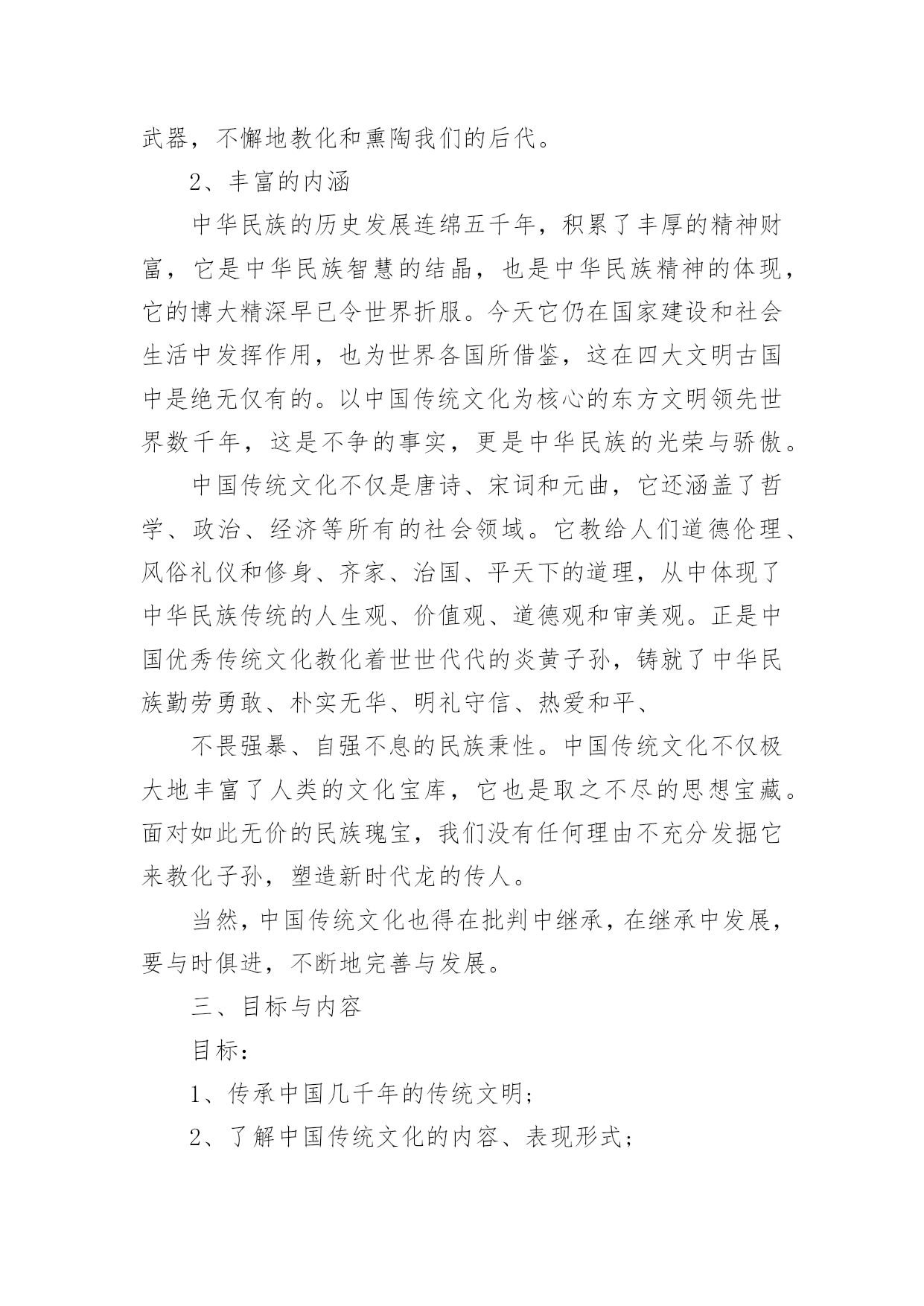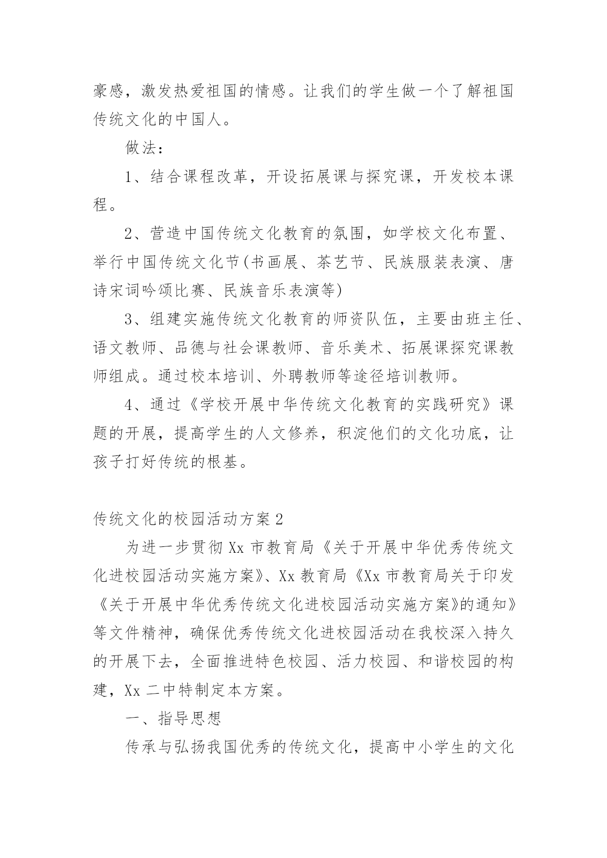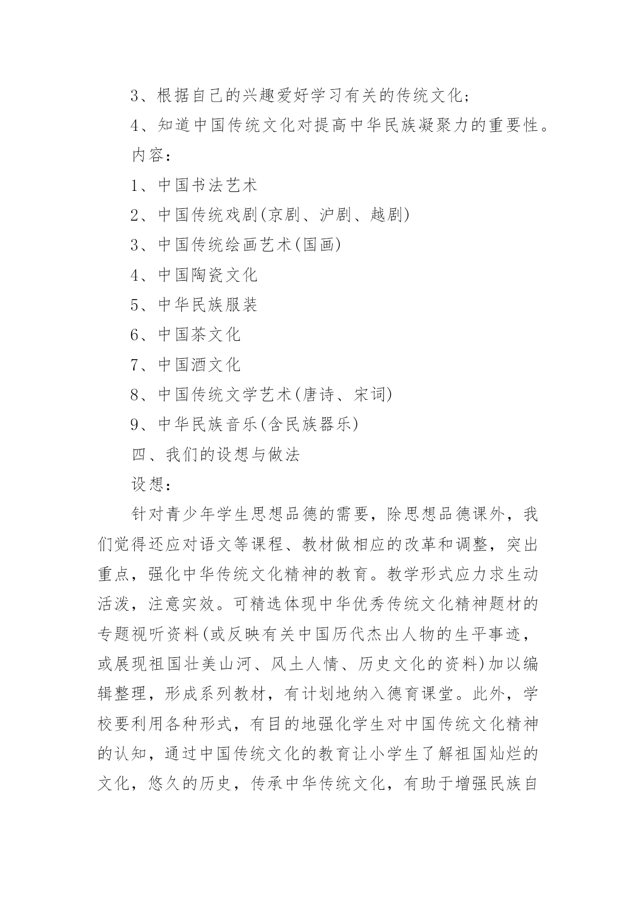 传统文化的校园活动方案为确保事情或工作顺利开展,常常需要提前进行细致的方案准备工作,方案的内容多是上级对下级或涉及面比较大的工作,一般都用带“文件头”形式下发。方案应该怎么制定呢?以下是小编为大家收集的传统文化的校园活动方案,欢迎大家分享。传统文化的校园活动方案1一、指导思想文化作为人类活动的结晶,集中反映了民族精神、民族生活和民族经验。每一部伟大的作品都来自于时代、民族、国家以及整个人类进步发展的深刻关心与思考,承载和传递着民族的血液和精髓,是特定历史时期社会生活的百科全书。《国家“xx”时期文化发展规划纲要》指出,今后中小学各学科课程都要结合学科特点融入中华优秀传统文化内容,要在有条件的小学开设书法、绘画、武术等课程,以加强中国传统文化的教育。xx在美国耶鲁大学演讲时指出:“一个民族的文化,往往凝聚着这个民族对世界和生命的历史认知和现实感受,也往往积淀着这个民族最深层的精神追求和行为准则。”基于以上认识,着眼于全面推进素质教育,深化人文素质教育,努力加强小学生传统文化教育,加强学生的特长培养,尊重学生的个性发展,坚持以引导激励为主、多方面渗透熏陶的原则,采取结合各科教学、融入校本课程、融入少先队活动、链接闲暇教育等方式积极开展古诗文诵读、传统美德和礼仪教育、革命传统教育、国画、书法、篆刻、天文、武术、象棋、戏曲、舞蹈、民族乐器和古乐欣赏等活动。各单位要充分认识开展“中华传统文化进校园、进课堂”活动的重要意义,以此提升小学生传统文化素养。二、我们的思考1、重要性“盖幸运者最能显露恶德,而厄运最能显露美德。”当今中国的青少年,他们生在和平年代,长在太平盛世,没有经历战争、动乱、饥荒和瘟疫等艰难困苦,在阳光雨露中成长。改革开放以后,社会进入转型时期,在市场经济的大潮中,东西文化剧烈碰撞,人们的价值观念发生了深刻的变化,社会上物欲横流,这一切都构成了不利于青少年健康成长的背景,使得部分青少年丧失比较和鉴别能力,极易迷失方向。如何有效地教育好孩子,是我们面临着的一个重要的社会问题。青少年是社会的未来,树德立志问题是压倒一切的教育核心问题,是教育工作者长期的奋斗目标。国家间的竞争就是人才的竞争,西方国家早就瞄上了中国的人才资源,他们凭借其雄厚的经济实力,不惜重金,抢挖我们的精英人才。西方精神文化产品的进入,实际上就是文化渗透,用他们的价值观来影响我们的青少年。在这场关系国运兴衰的斗争中,我们并非束手无策,我们除了要继续坚持用各种常规思想教育手段外,还必须拿起得天独厚的中国优秀传统文化的精神武器,不懈地教化和熏陶我们的后代。2、丰富的内涵中华民族的历史发展连绵五千年,积累了丰厚的精神财富,它是中华民族智慧的结晶,也是中华民族精神的体现,它的博大精深早已令世界折服。今天它仍在国家建设和社会生活中发挥作用,也为世界各国所借鉴,这在四大文明古国中是绝无仅有的。以中国传统文化为核心的东方文明领先世界数千年,这是不争的事实,更是中华民族的光荣与骄傲。中国传统文化不仅是唐诗、宋词和元曲,它还涵盖了哲学、政治、经济等所有的社会领域。它教给人们道德伦理、风俗礼仪和修身、齐家、治国、平天下的道理,从中体现了中华民族传统的人生观、价值观、道德观和审美观。正是中国优秀传统文化教化着世世代代的炎黄子孙,铸就了中华民族勤劳勇敢、朴实无华、明礼守信、热爱和平、不畏强暴、自强不息的民族秉性。中国传统文化不仅极大地丰富了人类的文化宝库,它也是取之不尽的思想宝藏。面对如此无价的民族瑰宝,我们没有任何理由不充分发掘它来教化子孙,塑造新时代龙的传人。当然,中国传统文化也得在批判中继承,在继承中发展,要与时俱进,不断地完善与发展。三、目标与内容目标:1、传承中国几千年的传统文明;2、了解中国传统文化的内容、表现形式;3、根据自己的兴趣爱好学习有关的传统文化;4、知道中国传统文化对提高中华民族凝聚力的重要性。内容:1、中国书法艺术2、中国传统戏剧(京剧、沪剧、越剧)3、中国传统绘画艺术(国画)4、中国陶瓷文化5、中华民族服装6、中国茶文化7、中国酒文化8、中国传统文学艺术(唐诗、宋词)9、中华民族音乐(含民族器乐)四、我们的设想与做法设想:针对青少年学生思想品德的需要,除思想品德课外,我们觉得还应对语文等课程、教材做相应的改革和调整,突出重点,强化中华传统文化精神的教育。教学形式应力求生动活泼,注意实效。可精选体现中华优秀传统文化精神题材的专题视听资料(或反映有关中国历代杰出人物的生平事迹,或展现祖国壮美山河、风土人情、历史文化的资料)加以编辑整理,形成系列教材,有计划地纳入德育课堂。此外,学校要利用各种形式,有目的地强化学生对中国传统文化精神的认知,通过中国传统文化的教育让小学生了解祖国灿烂的文化,悠久的历史,传承中华传统文化,有助于增强民族自豪感,激发热爱祖国的情感。让