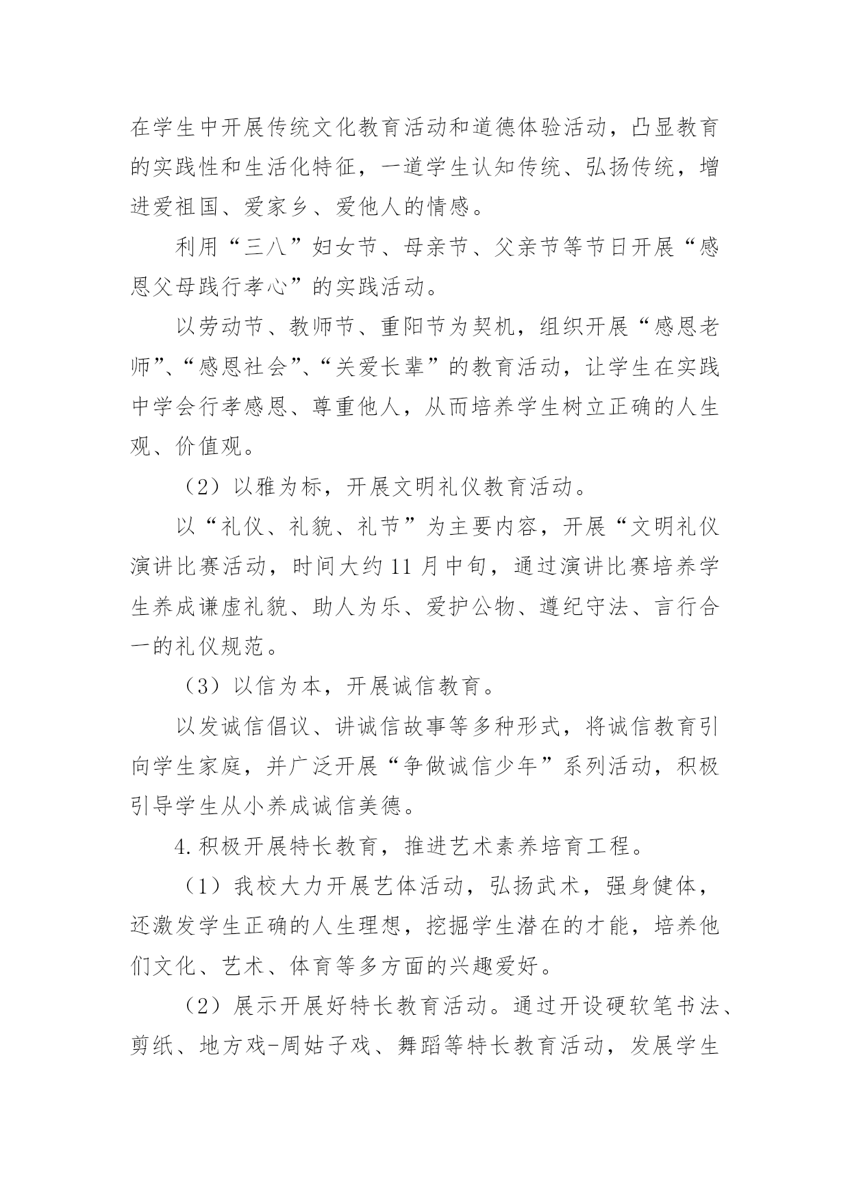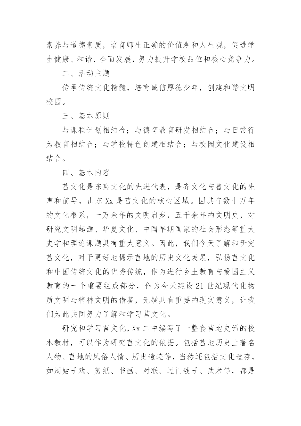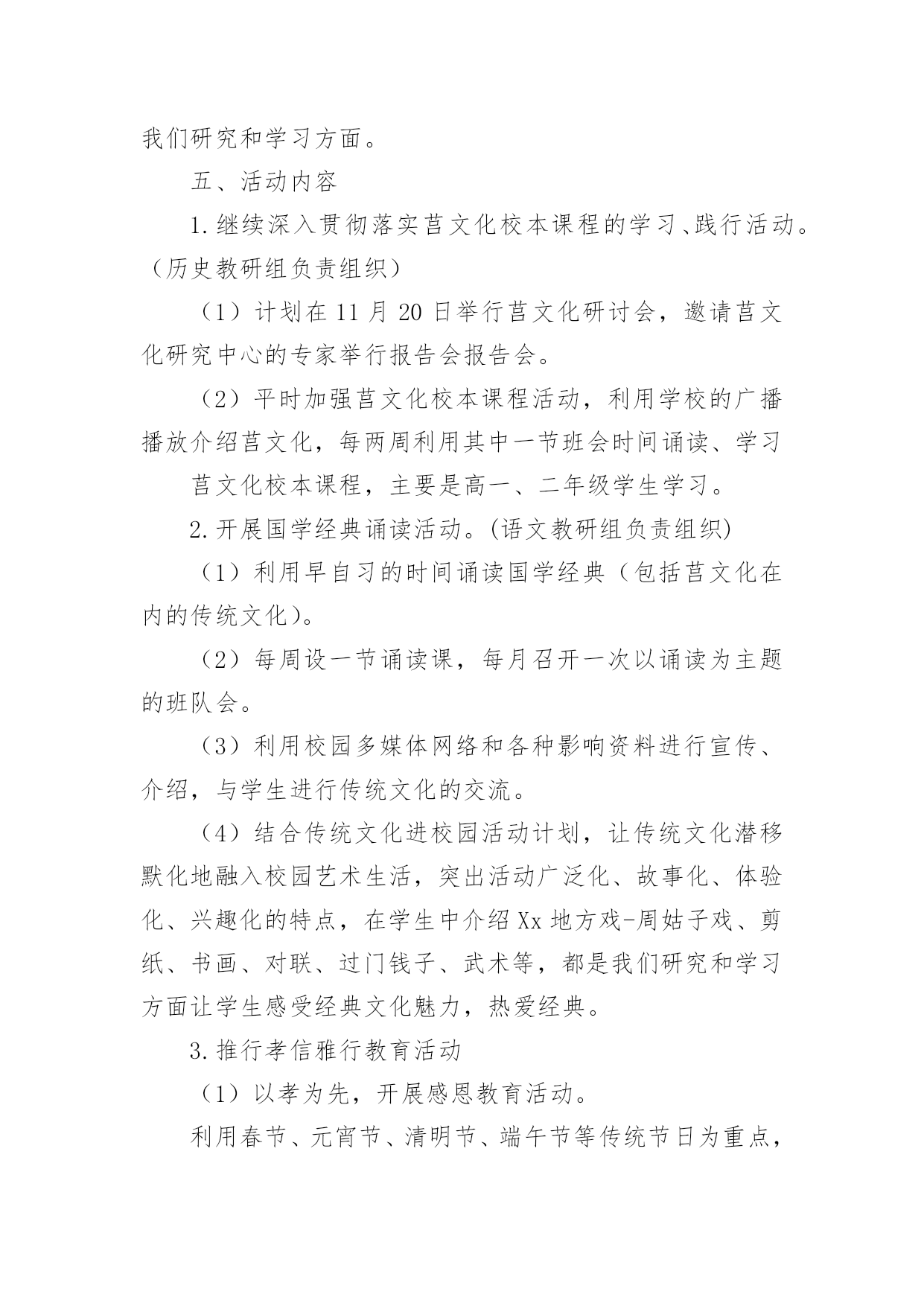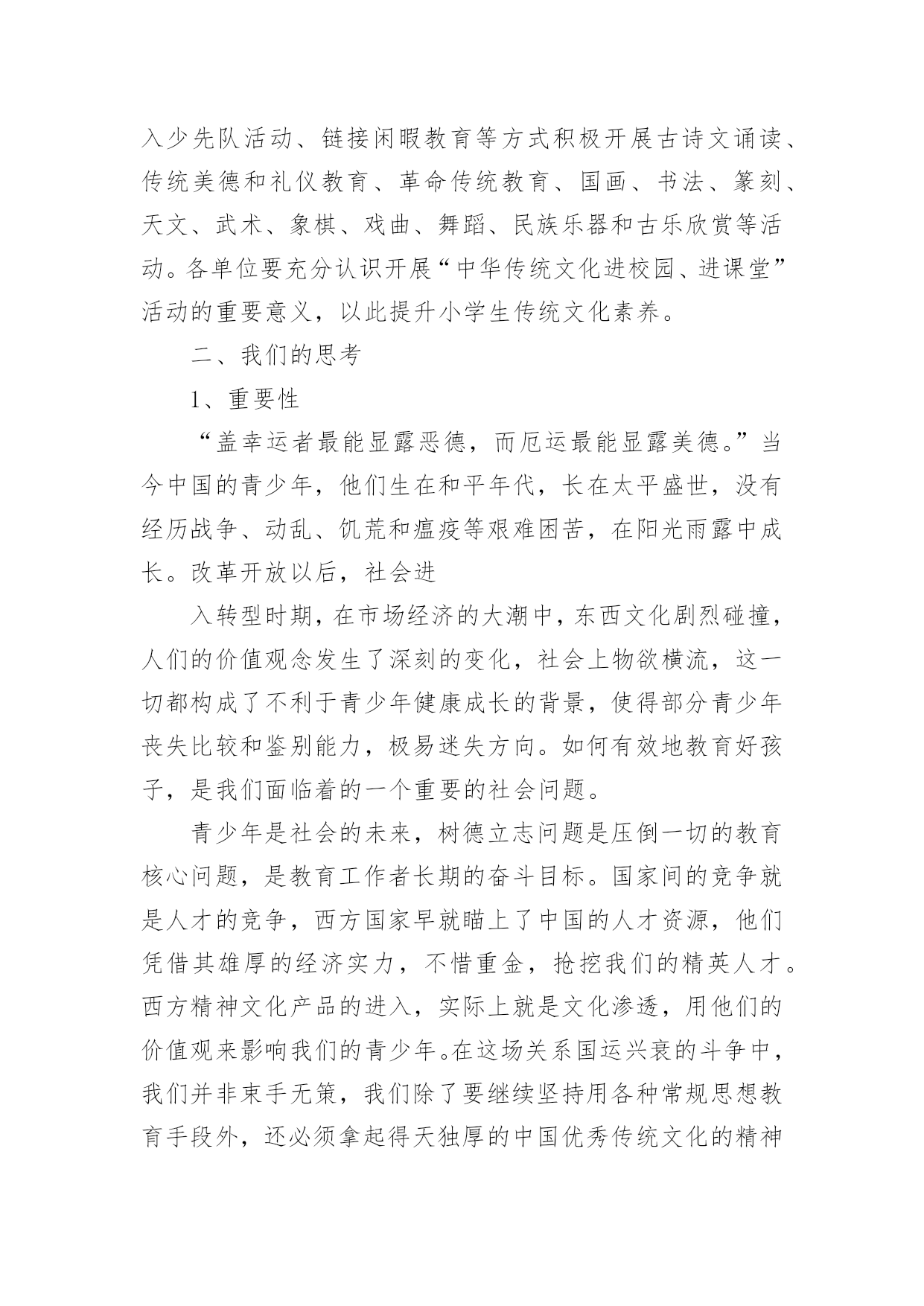 传统文化的校园活动方案为确保事情或工作顺利开展,常常需要提前进行细致的方案准备工作,方案的内容多是上级对下级或涉及面比较大的工作,一般都用带“文件头”形式下发。方案应该怎么制定呢?以下是小编为大家收集的传统文化的校园活动方案,欢迎大家分享。传统文化的校园活动方案1一、指导思想文化作为人类活动的结晶,集中反映了民族精神、民族生活和民族经验。每一部伟大的作品都来自于时代、民族、国家以及整个人类进步发展的深刻关心与思考,承载和传递着民族的血液和精髓,是特定历史时期社会生活的百科全书。《国家“xx”时期文化发展规划纲要》指出,今后中小学各学科课程都要结合学科特点融入中华优秀传统文化内容,要在有条件的小学开设书法、绘画、武术等课程,以加强中国传统文化的教育。xx在美国耶鲁大学演讲时指出:“一个民族的文化,往往凝聚着这个民族对世界和生命的历史认知和现实感受,也往往积淀着这个民族最深层的精神追求和行为准则。”基于以上认识,着眼于全面推进素质教育,深化人文素质教育,努力加强小学生传统文化教育,加强学生的特长培养,尊重学生的个性发展,坚持以引导激励为主、多方面渗透熏陶的原则,采取结合各科教学、融入校本课程、融入少先队活动、链接闲暇教育等方式积极开展古诗文诵读、传统美德和礼仪教育、革命传统教育、国画、书法、篆刻、天文、武术、象棋、戏曲、舞蹈、民族乐器和古乐欣赏等活动。各单位要充分认识开展“中华传统文化进校园、进课堂”活动的重要意义,以此提升小学生传统文化素养。二、我们的思考1、重要性“盖幸运者最能显露恶德,而厄运最能显露美德。”当今中国的青少年,他们生在和平年代,长在太平盛世,没有经历战争、动乱、饥荒和瘟疫等艰难困苦,在阳光雨露中成长。改革开放以后,社会进入转型时期,在市场经济的大潮中,东西文化剧烈碰撞,人们的价值观念发生了深刻的变化,社会上物欲横流,这一切都构成了不利于青少年健康成长的背景,使得部分青少年丧失比较和鉴别能力,极易迷失方向。如何有效地教育好孩子,是我们面临着的一个重要的社会问题。青少年是社会的未来,树德立志问题是压倒一切的教育核心问题,是教育工作者长期的奋斗目标。国家间的竞争就是人才的竞争,西方国家早就瞄上了中国的人才资源,他们凭借其雄厚的经济实力,不惜重金,抢挖我们的精英人才。西方精神文化产品的进入,实际上就是文化渗透,用他们的价值观来影响我们的青少年。在这场关系国运兴衰的斗争中,我们并非束手无策,我们除了要继续坚持用各种常规思想教育手段外,还必须拿起得天独厚的中国优秀传统文化的精神武器,不懈地教化和熏陶我们的后代。2、丰富的内涵中华民族的历史发展连绵五千年,积累了丰厚的精神财富,它是中华民族智慧的结晶,也是中华民族精神的体现,它的博大精深早已令世界折服。今天它仍在国家建设和社会生活中发挥作用,也为世界各国所借鉴,这在四大文明古国中是绝无仅有的。以中国传统文化为核心的东方文明领先世界数千年,这是不争的事实,更是中华民族的光荣与骄傲。中国传统文化不仅是唐诗、宋词和元曲,它还涵盖了哲学、政治、经济等所有的社会领域。它教给人们道德伦理、风俗礼仪和修身、齐家、治国、平天下的道理,从中体现了中华民族传统的人生观、价值观、道德观和审美观。正是中国优秀传统文化教化着世世代代的炎黄子孙,铸就了中华民族勤劳勇敢、朴实无华、明礼守信、热爱和平、不畏强暴、自强不息的民族秉性。中国传统文化不仅极大地丰富了人类的文化宝库,它也是取之不尽的思想宝藏。面对如此无价的民族瑰宝,我们没有任何理由不充分发掘它来教化子孙,塑造新时代龙的传人。当然,中国传统文化也得在批判中继承,在继承中发展,要与时俱进,不断地完善与发展。三、目标与内容目标:1、传承中国几千年的传统文明;2、了解中国传统文化的内容、表现形式;3、根据自己的兴趣爱好学习有关的传统文化;4、知道中国传统文化对提高中华民族凝聚力的重要性。内容:1、中国书法艺术2、中国传统戏剧(京剧、沪剧、越剧)3、中国传统绘画艺术(国画)4、中国陶瓷文化5、中华民族服装6、中国茶文化7、中国酒文化8、中国传统文学艺术(唐诗、宋词)9、中华民族音乐(含民族器乐)四、我们的设想与做法设想:针对青少年学生思想品德的需要,除思想品德课外,我们觉得还应对语文等课程、教材做相应的改革和调整,突出重点,强化中华传统文化精神的教育。教学形式应力求生动活泼,注意实效。可精选体现中华优秀传统文化精神题材的专题视听资料(或反映有关中国历代杰出人物的生平事迹,或展现祖国壮美山河、风土人情、历史文化的资料)加以编辑整理,形成系列教材,有计划地纳入德育课堂。此外,学校要利用各种形式,有目的地强化学生对中国传统文化精神的认知,通过中国传统文化的教育让小学生了解祖国灿烂的文化,悠久的历史,传承中华传统文化,有助于增强民族自豪感,激发热爱祖国的情感。让