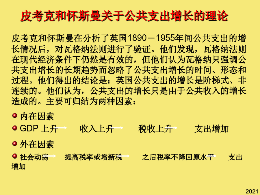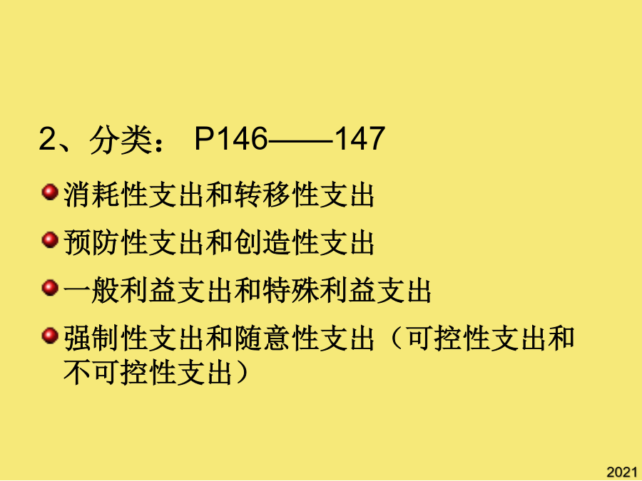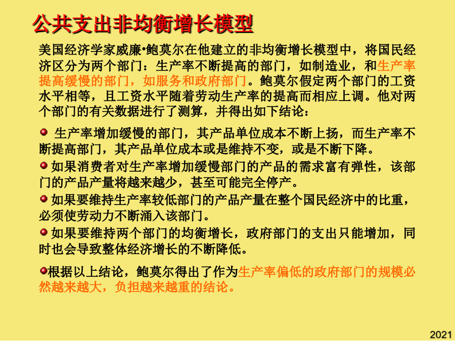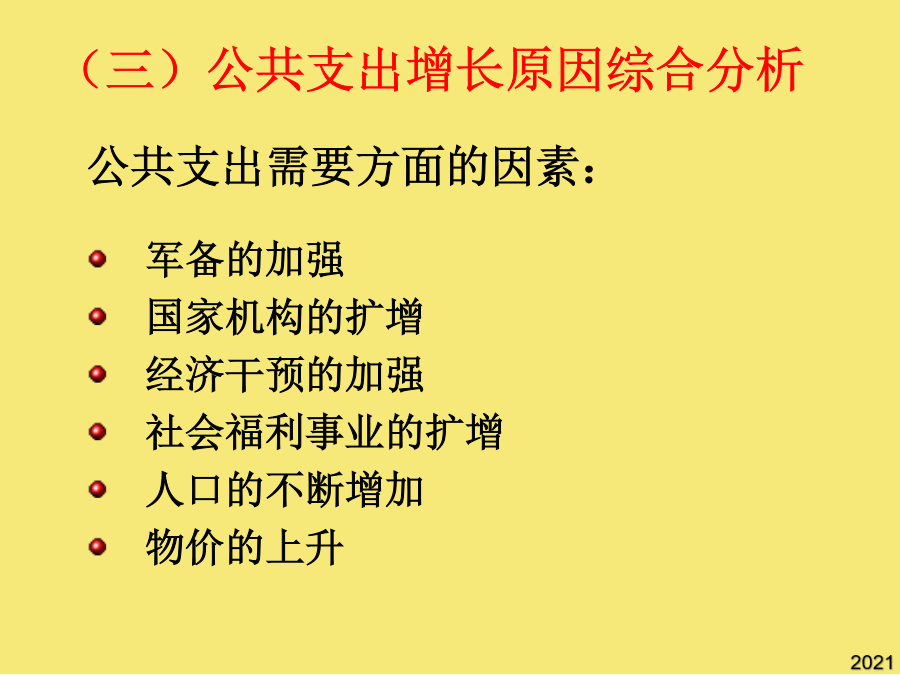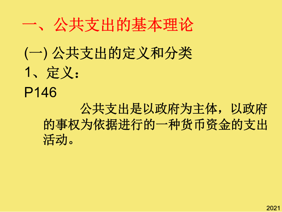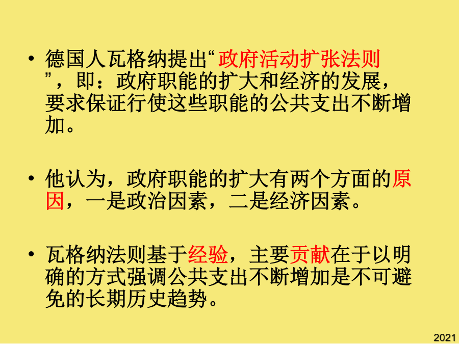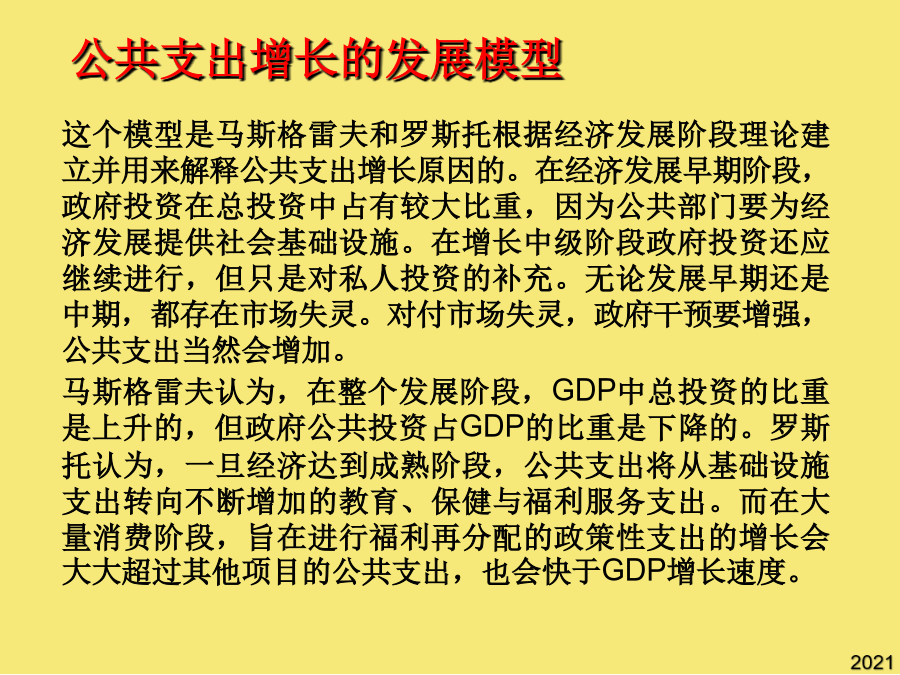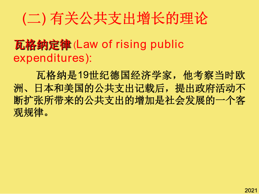 第六章:公共支出的理论与实践一、公共支出的基本理论(二)有关公共支出增长的理论德国人瓦格纳提出“政府活动扩张法则”,即:政府职能的扩大和经济的发展,要求保证行使这些职能的公共支出不断增加。他认为,政府职能的扩大有两个方面的原因,一是政治因素,二是经济因素。瓦格纳法则基于经验,主要贡献在于以明确的方式强调公共支出不断增加是不可避免的长期历史趋势。皮考克和怀斯曼关于公共支出增长的理论公共支出增长的发展模型公共支出非均衡增长模型(三)公共支出增长原因综合分析财政资源供给方面的因素:(四)公共支出的原则二、公共支出的结构(二)公共转移性支出(transferringexpenditure)社会保障支出社会保险社会救济其他社会保障财政补贴价格补贴企业亏损补贴财政贴息职工和居民生活补贴税收支出和税前还贷一、公共支出的基本理论例如,新建的公路使车祸发生的次数减少,使得人们节约了路程上所耗的时间及增加了舒适性。增发不兑现纸币可能性的存在改善医疗条件,每花费4.例:水力发电工程的成本和收益发行公债便利条件的增加食品券补贴可以有效地增加受领者的食品消费量。2、分类:P146——147社会文教费(减去抚恤和社会福利救济费)社会保障支出(抚恤支出和社会救济福利费)投资领域:市场失灵领域n为所分析的项目持续的时间;2、分类:P146——147(三)公共支出的经济影响转移性支出对经济影响的实证分析其他物品的支出2、公共部门成本-收益分析的特点社会文教费(减去抚恤和社会福利救济费)(二)有关公共支出增长的理论预防性支出和创造性支出财政价格补贴(表8-9)转移性支出的影响:食品补贴而对民航来说,只是中间产品,提供中间收益。食品券补贴可以有效地提高受领者所获得的效用水平。在增长中级阶段政府投资还应继续进行,但只是对私人投资的补充。公共支出/国民生产总值中间收益是加入其他产品生产而间接提供的收益。从表中可以看出,转移性支出的增长速度快于消耗性支出。第三,对每一种投入和产出进行估价;食品券补贴可以有效地增加受领者的食品消费量。1.在国民经济总量中,公共支出占有较大份额。例:水力发电工程的成本和收益横向公平:同等对待同一层次的居民其他物品的支出三、公共支出的成本-收益分析公共支出的趋势:强制性支出和随意性支出(可控性支出和不可控性支出)发行公债便利条件的增加食品券补贴可以有效地提高受领者所获得的效用水平。社会文教费(减去抚恤和社会福利救济费)1绝对规模(公共支出总额的增长趋势)第一,公共部门进行经济决策要以社会福利极大化为目标,而不能像私人经济部门一样仅以利润为目标。所以从整体上看,它无法反映社会的净收益或净损失。瓦格纳定律(Lawofrisingpublicexpenditures):在增长中级阶段政府投资还应继续进行,但只是对私人投资的补充。真实收益反映着社会福利的增加。从表中可以看出,转移性支出的增长速度快于消耗性支出。食品券补贴可以有效地增加受领者的食品消费量。三、经合组织国家公共支出分析德国人瓦格纳提出“政府活动扩张法则”,即:政府职能的扩大和经济的发展,要求保证行使这些职能的公共支出不断增加。为全体公民每人生产一只防毒面具,每花费150万元少死一人。直接的与间接的直接的成本和收益是与项目的主要目标密切联系的。间接的成本和收益则属于项目的副产品。例如,由于某地区风景区的开发,旅游业的发展为当地的直接收益,而由于游客的增多引起该地区的开放和经济的发展为间接收益。有形的和无形的无形的成本和收益是不能以市场货币价值计量的成本和收益。例如,新建的公路使车祸发生的次数减少,使得人们节约了路程上所耗的时间及增加了舒适性。在交通建设中,这些收益是无形的,但却是社会的实质收益。中间的和最终的中间收益是加入其他产品生产而间接提供的收益。最终收益则属最终产品提供的收益。例如天气预报服务对那些计划郊游的人来说,提供最终收益。而对民航来说,只是中间产品,提供中间收益。内部的和外部的在所辖区域内或外发生的收益或成本。例如,新建水坝不仅使水坝所在地区得益,而且水坝拦截河流所经其他地区也会有收益。例:水力发电工程的成本和收益(二)成本和收益的衡量:社会收益价值的评估——消费者剩余贴现公式:成本-收益分析的指标净现值的计算公式:求内在报酬率要用试差法和内推法:成本效果分析三、经合组织国家公共支出分析公共支出的趋势:对经合组织国家公共支出规模和机构实证分析的几点结论:1.在国民经济总量中,公共支出占有较大份额。2.国家财政已经突破了传统的公共开支范围。3.在公共支出结构中,国家日益重视社会性支出。(二)公共支出结构分析消耗性支出和转移性支出