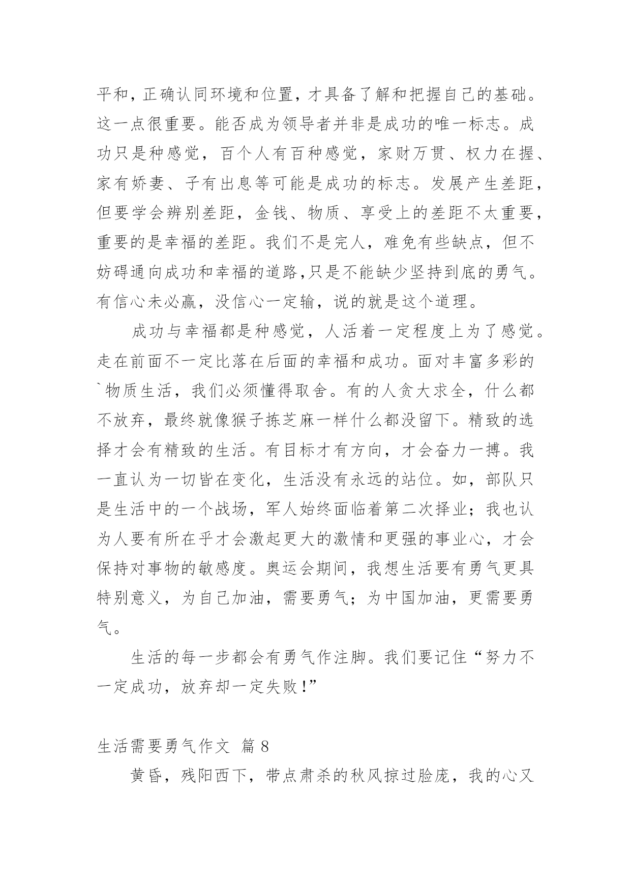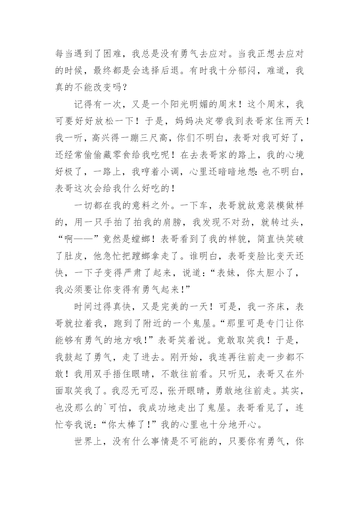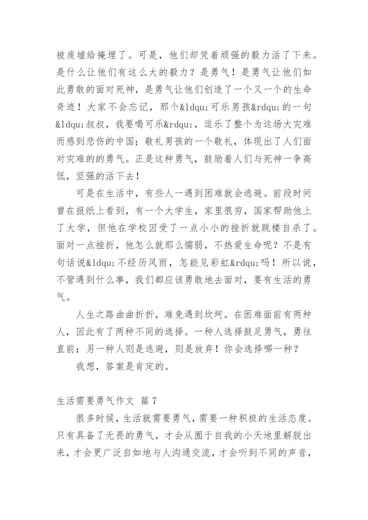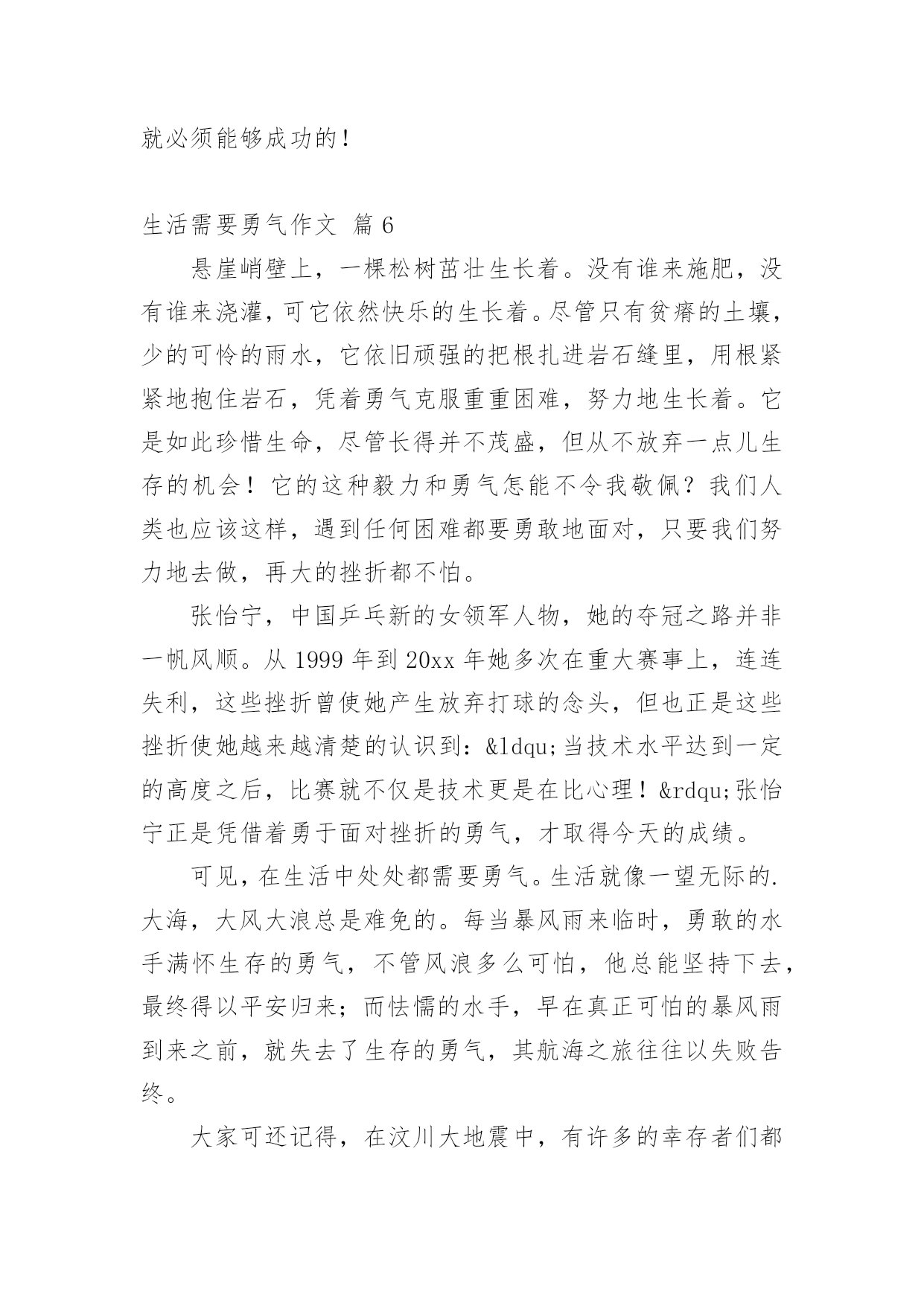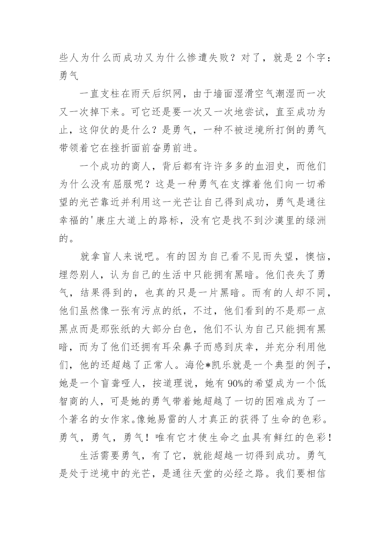 生活需要勇气作文(优秀)生活需要勇气作文8篇在学习、工作乃至生活中,大家或多或少都会接触过作文吧,作文根据写作时限的不同可以分为限时作文和非限时作文。怎么写作文才能避免踩雷呢?下面是小编为大家收集的生活需要勇气作文8篇,供大家参考借鉴,希望可以帮助到有需要的朋友。生活需要勇气作文篇1有勇气——一个用来概括男子汉大丈夫的词语。有勇气——从表面上看就是“胆大”,在听“鬼”时,从来不流露出一点慌张的神色;在深更半夜,自己在家而毫不畏惧;在欺负你的人露面之际,狠狠地还几下手。是的,这确实是有勇气的表现,不过单有这些还是不够的——这些并不是有勇气的真正意义。我认为,真正的有勇气,最基本的就是“敢做敢当”。自己做了件错事,被揭穿后,你死活不承认,那你不单单是个犯错的人,你还是个懦夫——更遭人鄙视。有时,认错能够挽回一切。可是,如果你只为了一时地护住你那颗胆小而虚荣的.心,那么,将会有更大的痛苦向你袭来。承认错误也是比较难的,它需要你鼓足勇气,花去你不少胆量,但比起更大的痛苦,还是吹大你的那个“勇气”球,认错总比否认好。其次,是要勇于尝试。在漫漫的长河中,为什么不去尝试着换乘别的船呢?你不要紧紧地抱着自己船上的椅子,或许另外一些船会更快地带你游到成功的终点,为何不试一试其它方法呢?一些成功的富商,他们都是敢于投资给许多家企业,然后在他大胆投资的一家企业中猛然暴富。一切都在于他当时的勇于尝试,有勇气去实践。要有勇气换乘另一条船,不要因为船票太贵或代价太大而放弃了这次宝贵的机会。或许在你勇敢的尝试中,你已经不知不觉地步入了成功的殿堂。最后,是很主要的一点——勇气等于自信。一只自信的风筝,被一条勇气的线系着,你觉着自己的风筝很丑,自己也放不好,那么你一点也没勇气,一点也不自信。上课时,我们有什么理由没有勇气发言?难道你一旦站起来,你那懦弱而不自信的灵魂就化为一缕青烟飘向西天去了吗?你缺少勇气、没有自信心,如何能在这个世上好好活下去呢?我们应当放飞自信的风筝,让勇气牵引着它,然后对着一切勇敢的大喊:“我有勇气,我能行!”勇气在中十分可贵,如果没有了勇气,我们的生活能否绚丽?生活需要勇气作文篇2走在每个路的转角,与你擦肩而过的人是低头叹气,还是昂头飞奔。在人海中,今日受挫折明日振作后成功的人你认识几个?受到打击不敢再次抬头的人你又认识几个?这些人为什么而成功又为什么惨遭失败?对了,就是2个字:勇气一直支柱在雨天后织网,由于墙面湿滑空气潮湿而一次又一次掉下来。可它还是要一次又一次地尝试,直至成功为止,这仰仗的是什么?是勇气,一种不被逆境所打倒的勇气带领着它在挫折面前奋勇前进。一个成功的商人,背后都有许许多多的血泪史,而他们为什么没有屈服呢?这是一种勇气在支撑着他们向一切希望的光芒靠近并利用这一光芒让自己得到成功,勇气是通往幸福的'康庄大道上的路标,没有它是找不到沙漠里的绿洲的。就拿盲人来说吧。有的因为自己看不见而失望,懊恼,埋怨别人,认为自己的生活中只能拥有黑暗。他们丧失了勇气,结果得到的,也真的只是一片黑暗。而有的人却不同,他们虽然像一张有污点的纸,不过,他们看到的不是那一点黑点而是那张纸的大部分白色,他们不认为自己只能拥有黑暗,而为了他们还拥有耳朵鼻子而感到庆幸,并充分利用他们,他的还超越了正常人。海伦*凯乐就是一个典型的例子,她是一个盲聋哑人,按道理说,她有90%的希望成为一个低智商的人,可是她的勇气带着她超越了一切的困难成为了一个著名的女作家。像她易雷的人才真正的获得了生命的色彩。勇气,勇气,勇气!唯有它才使生命之血具有鲜红的色彩!生活需要勇气,有了它,就能超越一切得到成功。勇气是处于逆境中的光芒,是通往天堂的必经之路。我们要相信有一扇门关上,必有另一扇门为你打开,而打开这扇门所需的钥匙,就是:勇气。生活需要勇气作文篇3“狭路相逢勇者胜”。做任何事都需要十足的勇气,没有勇气就克服不了困难,没有勇气就改正不了错误,没有勇气就取得不了成功。在我们的学习、生活、工作中,勇气是至关重要的。蜀国大将关羽,过五关,斩六将;赵子龙长阪坡单骑救主,夺阿斗;楚霸王项羽,破釜沉舟,背水一战,成就霸业。这些人无不是当时的英雄,他们无不具备巨大的勇气,勇气使他们成为世人敬仰的英雄。勇气是成功的保证,每当面临抉择,许多人会犹豫不决,也会因此错过瞬息即逝的机会。但如果拥有当机立断的`魄力与勇气,机会就不会溜走。有这么一个故事。一个国王没有儿子,他要选一个民间的孩子,作为他的继承人,他给每个孩子一粒种子,让他们种出花来。规定日期到了,许多孩子在家长的陪同下,捧着鲜艳的花朵来到王宫,惟独有一个孩子,他手捧空花盆,国王看到了,立即召见了这个孩子,封他做了王位继承人。原来国王给的都是煮熟的种子,那些种出花的孩子当然都没资格当上继承人。孩子面临的抉择是巨大的,如果他捧着空花盆去
