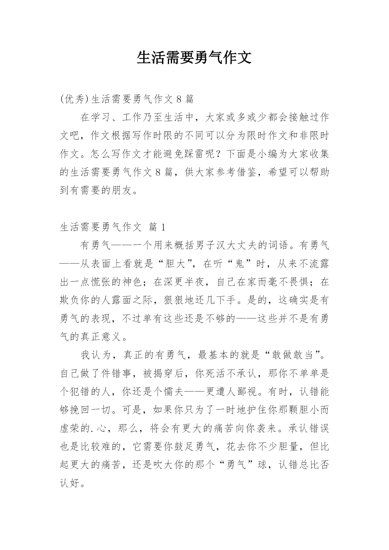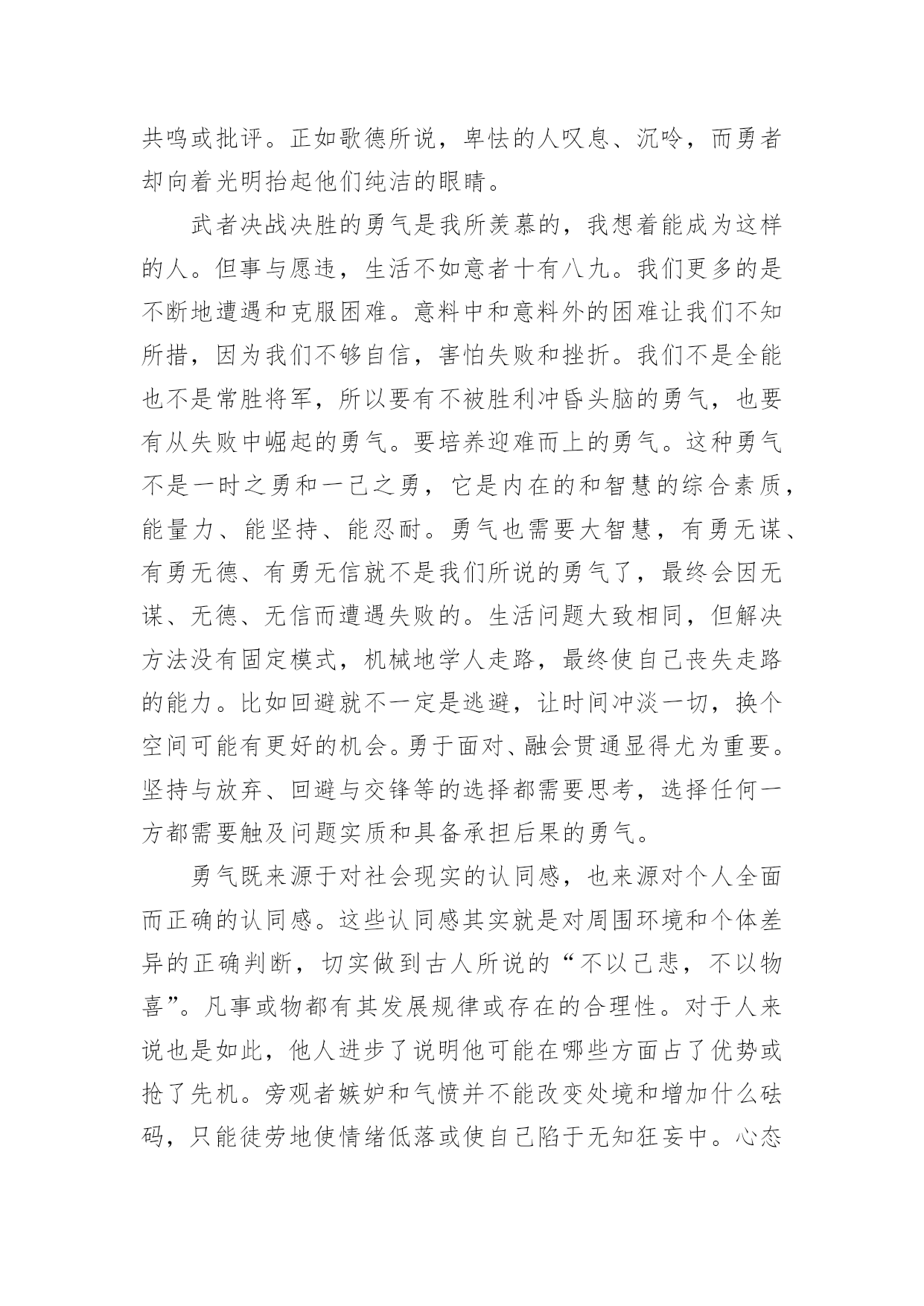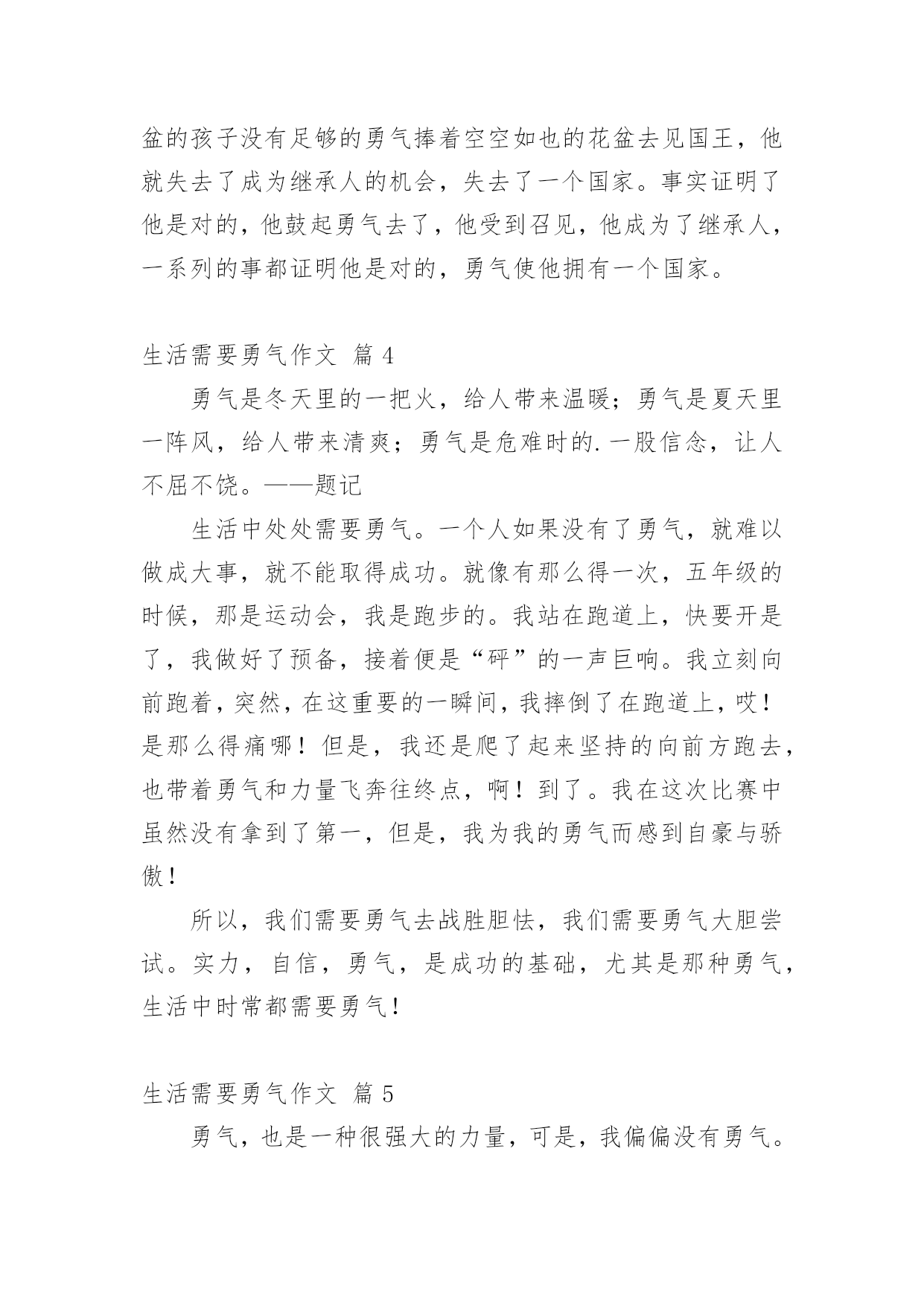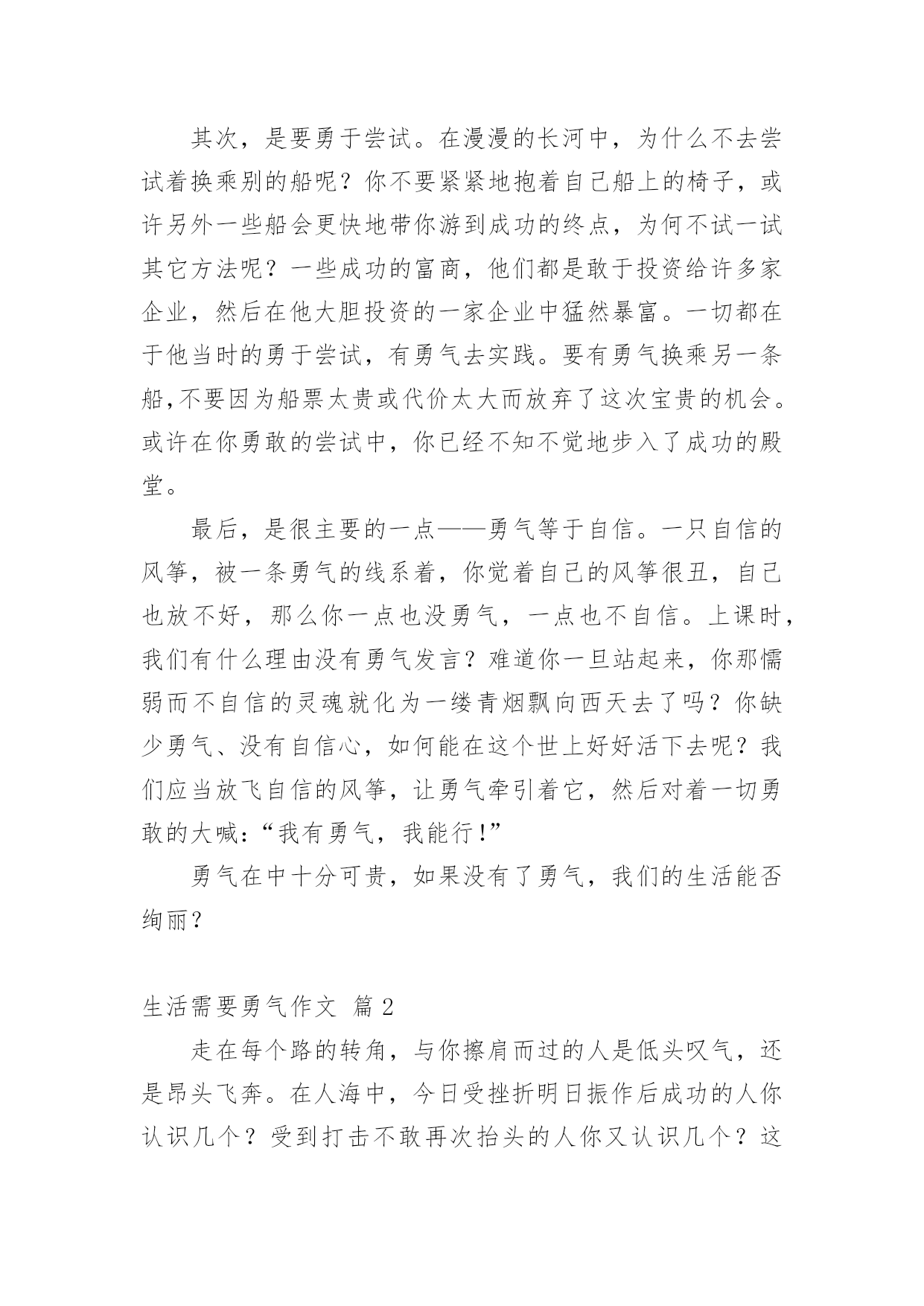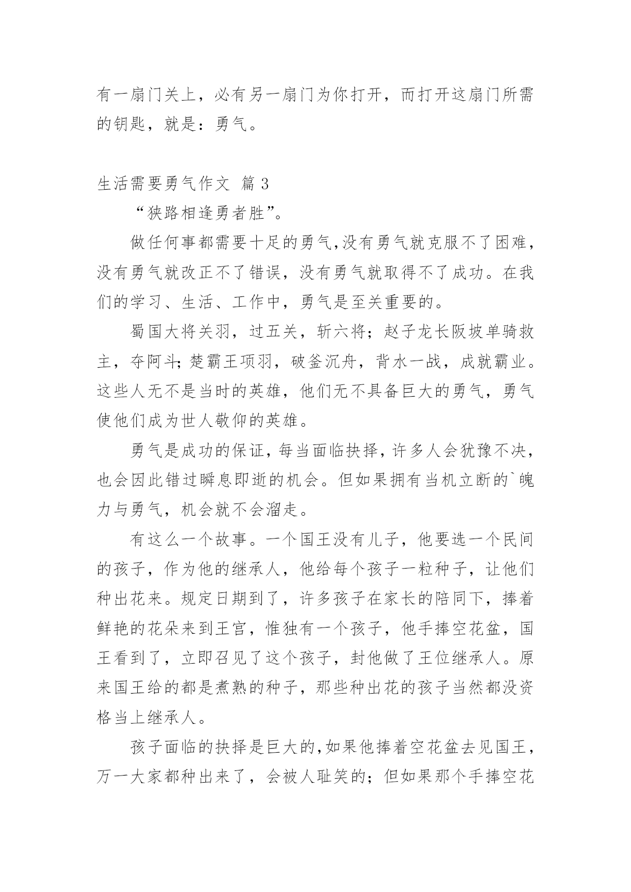 生活需要勇气作文(优秀)生活需要勇气作文8篇在学习、工作乃至生活中,大家或多或少都会接触过作文吧,作文根据写作时限的不同可以分为限时作文和非限时作文。怎么写作文才能避免踩雷呢?下面是小编为大家收集的生活需要勇气作文8篇,供大家参考借鉴,希望可以帮助到有需要的朋友。生活需要勇气作文篇1有勇气——一个用来概括男子汉大丈夫的词语。有勇气——从表面上看就是“胆大”,在听“鬼”时,从来不流露出一点慌张的神色;在深更半夜,自己在家而毫不畏惧;在欺负你的人露面之际,狠狠地还几下手。是的,这确实是有勇气的表现,不过单有这些还是不够的——这些并不是有勇气的真正意义。我认为,真正的有勇气,最基本的就是“敢做敢当”。自己做了件错事,被揭穿后,你死活不承认,那你不单单是个犯错的人,你还是个懦夫——更遭人鄙视。有时,认错能够挽回一切。可是,如果你只为了一时地护住你那颗胆小而虚荣的.心,那么,将会有更大的痛苦向你袭来。承认错误也是比较难的,它需要你鼓足勇气,花去你不少胆量,但比起更大的痛苦,还是吹大你的那个“勇气”球,认错总比否认好。其次,是要勇于尝试。在漫漫的长河中,为什么不去尝试着换乘别的船呢?你不要紧紧地抱着自己船上的椅子,或许另外一些船会更快地带你游到成功的终点,为何不试一试其它方法呢?一些成功的富商,他们都是敢于投资给许多家企业,然后在他大胆投资的一家企业中猛然暴富。一切都在于他当时的勇于尝试,有勇气去实践。要有勇气换乘另一条船,不要因为船票太贵或代价太大而放弃了这次宝贵的机会。或许在你勇敢的尝试中,你已经不知不觉地步入了成功的殿堂。最后,是很主要的一点——勇气等于自信。一只自信的风筝,被一条勇气的线系着,你觉着自己的风筝很丑,自己也放不好,那么你一点也没勇气,一点也不自信。上课时,我们有什么理由没有勇气发言?难道你一旦站起来,你那懦弱而不自信的灵魂就化为一缕青烟飘向西天去了吗?你缺少勇气、没有自信心,如何能在这个世上好好活下去呢?我们应当放飞自信的风筝,让勇气牵引着它,然后对着一切勇敢的大喊:“我有勇气,我能行!”勇气在中十分可贵,如果没有了勇气,我们的生活能否绚丽?生活需要勇气作文篇2走在每个路的转角,与你擦肩而过的人是低头叹气,还是昂头飞奔。在人海中,今日受挫折明日振作后成功的人你认识几个?受到打击不敢再次抬头的人你又认识几个?这些人为什么而成功又为什么惨遭失败?对了,就是2个字:勇气一直支柱在雨天后织网,由于墙面湿滑空气潮湿而一次又一次掉下来。可它还是要一次又一次地尝试,直至成功为止,这仰仗的是什么?是勇气,一种不被逆境所打倒的勇气带领着它在挫折面前奋勇前进。一个成功的商人,背后都有许许多多的血泪史,而他们为什么没有屈服呢?这是一种勇气在支撑着他们向一切希望的光芒靠近并利用这一光芒让自己得到成功,勇气是通往幸福的'康庄大道上的路标,没有它是找不到沙漠里的绿洲的。就拿盲人来说吧。有的因为自己看不见而失望,懊恼,埋怨别人,认为自己的生活中只能拥有黑暗。他们丧失了勇气,结果得到的,也真的只是一片黑暗。而有的人却不同,他们虽然像一张有污点的纸,不过,他们看到的不是那一点黑点而是那张纸的大部分白色,他们不认为自己只能拥有黑暗,而为了他们还拥有耳朵鼻子而感到庆幸,并充分利用他们,他的还超越了正常人。海伦*凯乐就是一个典型的例子,她是一个盲聋哑人,按道理说,她有90%的希望成为一个低智商的人,可是她的勇气带着她超越了一切的困难成为了一个著名的女作家。像她易雷的人才真正的获得了生命的色彩。勇气,勇气,勇气!唯有它才使生命之血具有鲜红的色彩!生活需要勇气,有了它,就能超越一切得到成功。勇气是处于逆境中的光芒,是通往天堂的必经之路。我们要相信有一扇门关上,必有另一扇门为你打开,而打开这扇门所需的钥匙,就是:勇气。生活需要勇气作文篇3“狭路相逢勇者胜”。做任何事都需要十足的勇气,没有勇气就克服不了困难,没有勇气就改正不了错误,没有勇气就取得不了成功。在我们的学习、生活、工作中,勇气是至关重要的。蜀国大将关羽,过五关,斩六将;赵子龙长阪坡单骑救主,夺阿斗;楚霸王项羽,破釜沉舟,背水一战,成就霸业。这些人无不是当时的英雄,他们无不具备巨大的勇气,勇气使他们成为世人敬仰的英雄。勇气是成功的保证,每当面临抉择,许多人会犹豫不决,也会因此错过瞬息即逝的机会。但如果拥有当机立断的`魄力与勇气,机会就不会溜走。有这么一个故事。一个国王没有儿子,他要选一个民间的孩子,作为他的继承人,他给每个孩子一粒种子,让他们种出花来。规定日期到了,许多孩子在家长的陪同下,捧着鲜艳的花朵来到王宫,惟独有一个孩子,他手捧空花盆,国王看到了,立即召见了这个孩子,封他做了王位继承人。原来国王给的都是煮熟的种子,那些种出花的孩子当然都没资格当上继承人。孩子面临的抉择是巨大的,如果他捧着空花盆去