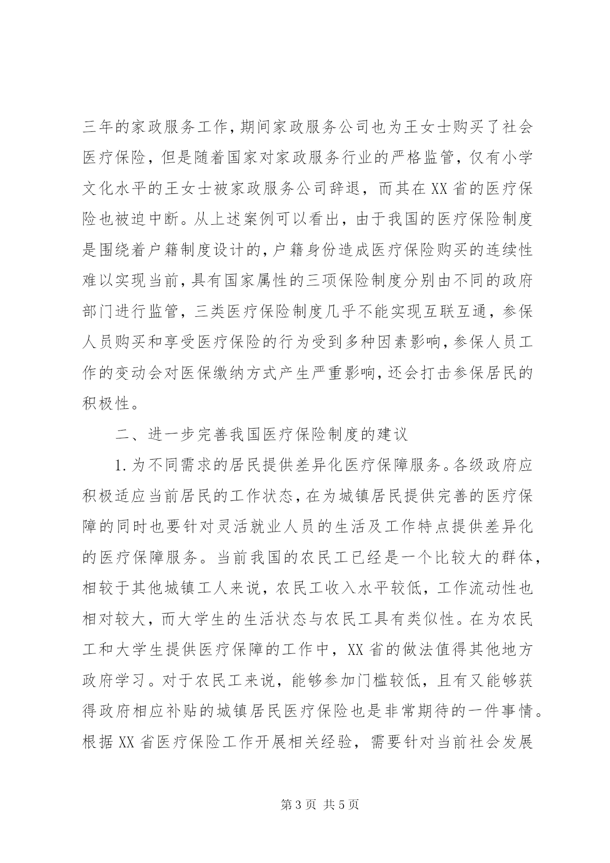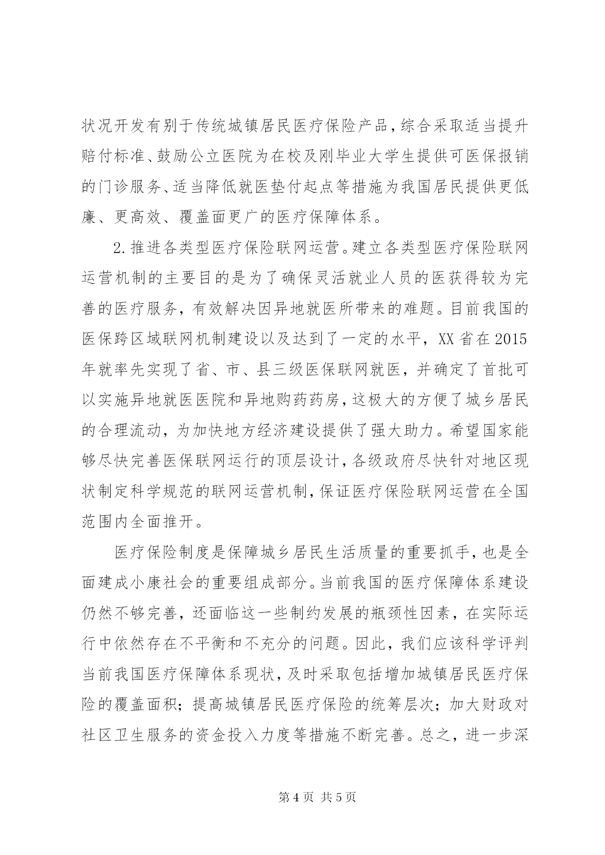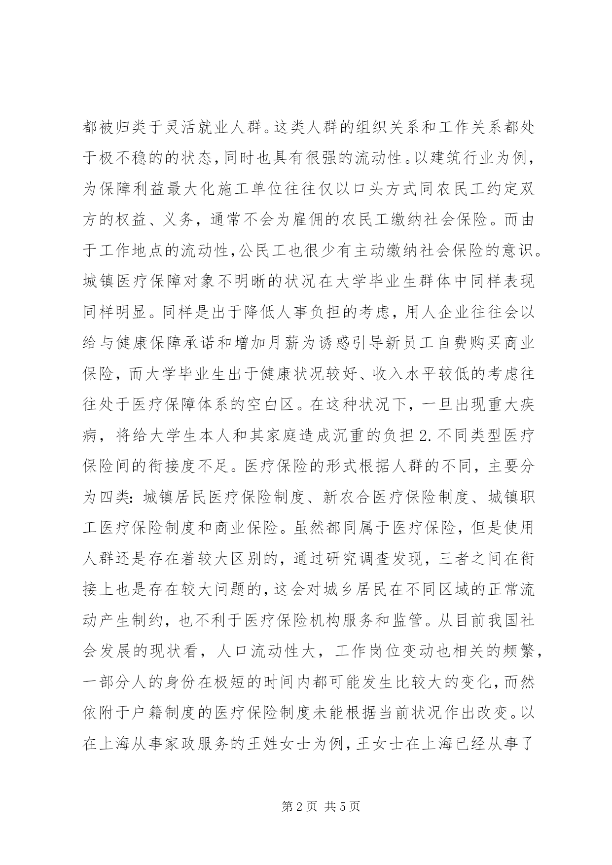 第PAGE\*Arabic\*MERGEFORMAT5页共NUMPAGES\*MERGEFORMAT5页城镇医疗保险完善对策【摘要】随着我国社会经济的不断发展,政府部门越来越重视城乡居民的医疗健康问题,为此,还建立了覆盖城乡的医疗保险体系。到目前为止,我国城镇局面医疗保险工作的开展也的确取得了比较显著的成效。但是通过深入研究调查发现,医疗保险的购买,使用等现状却并不乐观,本文将对此展开浅析,并提出相应的完善对策。【关键词】医院保险现状;完善对策;展开2007年以来新医改在全国范围内全面推开,相对应的,我国新型城镇医疗保险试点工作也在各大城市陆续开展。随着医疗体制改革的不断深入,我国城镇医疗保险也逐渐暴露出一些体制机制性问题,如城镇医疗保障覆盖范围过小,保障对象不明确,医疗保障力度不足等问题,部分城镇居民“看病难、看病贵”问题依然严峻。这些现存问题会对我国医疗卫生体制改革的继续深入产生严重影响,各级政府应认真研究当前问题,寻求解决对策,保障医疗保险改革工作的深入开展。一、城镇医疗保险当前的主要问题1.城镇医疗保障对象不明晰。我国是具有中国特色的社会主义国家,医疗保险制度应着重突出普惠性和公平性。此外,随着我国城镇化率的不断提升,我国居民的就业状态和生活状态也呈现很多新的特点。当前我国下岗职工、农民工和下岗失业人员等都被归类于灵活就业人群。这类人群的组织关系和工作关系都处于极不稳的的状态,同时也具有很强的流动性。以建筑行业为例,为保障利益最大化施工单位往往仅以口头方式同农民工约定双方的权益、义务,通常不会为雇佣的农民工缴纳社会保险。而由于工作地点的流动性,公民工也很少有主动缴纳社会保险的意识。城镇医疗保障对象不明晰的状况在大学毕业生群体中同样表现同样明显。同样是出于降低人事负担的考虑,用人企业往往会以给与健康保障承诺和增加月薪为诱惑引导新员工自费购买商业保险,而大学毕业生出于健康状况较好、收入水平较低的考虑往往处于医疗保障体系的空白区。在这种状况下,一旦出现重大疾病,将给大学生本人和其家庭造成沉重的负担2.不同类型医疗保险间的衔接度不足。医疗保险的形式根据人群的不同,主要分为四类:城镇居民医疗保险制度、新农合医疗保险制度、城镇职工医疗保险制度和商业保险。虽然都同属于医疗保险,但是使用人群还是存在着较大区别的,通过研究调查发现,三者之间在衔接上也是存在较大问题的,这会对城乡居民在不同区域的正常流动产生制约,也不利于医疗保险机构服务和监管。从目前我国社会发展的现状看,人口流动性大,工作岗位变动也相关的频繁,一部分人的身份在极短的时间内都可能发生比较大的变化,而然依附于户籍制度的医疗保险制度未能根据当前状况作出改变。以在上海从事家政服务的王姓女士为例,王女士在上海已经从事了三年的家政服务工作,期间家政服务公司也为王女士购买了社会医疗保险,但是随着国家对家政服务行业的严格监管,仅有小学文化水平的王女士被家政服务公司辞退,而其在XX省的医疗保险也被迫中断。从上述案例可以看出,由于我国的医疗保险制度是围绕着户籍制度设计的,户籍身份造成医疗保险购买的连续性难以实现当前,具有国家属性的三项保险制度分别由不同的政府部门进行监管,三类医疗保险制度几乎不能实现互联互通,参保人员购买和享受医疗保险的行为受到多种因素影响,参保人员工作的变动会对医保缴纳方式产生严重影响,还会打击参保居民的积极性。二、进一步完善我国医疗保险制度的建议1.为不同需求的居民提供差异化医疗保障服务。各级政府应积极适应当前居民的工作状态,在为城镇居民提供完善的医疗保障的同时也要针对灵活就业人员的生活及工作特点提供差异化的医疗保障服务。当前我国的农民工已经是一个比较大的群体,相较于其他城镇工人来说,农民工收入水平较低,工作流动性也相对较大,而大学生的生活状态与农民工具有类似性。在为农民工和大学生提供医疗保障的工作中,XX省的做法值得其他地方政府学习。对于农民工来说,能够参加门槛较低,且有又能够获得政府相应补贴的城镇居民医疗保险也是非常期待的一件事情。根据XX省医疗保险工作开展相关经验,需要针对当前社会发展状况开发有别于传统城镇居民医疗保险产品,综合采取适当提升赔付标准、鼓励公立医院为在校及刚毕业大学生提供可医保报销的门诊服务、适当降低就医垫付起点等措施为我国居民提供更低廉、更高效、覆盖面更广的医疗保障体系。2.推进各类型医疗保险联网运营。建立各类型医疗保险联网运营机制的主要目的是为了确保灵活就业人员的医获得较为完善的医疗服务,有效解决因异地就医所带来的难题。目前我国的医保跨区域联网机制建设以及达到了一定的水平,XX省在2015年就率先实现了省、市、县三级医保联网就医,并确定了首批可以实施异地就医医院和异地购药药房,这极大的方便了城乡居民的合理流动,为加快地方经