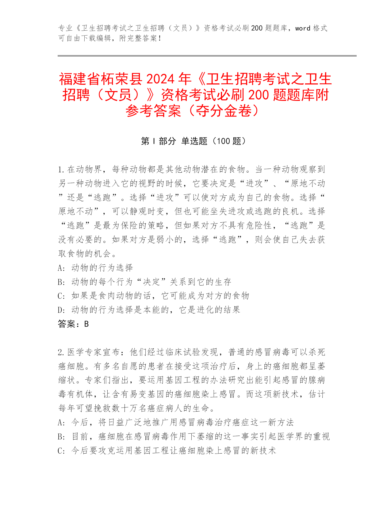 福建省柘荣县2024年《卫生招聘考试之卫生招聘(文员)》考试必刷200题真题题库附参考答案AB卷