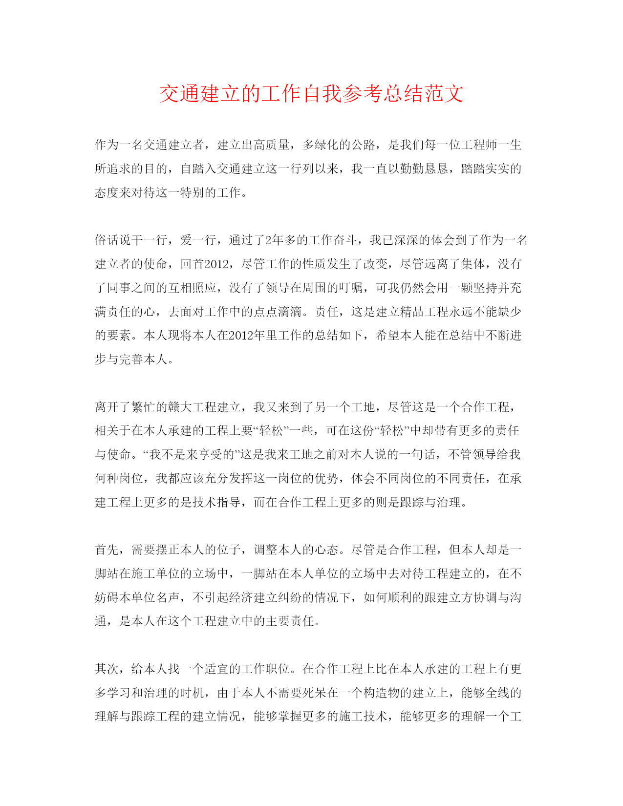 交通建立的工作自我参考总结范文作为一名交通建立者,建立出高质量,多绿化的公路,是我们每一位工程师一生所追求的目的,自踏入交通建立这一行列以来,我一直以勤勤恳恳,踏踏实实的态度来对待这一特别的工作。俗话说干一行,爱一行,通过了2年多的工作奋斗,我已深深的体会到了作为一名建立者的使命,回首2012,尽管工作的性质发生了改变,尽管远离了集体,没有了同事之间的互相照应,没有了领导在周围的叮嘱,可我仍然会用一颗坚持并充满责任的心,去面对工作中的点点滴滴。责任,这是建立精品工程永远不能缺少的要素。本人现将本人在2012年里工作的总结如下,希望本人能在总结中不断进步与完善本人。离开了繁忙的赣大工程建立,我又来到了另一个工地,尽管这是一个合作工程,相关于在本人承建的工程上要“轻松”一些,可在这份“轻松”中却带有更多的责任与使命。“我不是来享受的”这是我来工地之前对本人说的一句话,不管领导给我何种岗位,我都应该充分发挥这一岗位的优势,体会不同岗位的不同责任,在承建工程上更多的是技术指导,而在合作工程上更多的则是跟踪与治理。首先,需要摆正本人的位子,调整本人的心态。尽管是合作工程,但本人却是一脚站在施工单位的立场中,一脚站在本人单位的立场中去对待工程建立的,在不妨碍本单位名声,不引起经济建立纠纷的情况下,如何顺利的跟建立方协调与沟通,是本人在这个工程建立中的主要责任。其次,给本人找一个适宜的工作职位。在合作工程上比在本人承建的工程上有更多学习和治理的时机,由于本人不需要死呆在一个构造物的建立上,能够全线的理解与跟踪工程的建立情况,能够掌握更多的施工技术,能够更多的理解一个工程从开工到完毕的流程以及所需要的投资情况,这就要求本人要学会找事情做,而不是等着事情来找本人。再次,学会自我约束,自我治理。离开了集体,离开了领导,更多的是“自由”,然而怎么样使本人在如此一个工作环境中不会变得懒散,是本人要克服的一个困难,严格要求本人的作息与生活时间,不能特别化,使本人不管在怎么样的环境下,都能保持一种良好的工作与生活适应。最后,感激领导对我的信任,不管本人处于何种岗位,我都希望能发挥出本人最好的一面,交通建立是一项特别的职业,责任心是永远不能缺少的,不同的岗位,一样的责任,希望本人能在2009年有一个好的开场,接着本人的优点,改善本人的缺点。