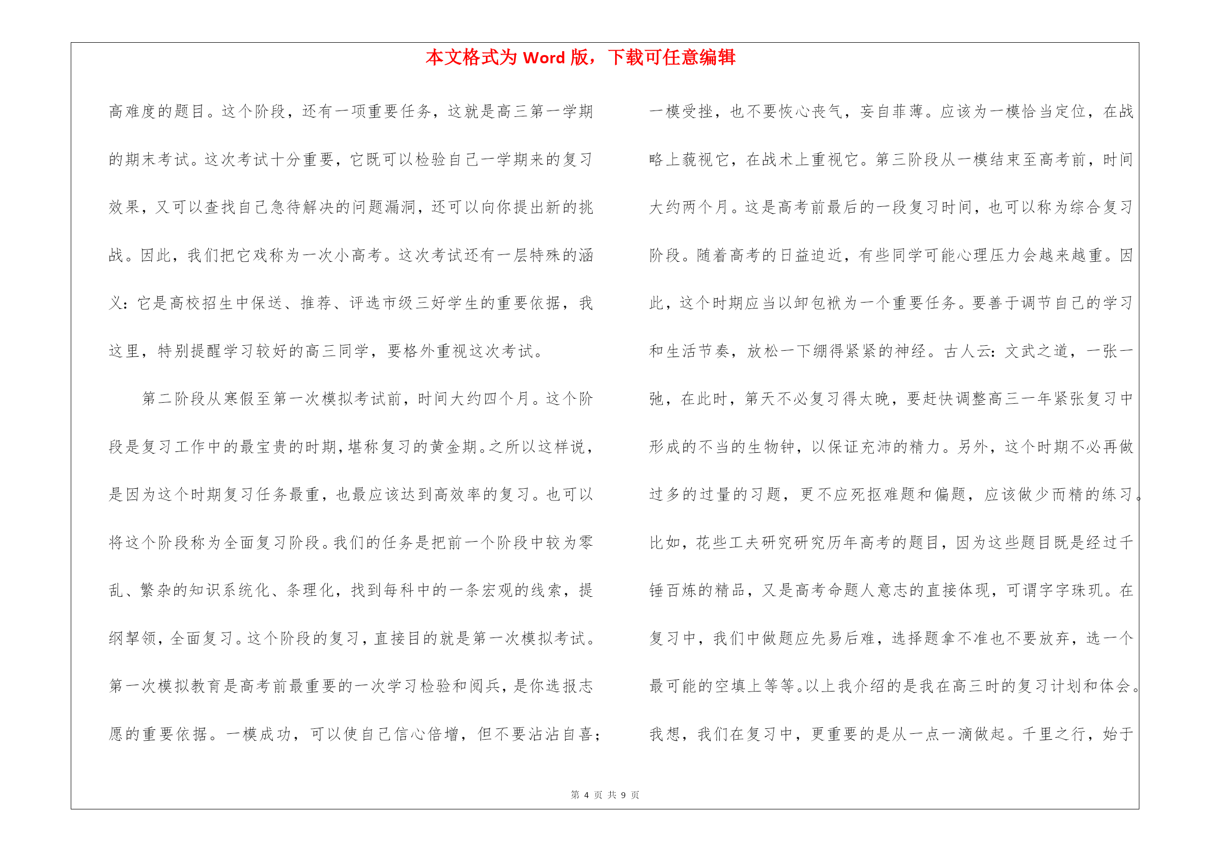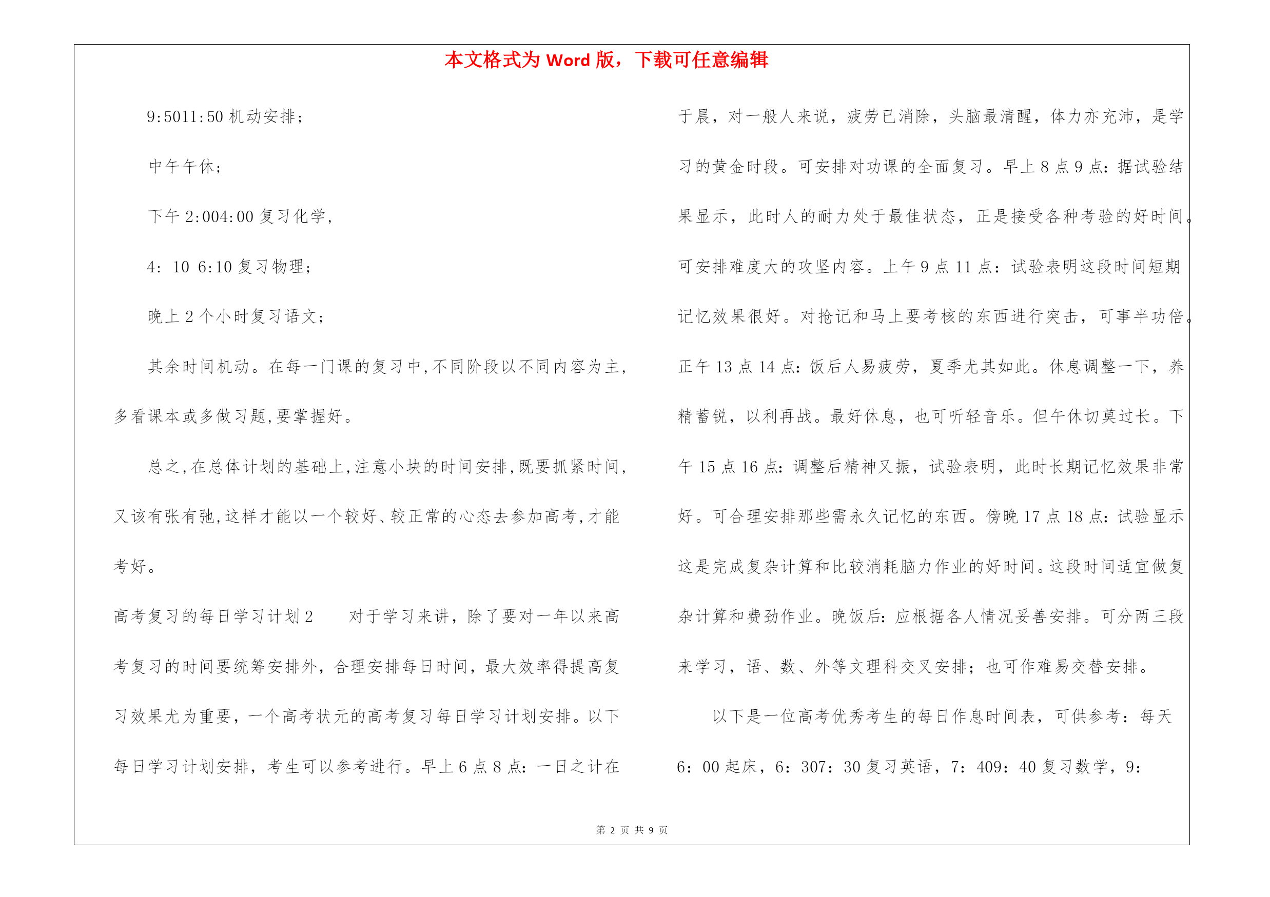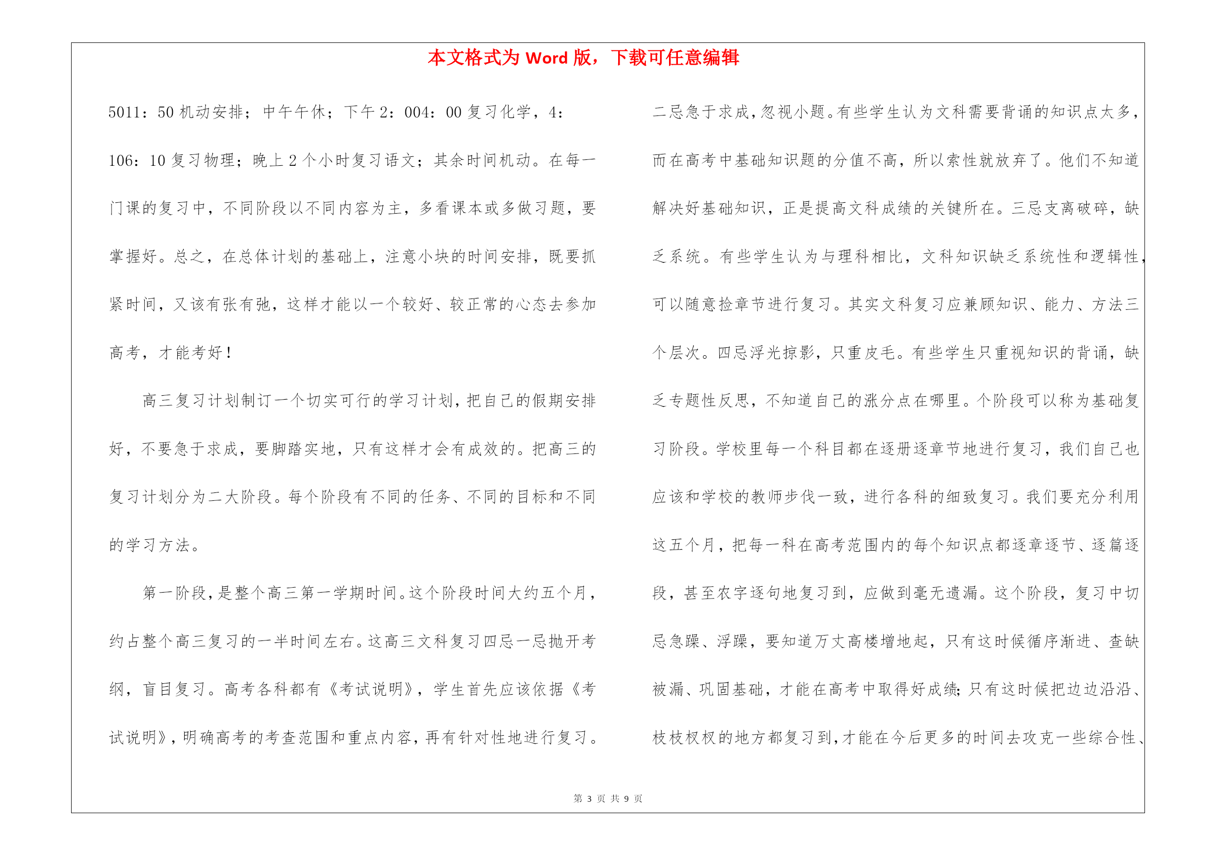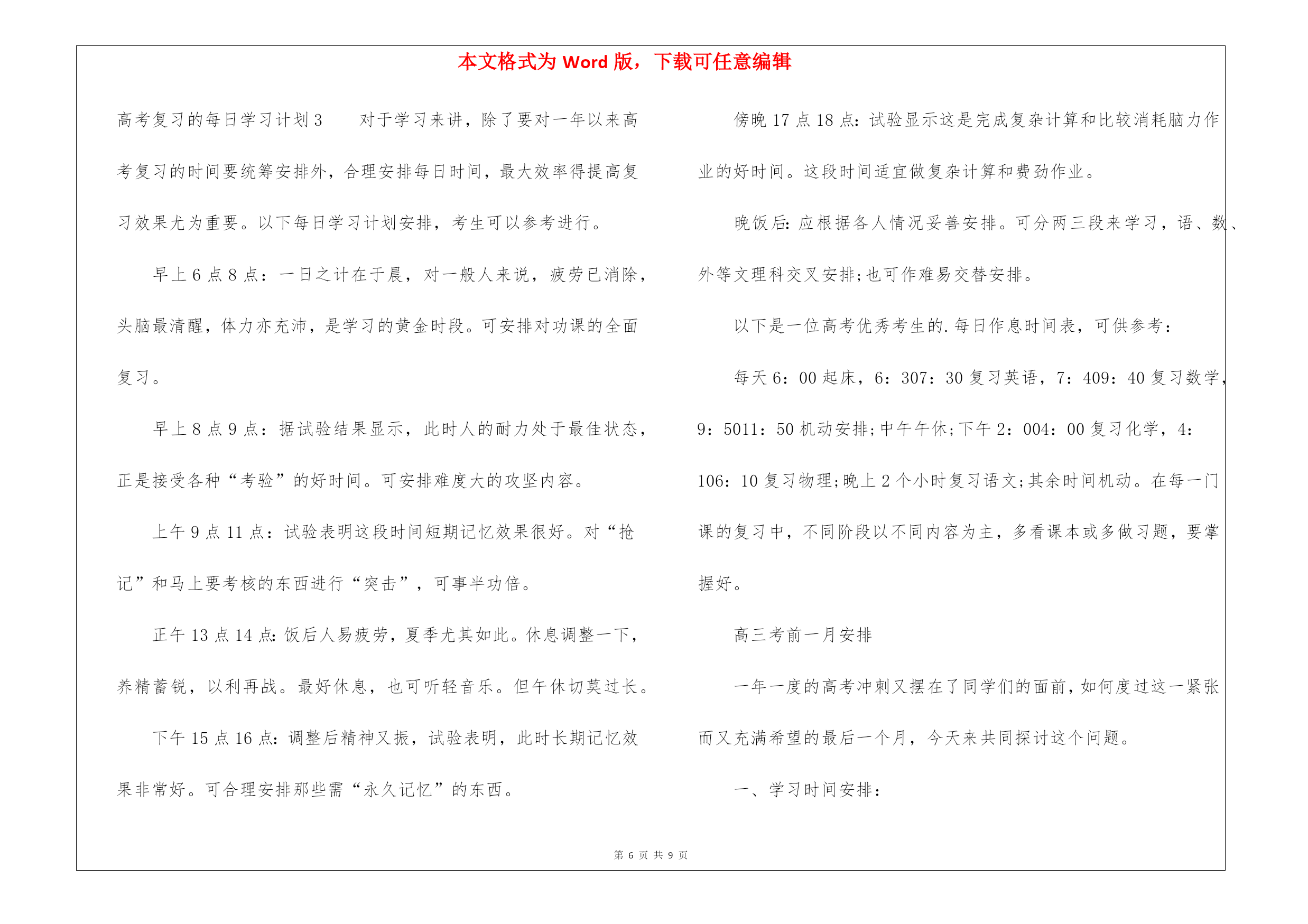 本文格式为Word版,下载可任意编辑第PAGE\*MERGEFORMAT9页共NUMPAGES\*MERGEFORMAT9页高考复习的每日学习计划高考复习的每日学习计划时间的脚步是无声的,它在不经意间流逝,我们又将迎来新一轮的学习,迎来新的喜悦、新的收获,是时候认真思考学习计划该如何写了哦。但是要怎么样才能避免自嗨型学习计划呢?以下是我为大家编写的高考复习的每日学习计划,欢迎大家借鉴与参考,希望对大家有所帮助。高考复习的每日学习计划1对于学习来讲,除了要对一年以来高考复习的时间要统筹安排外,合理安排每日时间,最大效率得提高复习效果尤为重要。以下每日学习计划安排,考生可以参考进行。早上6点8点:一日之计在于晨,对一般人来说,疲劳已消除,头脑最清醒,体力亦充沛,是学习的黄金时段。可安排对功课的全面复习。早上8点9点:据试验结果显示,此时人的耐力处于最佳状态,正是接受各种“考验”的好时间。可安排难度大的攻坚内容。上午9点11点:试验表明这段时间短期记忆效果很好。对“抢记”和马上要考核的东西进行“突击”,可事半功倍。正午13点14点:饭后人易疲劳,夏季尤其如此。休息调整一下,养精蓄锐,以利再战。最好休息,也可听轻音乐。但午休切莫过长。下午15点16点:调整后精神又振,试验表明,此时长期记忆效果非常好。可合理安排那些需“永久记忆”的东西。傍晚17点18点:试验显示这是完成复杂计算和比较消耗脑力作业的好时间。这段时间适宜做复杂计算和费劲作业。晚饭后:应根据各人情况妥善安排。可分两三段来学习,语、数、外等文理科交叉安排;也可作难易交替安排。以下是一位高考优秀考生的每日作息时间表,可供参考:每天6:00起床,6:307:30复习英语,7:409:40复习数学,9:5011:50机动安排;中午午休;下午2:004:00复习化学,4:106:10复习物理;晚上2个小时复习语文;其余时间机动。在每一门课的复习中,不同阶段以不同内容为主,多看课本或多做习题,要掌握好。总之,在总体计划的基础上,注意小块的时间安排,既要抓紧时间,又该有张有弛,这样才能以一个较好、较正常的心态去参加高考,才能考好。高考复习的每日学习计划2对于学习来讲,除了要对一年以来高考复习的时间要统筹安排外,合理安排每日时间,最大效率得提高复习效果尤为重要,一个高考状元的高考复习每日学习计划安排。以下每日学习计划安排,考生可以参考进行。早上6点8点:一日之计在于晨,对一般人来说,疲劳已消除,头脑最清醒,体力亦充沛,是学习的黄金时段。可安排对功课的全面复习。早上8点9点:据试验结果显示,此时人的耐力处于最佳状态,正是接受各种考验的好时间。可安排难度大的攻坚内容。上午9点11点:试验表明这段时间短期记忆效果很好。对抢记和马上要考核的东西进行突击,可事半功倍。正午13点14点:饭后人易疲劳,夏季尤其如此。休息调整一下,养精蓄锐,以利再战。最好休息,也可听轻音乐。但午休切莫过长。下午15点16点:调整后精神又振,试验表明,此时长期记忆效果非常好。可合理安排那些需永久记忆的东西。傍晚17点18点:试验显示这是完成复杂计算和比较消耗脑力作业的好时间。这段时间适宜做复杂计算和费劲作业。晚饭后:应根据各人情况妥善安排。可分两三段来学习,语、数、外等文理科交叉安排;也可作难易交替安排。以下是一位高考优秀考生的每日作息时间表,可供参考:每天6:00起床,6:307:30复习英语,7:409:40复习数学,9:5011:50机动安排;中午午休;下午2:004:00复习化学,4:106:10复习物理;晚上2个小时复习语文;其余时间机动。在每一门课的复习中,不同阶段以不同内容为主,多看课本或多做习题,要掌握好。总之,在总体计划的基础上,注意小块的时间安排,既要抓紧时间,又该有张有弛,这样才能以一个较好、较正常的心态去参加高考,才能考好!高三复习计划制订一个切实可行的学习计划,把自己的假期安排好,不要急于求成,要脚踏实地,只有这样才会有成效的。把高三的复习计划分为二大阶段。每个阶段有不同的任务、不同的目标和不同的学习方法。第一阶段,是整个高三第一学期时间。这个阶段时间大约五个月,约占整个高三复习的一半时间左右。这高三文科复习四忌一忌抛开考纲,盲目复习。高考各科都有《考试说明》,学生首先应该依据《考试说明》,明确高考的考查范围和重点内容,再有针对性地进行复习。二忌急于求成,忽视小题。有些学生认为文科需要背诵的知识点太多,而在高考中基础知识题的分值不高,所以索性就放弃了。他们不知道解决好基础知识,正是提高文科成绩的关键所在。三忌支离破碎,缺乏系统。有些学生认为与理科相比,文科知识缺乏系统性和逻辑性,可以随意捡章节进行复习。其实文科复习应兼顾知识、能力、方法三个层次。四忌浮光掠影,只重皮毛。有些学生