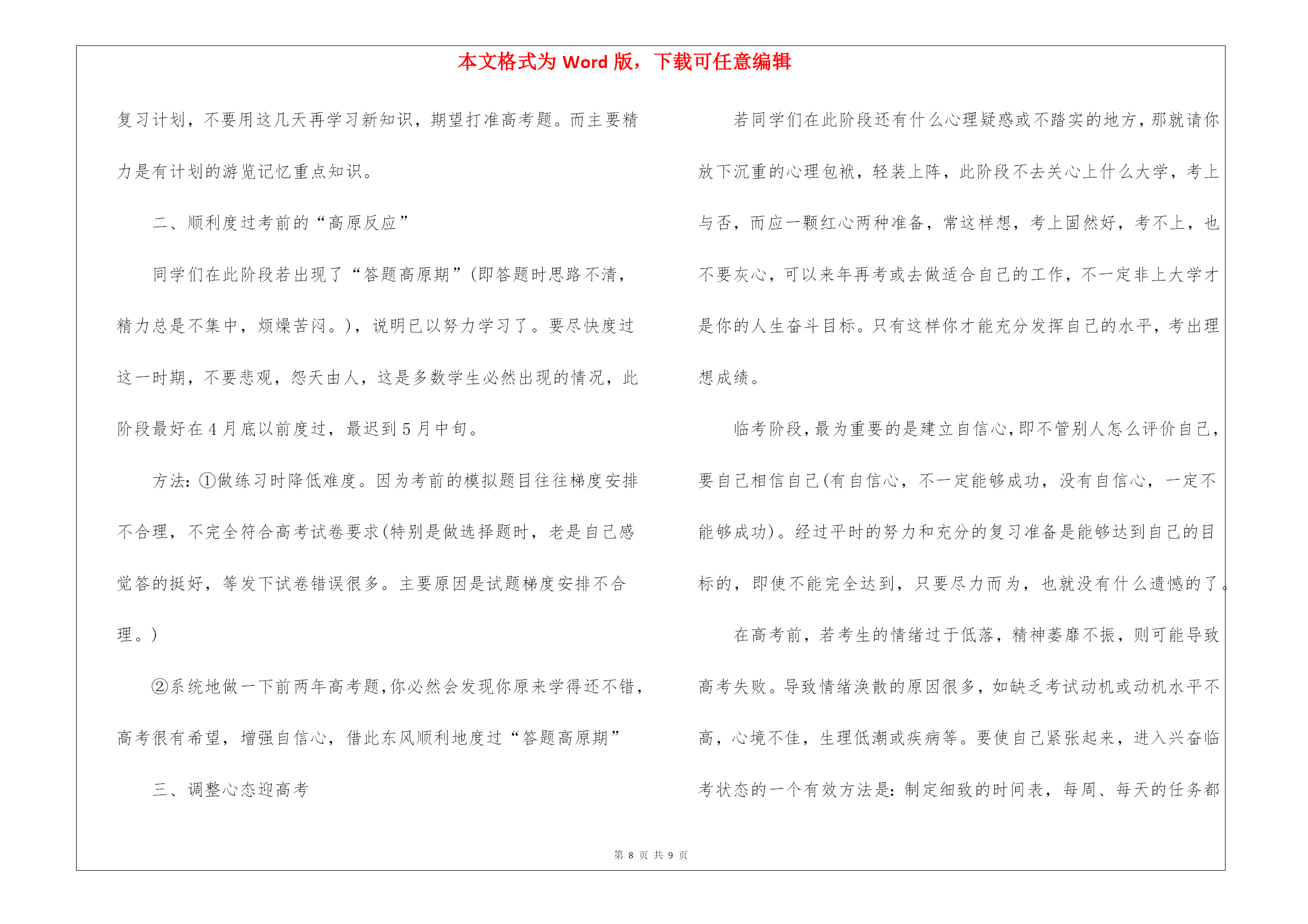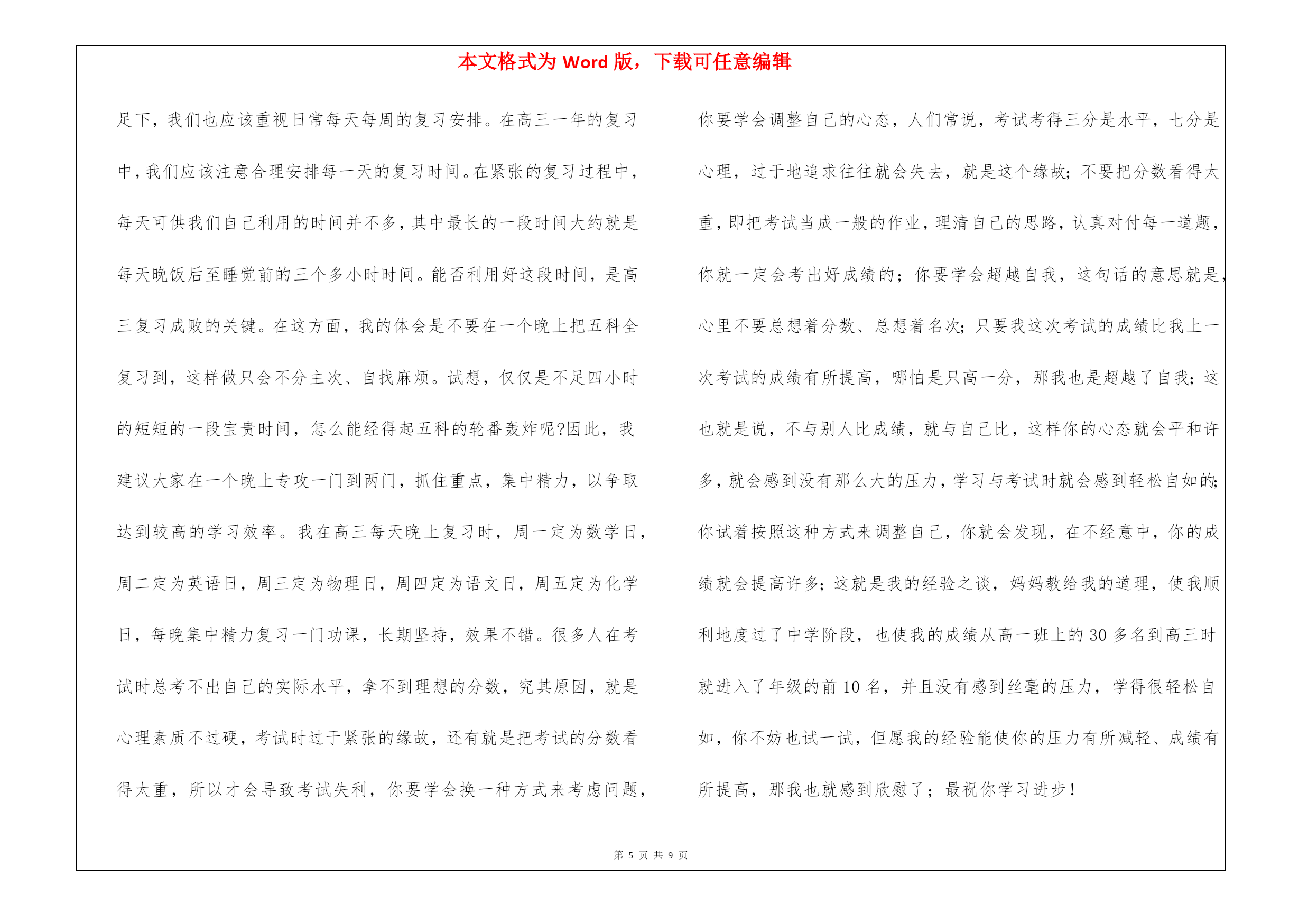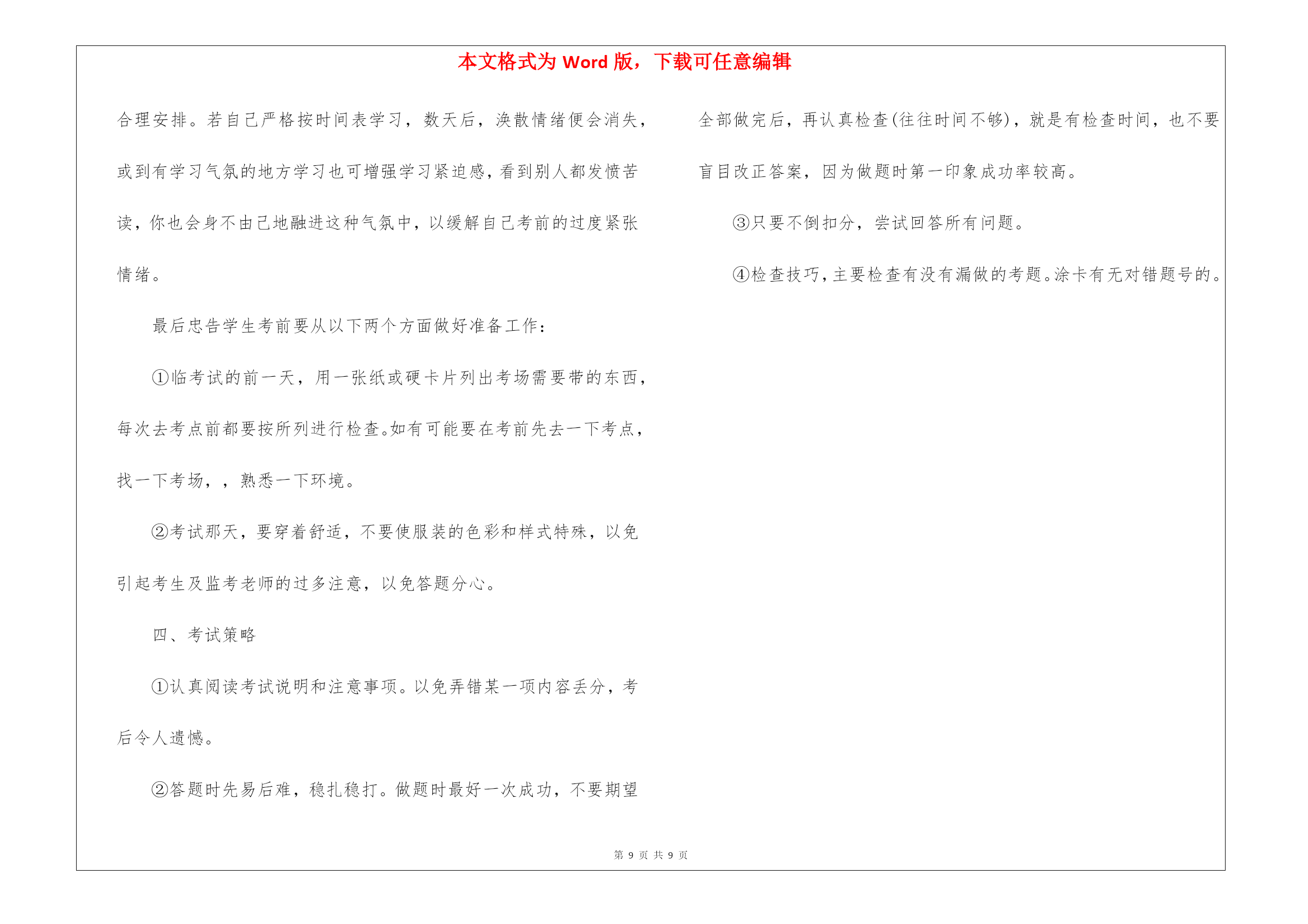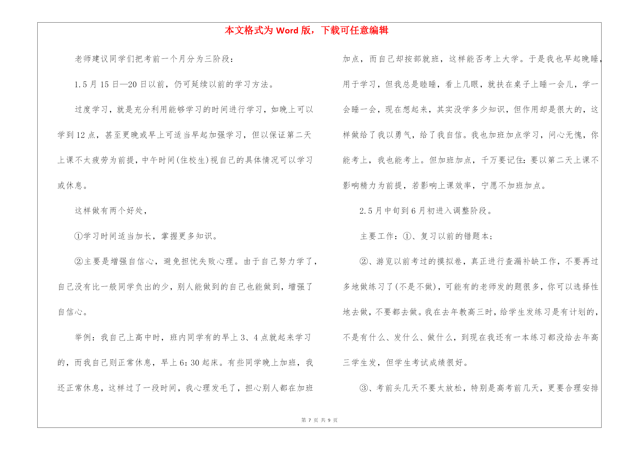 本文格式为Word版,下载可任意编辑第PAGE\*MERGEFORMAT9页共NUMPAGES\*MERGEFORMAT9页高考复习的每日学习计划高考复习的每日学习计划时间的脚步是无声的,它在不经意间流逝,我们又将迎来新一轮的学习,迎来新的喜悦、新的收获,是时候认真思考学习计划该如何写了哦。但是要怎么样才能避免自嗨型学习计划呢?以下是我为大家编写的高考复习的每日学习计划,欢迎大家借鉴与参考,希望对大家有所帮助。高考复习的每日学习计划1对于学习来讲,除了要对一年以来高考复习的时间要统筹安排外,合理安排每日时间,最大效率得提高复习效果尤为重要。以下每日学习计划安排,考生可以参考进行。早上6点8点:一日之计在于晨,对一般人来说,疲劳已消除,头脑最清醒,体力亦充沛,是学习的黄金时段。可安排对功课的全面复习。早上8点9点:据试验结果显示,此时人的耐力处于最佳状态,正是接受各种“考验”的好时间。可安排难度大的攻坚内容。上午9点11点:试验表明这段时间短期记忆效果很好。对“抢记”和马上要考核的东西进行“突击”,可事半功倍。正午13点14点:饭后人易疲劳,夏季尤其如此。休息调整一下,养精蓄锐,以利再战。最好休息,也可听轻音乐。但午休切莫过长。下午15点16点:调整后精神又振,试验表明,此时长期记忆效果非常好。可合理安排那些需“永久记忆”的东西。傍晚17点18点:试验显示这是完成复杂计算和比较消耗脑力作业的好时间。这段时间适宜做复杂计算和费劲作业。晚饭后:应根据各人情况妥善安排。可分两三段来学习,语、数、外等文理科交叉安排;也可作难易交替安排。以下是一位高考优秀考生的每日作息时间表,可供参考:每天6:00起床,6:307:30复习英语,7:409:40复习数学,9:5011:50机动安排;中午午休;下午2:004:00复习化学,4:106:10复习物理;晚上2个小时复习语文;其余时间机动。在每一门课的复习中,不同阶段以不同内容为主,多看课本或多做习题,要掌握好。总之,在总体计划的基础上,注意小块的时间安排,既要抓紧时间,又该有张有弛,这样才能以一个较好、较正常的心态去参加高考,才能考好。高考复习的每日学习计划2对于学习来讲,除了要对一年以来高考复习的时间要统筹安排外,合理安排每日时间,最大效率得提高复习效果尤为重要,一个高考状元的高考复习每日学习计划安排。以下每日学习计划安排,考生可以参考进行。早上6点8点:一日之计在于晨,对一般人来说,疲劳已消除,头脑最清醒,体力亦充沛,是学习的黄金时段。可安排对功课的全面复习。早上8点9点:据试验结果显示,此时人的耐力处于最佳状态,正是接受各种考验的好时间。可安排难度大的攻坚内容。上午9点11点:试验表明这段时间短期记忆效果很好。对抢记和马上要考核的东西进行突击,可事半功倍。正午13点14点:饭后人易疲劳,夏季尤其如此。休息调整一下,养精蓄锐,以利再战。最好休息,也可听轻音乐。但午休切莫过长。下午15点16点:调整后精神又振,试验表明,此时长期记忆效果非常好。可合理安排那些需永久记忆的东西。傍晚17点18点:试验显示这是完成复杂计算和比较消耗脑力作业的好时间。这段时间适宜做复杂计算和费劲作业。晚饭后:应根据各人情况妥善安排。可分两三段来学习,语、数、外等文理科交叉安排;也可作难易交替安排。以下是一位高考优秀考生的每日作息时间表,可供参考:每天6:00起床,6:307:30复习英语,7:409:40复习数学,9:5011:50机动安排;中午午休;下午2:004:00复习化学,4:106:10复习物理;晚上2个小时复习语文;其余时间机动。在每一门课的复习中,不同阶段以不同内容为主,多看课本或多做习题,要掌握好。总之,在总体计划的基础上,注意小块的时间安排,既要抓紧时间,又该有张有弛,这样才能以一个较好、较正常的心态去参加高考,才能考好!高三复习计划制订一个切实可行的学习计划,把自己的假期安排好,不要急于求成,要脚踏实地,只有这样才会有成效的。把高三的复习计划分为二大阶段。每个阶段有不同的任务、不同的目标和不同的学习方法。第一阶段,是整个高三第一学期时间。这个阶段时间大约五个月,约占整个高三复习的一半时间左右。这高三文科复习四忌一忌抛开考纲,盲目复习。高考各科都有《考试说明》,学生首先应该依据《考试说明》,明确高考的考查范围和重点内容,再有针对性地进行复习。二忌急于求成,忽视小题。有些学生认为文科需要背诵的知识点太多,而在高考中基础知识题的分值不高,所以索性就放弃了。他们不知道解决好基础知识,正是提高文科成绩的关键所在。三忌支离破碎,缺乏系统。有些学生认为与理科相比,文科知识缺乏系统性和逻辑性,可以随意捡章节进行复习。其实文科复习应兼顾知识、能力、方法三个层次。四忌浮光掠影,只重皮毛。有些学生
